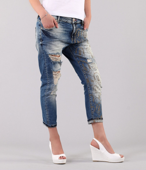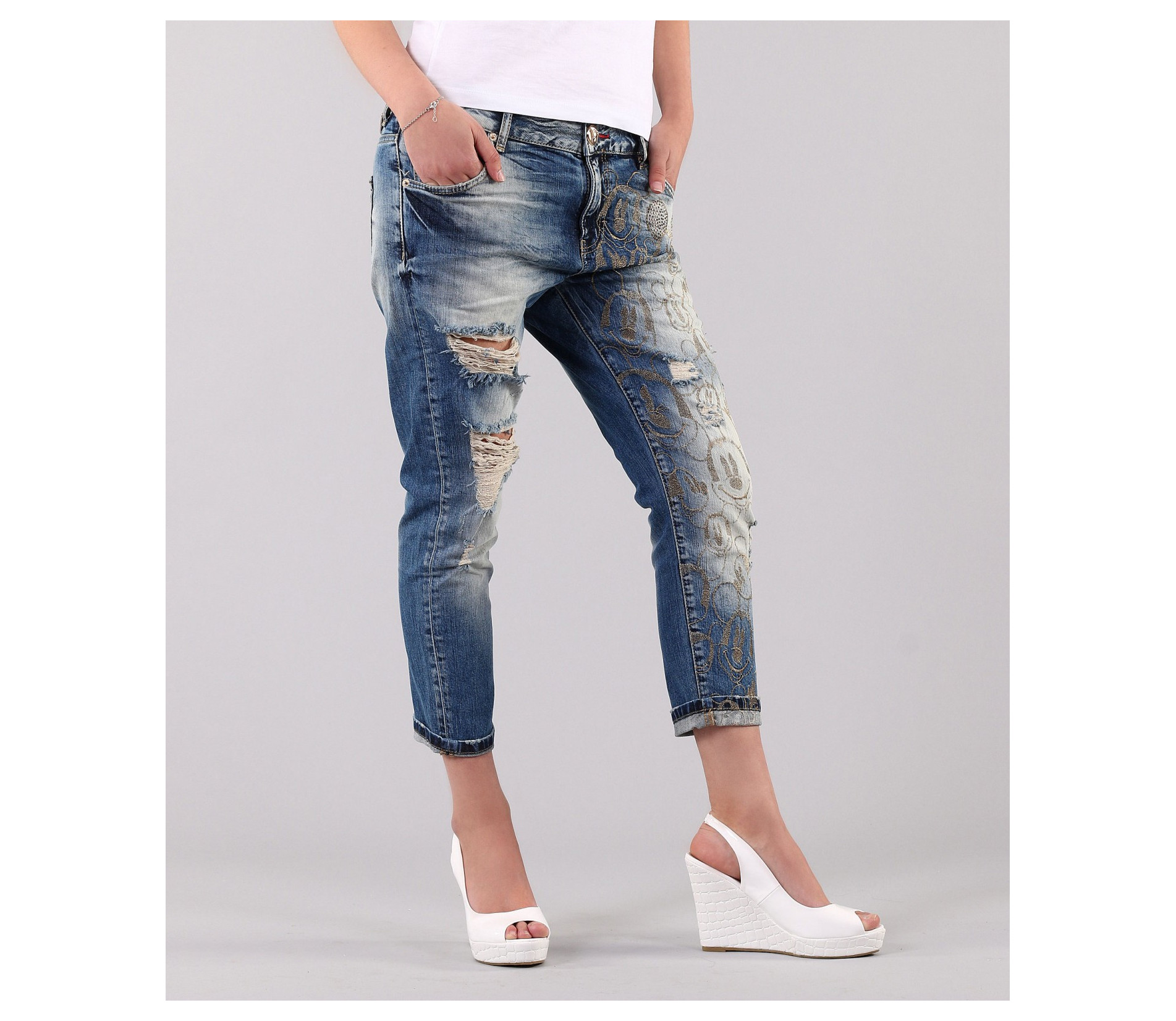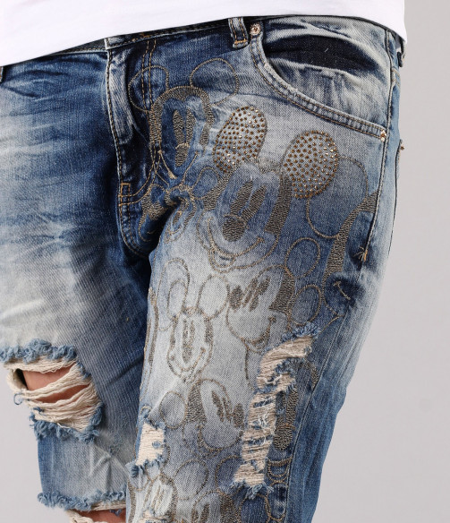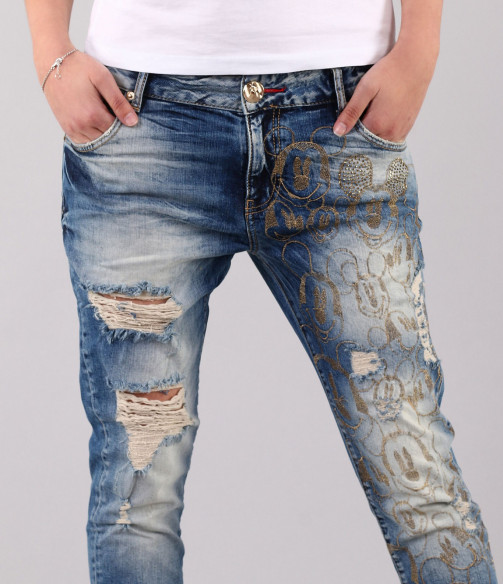 Страхотно ново предложение на 7/8 дамски дънки. Изключителен модел с леко паднало дъно. По дължината на единият крачол има силно накъсан ефект, а по другият като акцент са бродирани апликации с Мики Маус. Дънките имат леко избелял ефект. Моделът има и възможност за навиване. Супер раздвижен и свежарски модел дънки, който перфектно би се съчетал със спортно-елегантния Ви стил. В комплект със изчистен потник и стилни обувки, сте готови да привлечете погледите в себе си. Изработени от 100% чист памук, този модел Ви гарантира освен блестяща визия, гарантирано качество.