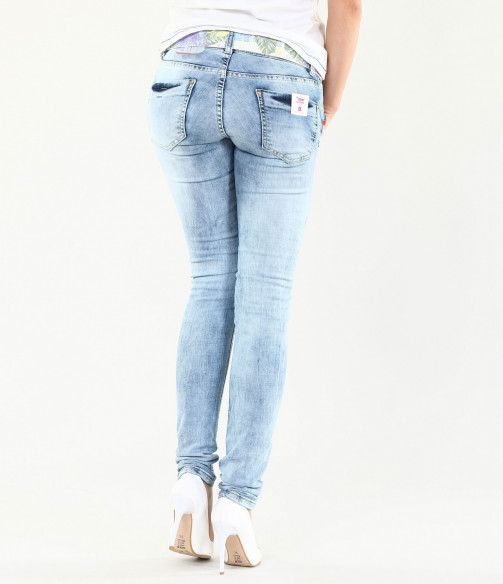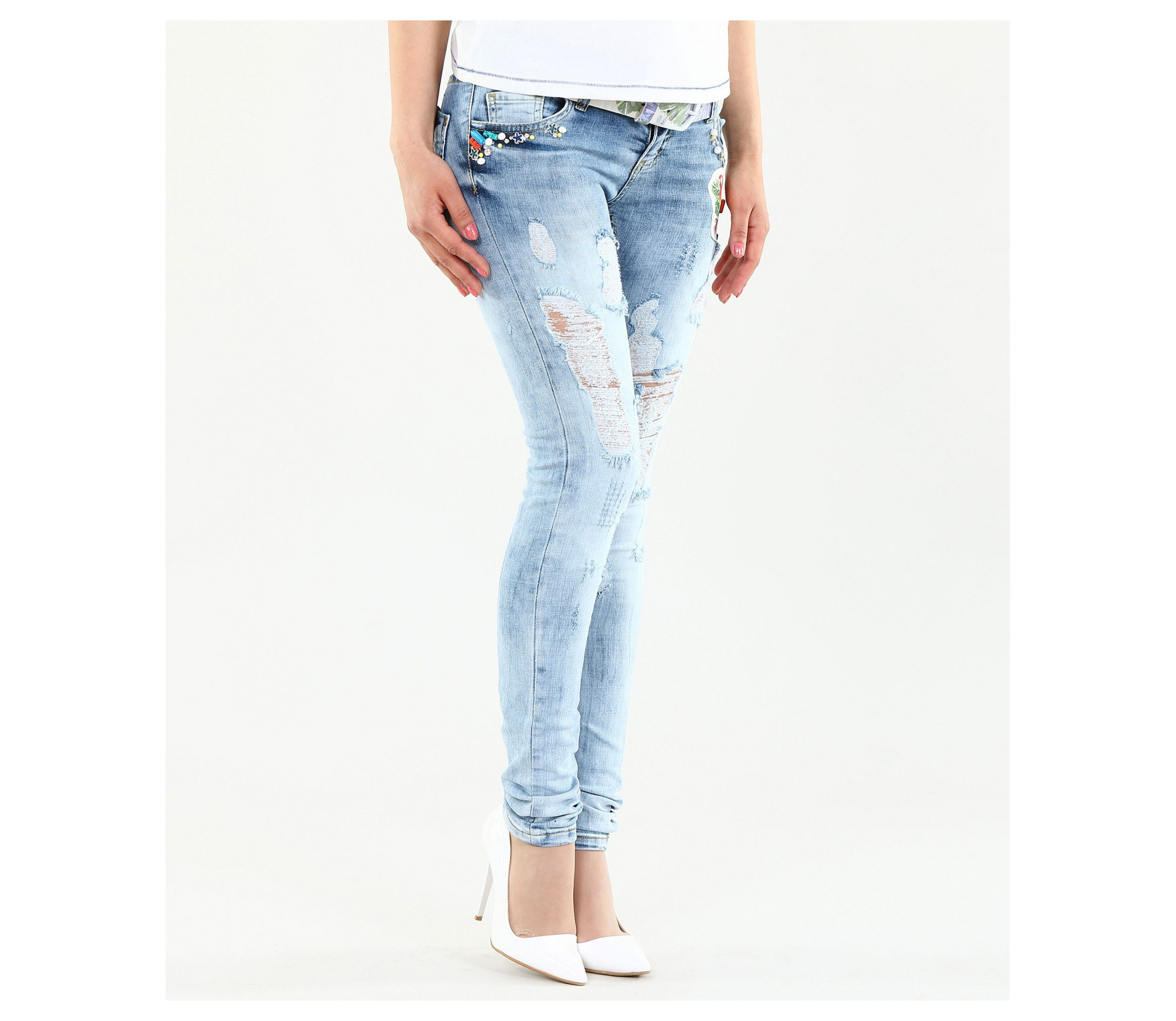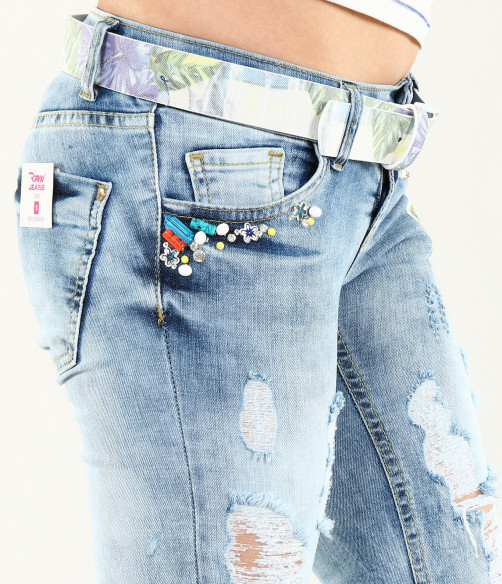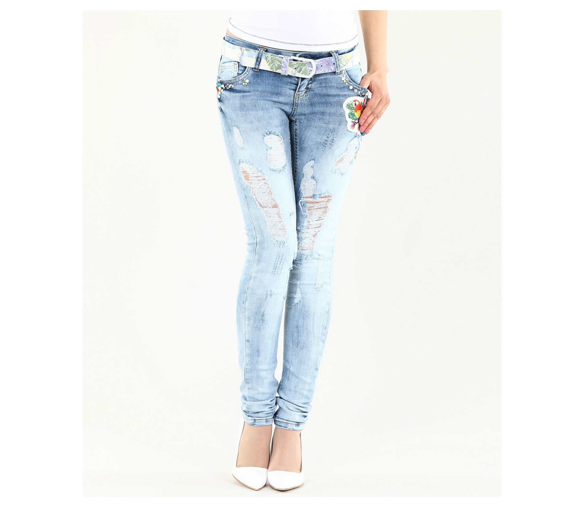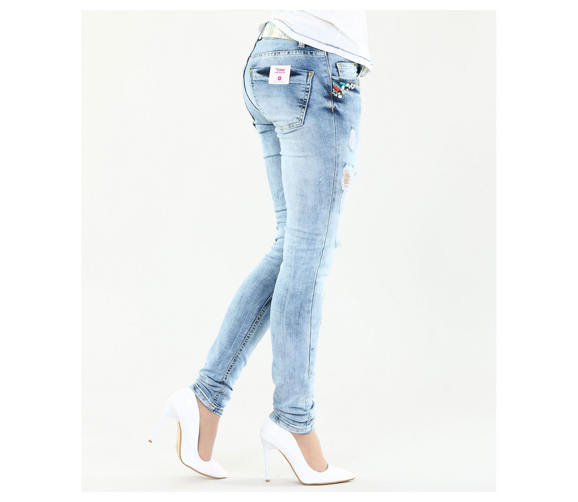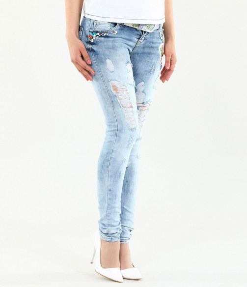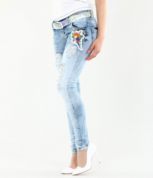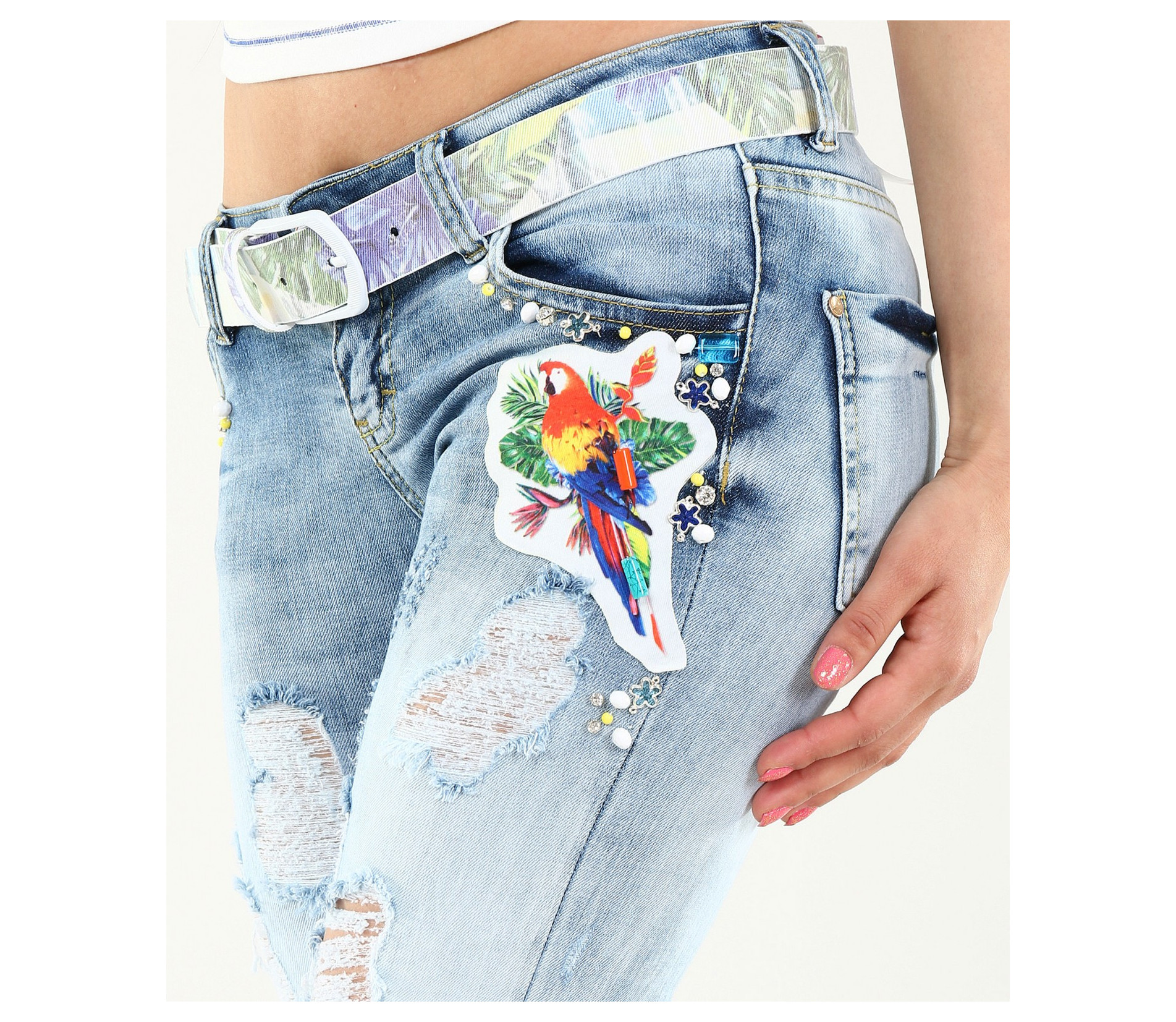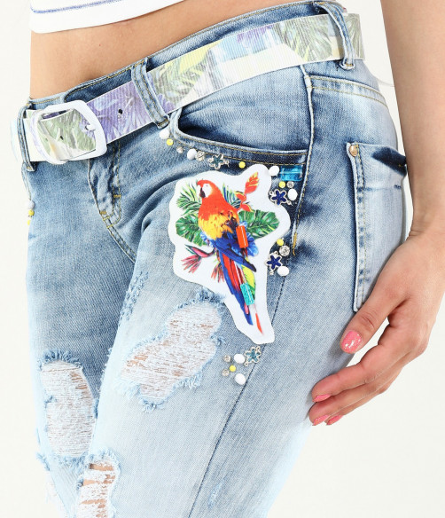 Описание на продукта: ТОП модел дамски дънки за сезон пролет/лято на 2016г. Атрактивни и модерни те Ви осигуряват зашеметяваща визия, наситена с fashion лятно излъчване. Акцентиращитите елементи по дамския деним са свежи, нежни и пъстри. Най-отличаващият се от тях се намира в областта на единият преден джоб, изобразяващ пъстър папагал, поставяен като атрактивна пришивка. Друг елемент от дънковия панталон са масивните цветни каъмни, също поставени в облатта на предните джобове, създаващи свежо настроение. Лицевата част на джинсите са декорирани със силно накъсан ефект, допълнен с лек изсветлял ефект, които в комбинация създават този супер модерен дамски деним. Като последен завършващ елемент е поставен изпъстрен колан в комплект. Кройката на джинисите е вталена със стандартна дълбочина, създаващи Ви освен усещане за перфектна визия.. комфорт, на който знаем че държите. Създайте fresh сет в съчетаение с цветен потник или тениска, летни обувки и любим аксесоар.