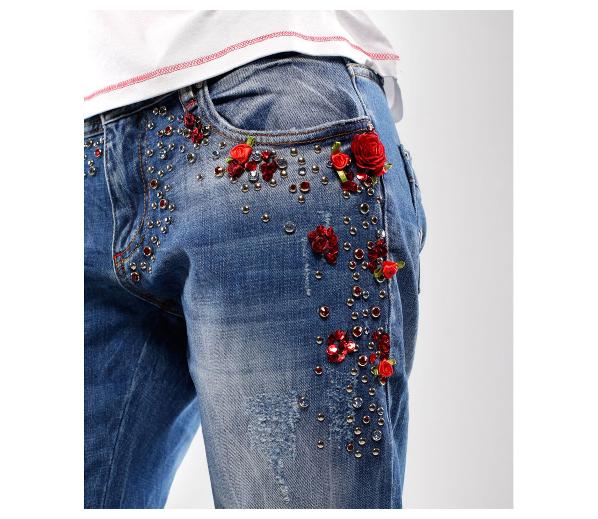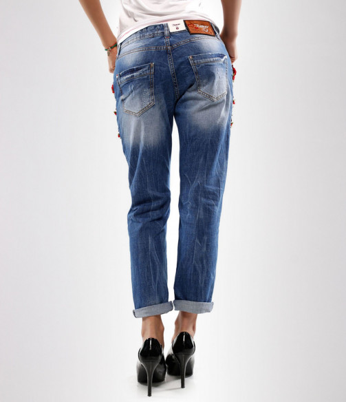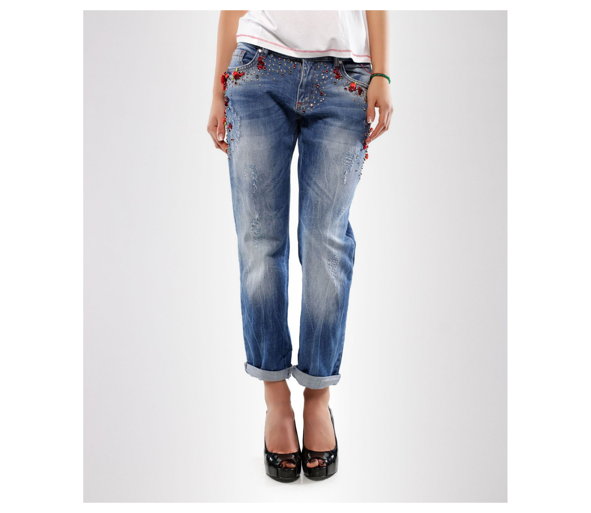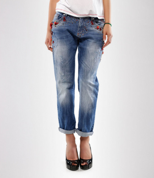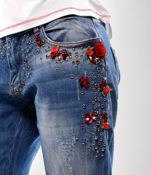 Стилни дамски дънки с права кройка и леко паднало дъно. В областта на предните джобове има метални капси и прешити червени розички с различна големина и форма. Дължината на дънките е до кокалчето. С този модел ще излезете от очертанията и ще бъдете различна и ефектно облечена. Състав: 97% памук, 3% еластант.