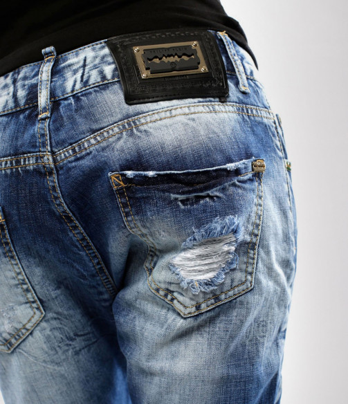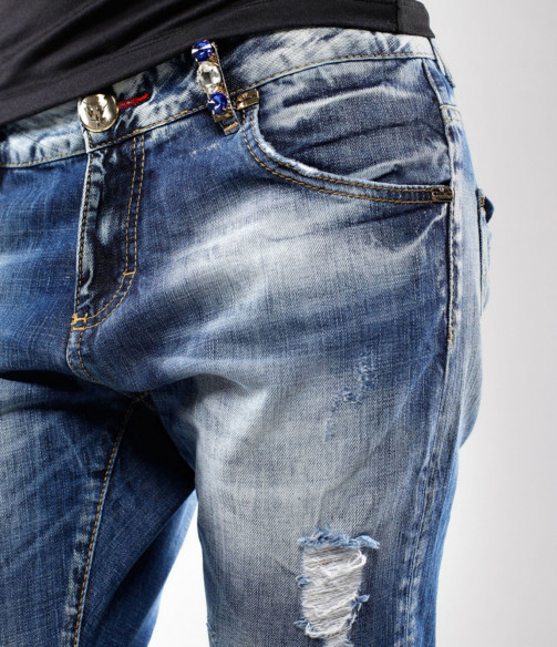 Спортни дънки, модел на Philipp Plein, с паднало дъно. Моделът е с модерната в момента дължина над кокалчето и с възможност за подгъване до колкото е нужно. В предната част има малка накъсана част, както и на задният джоб. На едната предна гайка има катарама с три цветни камъка. Висококачествен продукт, с 98% съдържание на памук и само 2 % еластан.