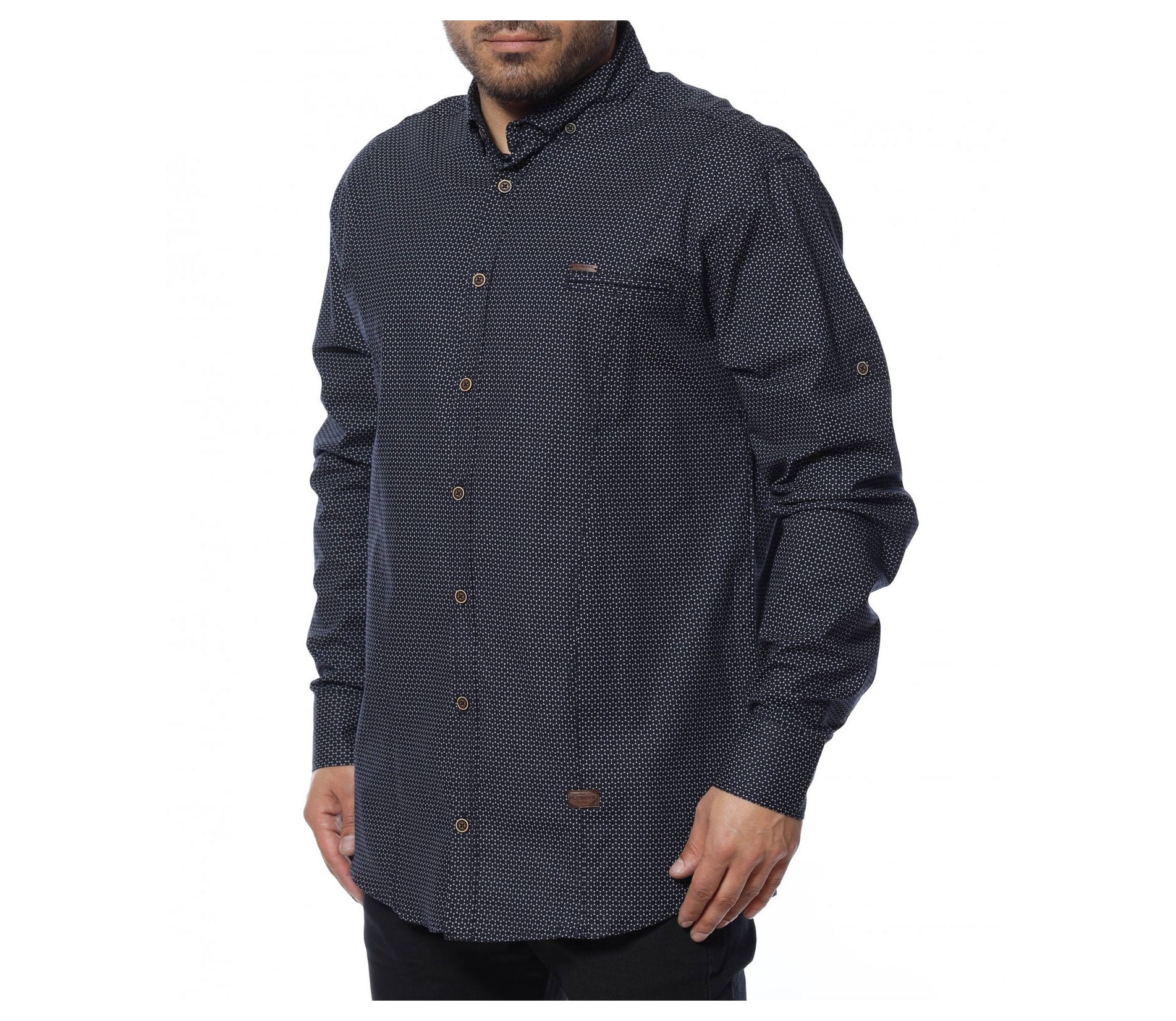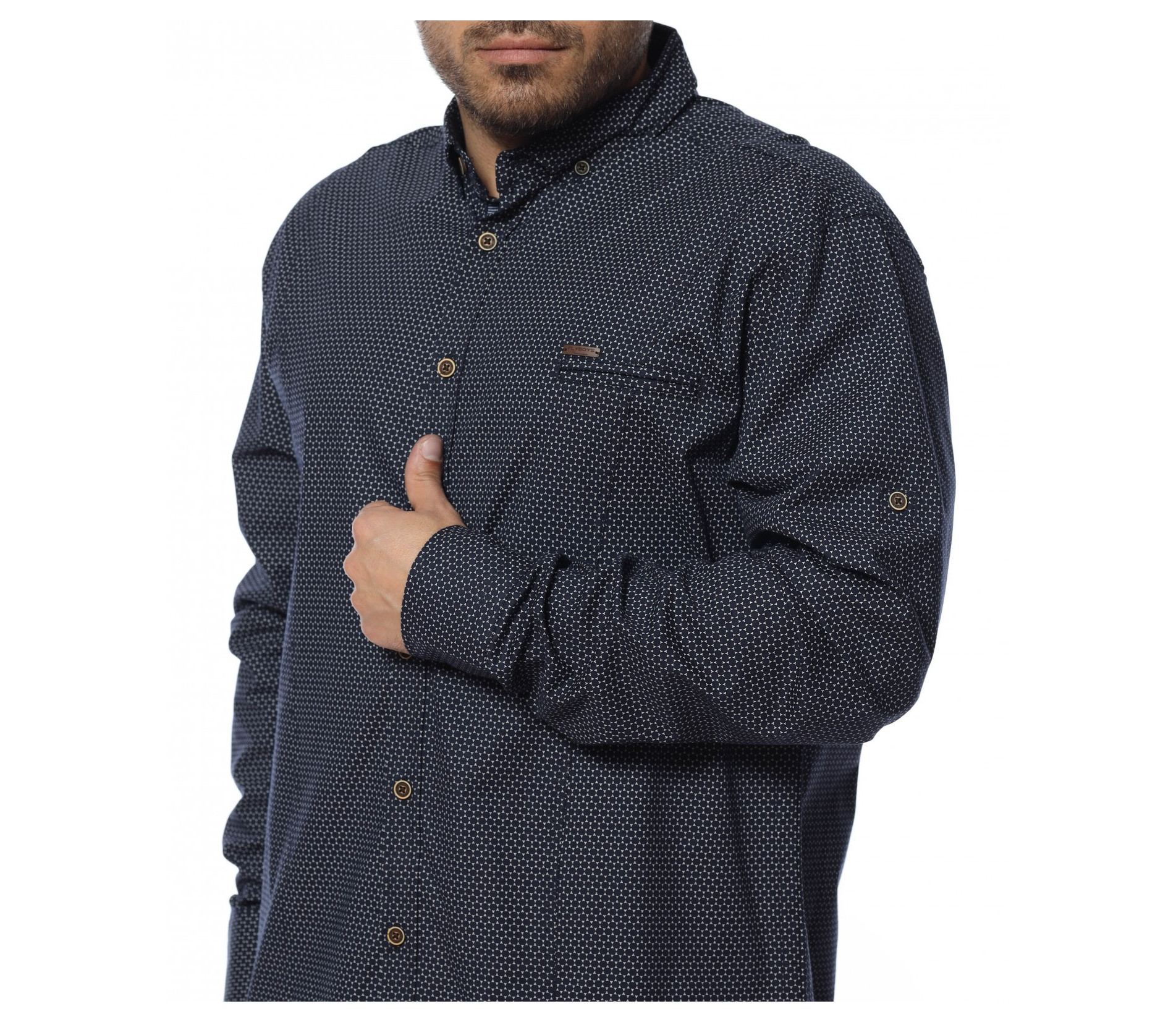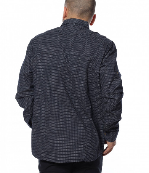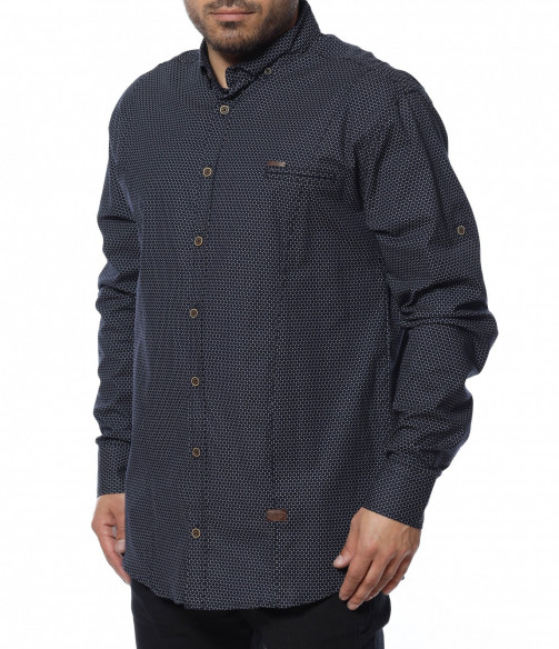 Попълнете елегантната част от гардеробът си с официална риза в oversize размер и дълъг ръкав. Кройката се отличава с достатъчна свобода, а комбинацията от памук и еластант, прави моделът изключително комфортен и удобен. Закопчаването се състои в копчета, които са позиционирани и в горната част на ръкава, за прилежно подгъване при нужда. Основата е едноцветна в тъмната гама. Създайте вашият стилен имидж като комбинирате с подходящи дънки, панталони и обувки.