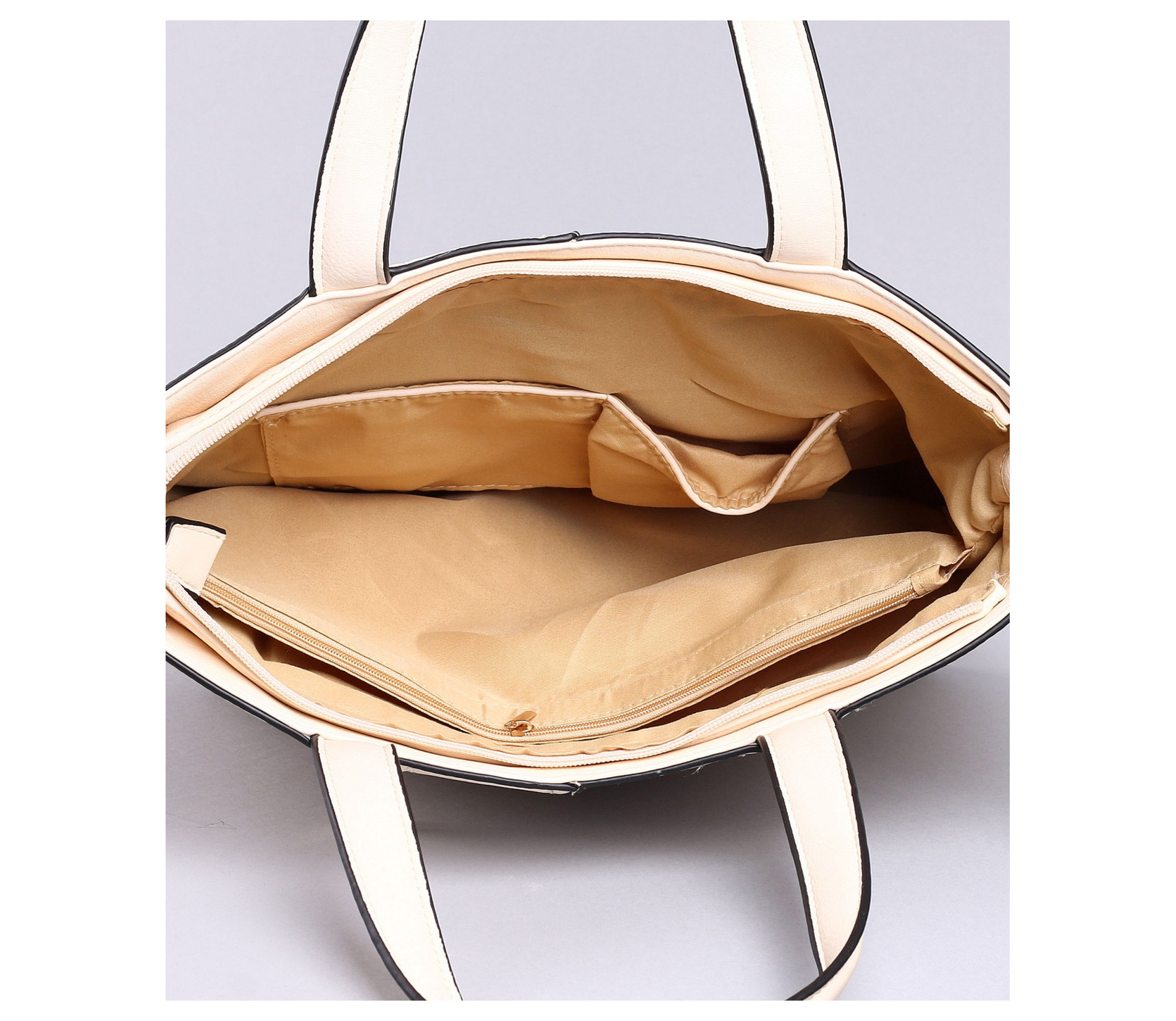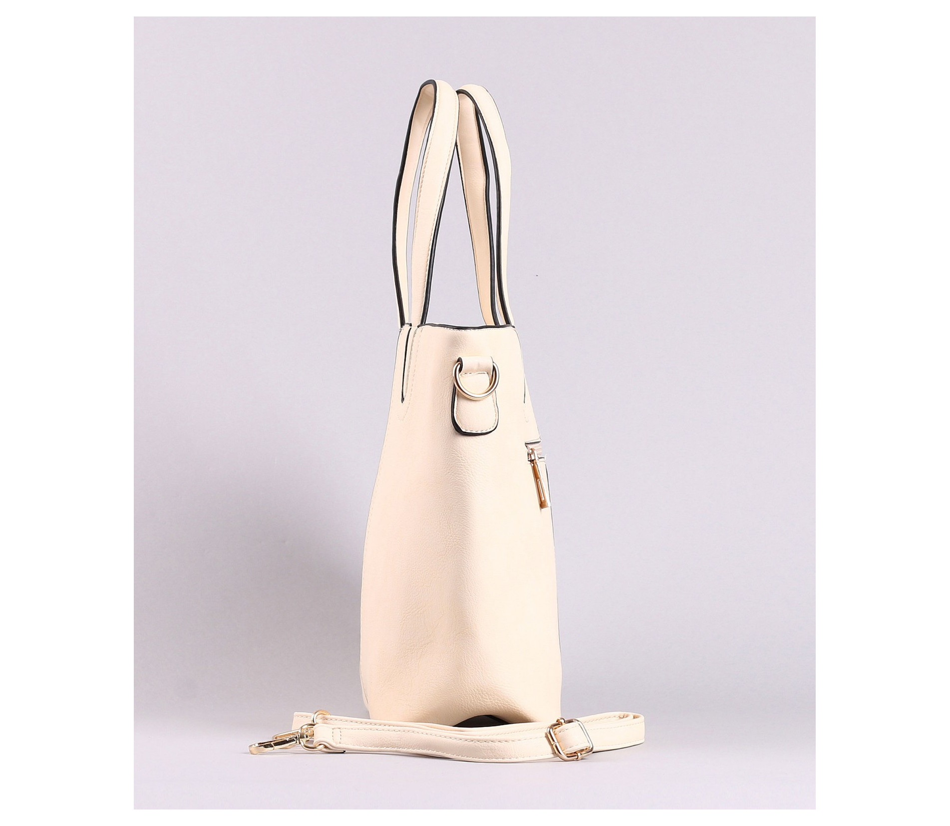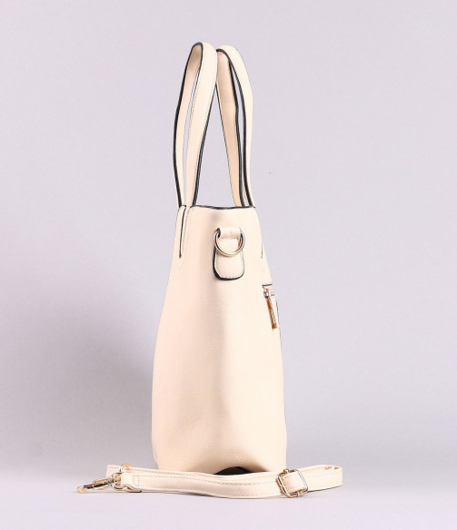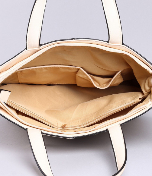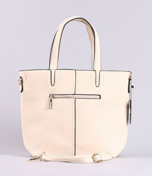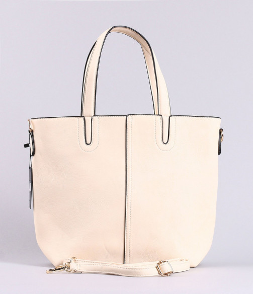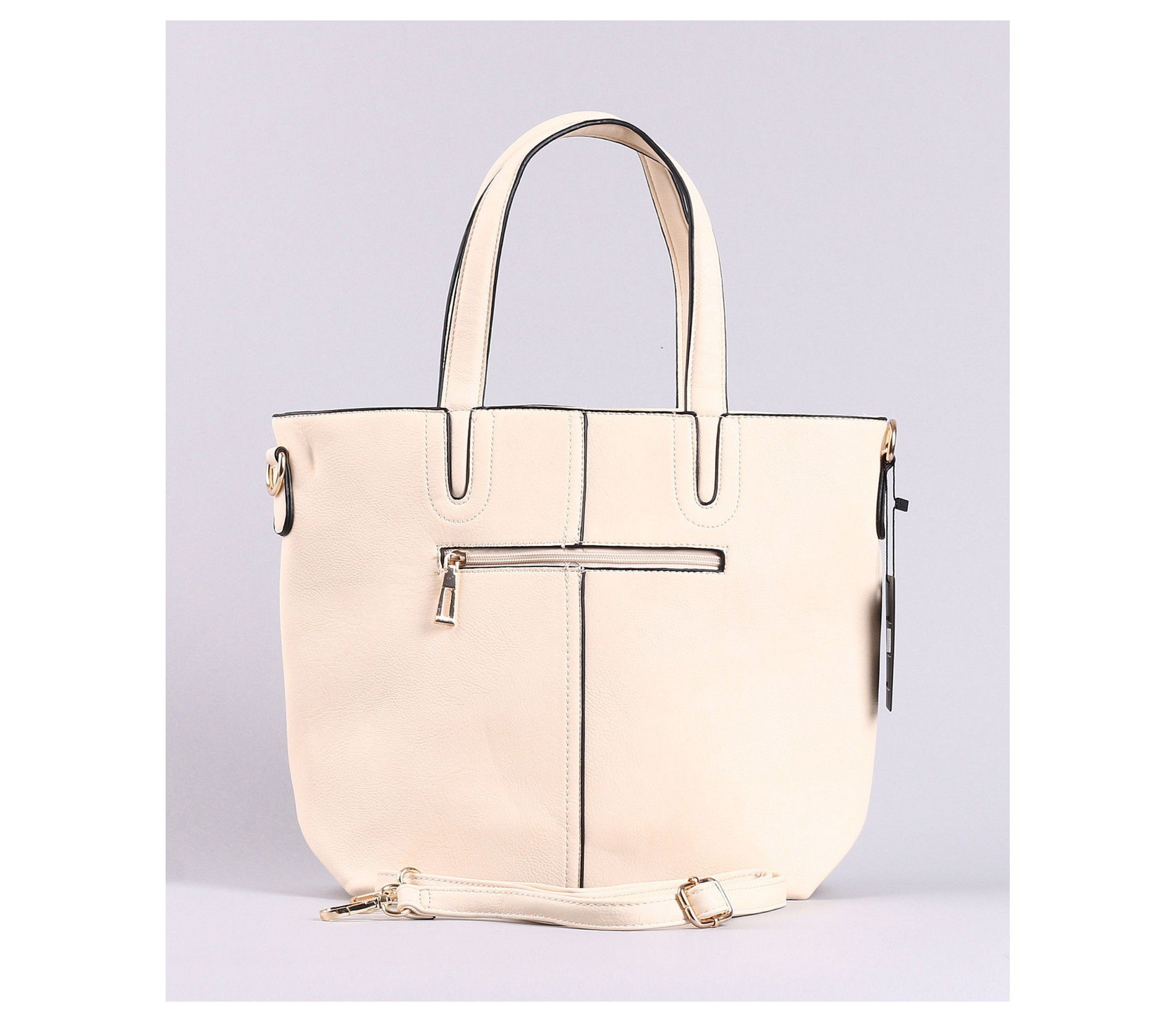 Стилна дамска чанта в мръсно бял цвят. Моделът е с къса дръжка, но има и дълга в комплект. В предната част изчистеният вид е декориран с ненатрапчива черна лента, която разчупва моделът. По дръжките също са поставени черни ленти. Изключително практичен модел с няколко прегради и голям обем във вътрешността. В комбинация с цветни дрехи и свежи обувки, получавате перфектна визия. С изработката си от 100% еко кожа, Ви гарантираме високото качество на продукта.