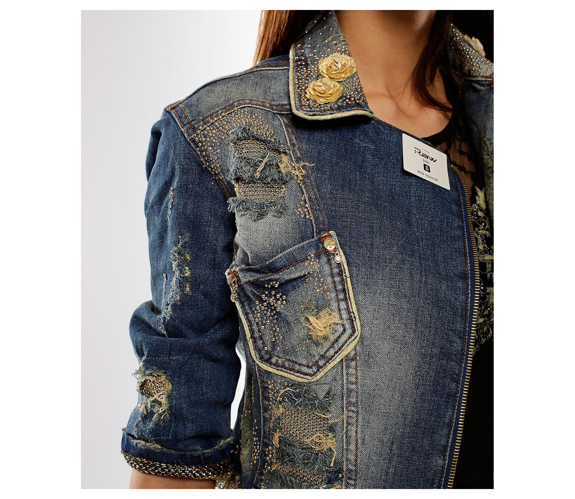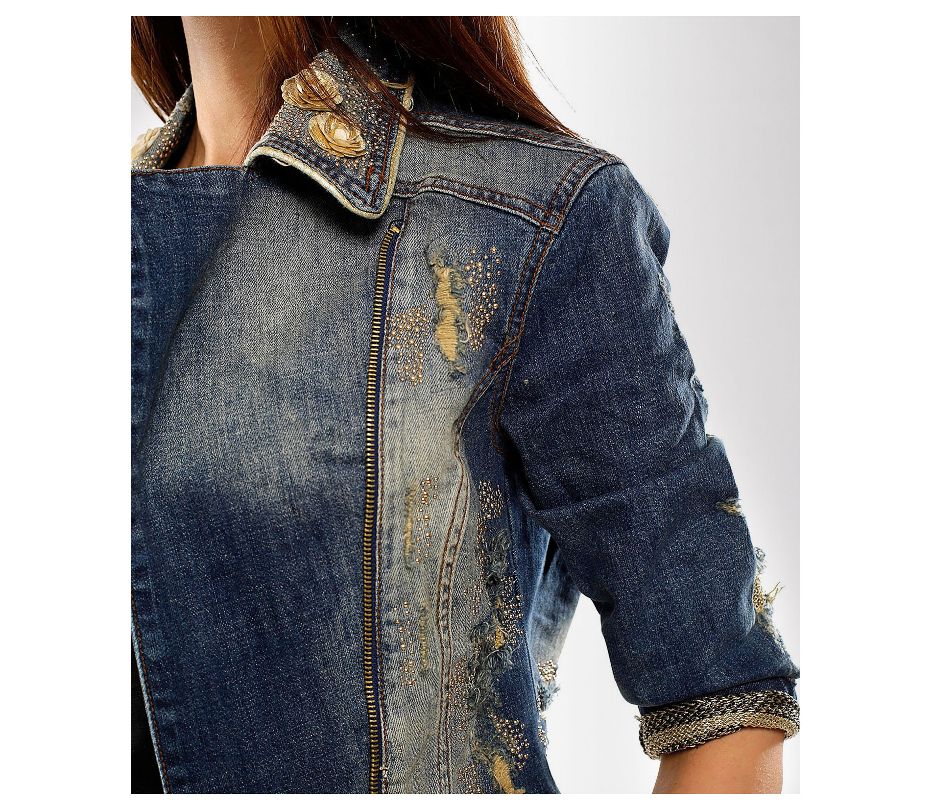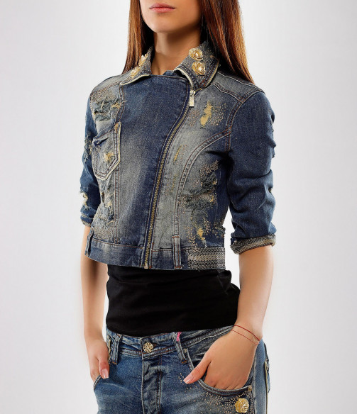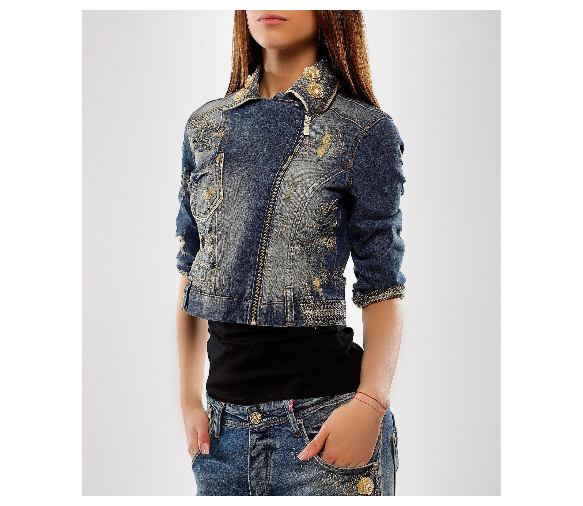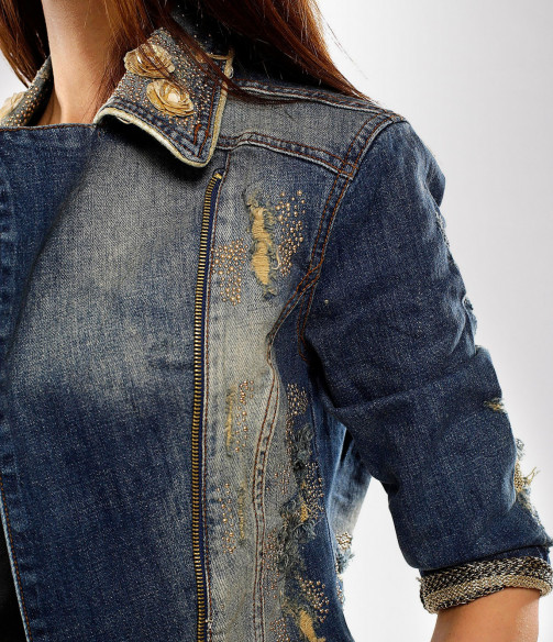 Описание на продукта: Дамско стилно дънково пролетно яке в синьо-зелен цвят. Якето е късо като модел, с вталена кройка, страничен цип и ръкави с дължина до лакътя. Както в предната, така и в задната част джинсовото яке е на жълтеникави кръпки като ефект. Около кръпките има и леки ненатрапчиви капси като допълнителен акцент. В предната лява част на модела е поставен деликатно малък джоб. Закопчаването е странично, асимитрично с златист цип. По яката на модела има декоративни рози и капси. Изработено е от 97% висококачествен памук и 3% еластант за удобство. Стилно и модерно подходящо за съчетание с дънки, цветни панталони, мокасини, както и обувки на ток.