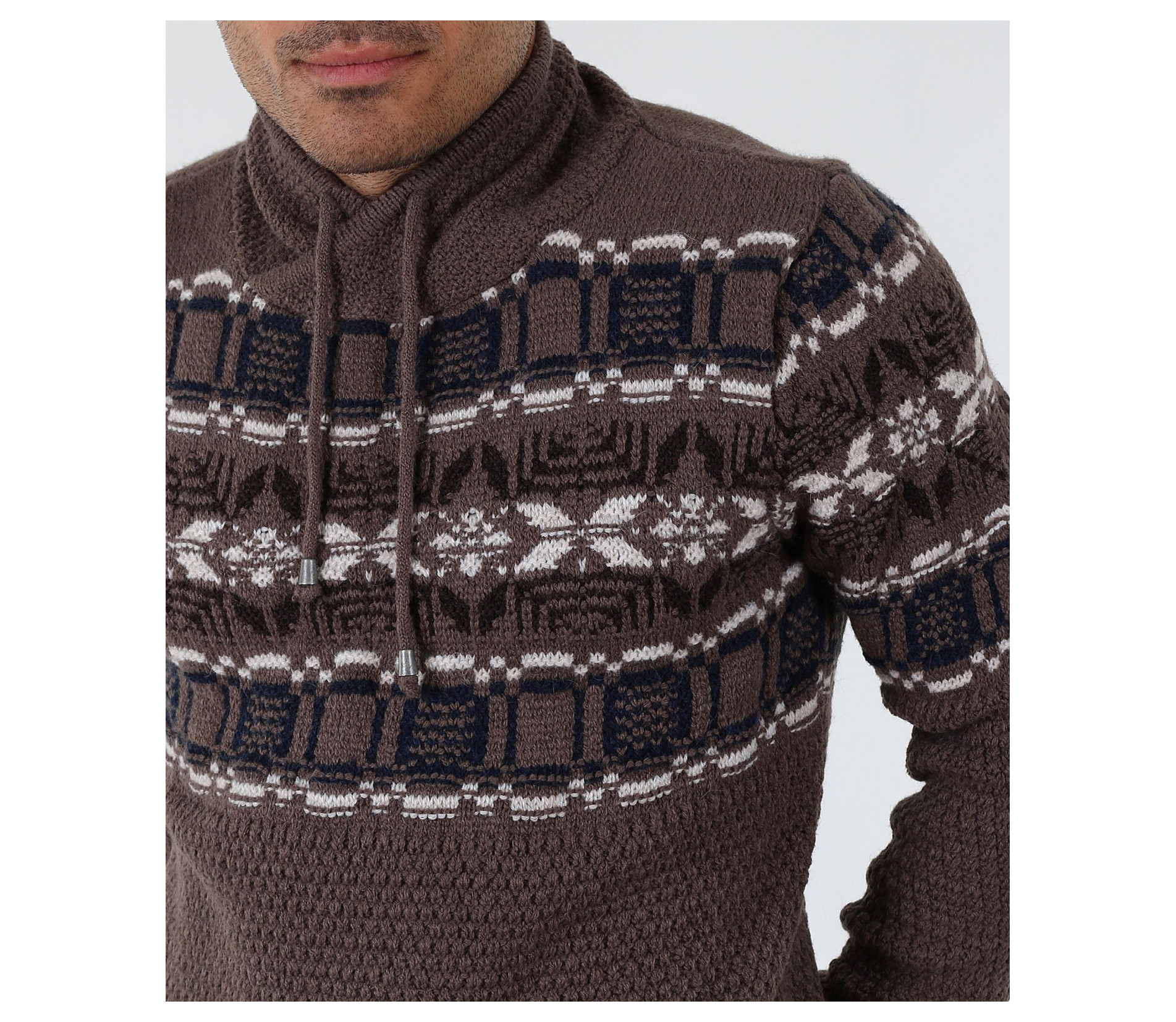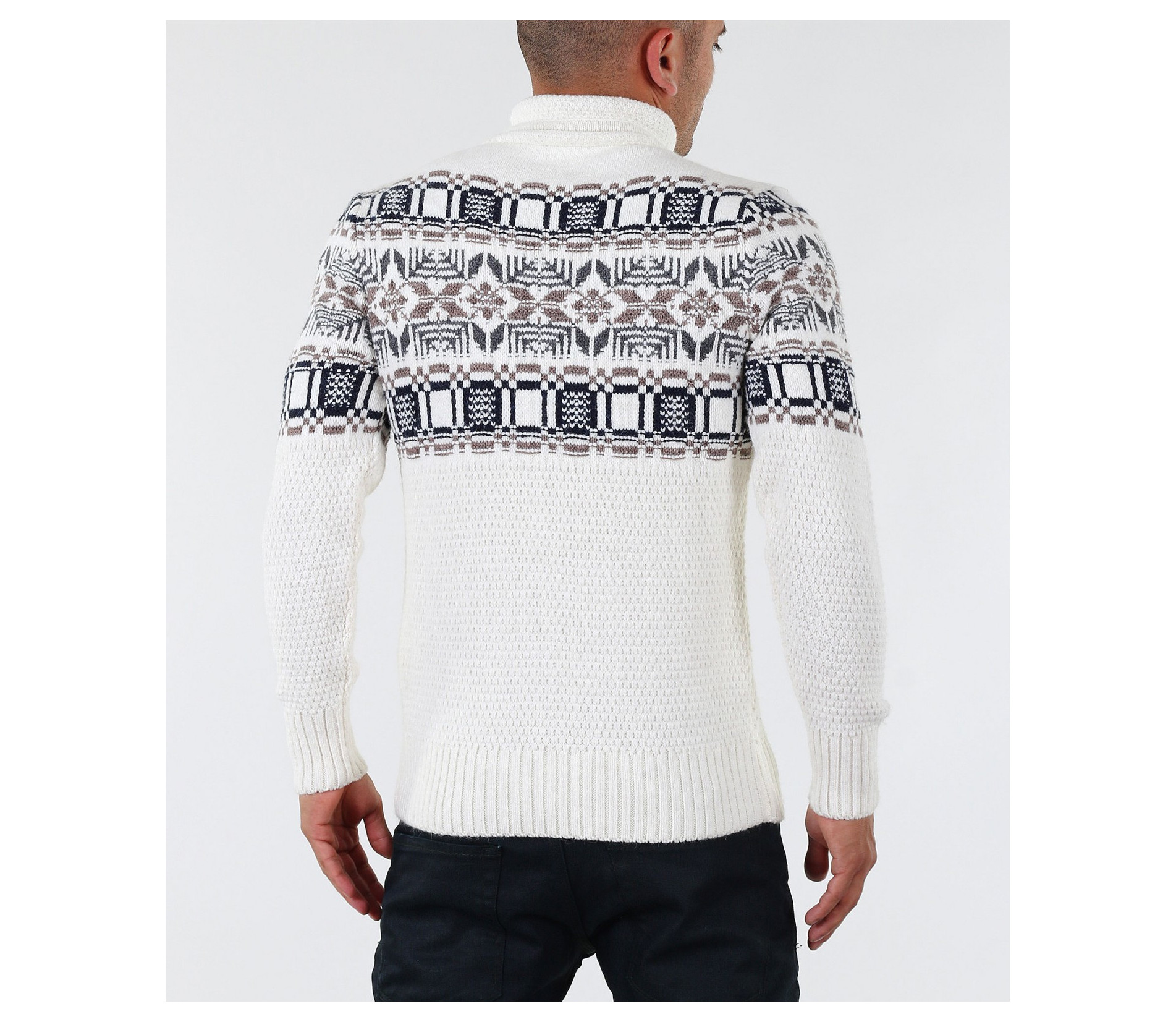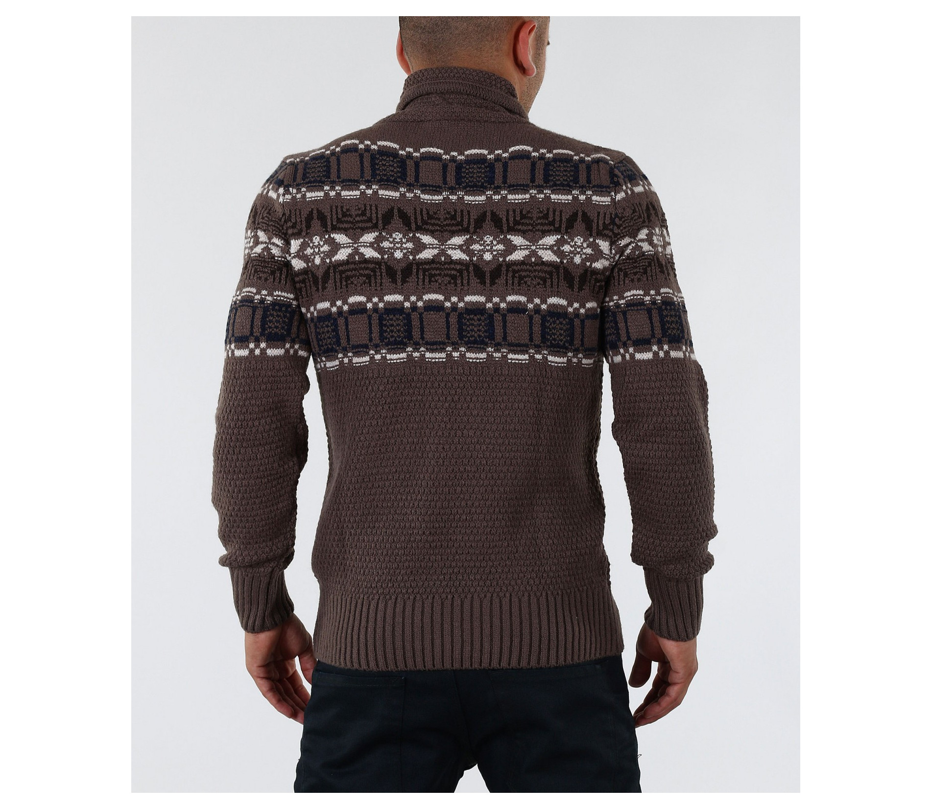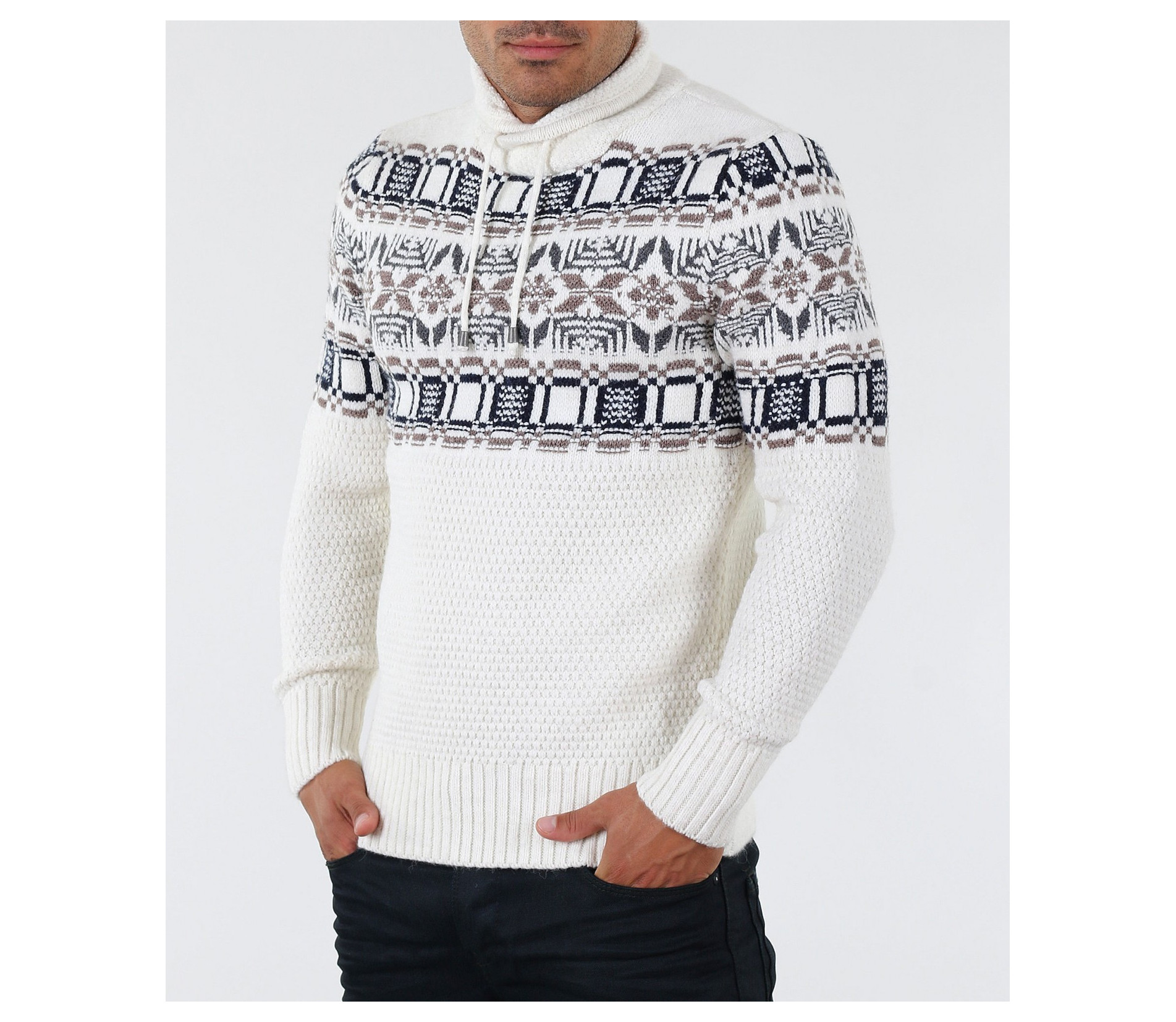 Описание на продукта: Удобен и модерен мъжки пуловер, с висока яка тип-шал с връзки. Пуловерът в изработен от комбинация от няколко материи, в това число 38% вълна, 30% полиамид, 22% акрил и 10% елит. Изключително впечатляващ е десена на пуловера. В областта на гърдите и ръкавите в хоризонтално положение са разположени ивици от интересни орнаменти в бял и черен цвят, умело контрастиращи на основния цвят. Дължината е стандартна, завършваща с ластик. В съчетание с дънки и спортни обувки, този пуловер се превръща в чудесен завършек на Вашата зимна визия.