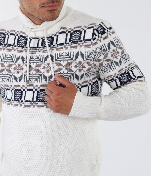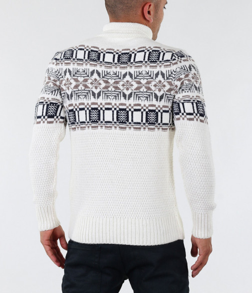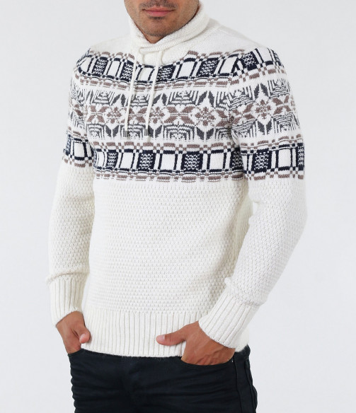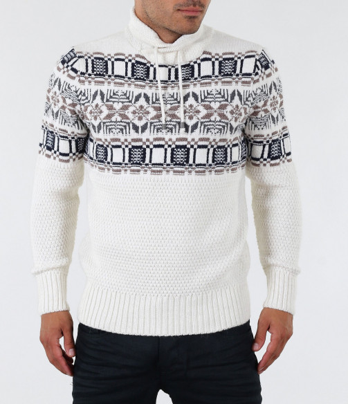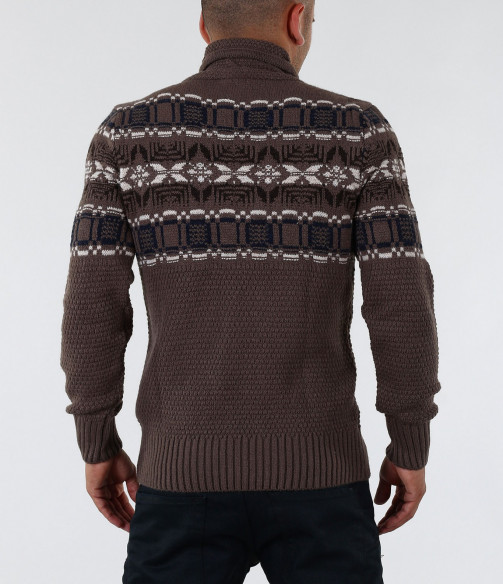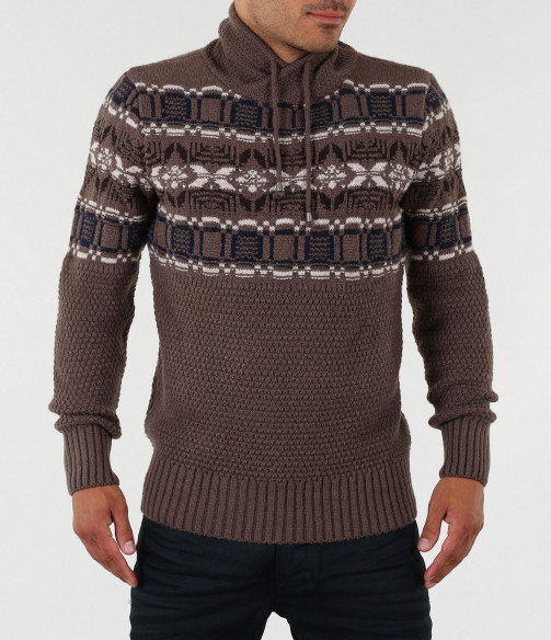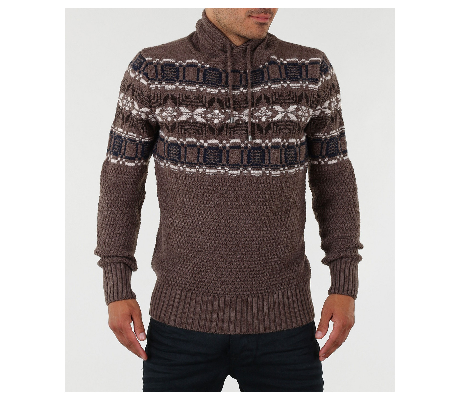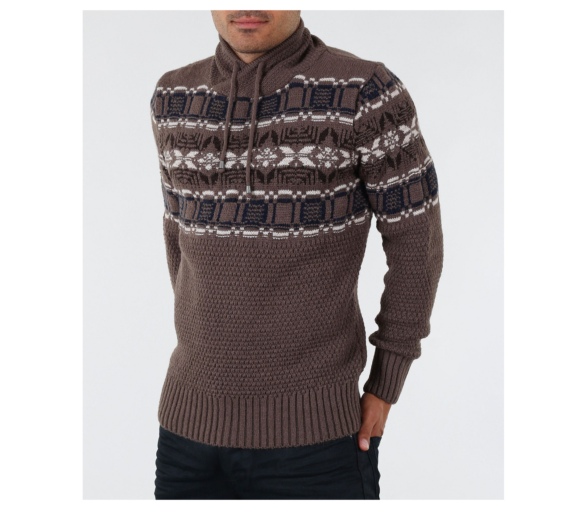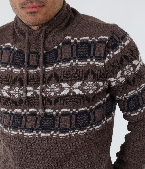 Описание на продукта: Удобен и модерен мъжки пуловер, с висока яка тип-шал с връзки. Пуловерът в изработен от комбинация от няколко материи, в това число 38% вълна, 30% полиамид, 22% акрил и 10% елит. Изключително впечатляващ е десена на пуловера. В областта на гърдите и ръкавите в хоризонтално положение са разположени ивици от интересни орнаменти в бял и черен цвят, умело контрастиращи на основния цвят. Дължината е стандартна, завършваща с ластик. В съчетание с дънки и спортни обувки, този пуловер се превръща в чудесен завършек на Вашата зимна визия.