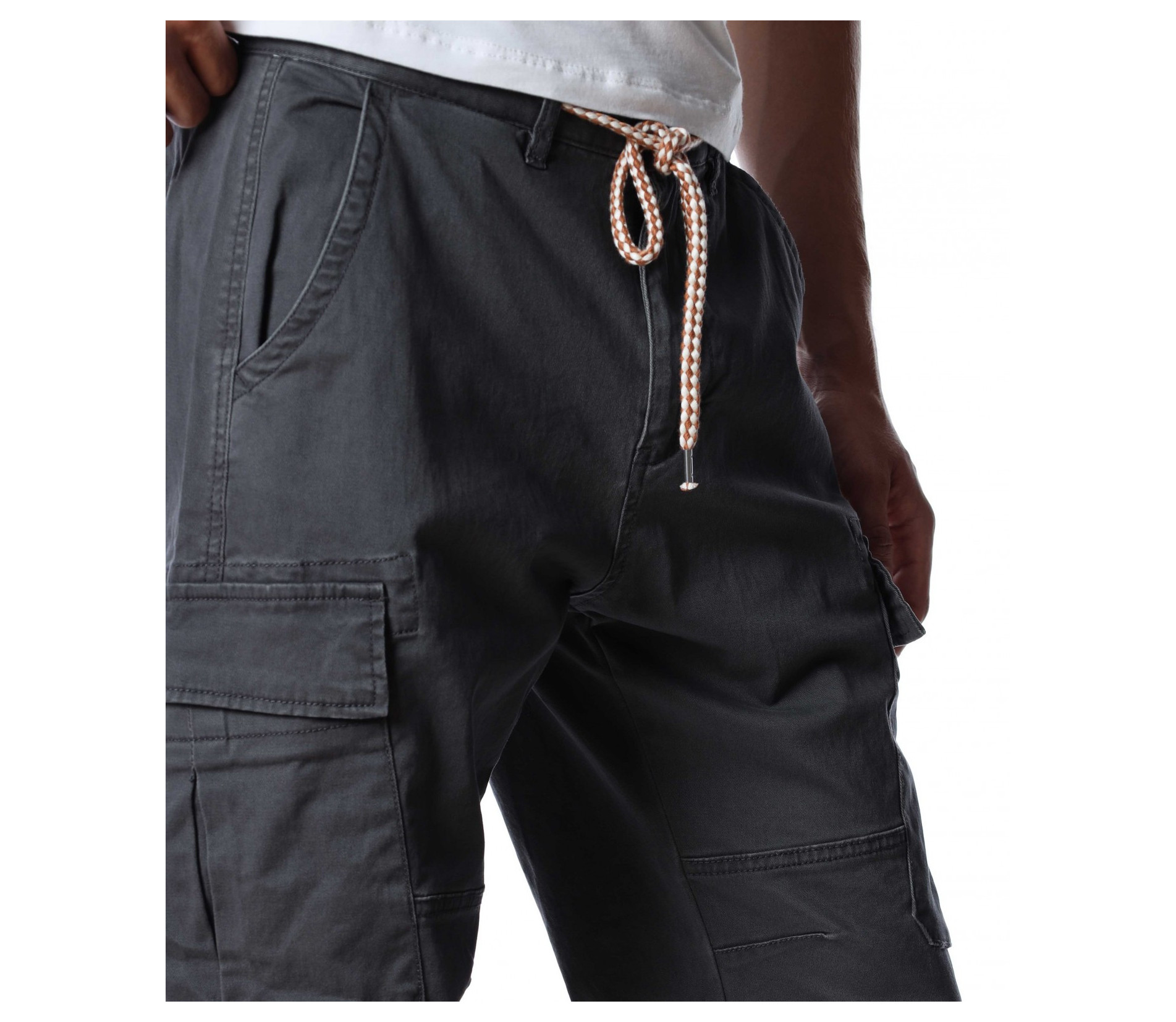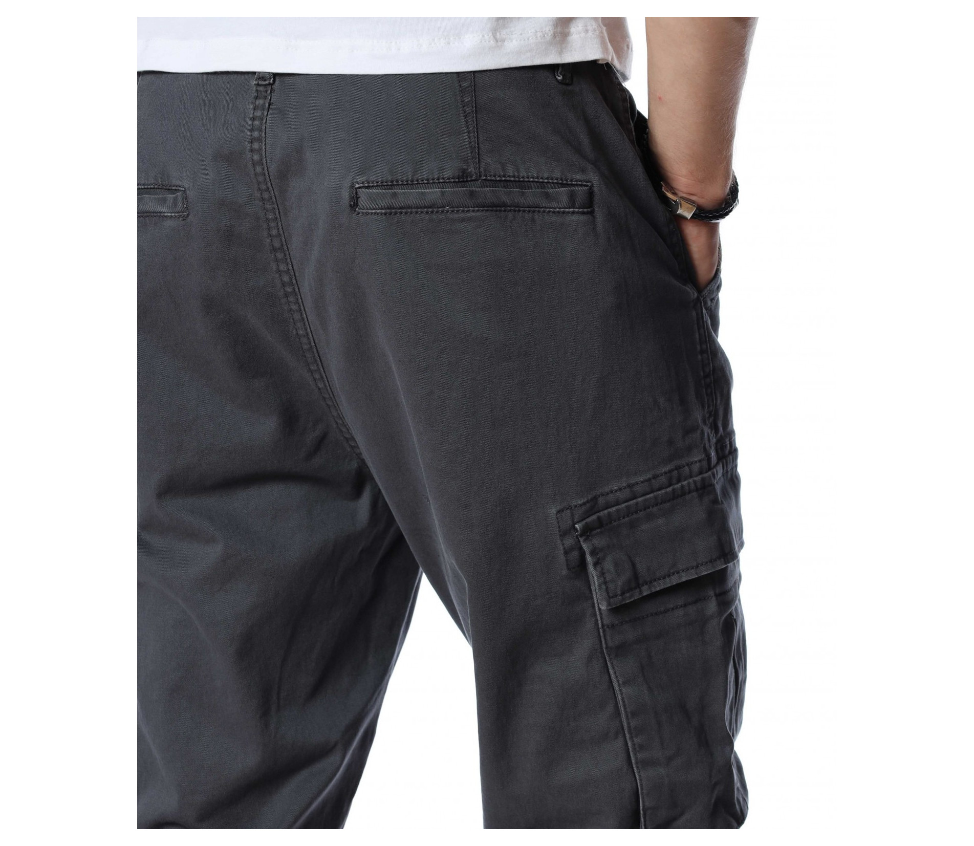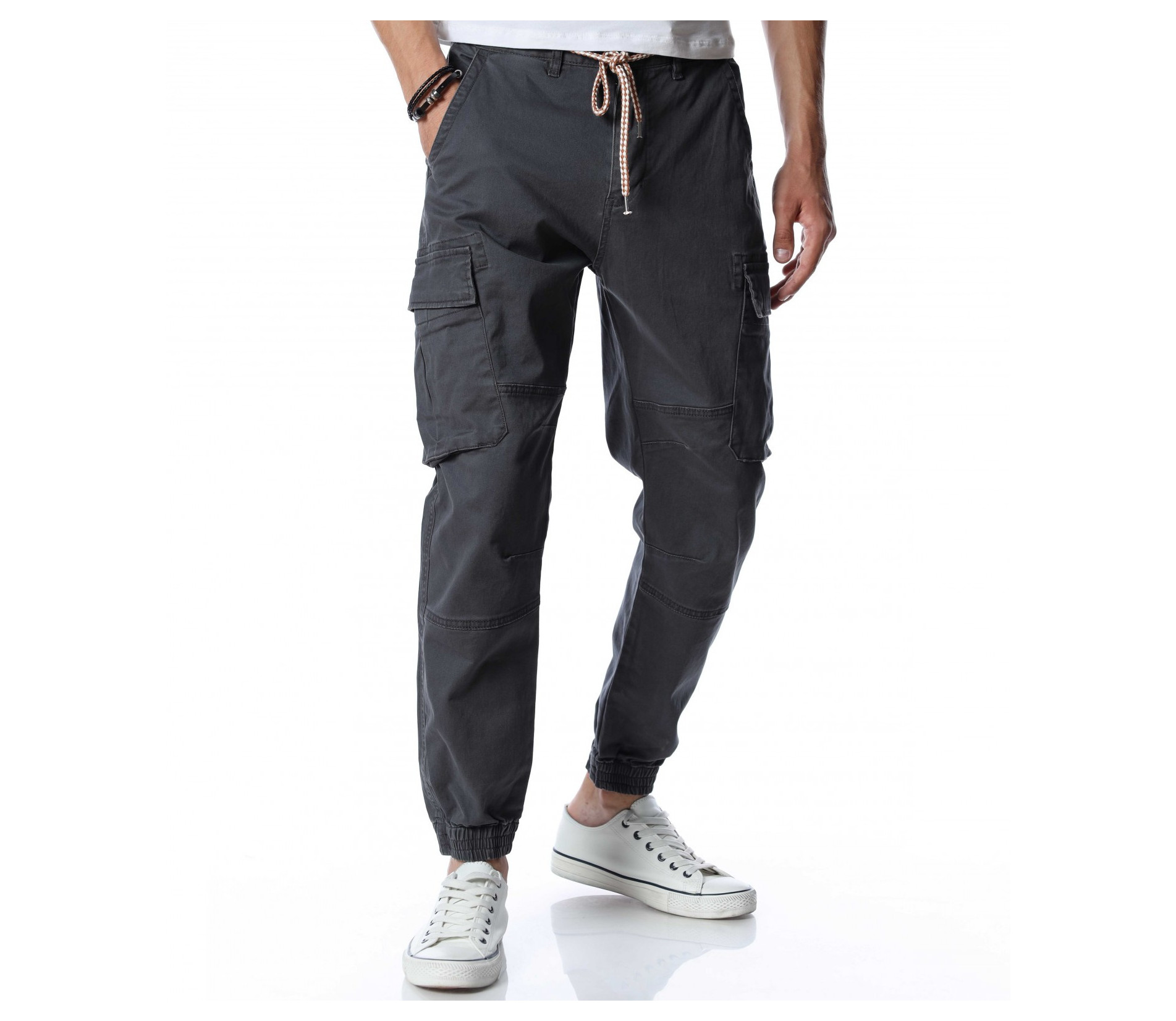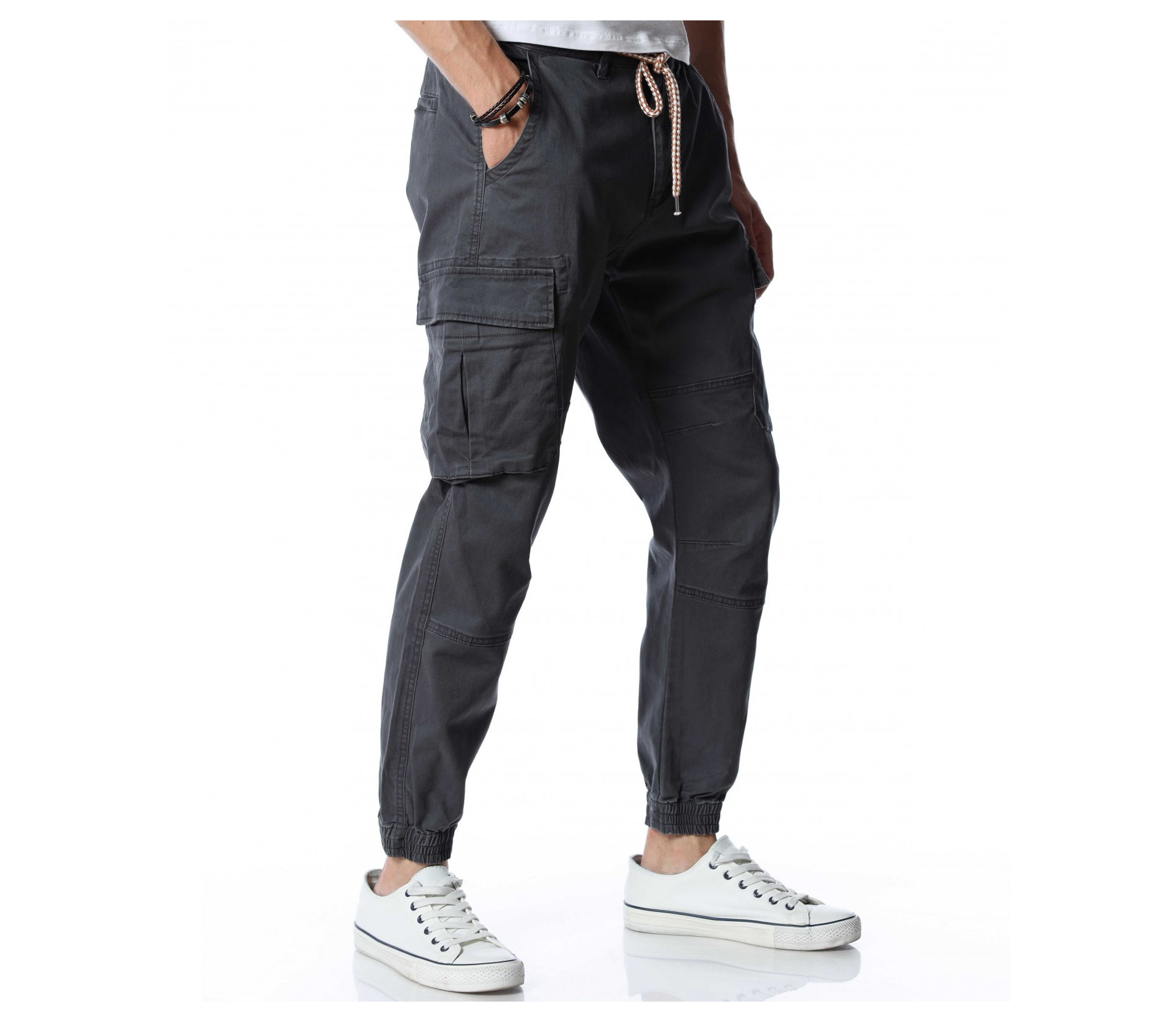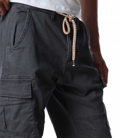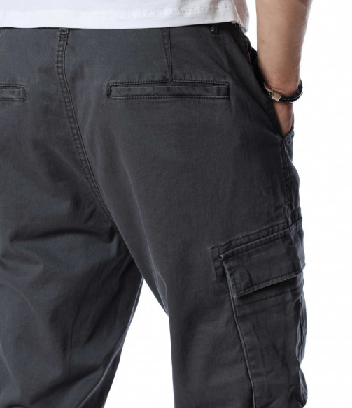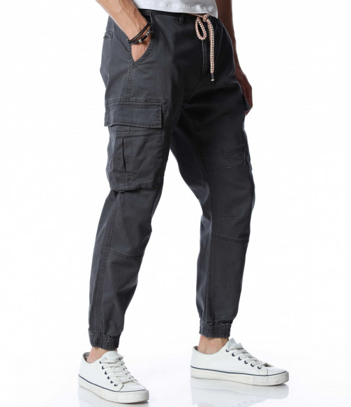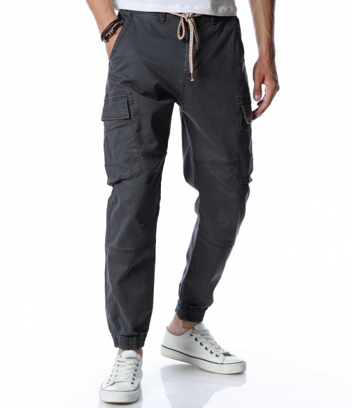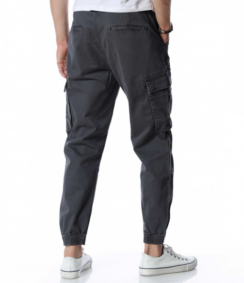 Мъжки, класически карго панталон. На талията са разположени връзки, отстрани забелязваме карго джобове с капаче, и разбира се стандартните джобове, за всеки панталон. На талията разполага с връзки, за да може по-лесно да регулирате ширината. При глезените забелязваме ластици, които прилежно прибират крачола. Комбинирайте с блуза, тениска, яке, риза, маратонки, кецове, подходящи обувки и любим аксесоар и няма да сбъркате с вашият аутфит.
