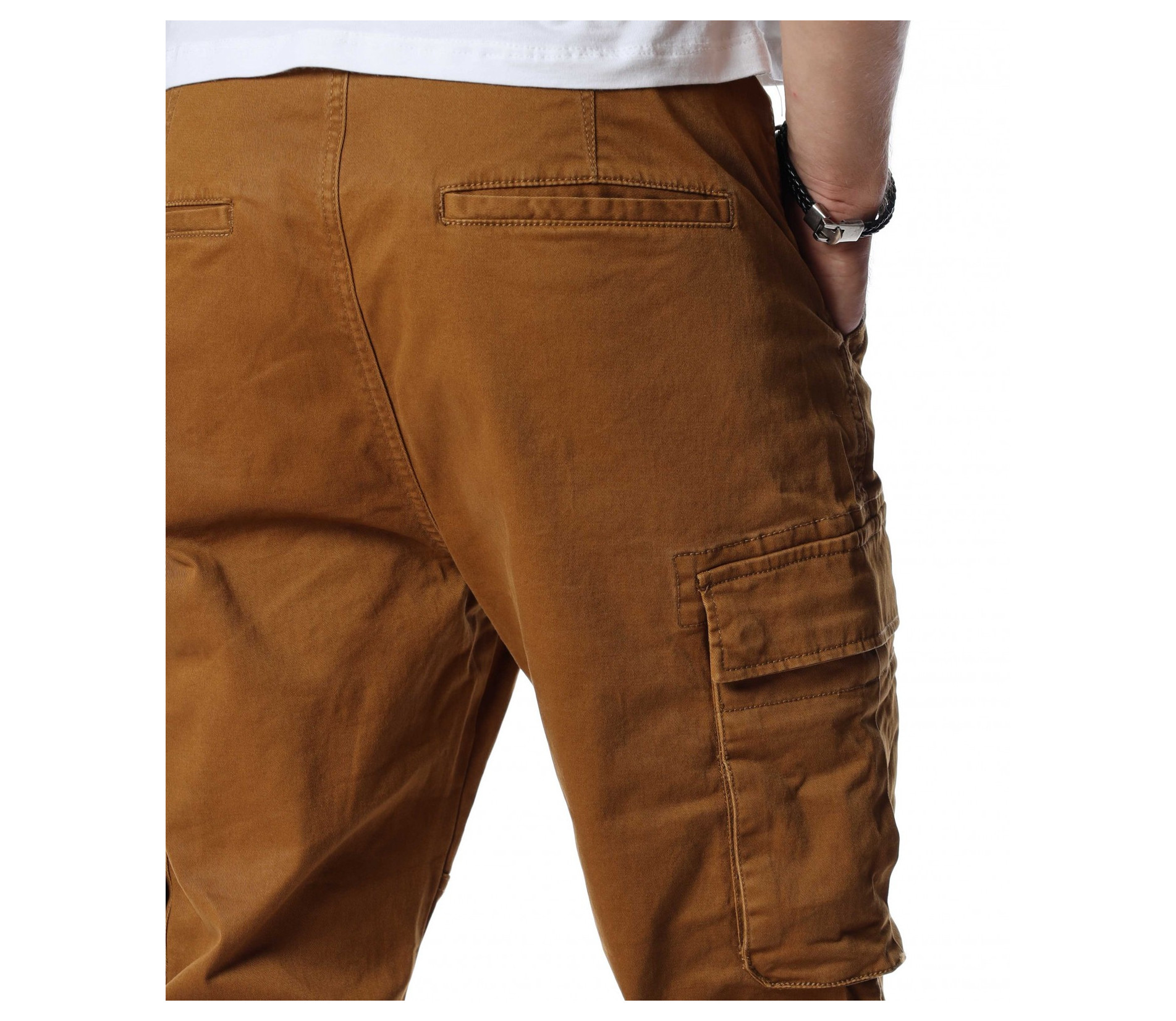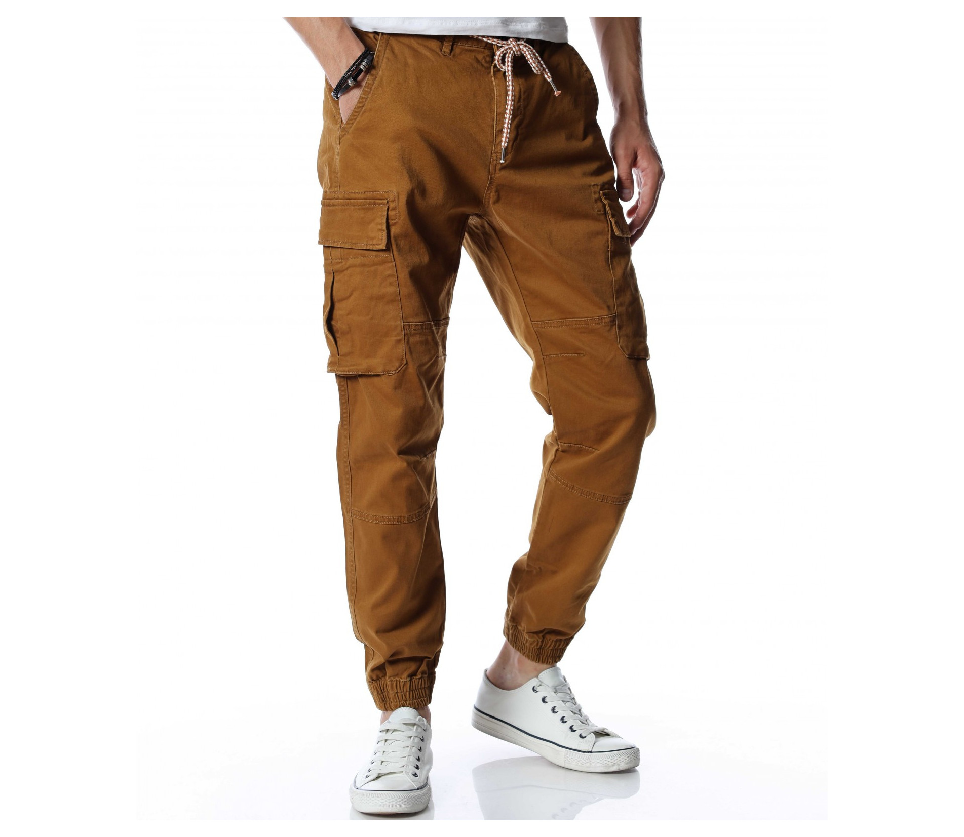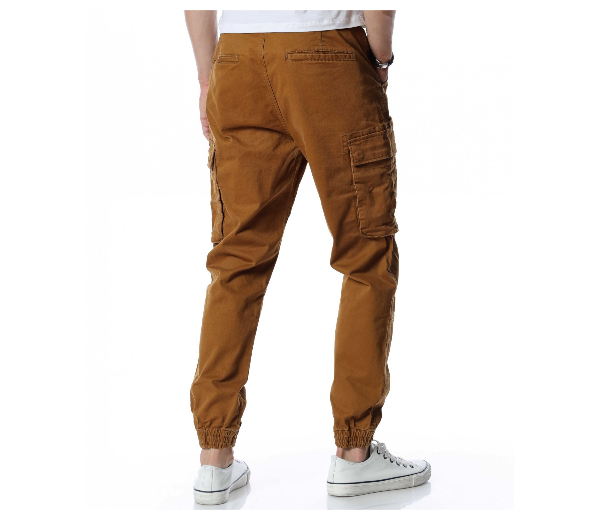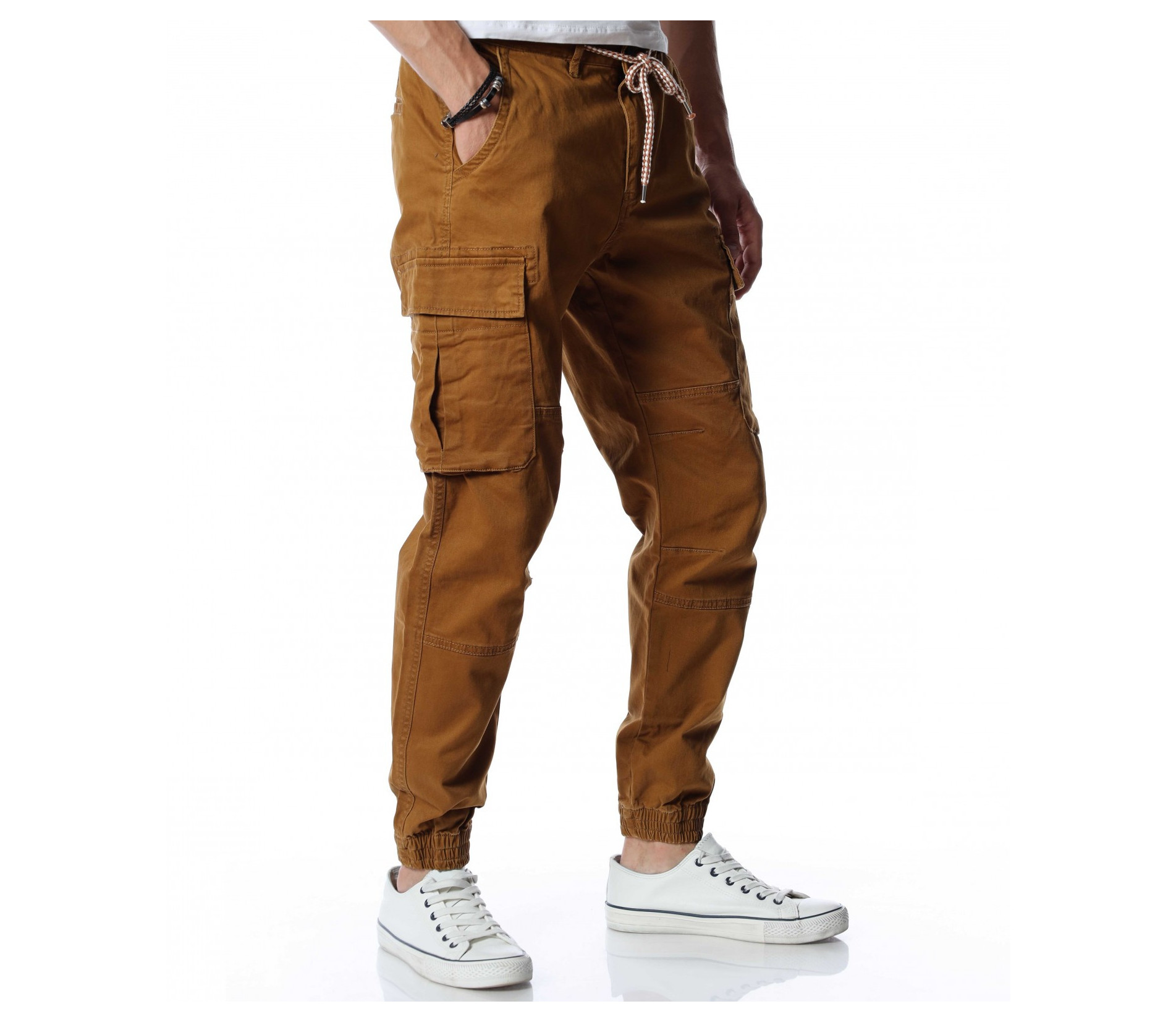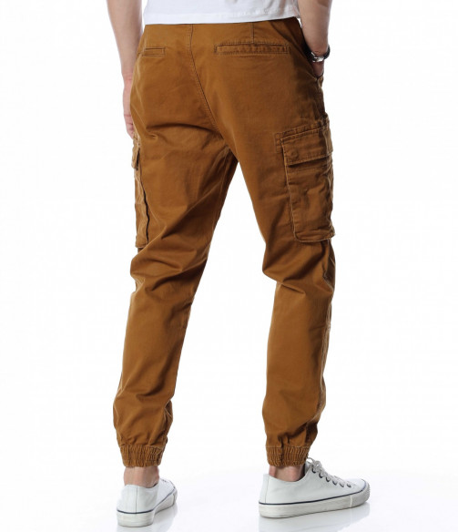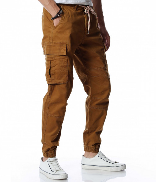 Мъжки, класически карго панталон. На талията са разположени връзки, отстрани забелязваме карго джобове с капаче, и разбира се стандартните джобове, за всеки панталон. На талията разполага с връзки, за да може по-лесно да регулирате ширината. При глезените забелязваме ластици, които прилежно прибират крачола. Комбинирайте с блуза, тениска, яке, риза, маратонки, кецове, подходящи обувки и любим аксесоар и няма да сбъркате с вашият аутфит.