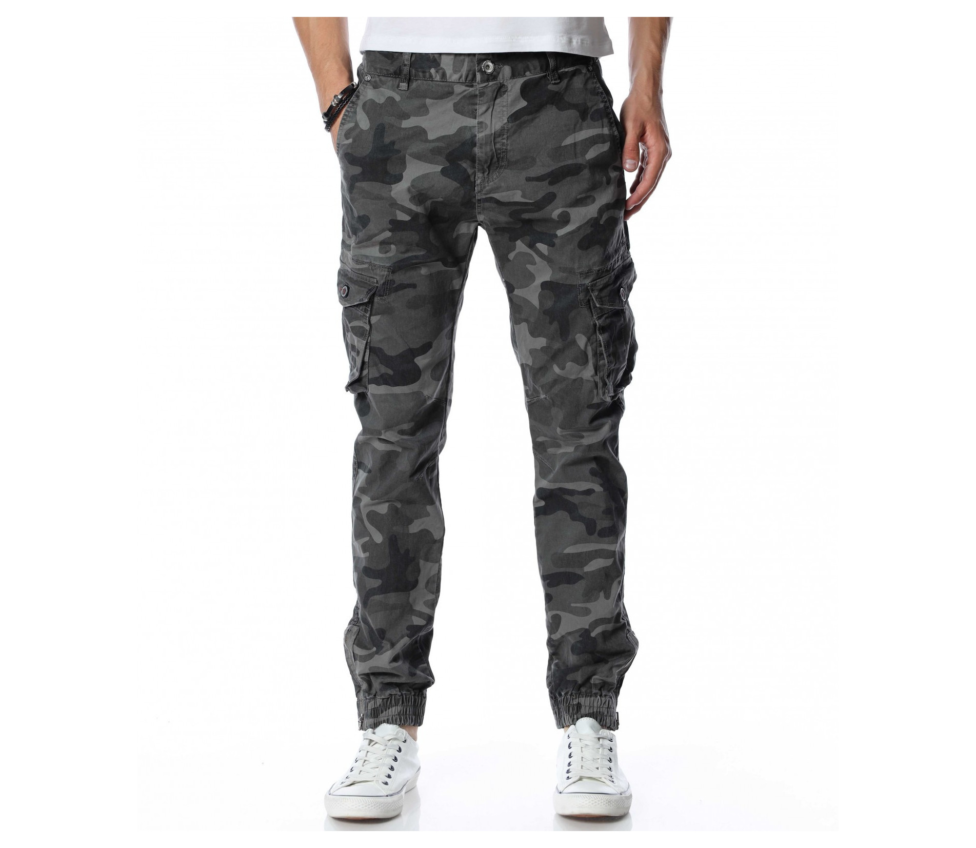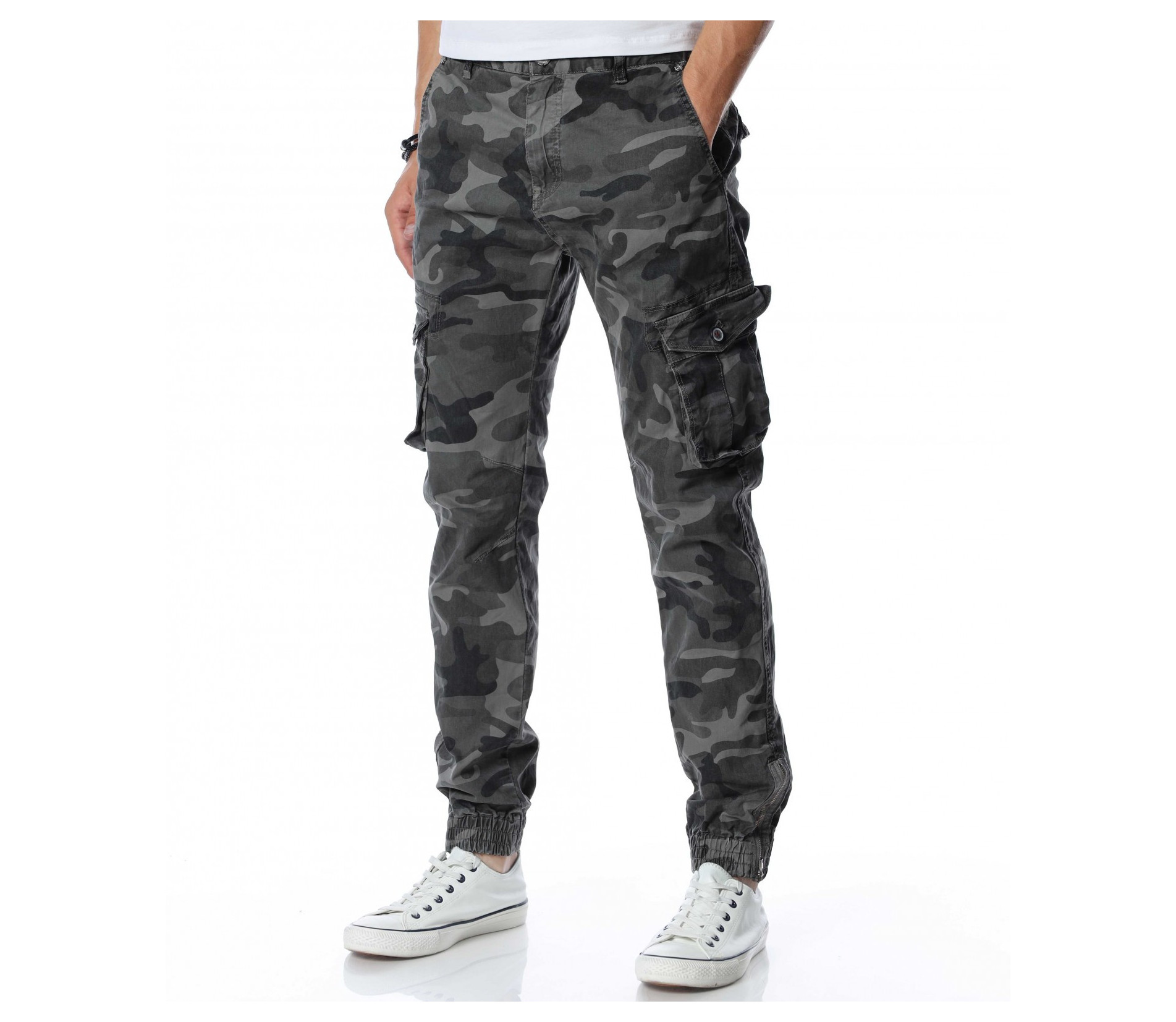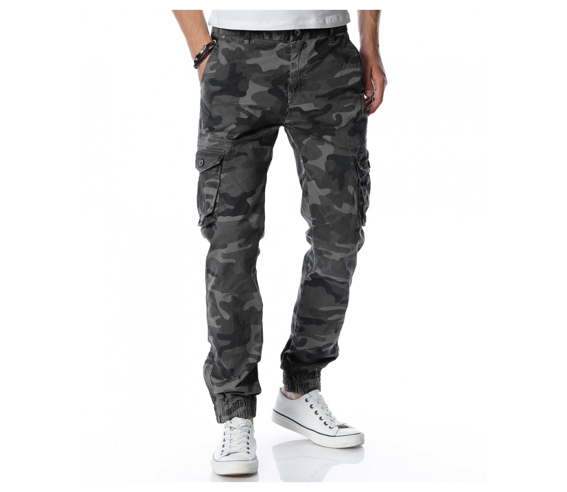 Мъжки, камуфлажен карго панталон. Моделът е изключително удобен и предпочитан. По цялата дължина е разположен камуфлажен десен. Закопчаването е с цип и копче, а джобовете са стандартни в предната и задната част и в допълнение дълбоки с капаче в страничната. На глезените са разполжени ластици, които прибират крачола. КОмбинирайте с блуза или тениска.