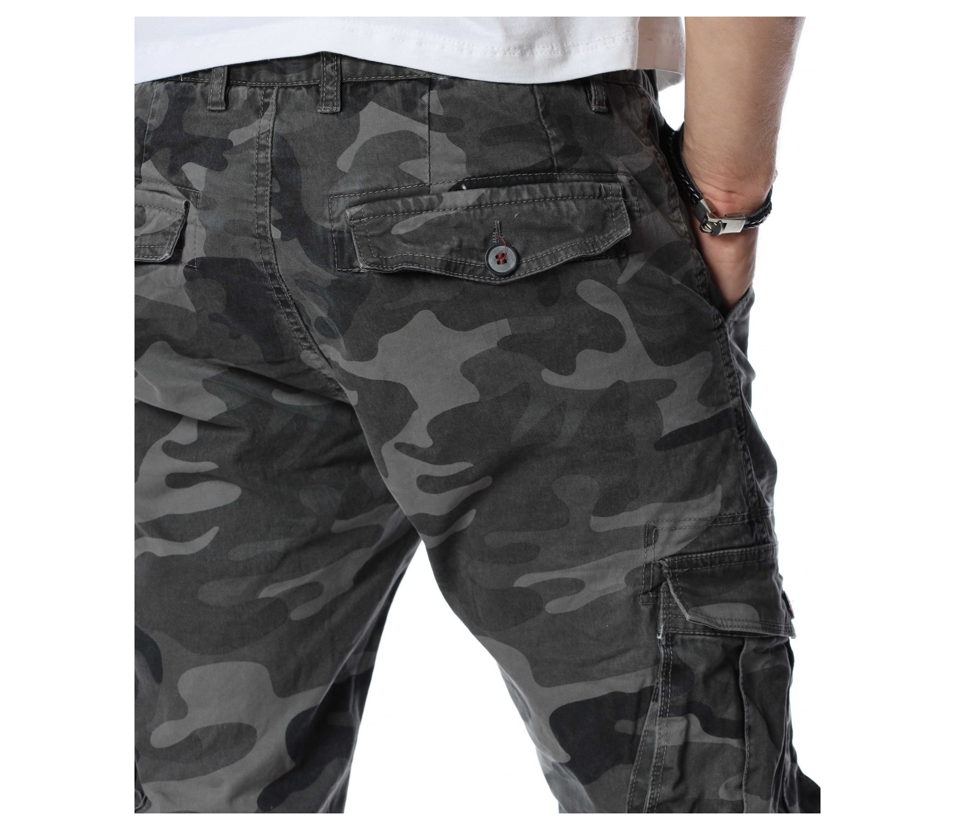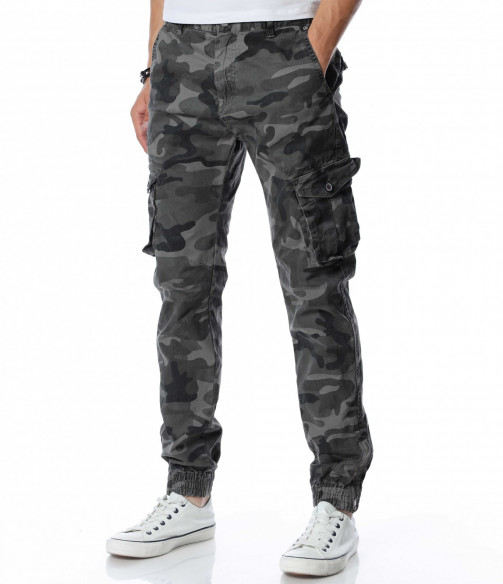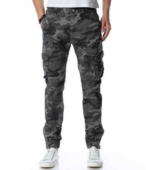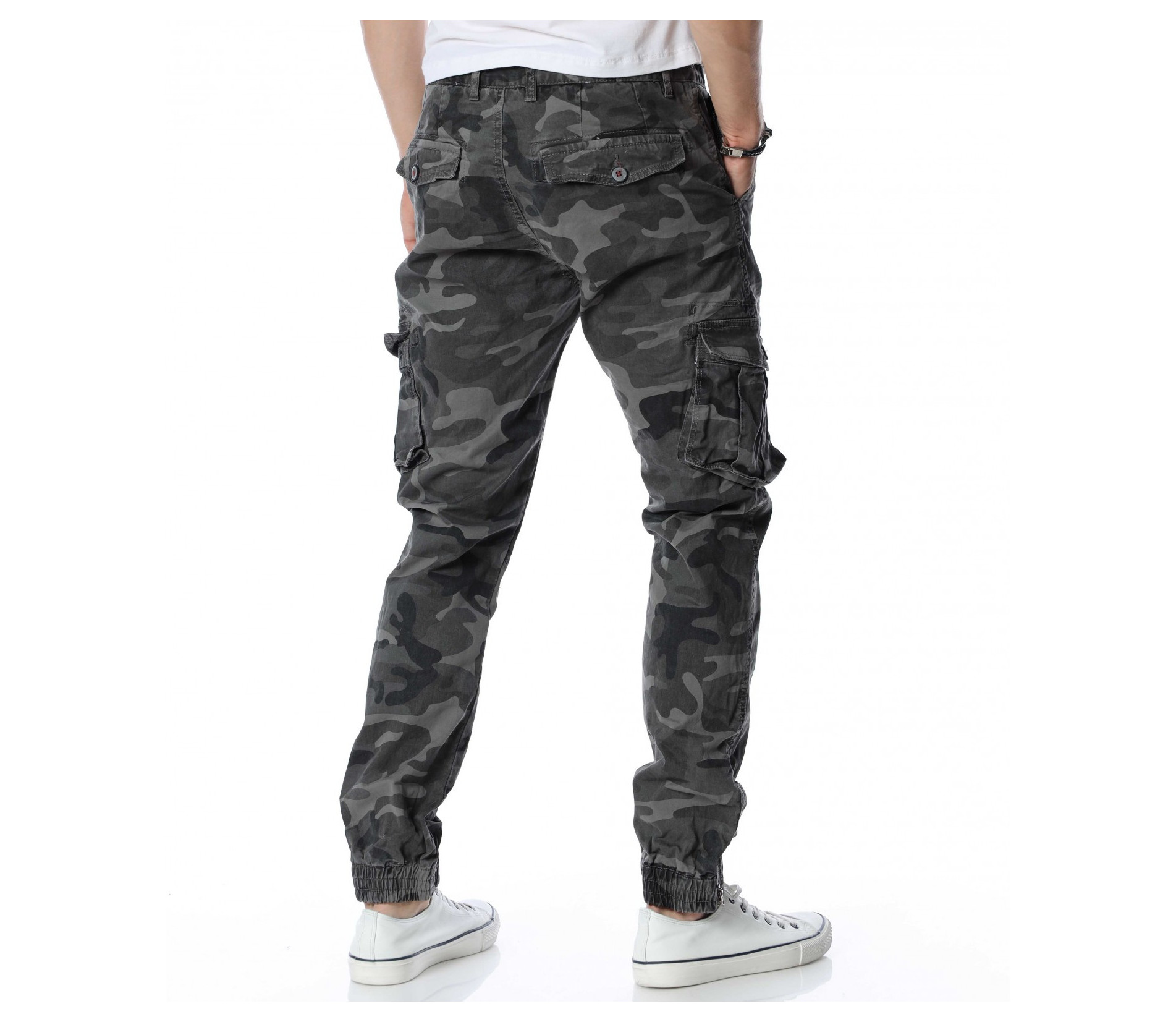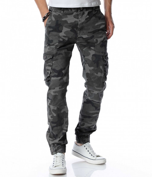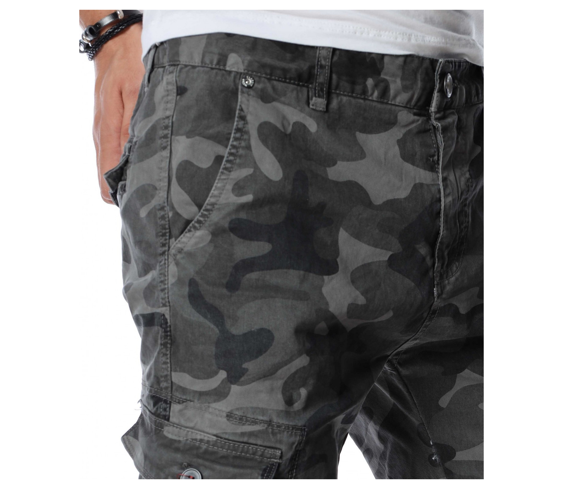 Мъжки, камуфлажен карго панталон. Моделът е изключително удобен и предпочитан. По цялата дължина е разположен камуфлажен десен. Закопчаването е с цип и копче, а джобовете са стандартни в предната и задната част и в допълнение дълбоки с капаче в страничната. На глезените са разполжени ластици, които прибират крачола. КОмбинирайте с блуза или тениска.