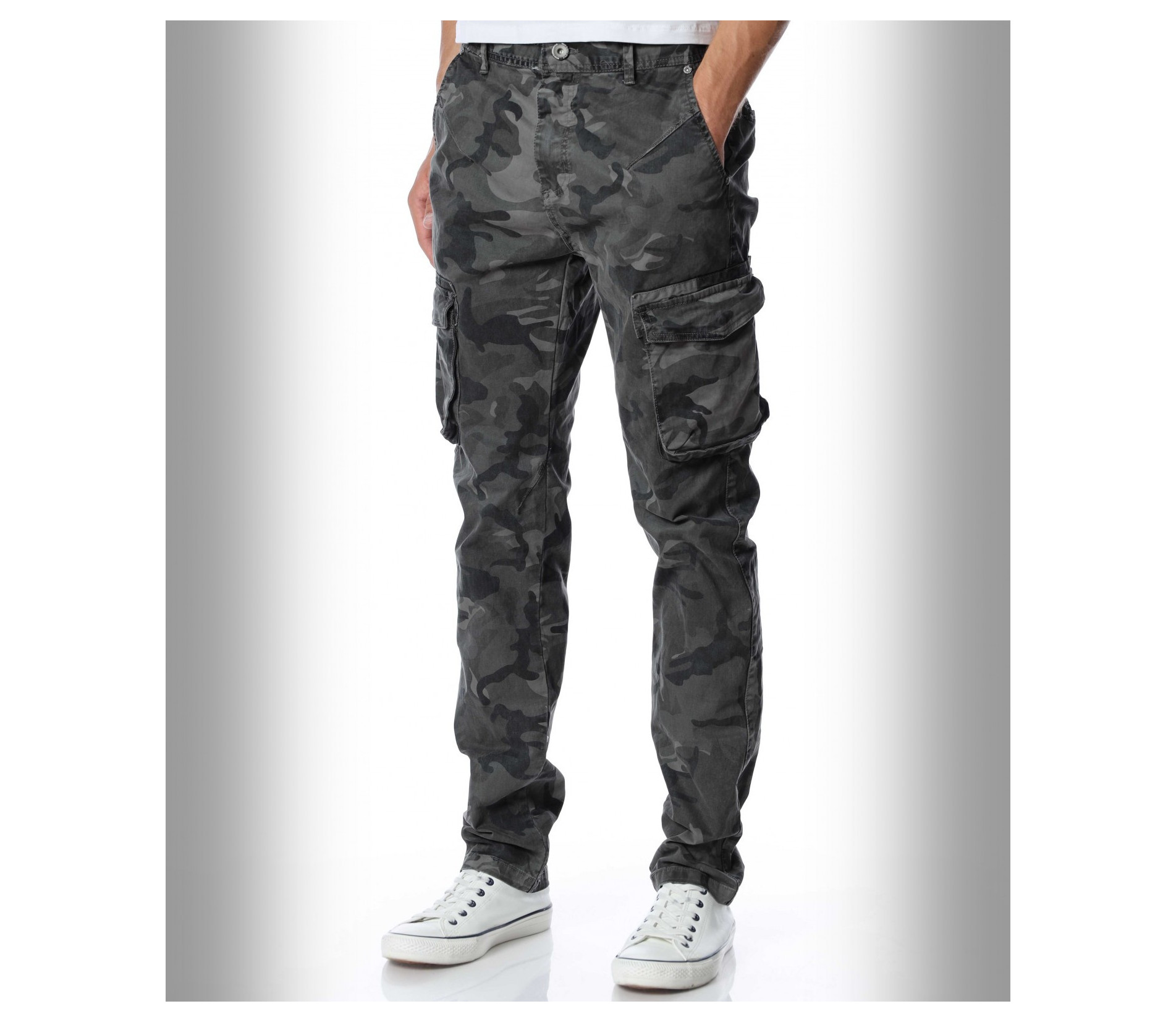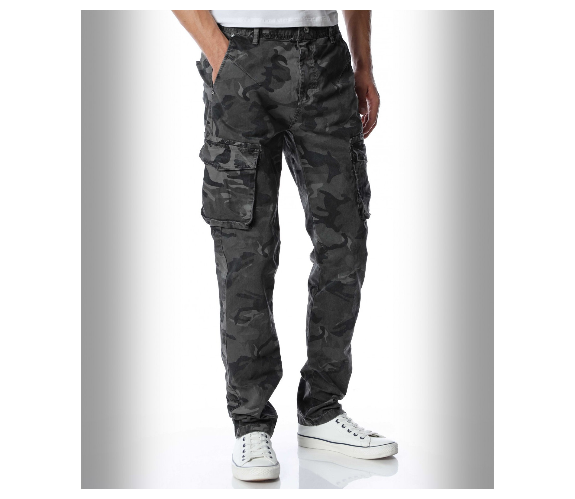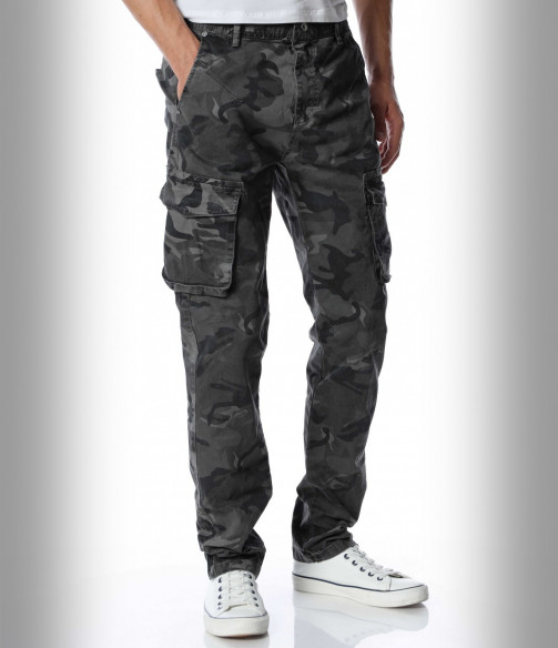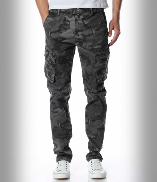 Мъжки, модерен карго панталон с камуфлажен десен. Моделът разполага с големи джобове в страничната част и стандартни в предната и задната. Закопчаването се състои в цип и копче. Кройката следва идеално линиите на тялото. Изработен от памучна материя и еластант. Комбинирайте с кецове, маратонки, блуза и любим аксесоар.