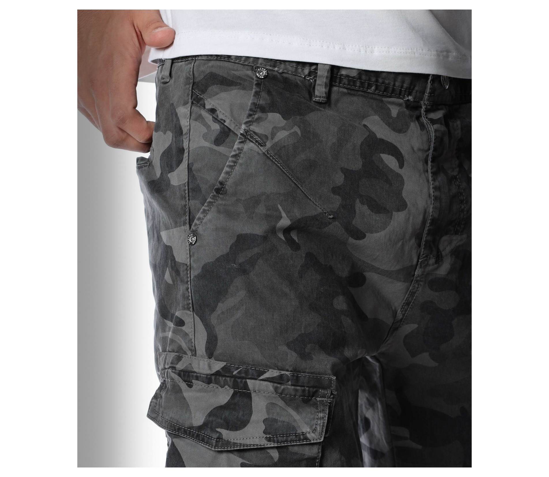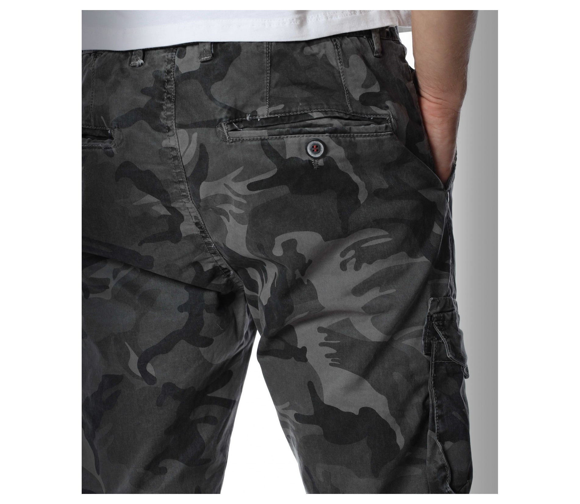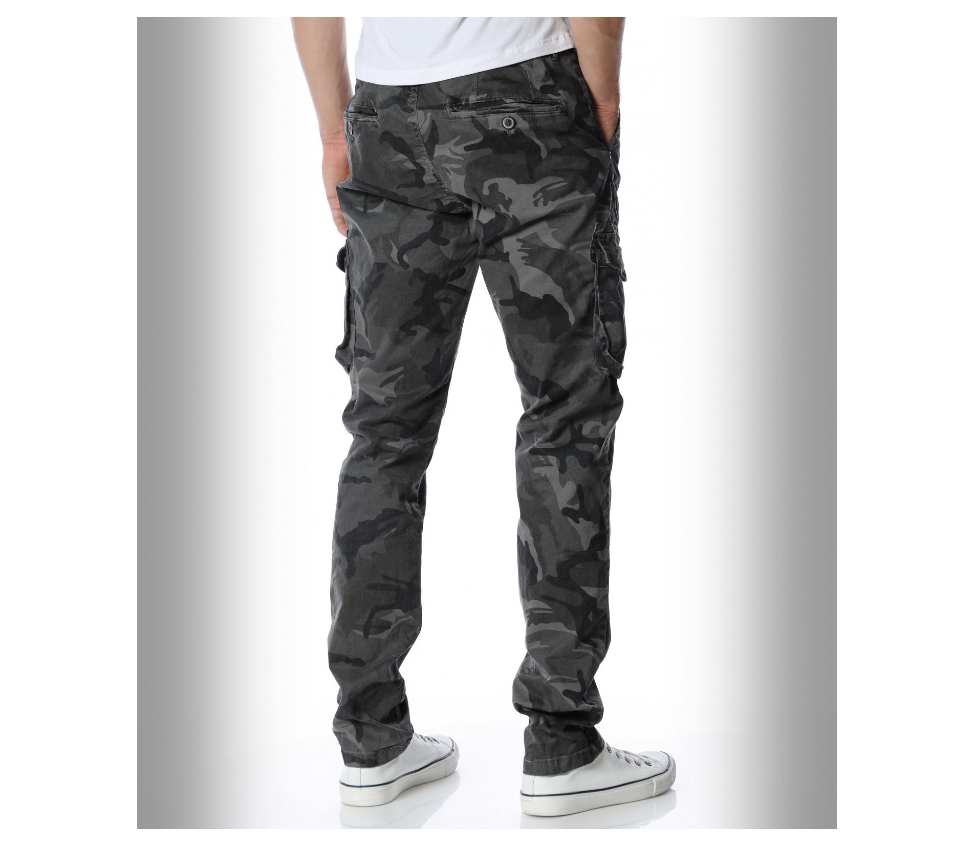 Мъжки, модерен карго панталон с камуфлажен десен. Моделът разполага с големи джобове в страничната част и стандартни в предната и задната. Закопчаването се състои в цип и копче. Кройката следва идеално линиите на тялото. Изработен от памучна материя и еластант. Комбинирайте с кецове, маратонки, блуза и любим аксесоар.