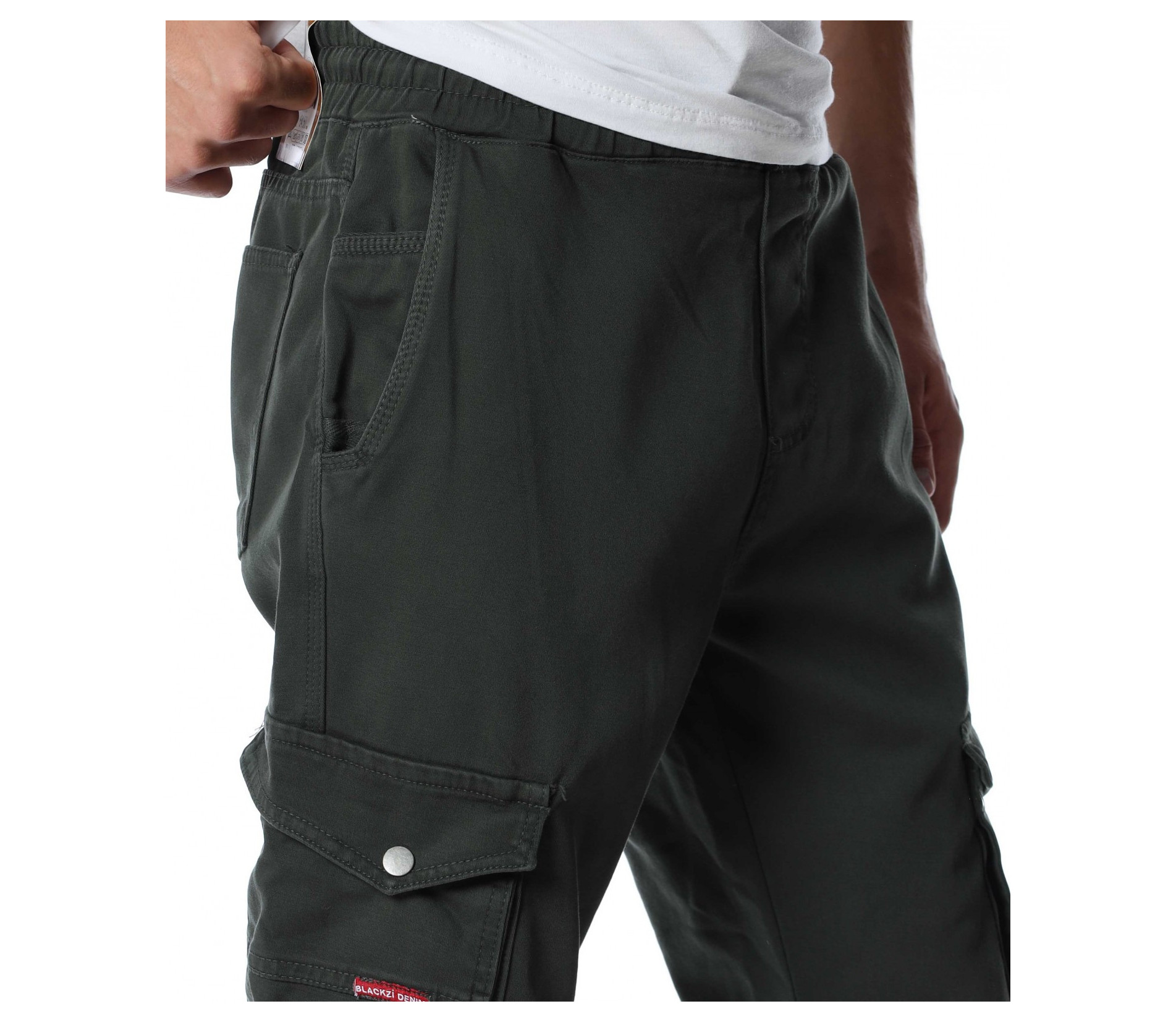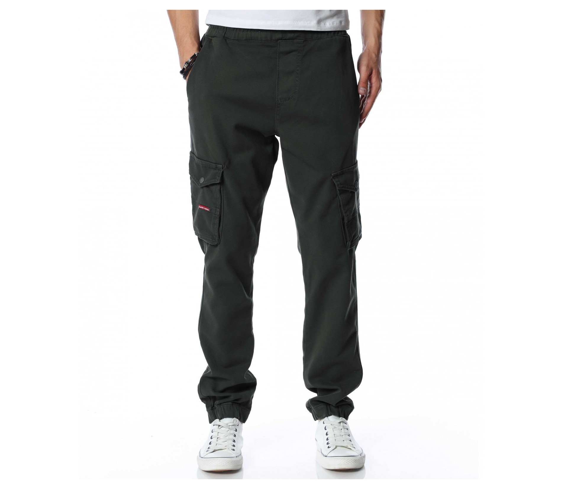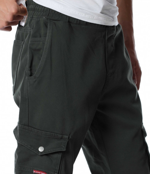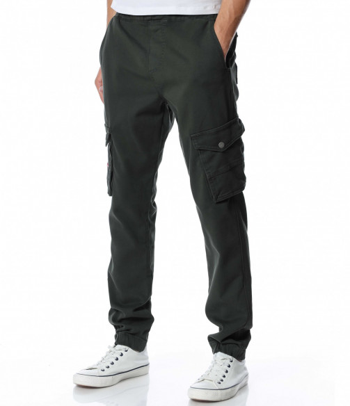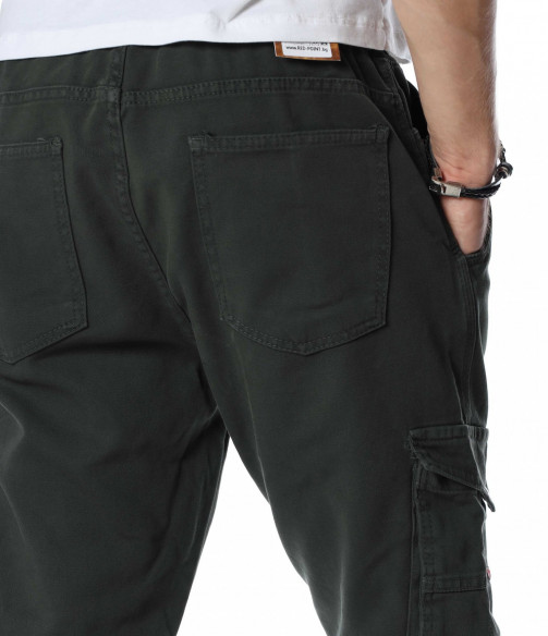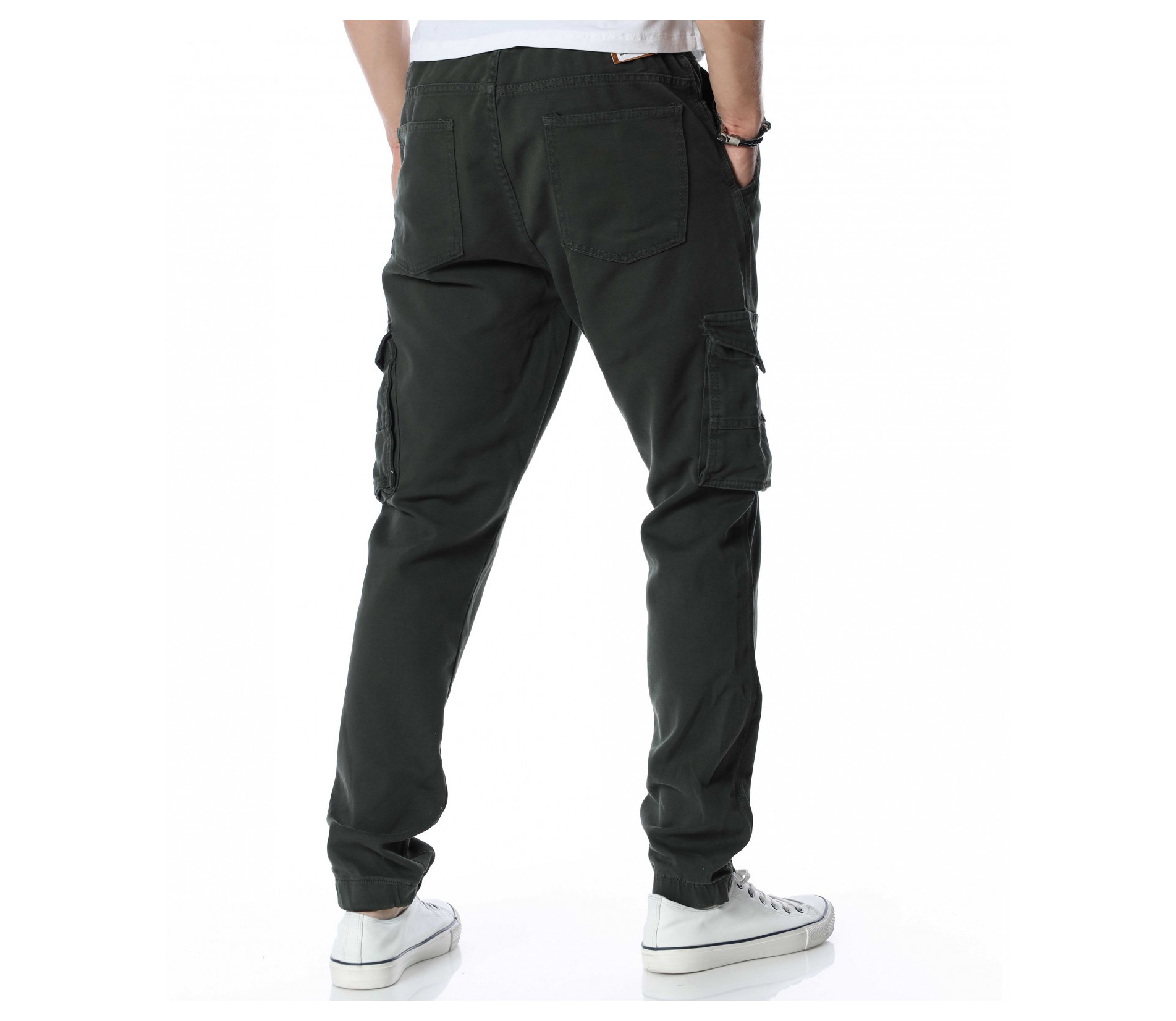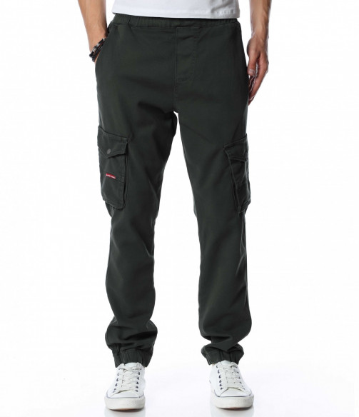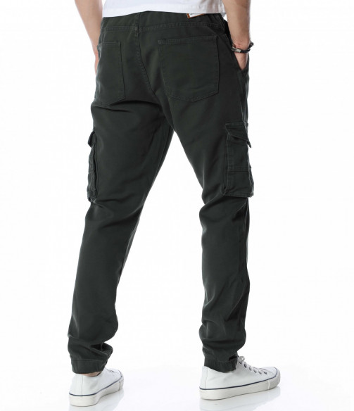 Мъжки, едноцветен карго панталон. Цялата дължина е изчистена от декорации и десени. Кройката е леко свободна, без да изглежда широка. Джобовете са стандартни в горната част и два дълбоки, с капачета отстрани. На талията са поставени връзки за регулиране на ширината, а при глезените забелязваме ластик, който прибира крачола. Добавете блуза и маратонки и аутфитът ви е завършен.