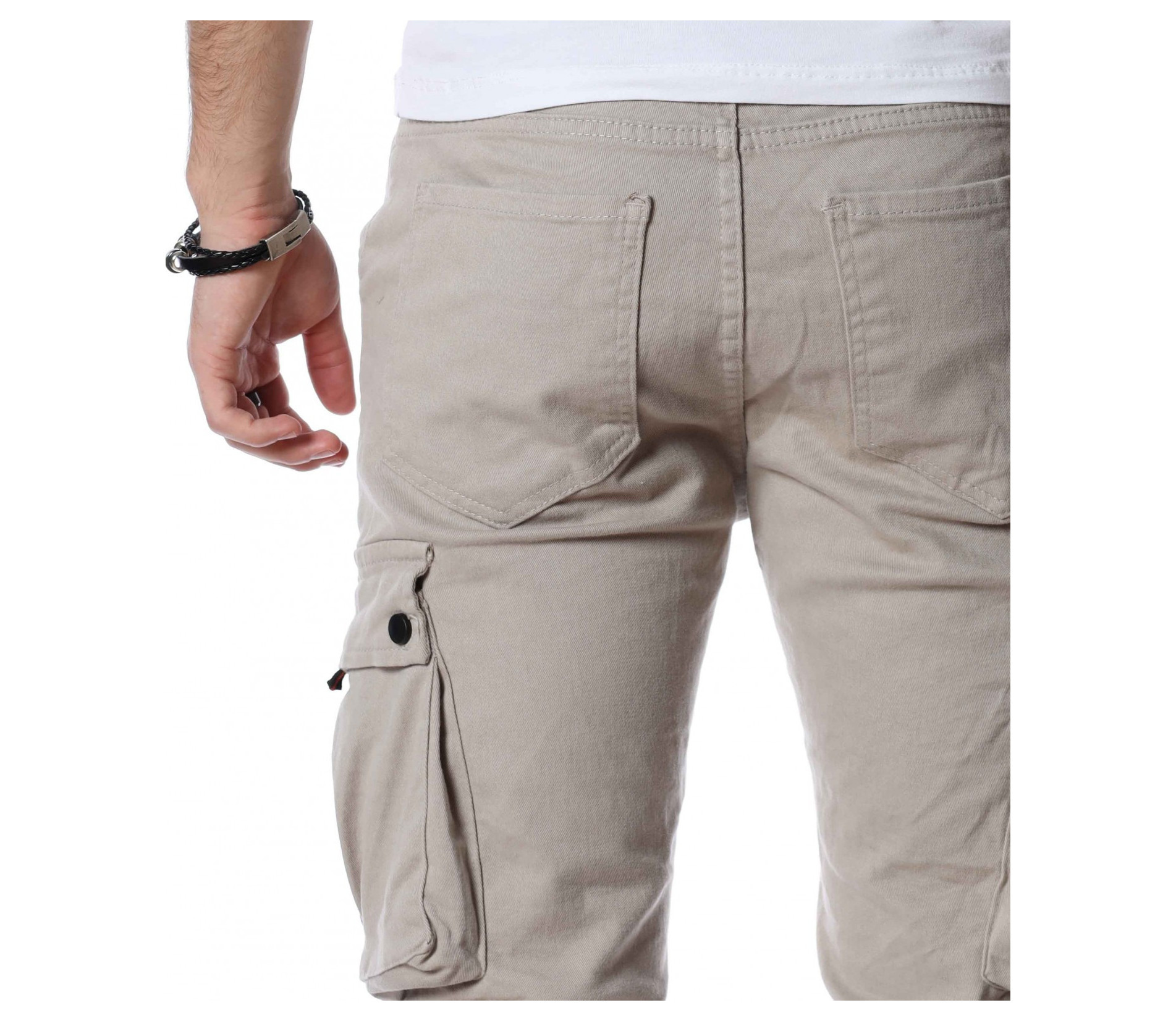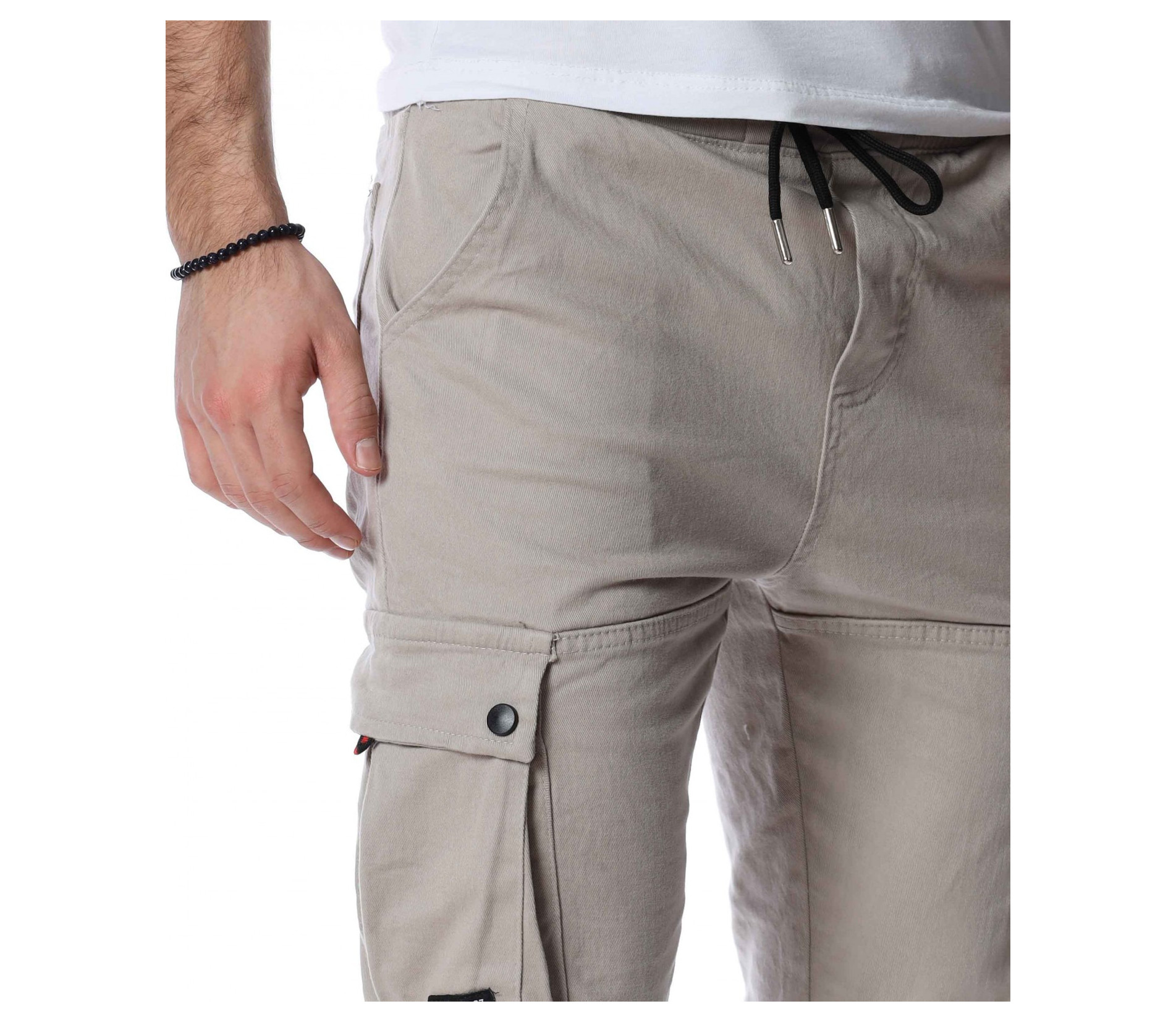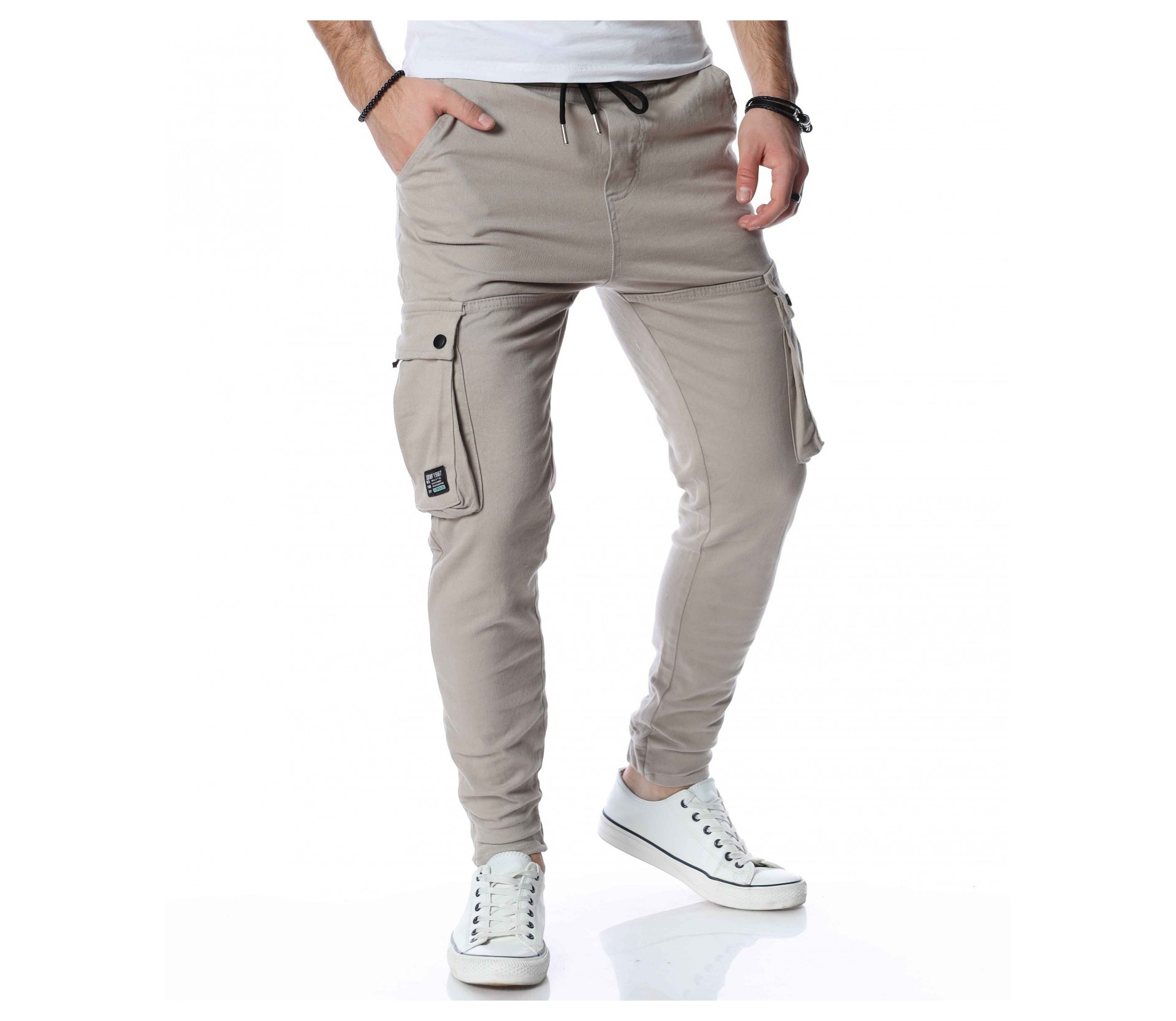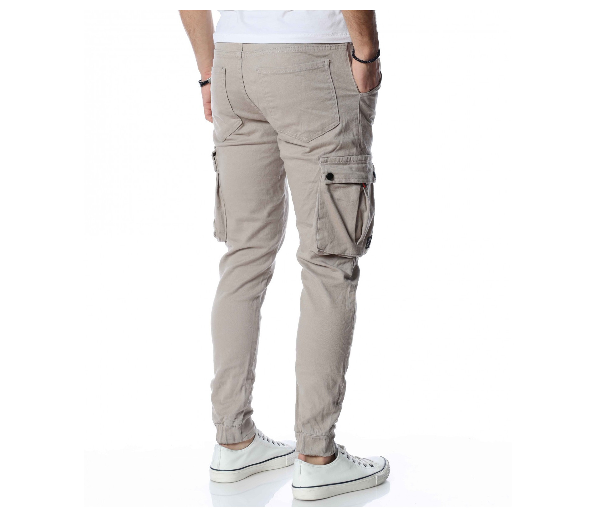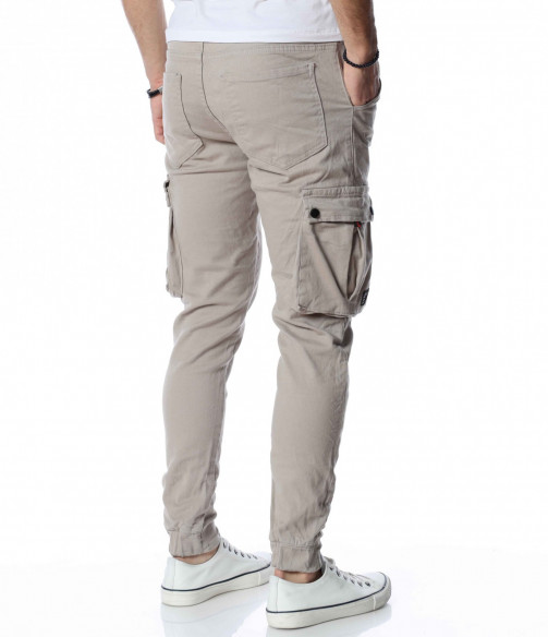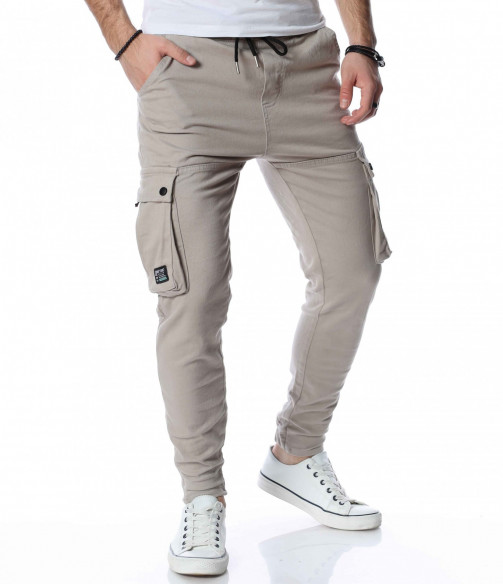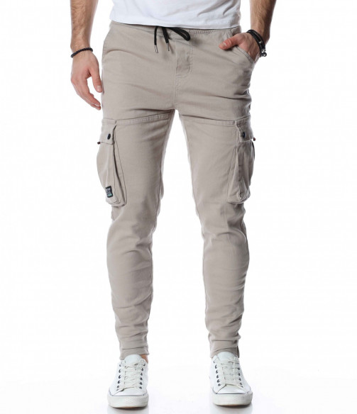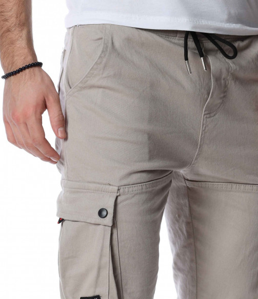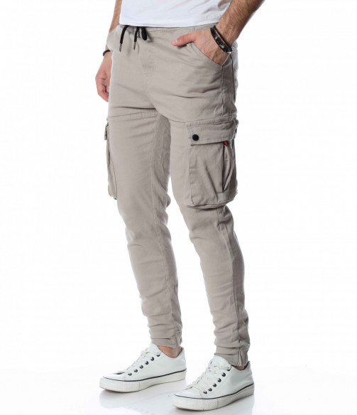 ОПИСАНИЕ НА ПРОДУКТА: Закачлив, удобен и силно забележим модел мъжки панталон, подходящ за ежедневен аутфит. В основата си е поверен изцяло на еднотонна основа, която може да откриете в три цветови аспекта, а именно светло сив, бежов и традиционен черен. Кройката е skinny fit, придавайки значителен  комфорт на тялото Ви. Талията е с комфортен ластик и връзка и ви дава възможност за регулиране по ваше желание. Както винаги и тук джобовете са основен акцент. Разделени са на три групи, като първата е тази при крачолите, където са поставени два релефни такива, с допълнение от малки капачета. Вторите се намират малко по-нагоре, с семпла италианска форма. Последните два джоба, които впечатляват са на гърба, като са подбрани в типична за деним панталоните форма, а именно голяма външна, с лек заострен край.