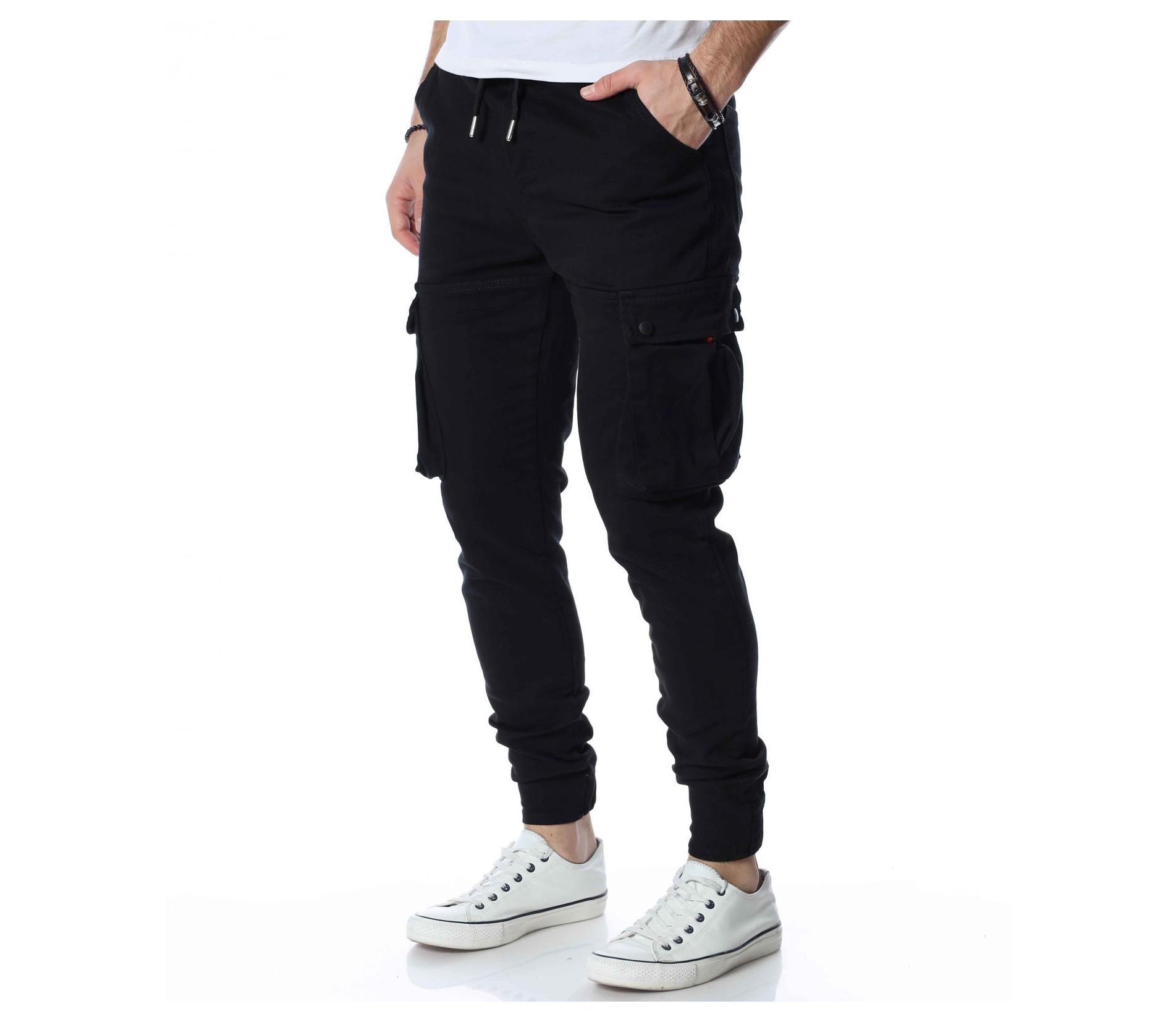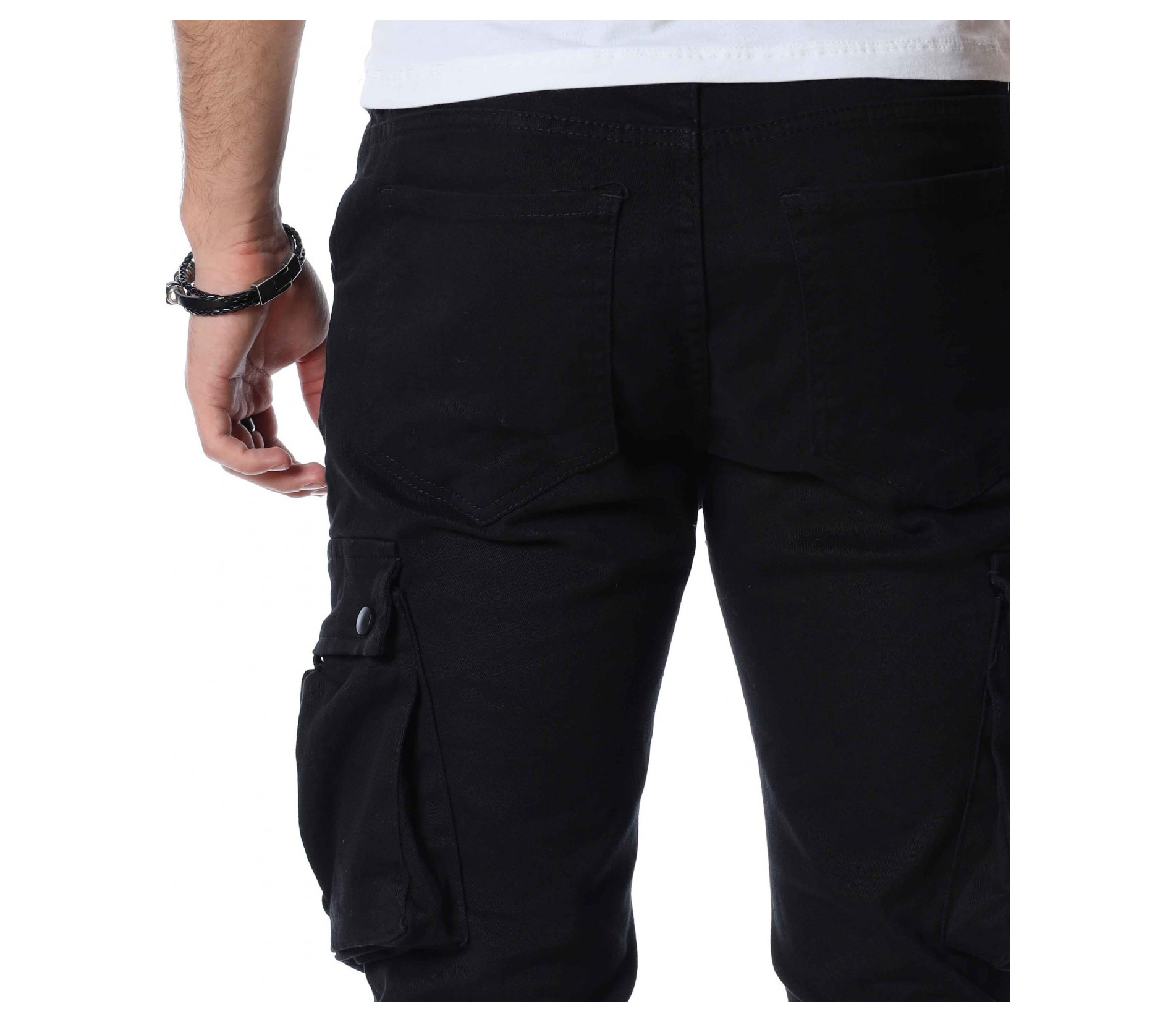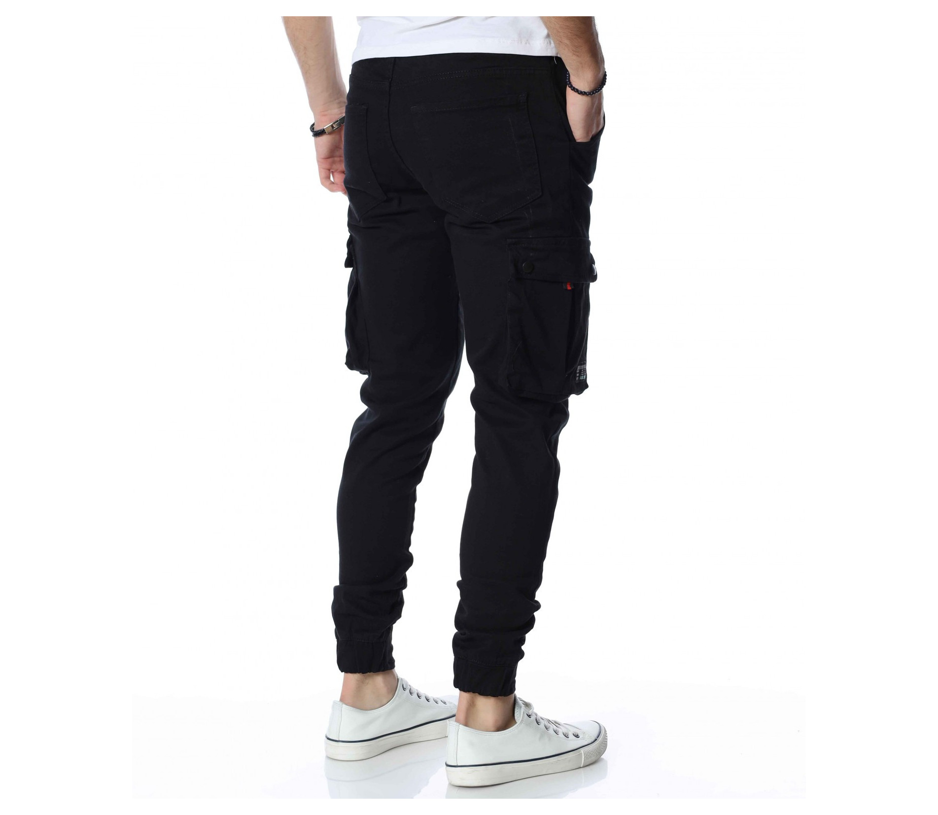 ОПИСАНИЕ НА ПРОДУКТА: Закачлив, удобен и силно забележим модел мъжки панталон, подходящ за ежедневен аутфит. В основата си е поверен изцяло на еднотонна основа, която може да откриете в три цветови аспекта, а именно светло сив, бежов и традиционен черен. Кройката е skinny fit, придавайки значителен  комфорт на тялото Ви. Талията е с комфортен ластик и връзка и ви дава възможност за регулиране по ваше желание. Както винаги и тук джобовете са основен акцент. Разделени са на три групи, като първата е тази при крачолите, където са поставени два релефни такива, с допълнение от малки капачета. Вторите се намират малко по-нагоре, с семпла италианска форма. Последните два джоба, които впечатляват са на гърба, като са подбрани в типична за деним панталоните форма, а именно голяма външна, с лек заострен край.