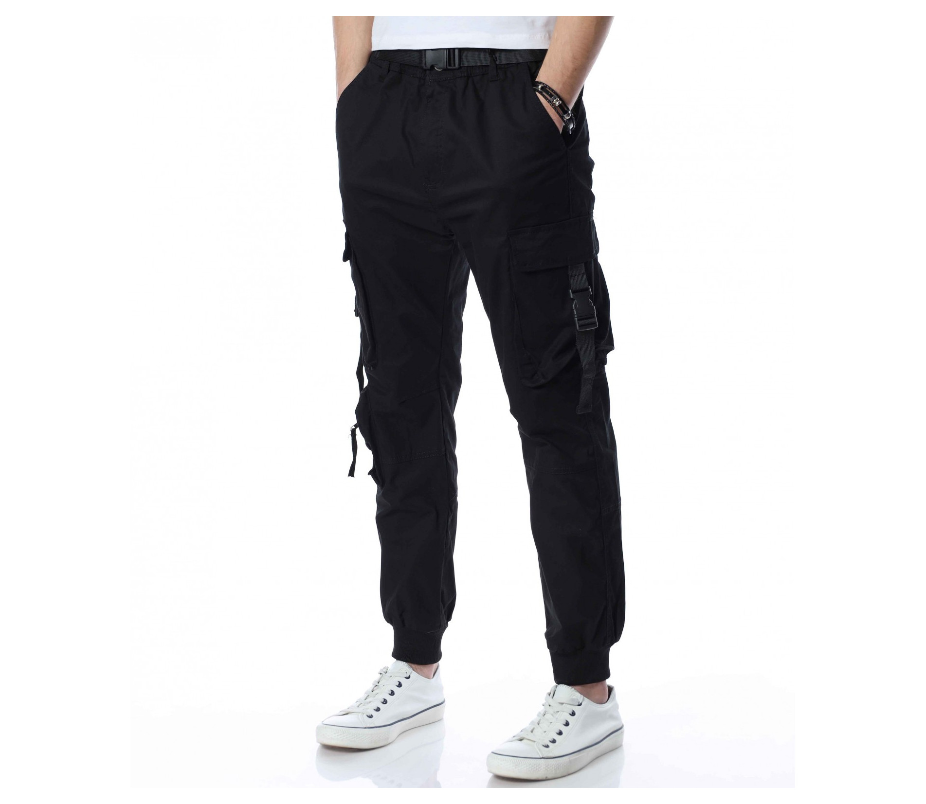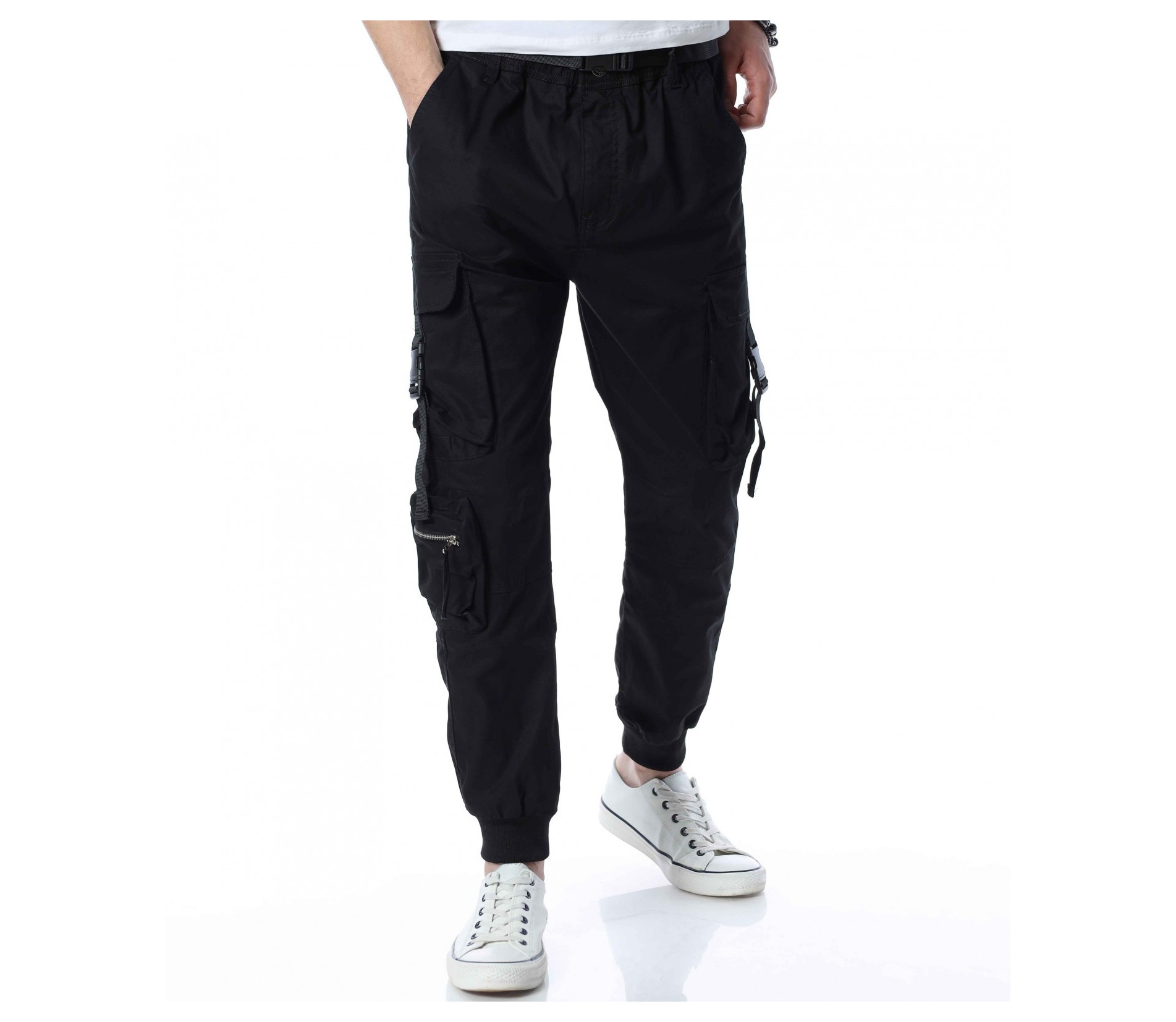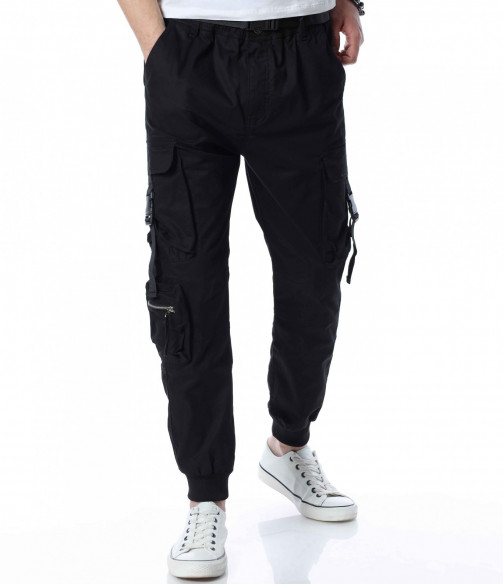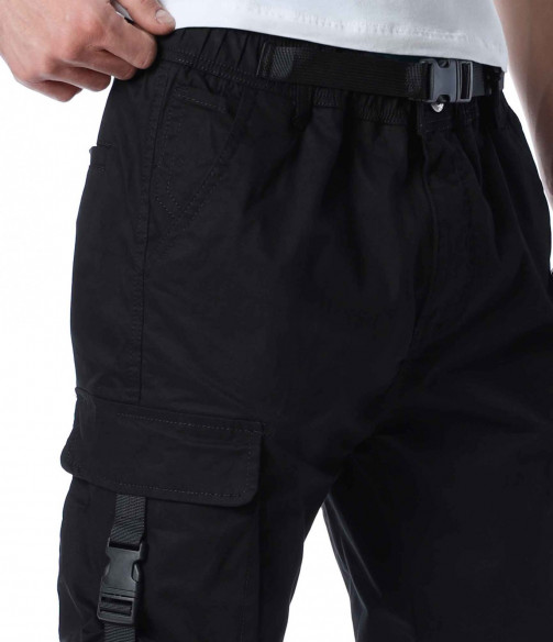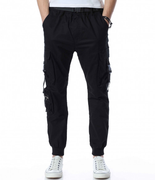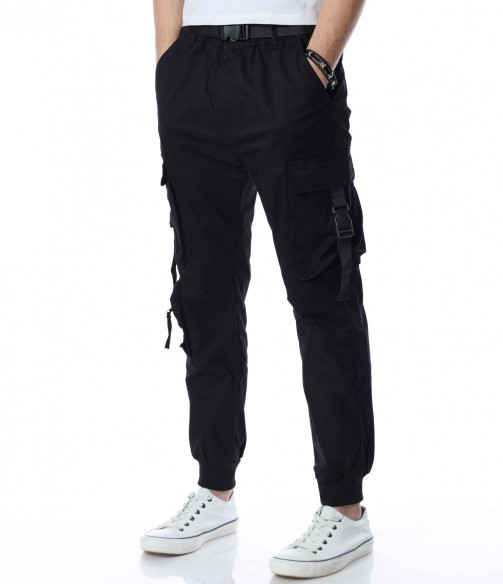 ОПИСАНИЕ НА ПРОДУКТА: Представяме ви актуален, мъжки, черен карго панталон от новата ни колекция. Моделът е много разчупен и удобен благодарение на страничните си джобове, разположени два от едната страна и един от другата. Благодарение на тях можете да си спестите носенето на чанта, защото вече имате място на една ръка разстояние за важните за вас неща. Моделът е снабден и с практичен спортен колан, чрез който да фиксирате ширината в кръста. Крачолите завършват с ластик, което категорично затвърждава лидерските му позиции в списъка с модели, които трябва да имате за сезона. Комбинирайте със спортни обувки и елек за перфектна визия и комфорт.