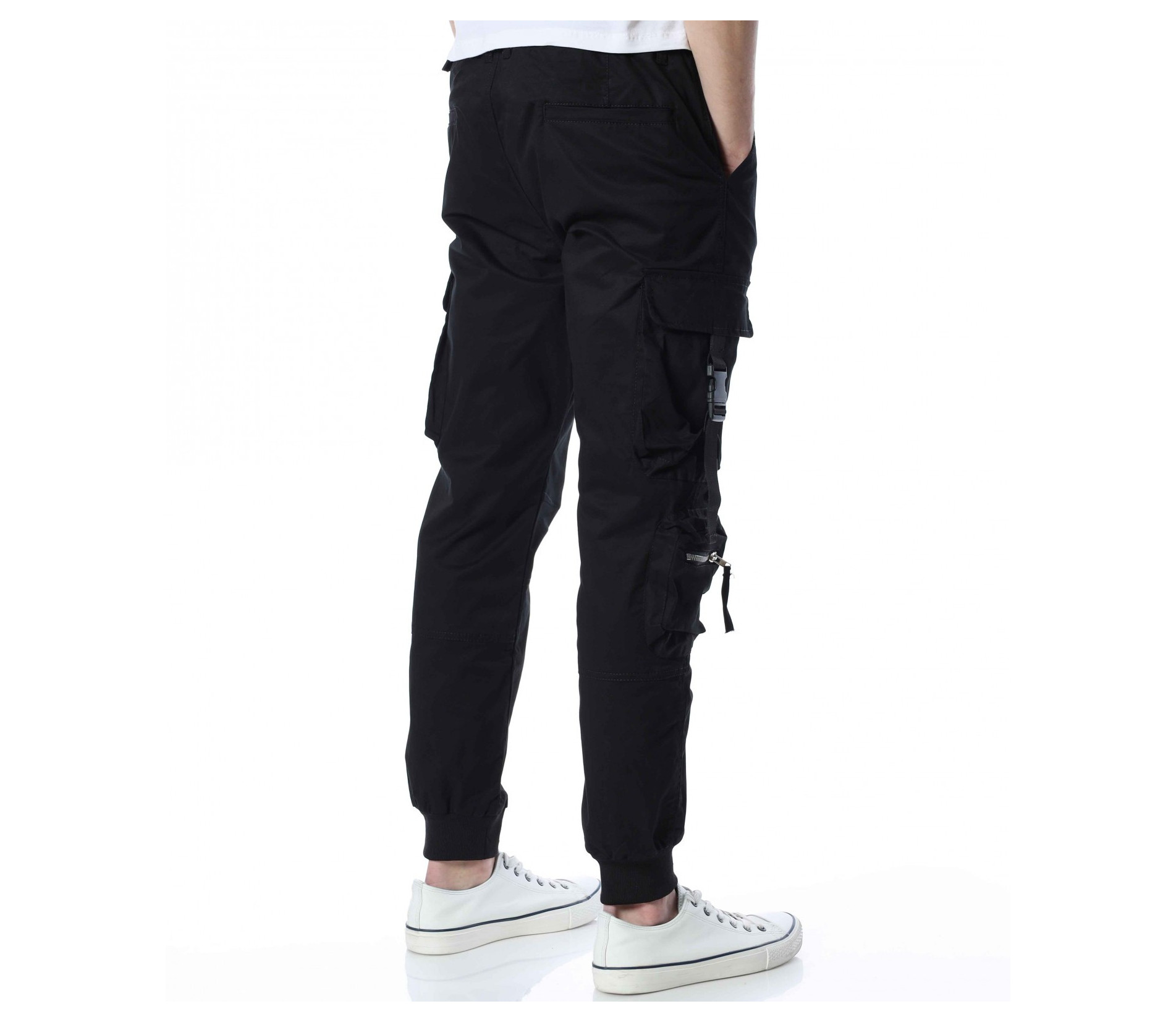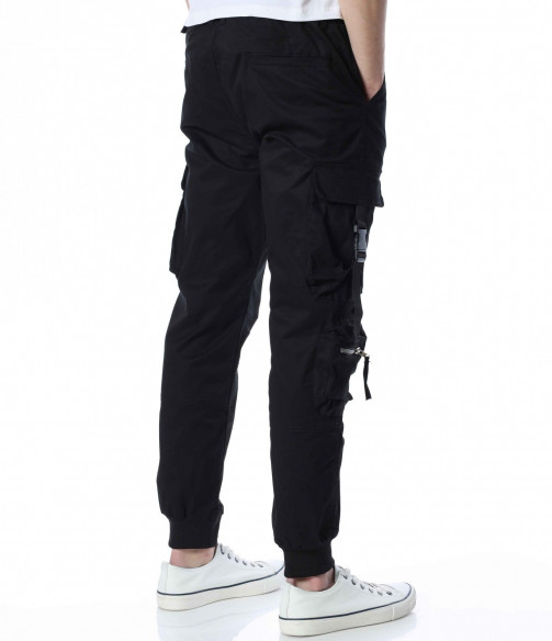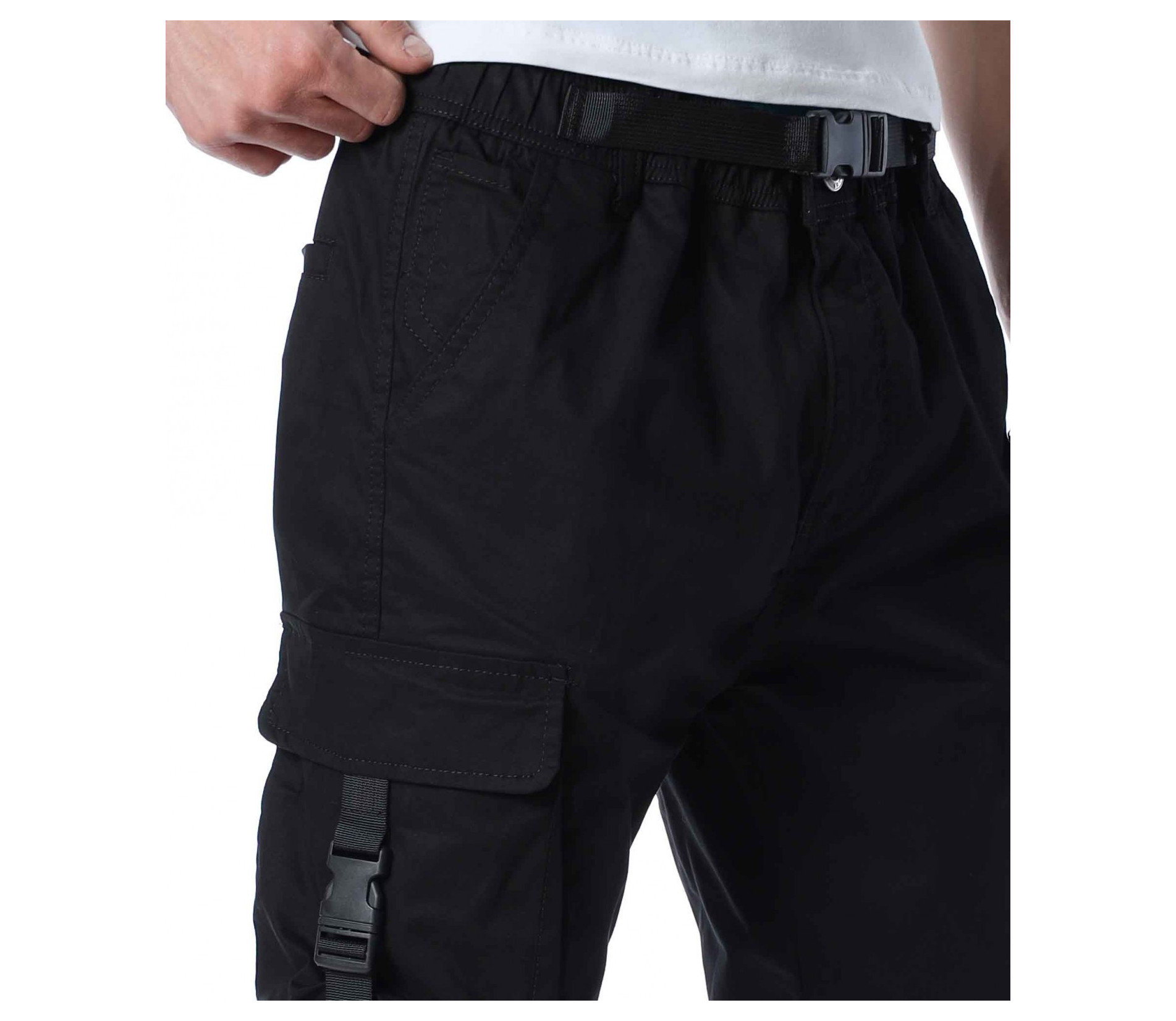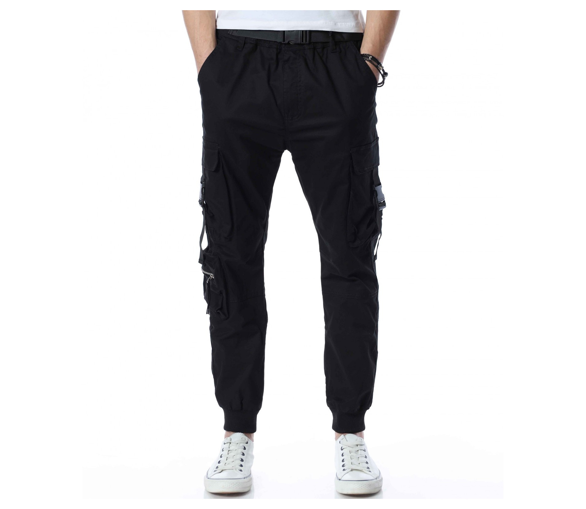 ОПИСАНИЕ НА ПРОДУКТА: Представяме ви актуален, мъжки, черен карго панталон от новата ни колекция. Моделът е много разчупен и удобен благодарение на страничните си джобове, разположени два от едната страна и един от другата. Благодарение на тях можете да си спестите носенето на чанта, защото вече имате място на една ръка разстояние за важните за вас неща. Моделът е снабден и с практичен спортен колан, чрез който да фиксирате ширината в кръста. Крачолите завършват с ластик, което категорично затвърждава лидерските му позиции в списъка с модели, които трябва да имате за сезона. Комбинирайте със спортни обувки и елек за перфектна визия и комфорт.