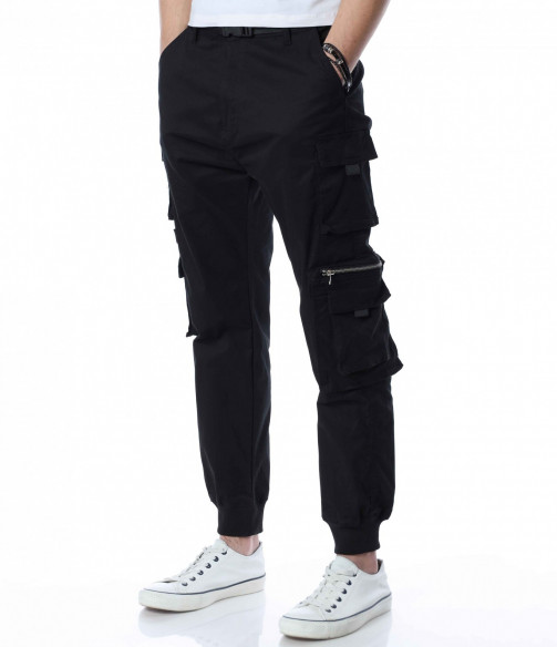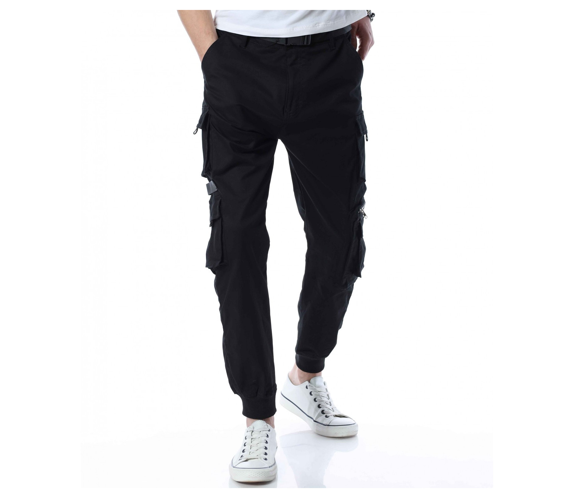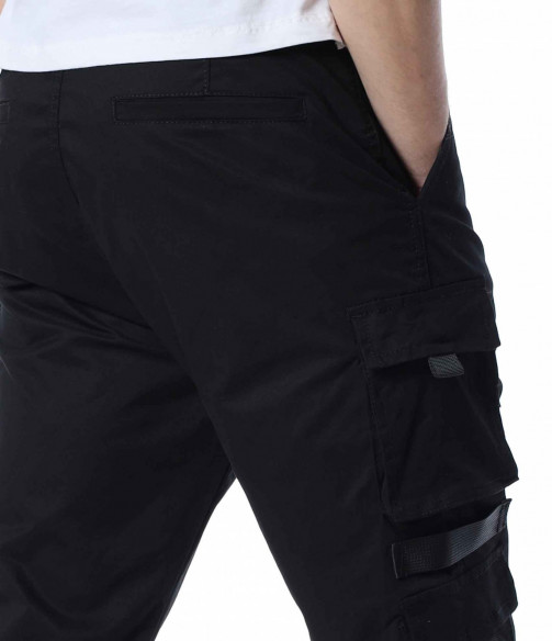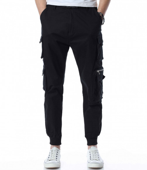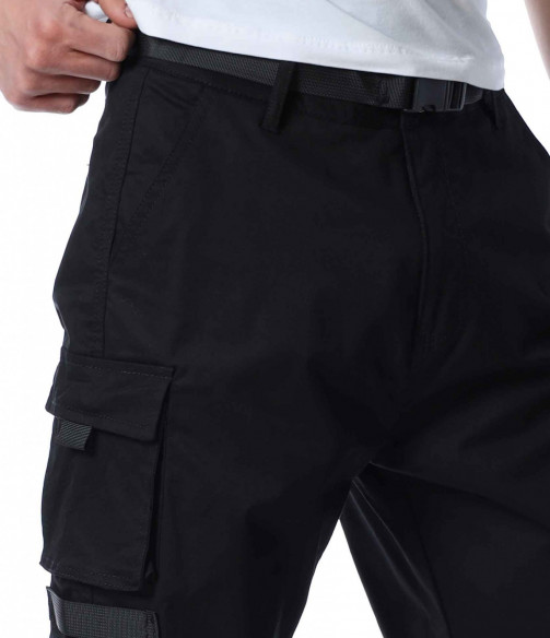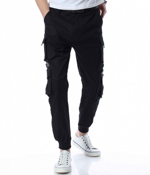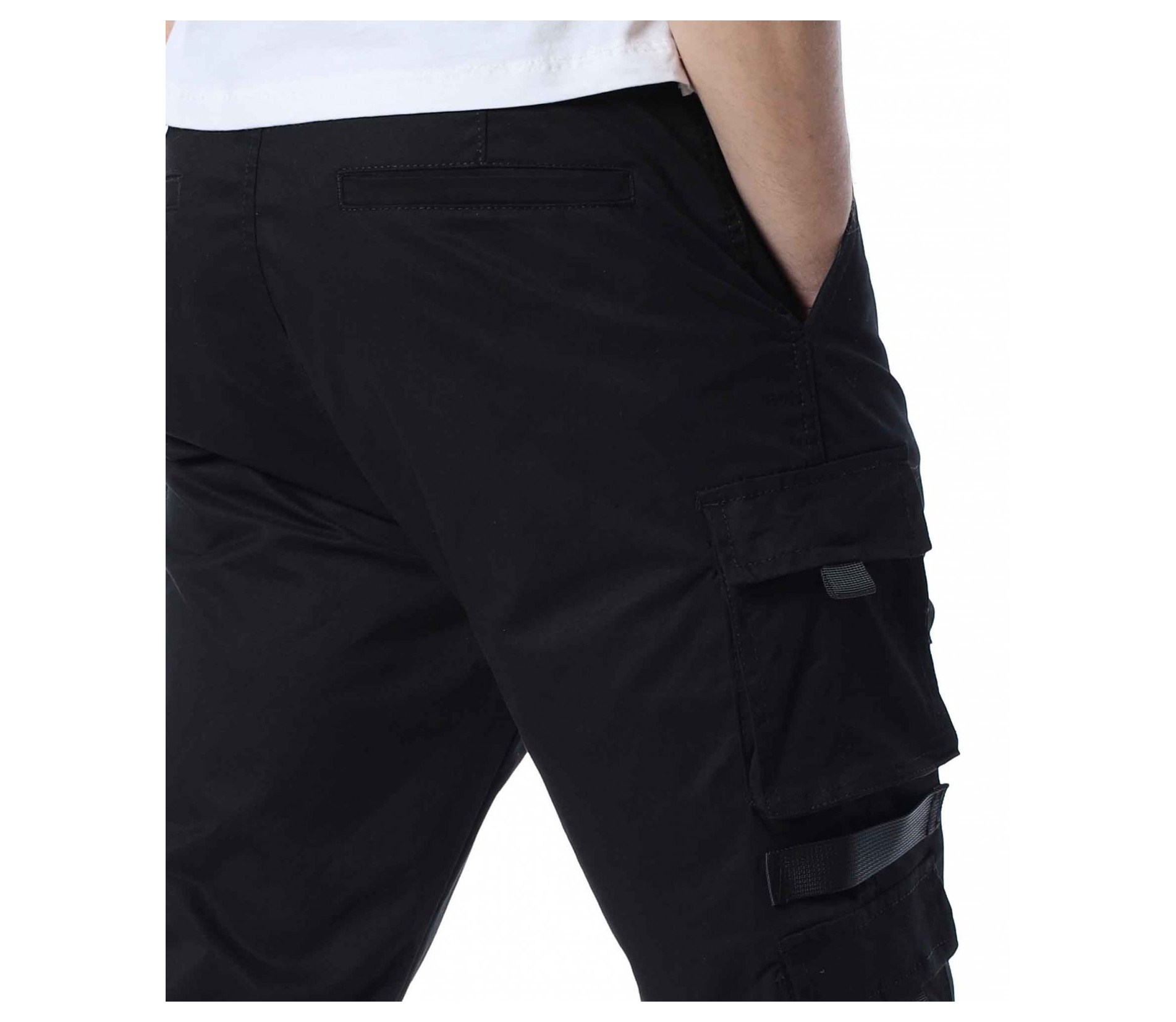ОПИСАНИЕ НА ПРОДУКТА: Представяме ви актуален, мъжки, черен карго панталон от новата ни колекция. Моделът е много разчупен и удобен благодарение на страничните си джобове, разположени по два от всяка страна. Благодарение на тях можете да си спестите носенето на чанта, защото вече имате място на една ръка разстояние за важните за вас неща. Моделът е снабден и с практичен спортен колан, чрез който да фиксирате ширината в кръста. Крачолите завършват с ластик, което категорично затвърждава лидерските му позиции в списъка с модели, които трябва да имате за сезона. Комбинирайте със спортни обувки и елек за перфектна визия и комфорт.