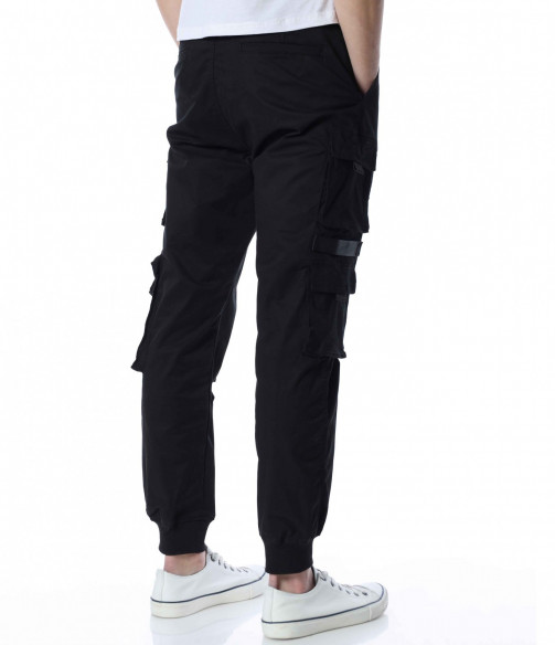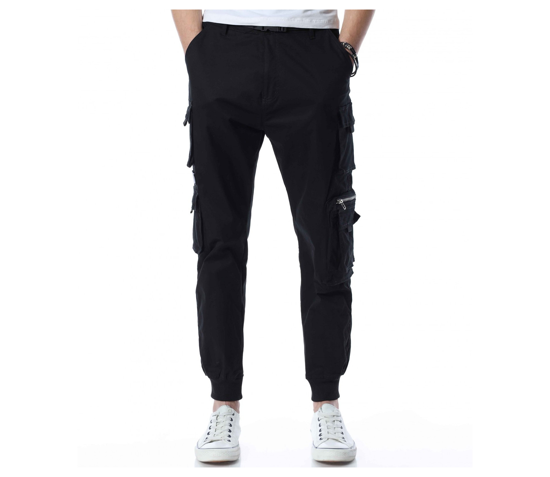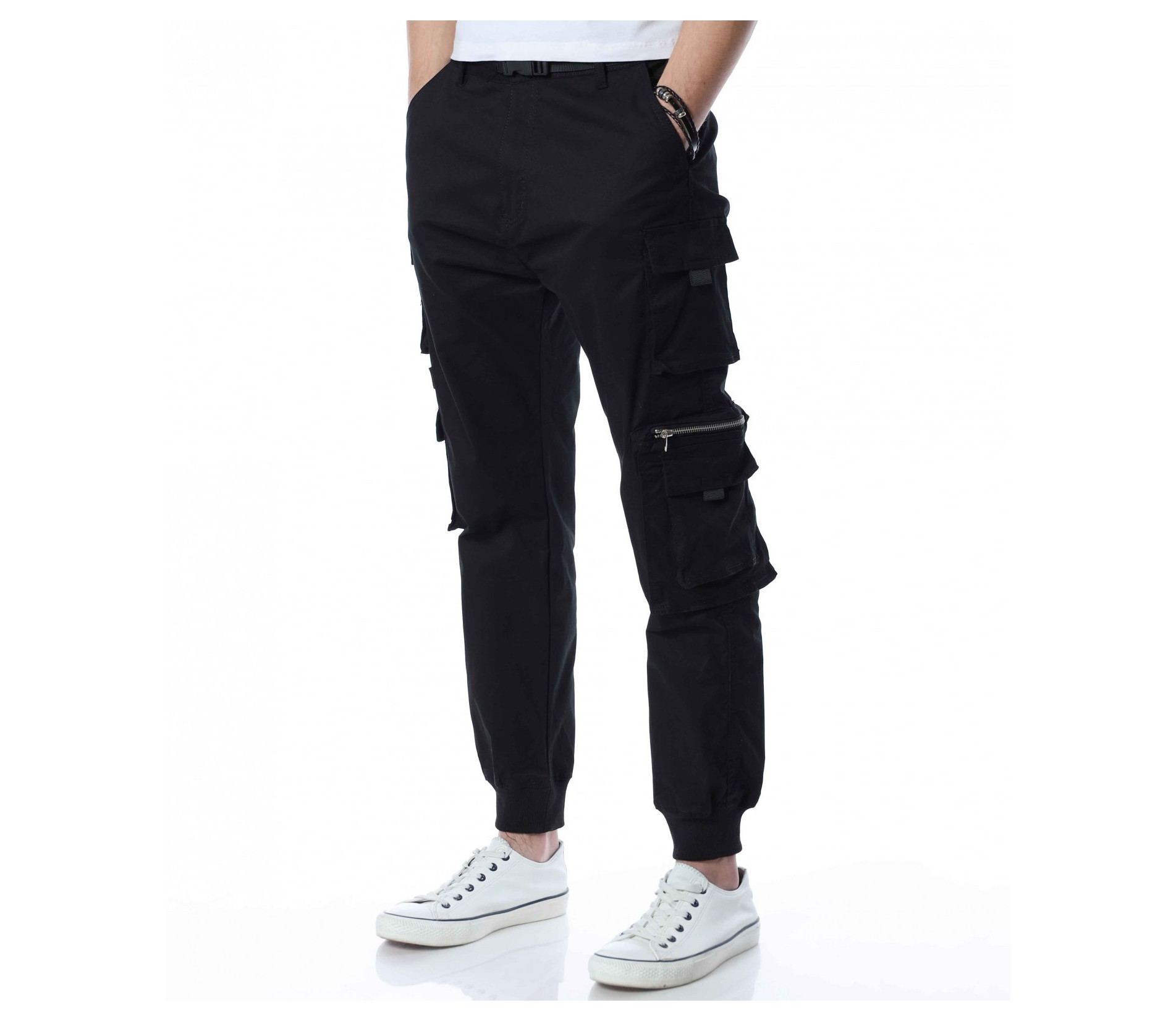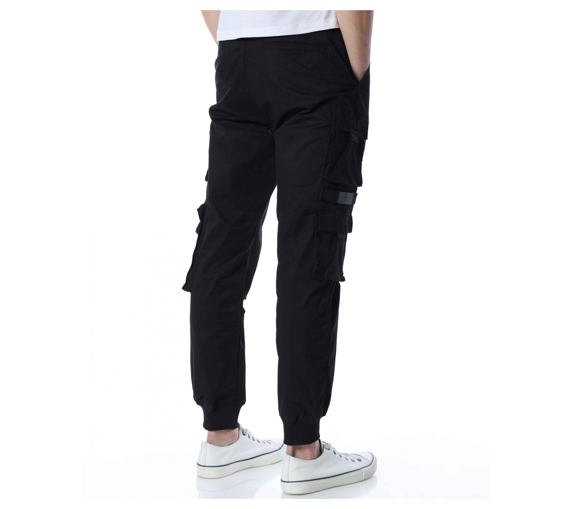 ОПИСАНИЕ НА ПРОДУКТА: Представяме ви актуален, мъжки, черен карго панталон от новата ни колекция. Моделът е много разчупен и удобен благодарение на страничните си джобове, разположени по два от всяка страна. Благодарение на тях можете да си спестите носенето на чанта, защото вече имате място на една ръка разстояние за важните за вас неща. Моделът е снабден и с практичен спортен колан, чрез който да фиксирате ширината в кръста. Крачолите завършват с ластик, което категорично затвърждава лидерските му позиции в списъка с модели, които трябва да имате за сезона. Комбинирайте със спортни обувки и елек за перфектна визия и комфорт.