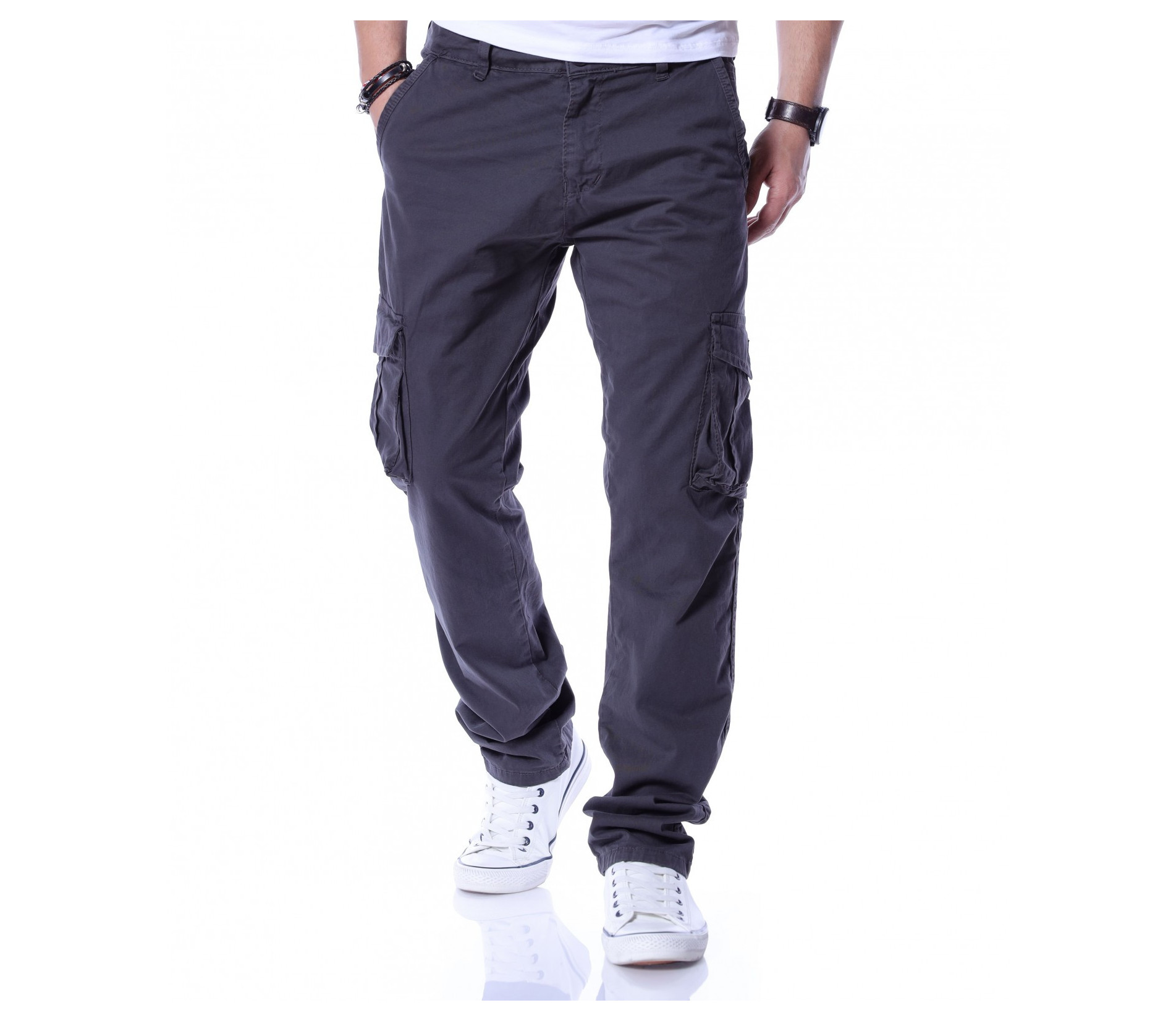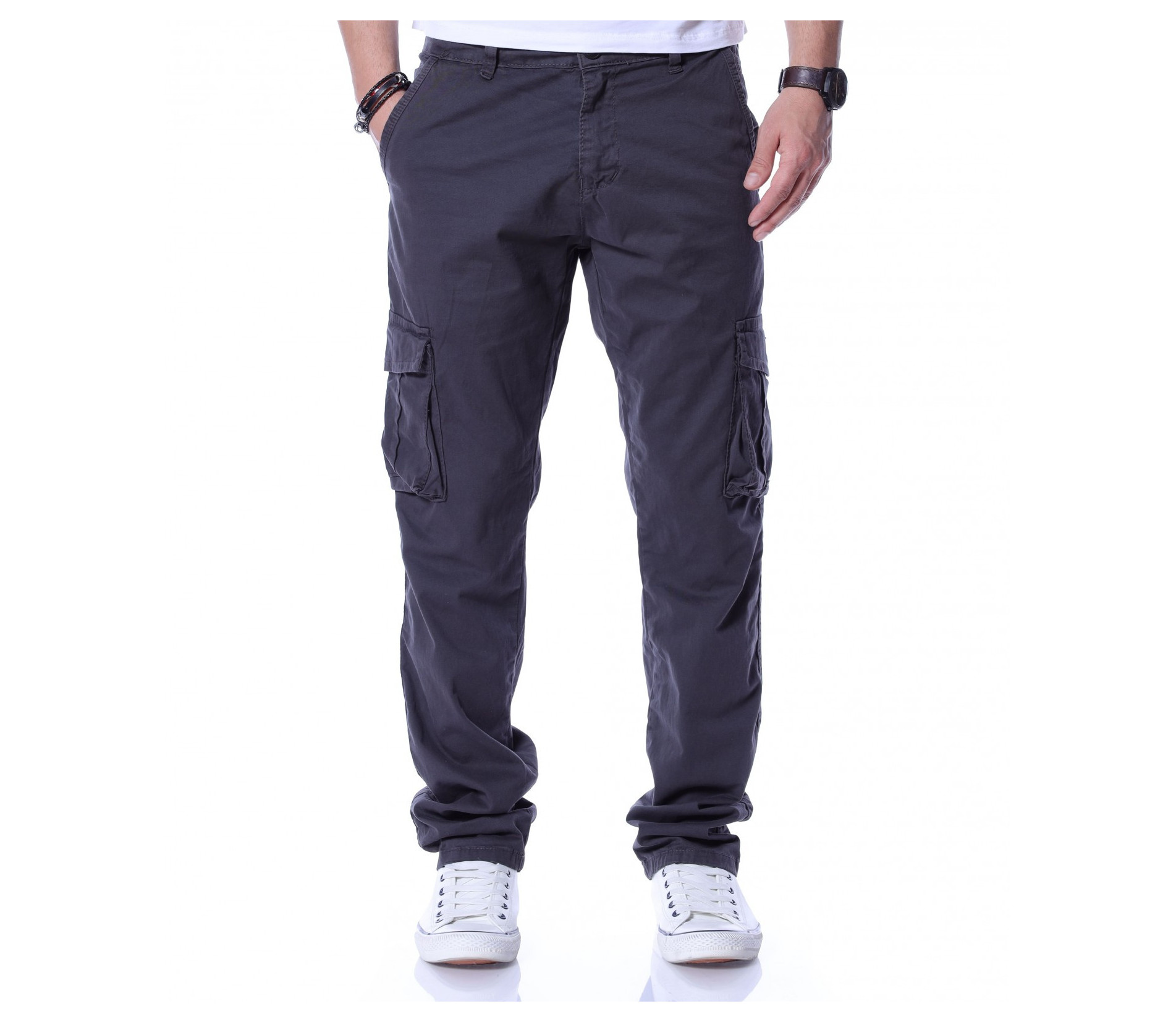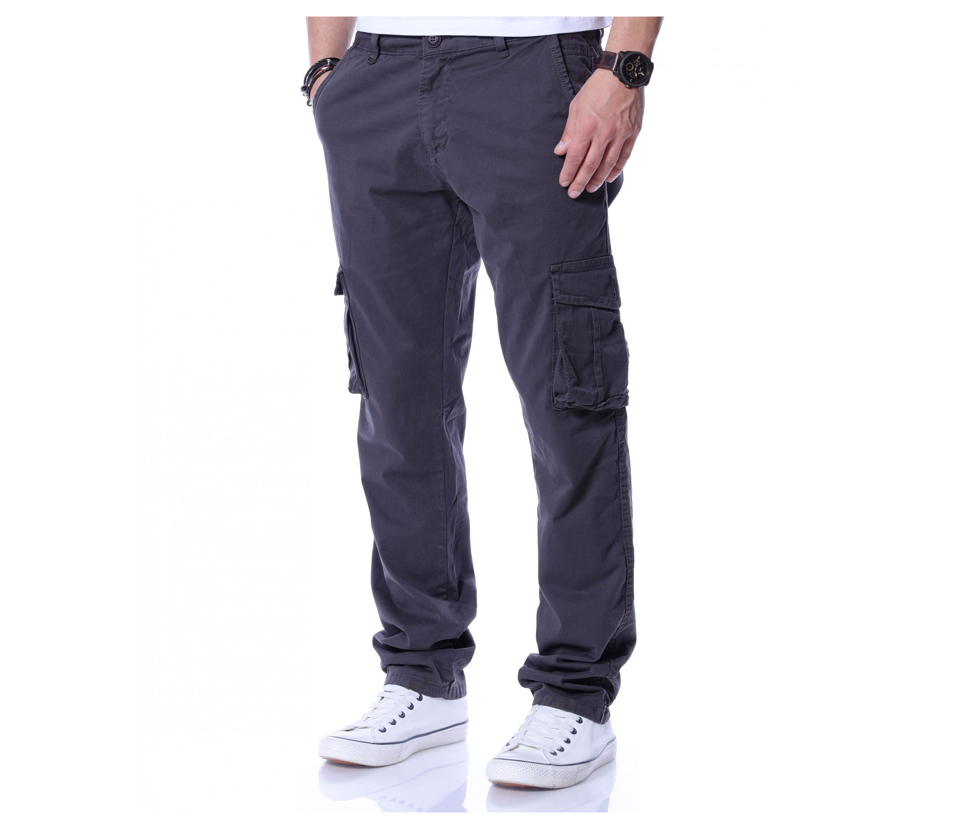 Описание на продукта: Едноцветен карго панталон с джобове отстрани, два стандартни отпред и два с капачета в задната част. На талията са позиционирани гайки, за да може по-лесно да добавите колан по ваше желание. Кройката се отличава с достатъчно свобода, а меката материя осигурява незаменим комфорт на тялото. В зависимост от вашите стилови предпочитания, дизайнът позволява широко приложение и може да комбинирате с подходящи обувки, тениски, а защо не и нещо по-официално?