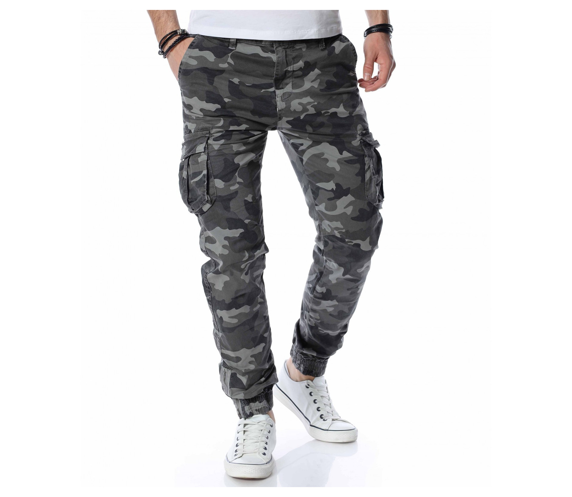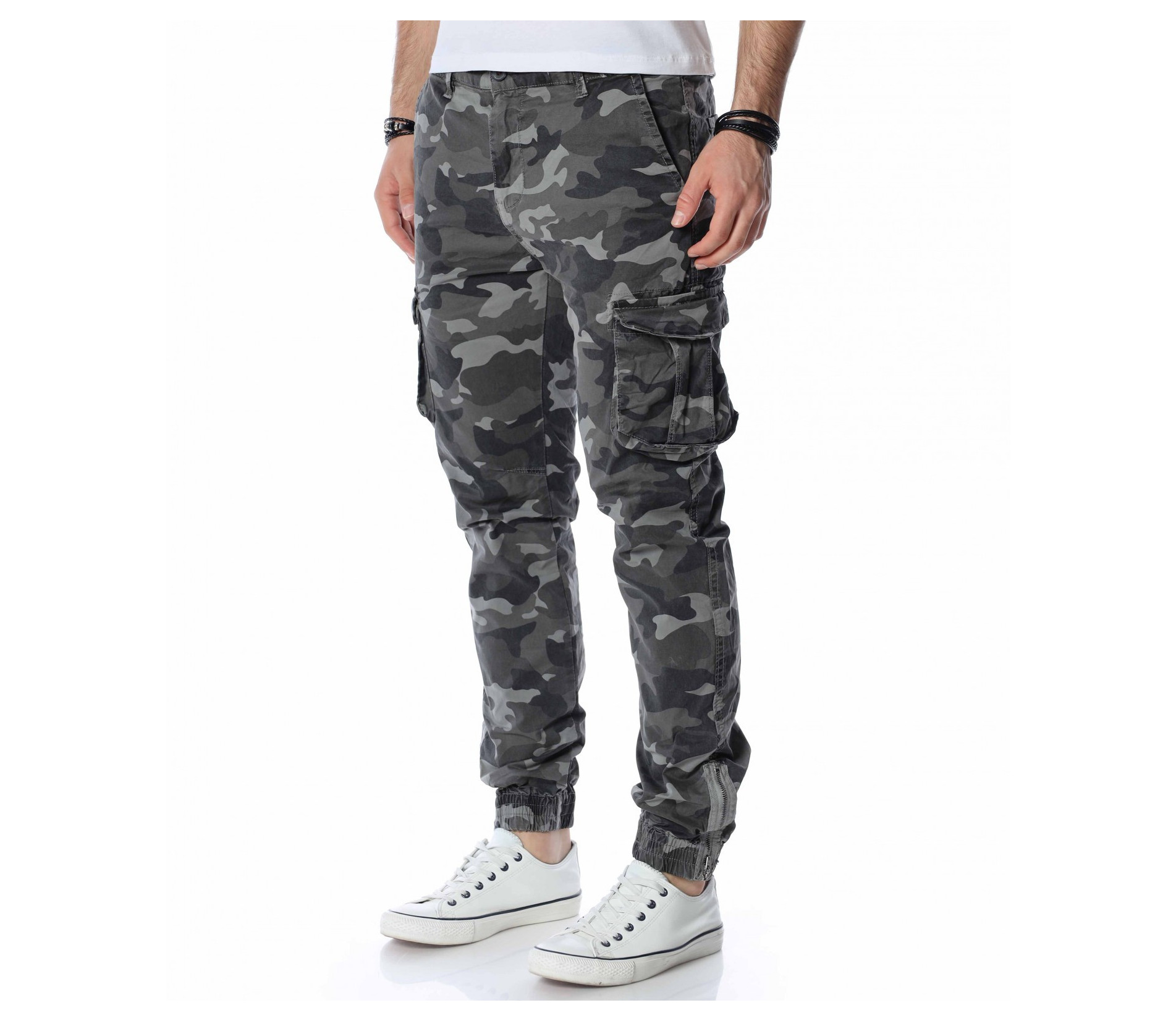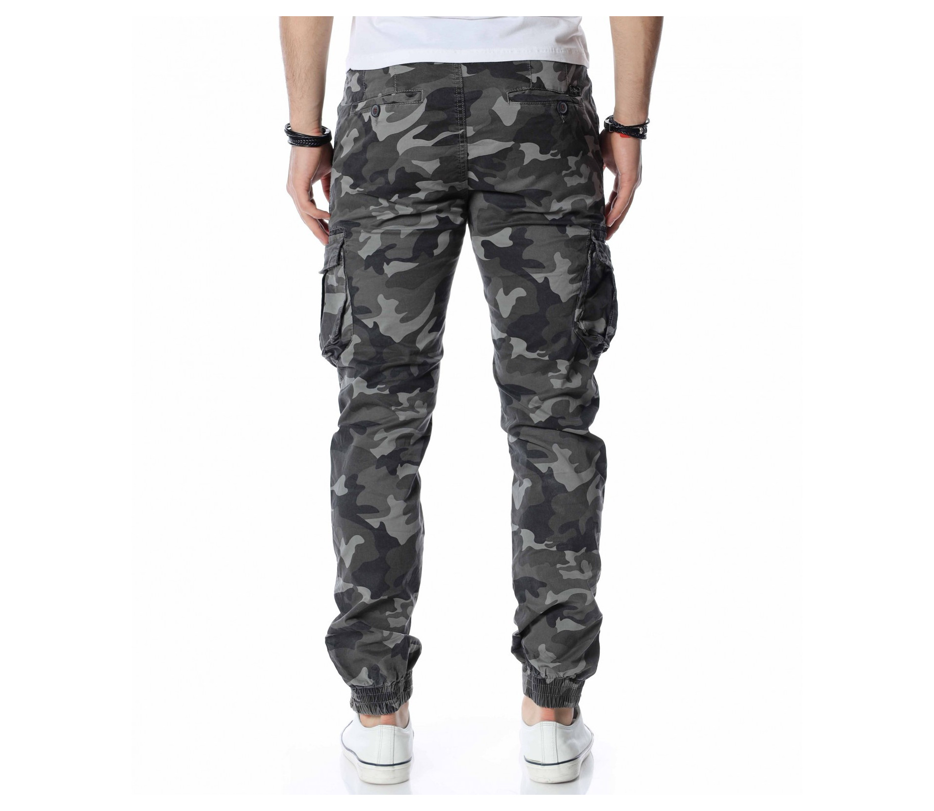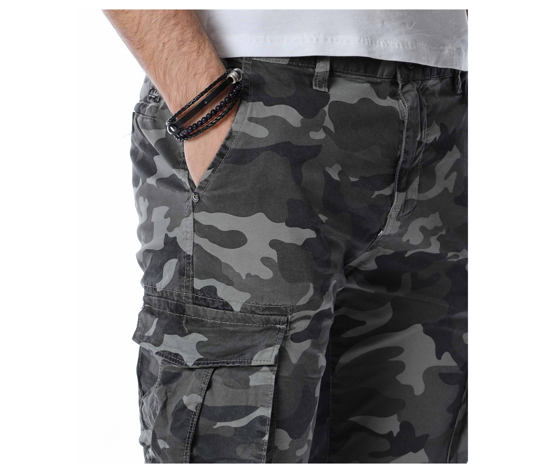ОПИСАНИЕ НА ПРОДУКТА: Екстравагантни мъжки панталон от камуфлажен плат. Любимият на всички милитъри стил е силно изразен в този мъжки панталон в лицето на две разновидности, всяка една от които впечатлява по еднакво атрактивен начин. Ако си фен на по-различните модели, то този е точно за теб. Кройката му е малко по-свободна, като това се изразява чрез правите крачоли, широко падащи надолу. Дължината им е до коляното, а отстрани имат големи спортни джобове с капаци. В предната горна част има два джоба, тип италиански, а задните джобове отново са два, но с друга форма и се закопчават с копче, като се сформира отново капак. Основното закопчаване е с цип под кант и метално копче. Експериментирай този сезон със стила и заложи на топ десените за пролет-лято 2022 г.