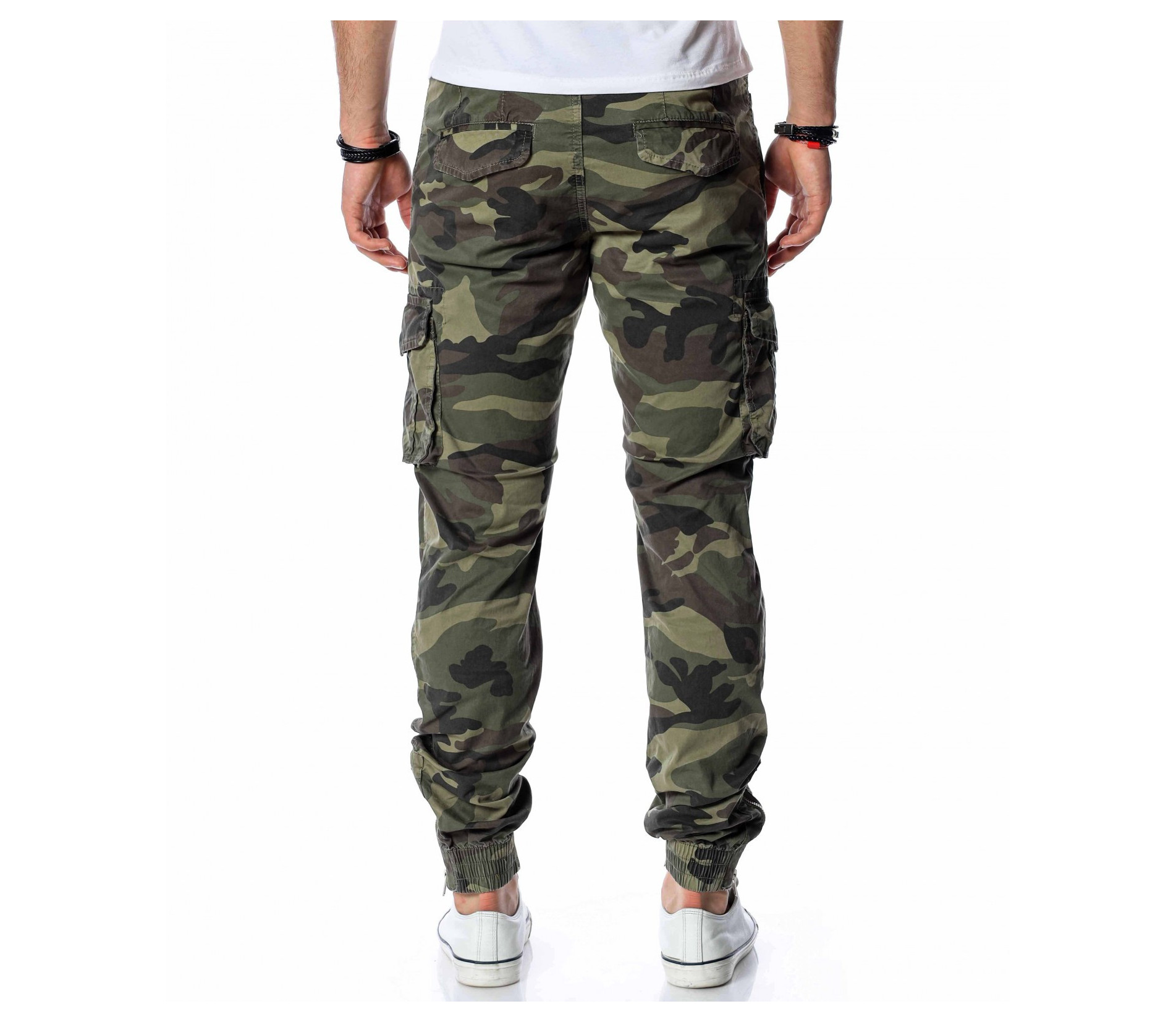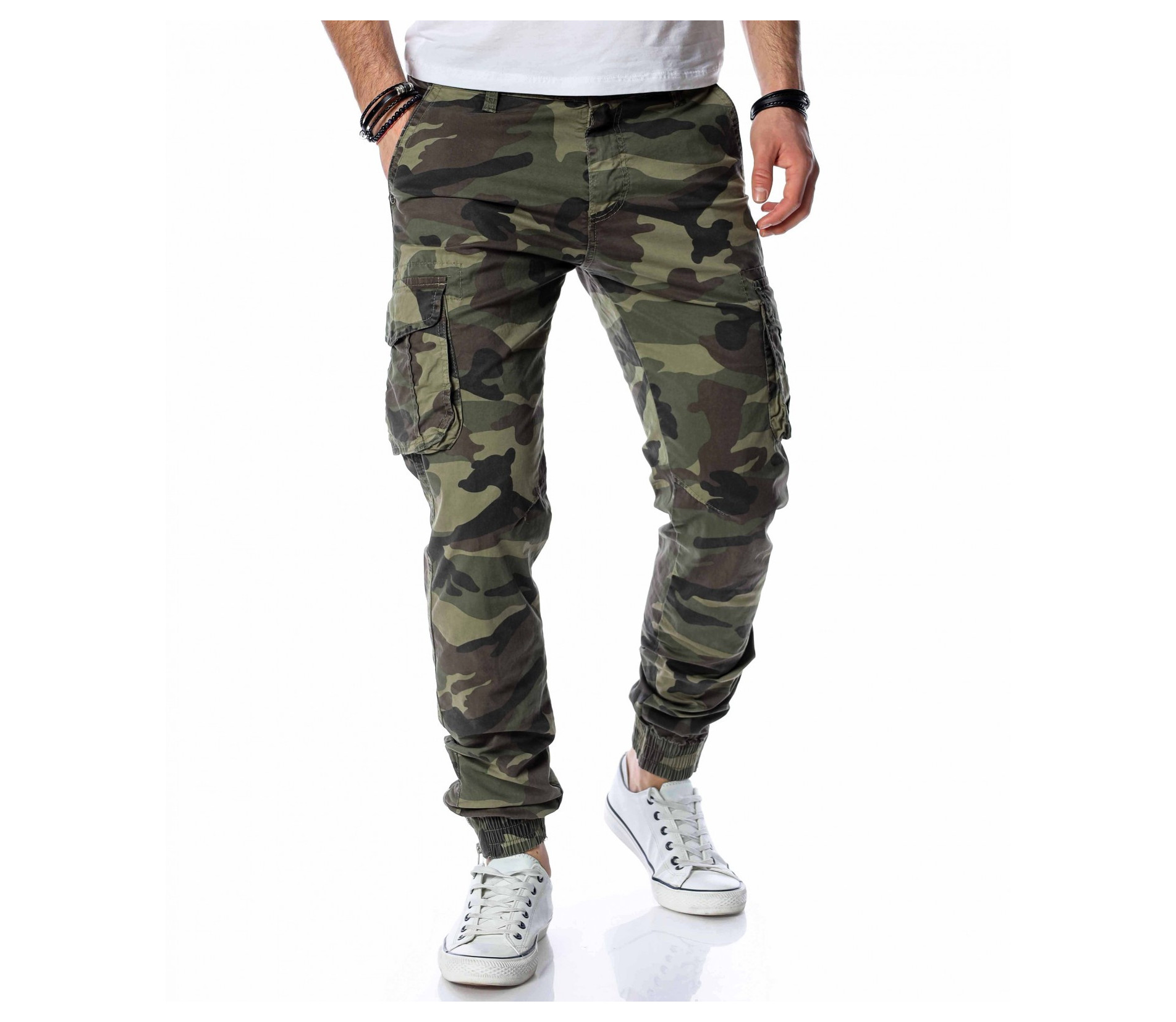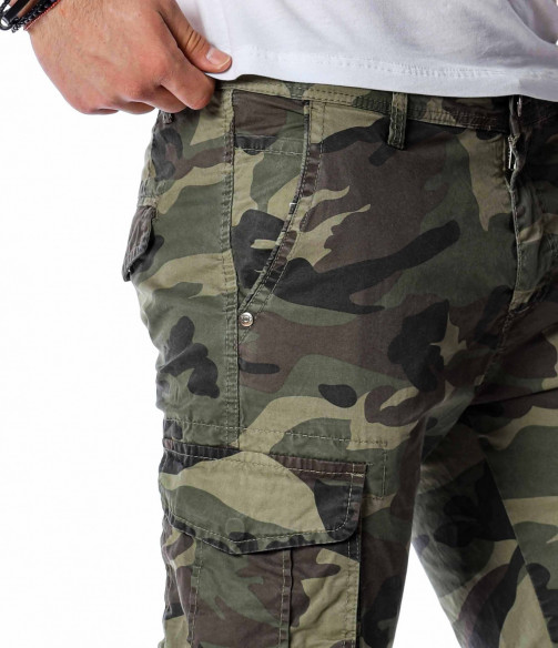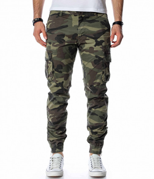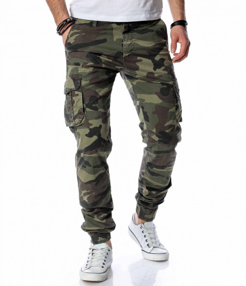 ОПИСАНИЕ НА ПРОДУКТА: Класически спортен мъжки карго панталон с ластик на глезена. Принта на панталона е много впечатляващ, тъй като преплита актуални маслени цветове, изграждайки провокативния military десен. Джобовете са поверени на карго стила и са подсилени от малки капачета, както в задната част са изградени в класическа външна форма. Вталената линия подчертава силуетът Ви, придавайки му атрактивен вид. Поверете този авангарден модел панталон на изчистена тениска и семпли кецове, за да създадете перфектния баланс.