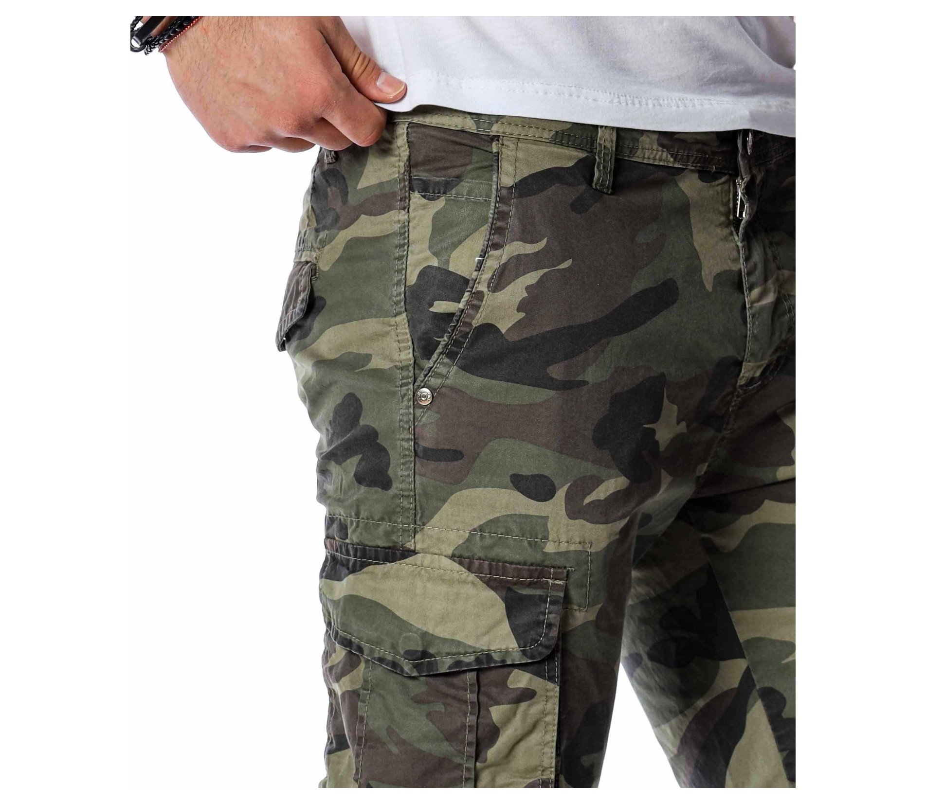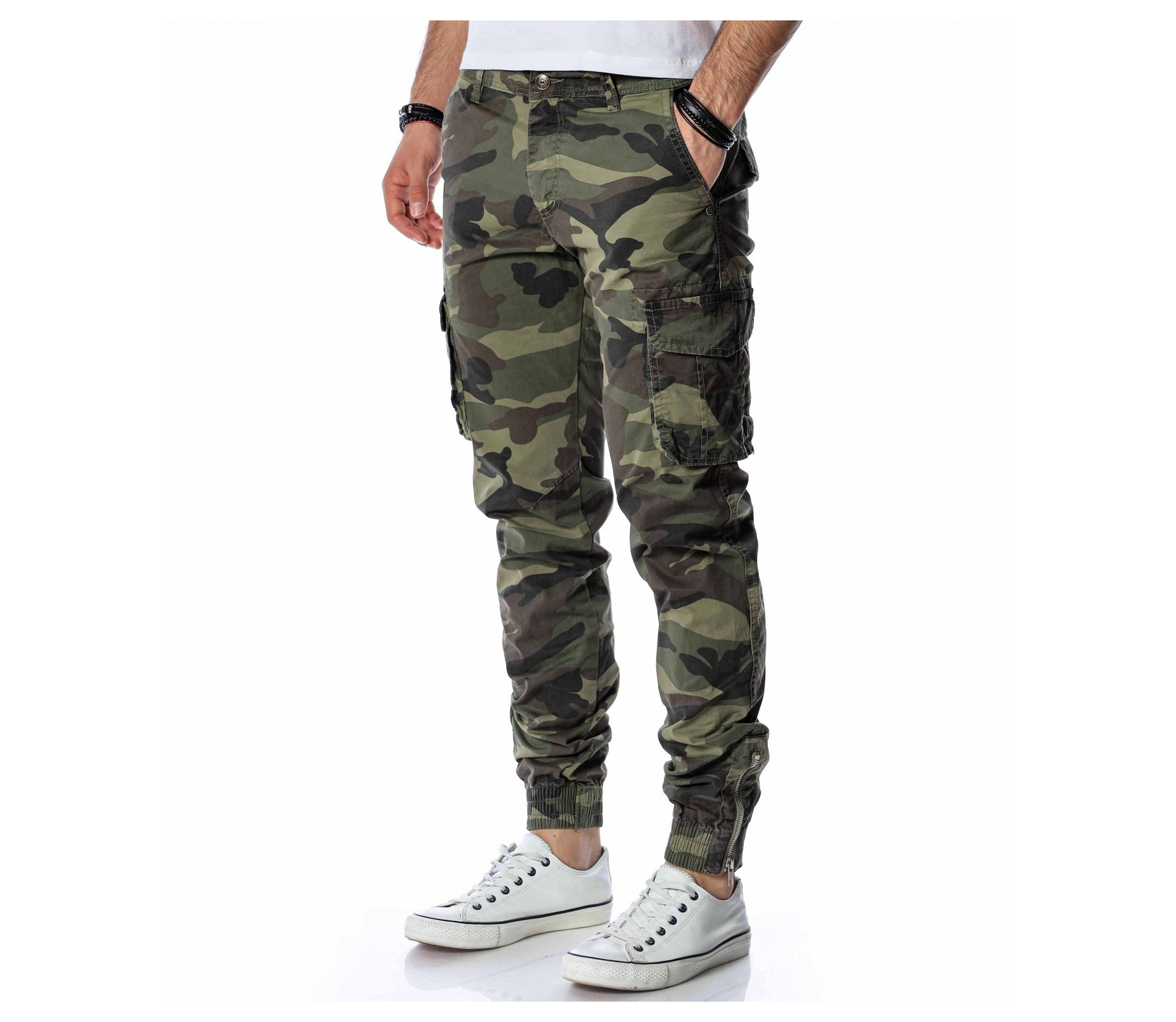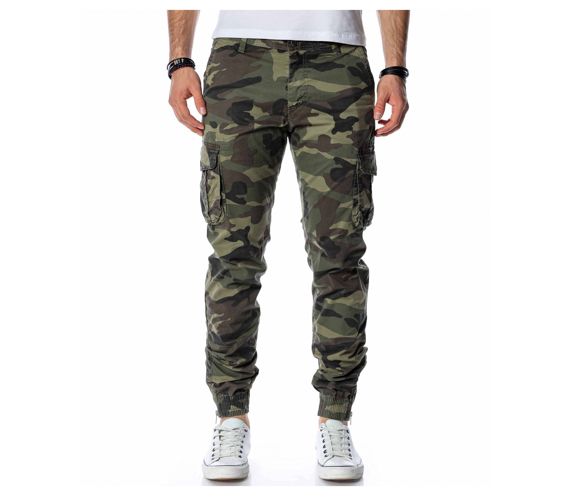 ОПИСАНИЕ НА ПРОДУКТА: Класически спортен мъжки карго панталон с ластик на глезена. Принта на панталона е много впечатляващ, тъй като преплита актуални маслени цветове, изграждайки провокативния military десен. Джобовете са поверени на карго стила и са подсилени от малки капачета, както в задната част са изградени в класическа външна форма. Вталената линия подчертава силуетът Ви, придавайки му атрактивен вид. Поверете този авангарден модел панталон на изчистена тениска и семпли кецове, за да създадете перфектния баланс.
