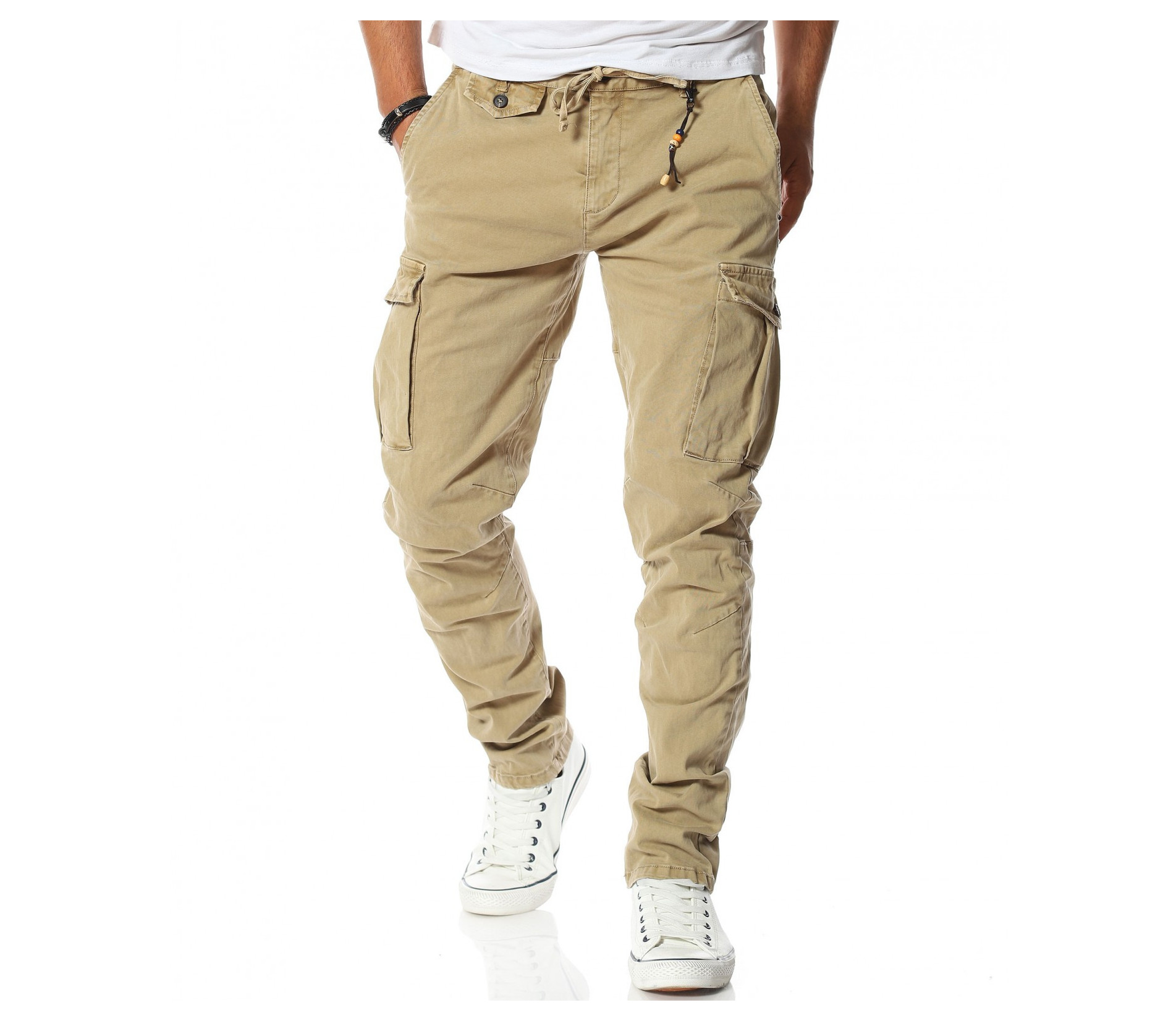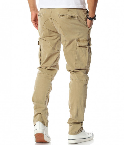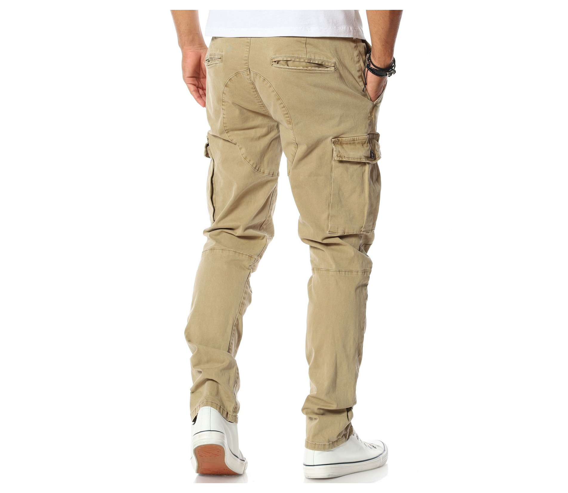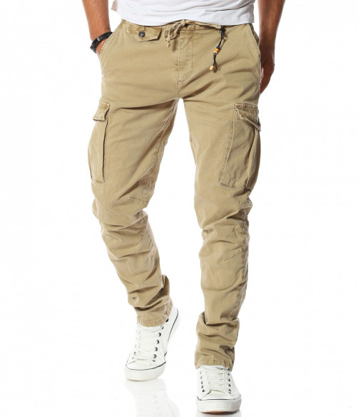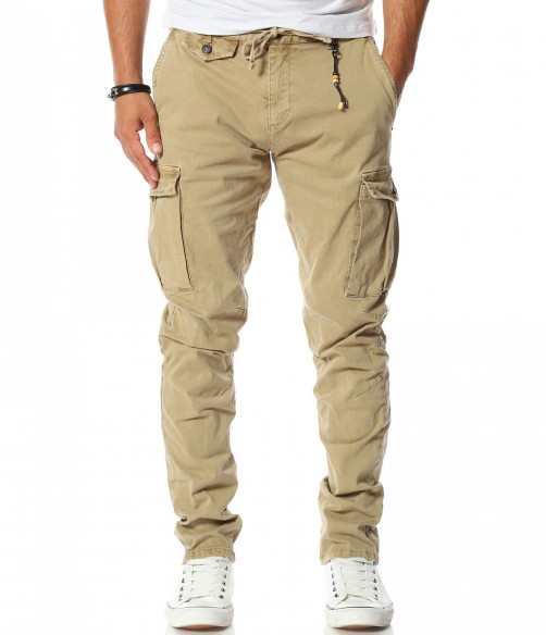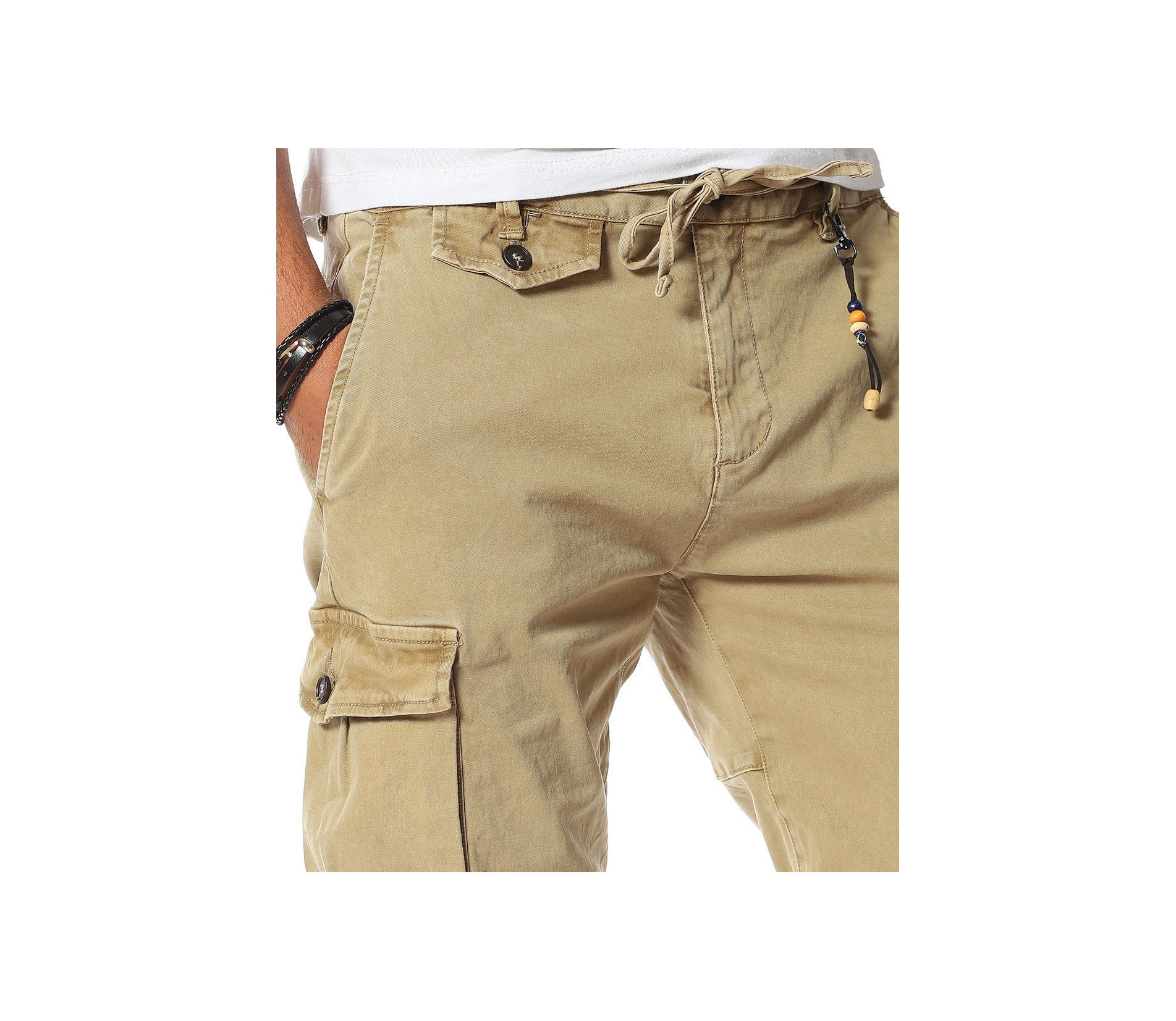 Описание на продукта: Спортен имидж се гради не с разпуснати домашни дрехи, а със стилни, модерни и удобни модели, с които да впечатлявате всеки поглед. Именно такъв е този модел мъжки casual панталон, изграден в типичния за стила си карго дизайн, притежаващ два релефни джоба, разположени от двете страни на крачолите. Те са допълнени от малки капачета, които го превръщат в още по-забележим. Кройката на панталонът е леко скосена, но лишена от твърде впита линия, която да създава дискофморт на тялото Ви. В горната част на моделът са разположени още четири джоба, но в по-семпъл вид. Двата в предната част са под формата на вертикални или познати като италински, а тези на гърба семпли малки хоризонтални. В допълнение към колана е разположена лента, която може да се завърше и по-този начин да бъде регулирана ширината. Финалния щрих добавя един малък аксесоар в хипи стил, а именно пъстра висулка, закачена за една от предните гайки на панталонът.