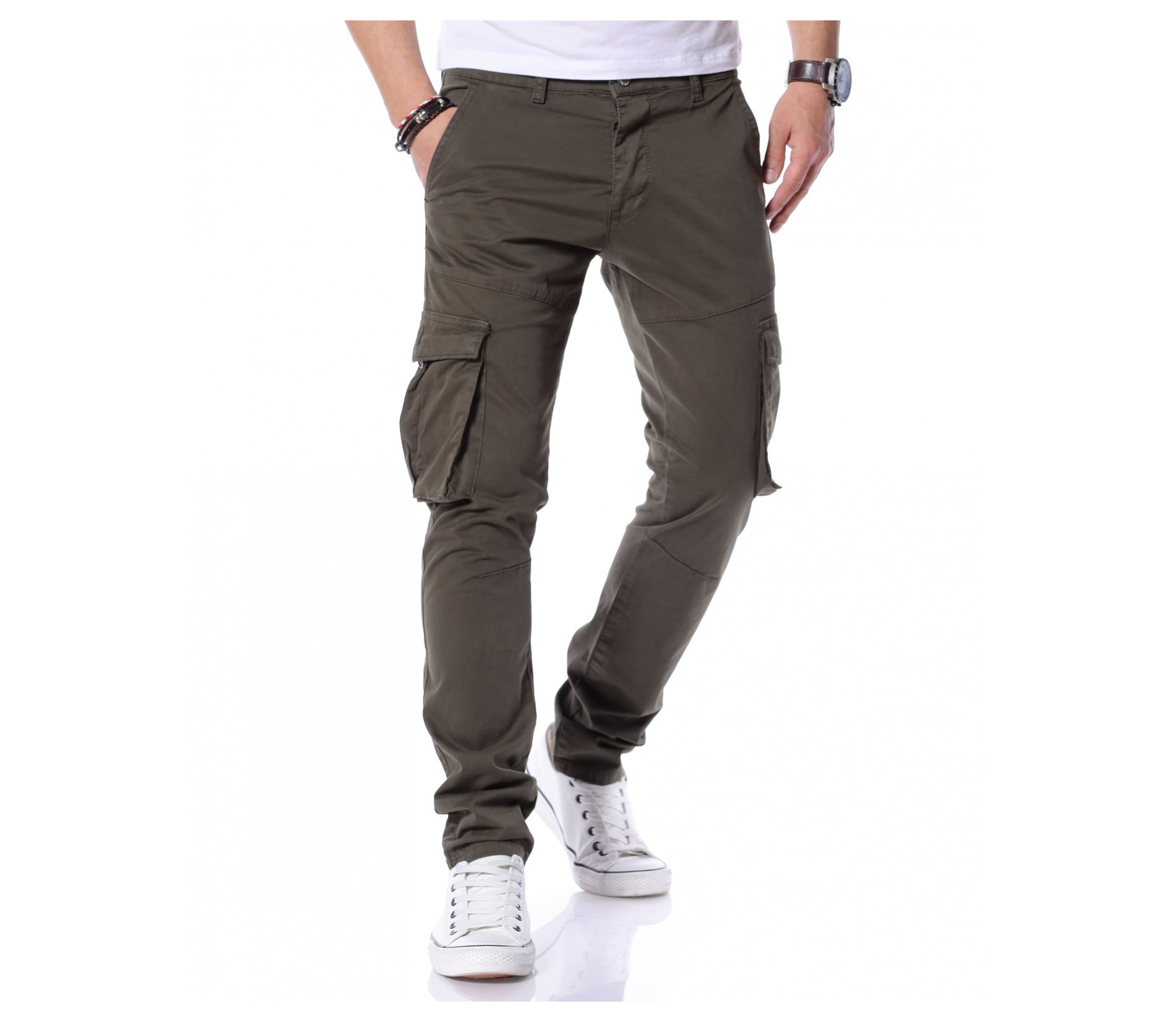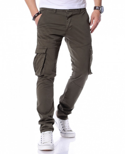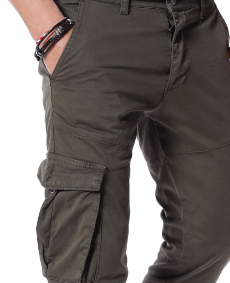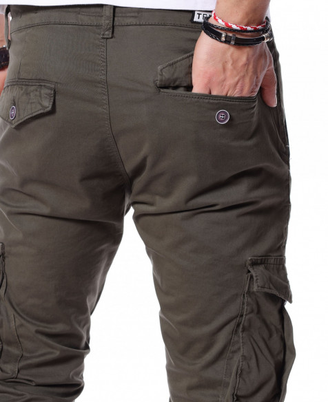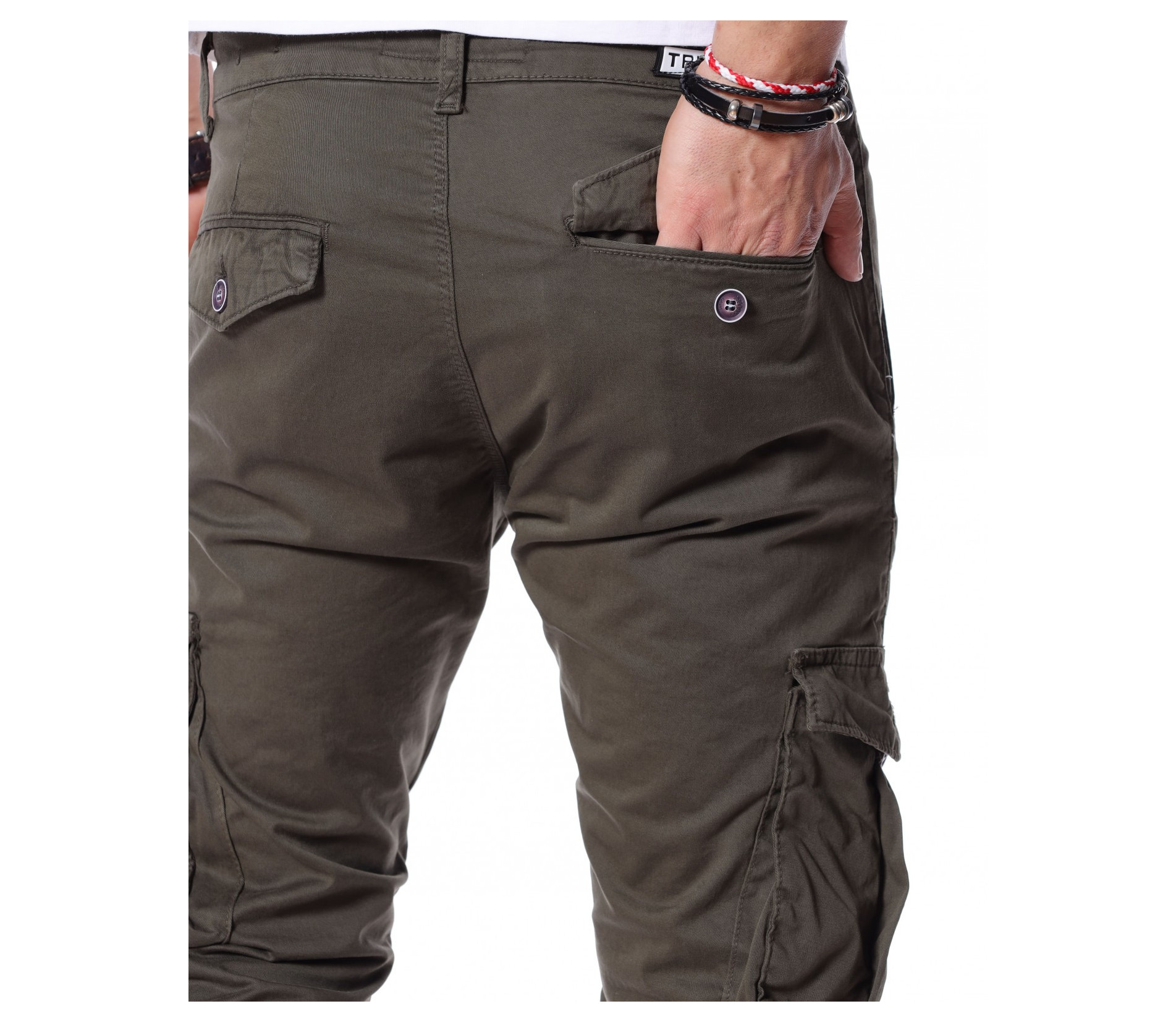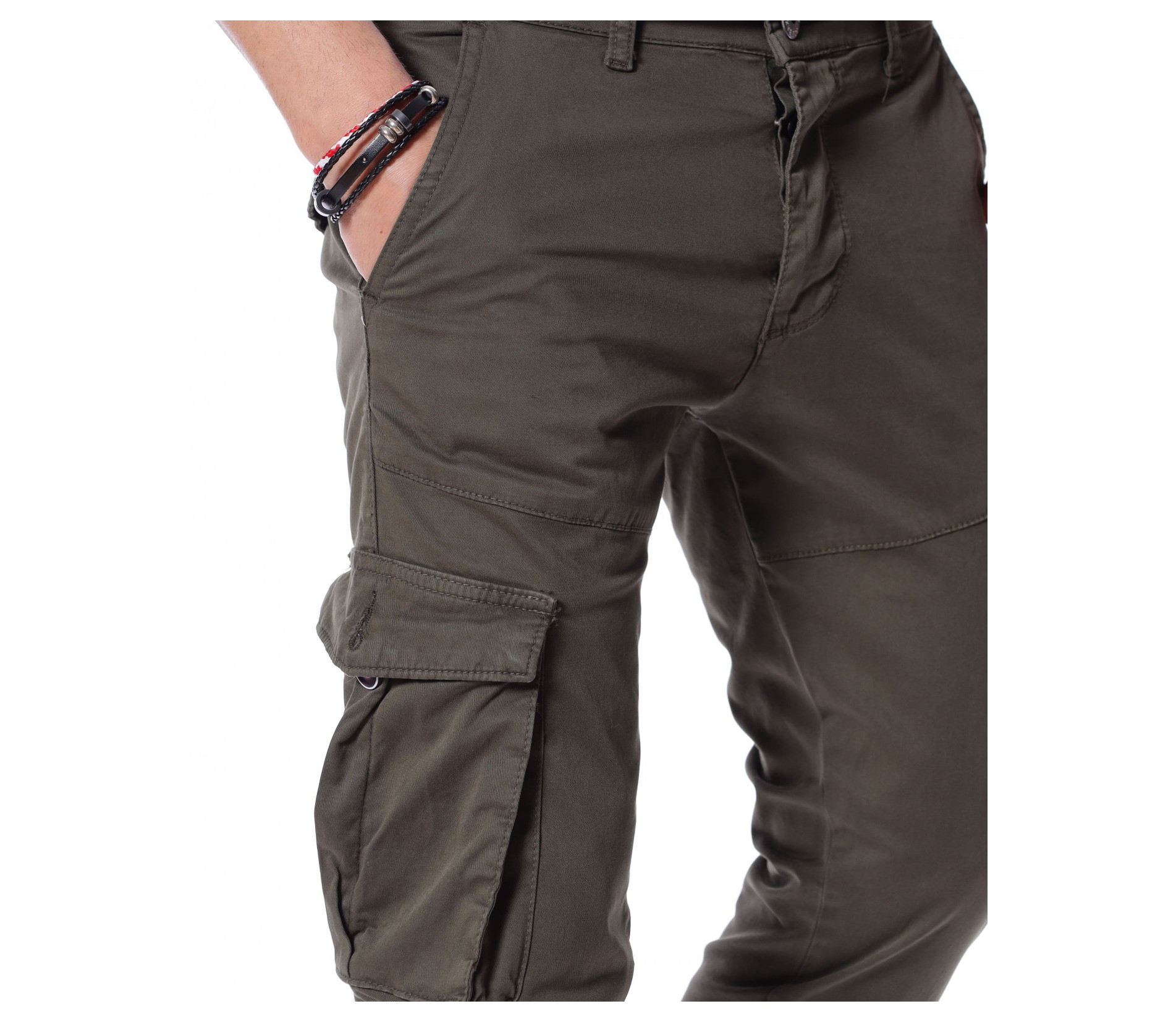 Описание на продукта: Casual предложение, облечено в спортен имидж, под формата на изчистен карго панталон. Кройката на модела е вталена, като в долния край е със свободни крачоли, позволяващи навиване според вашето желание и предпочитания. Цветовете са типични и в унисон със сезона, като са и сред любимите на мъжкото съсловие. Можете лесно да ги съчетаете с подходяща тениска, блуза или пуловер. Страничините джобове на крачолите са в практична и удобна форма с капак и са основния елемент на подобен вид мъжки, спортни панталони. В задната част също има джобове с триъгълни капаци, а предните са с диагонален отвор, тип \"италиански\". Закопчаването е с цип и копче в областта на колана. Избери изчистен вариант на така модерните мъжки панталони и бъди в центъра на вниманието, обгърнат в памучен комфорт.