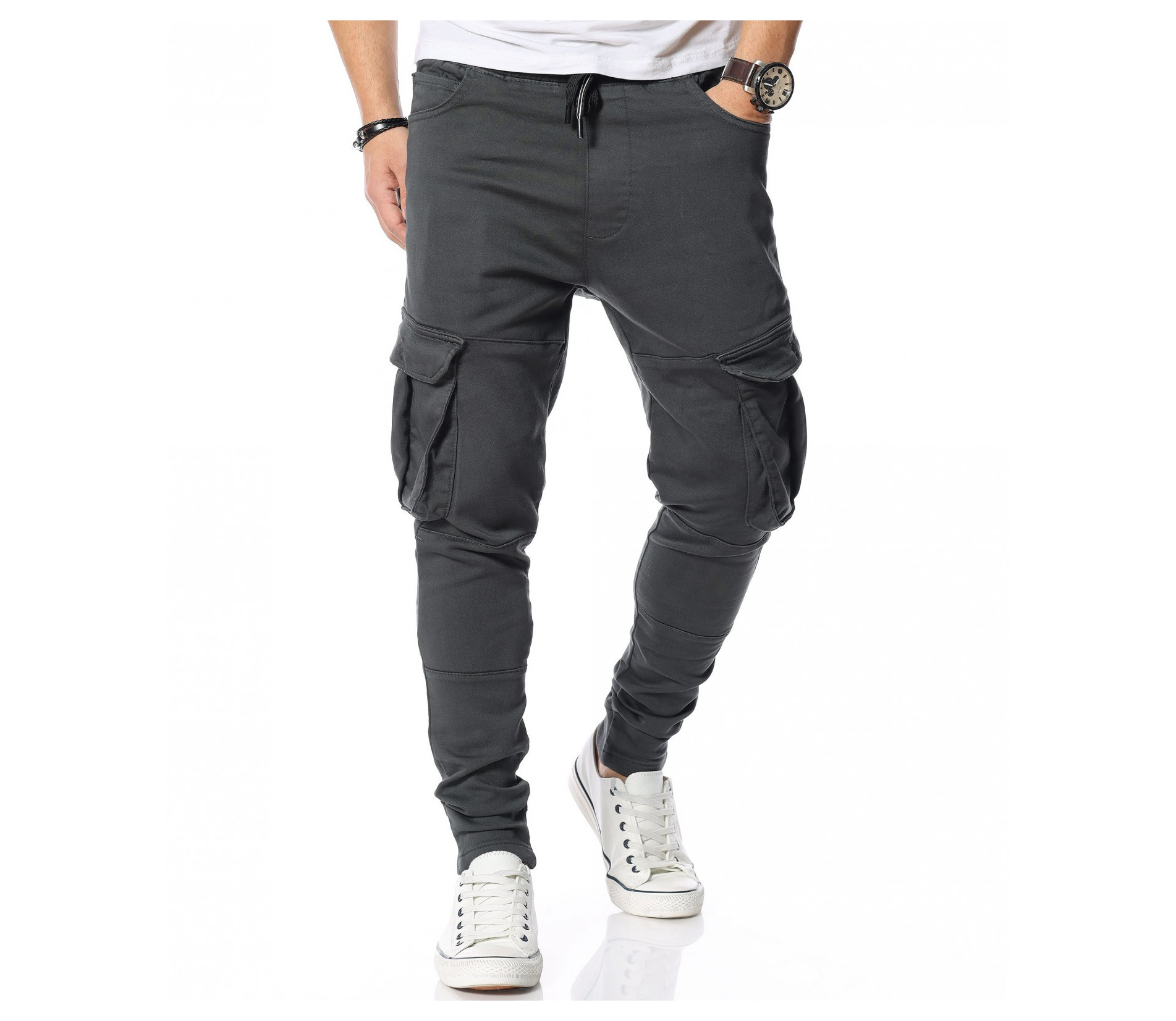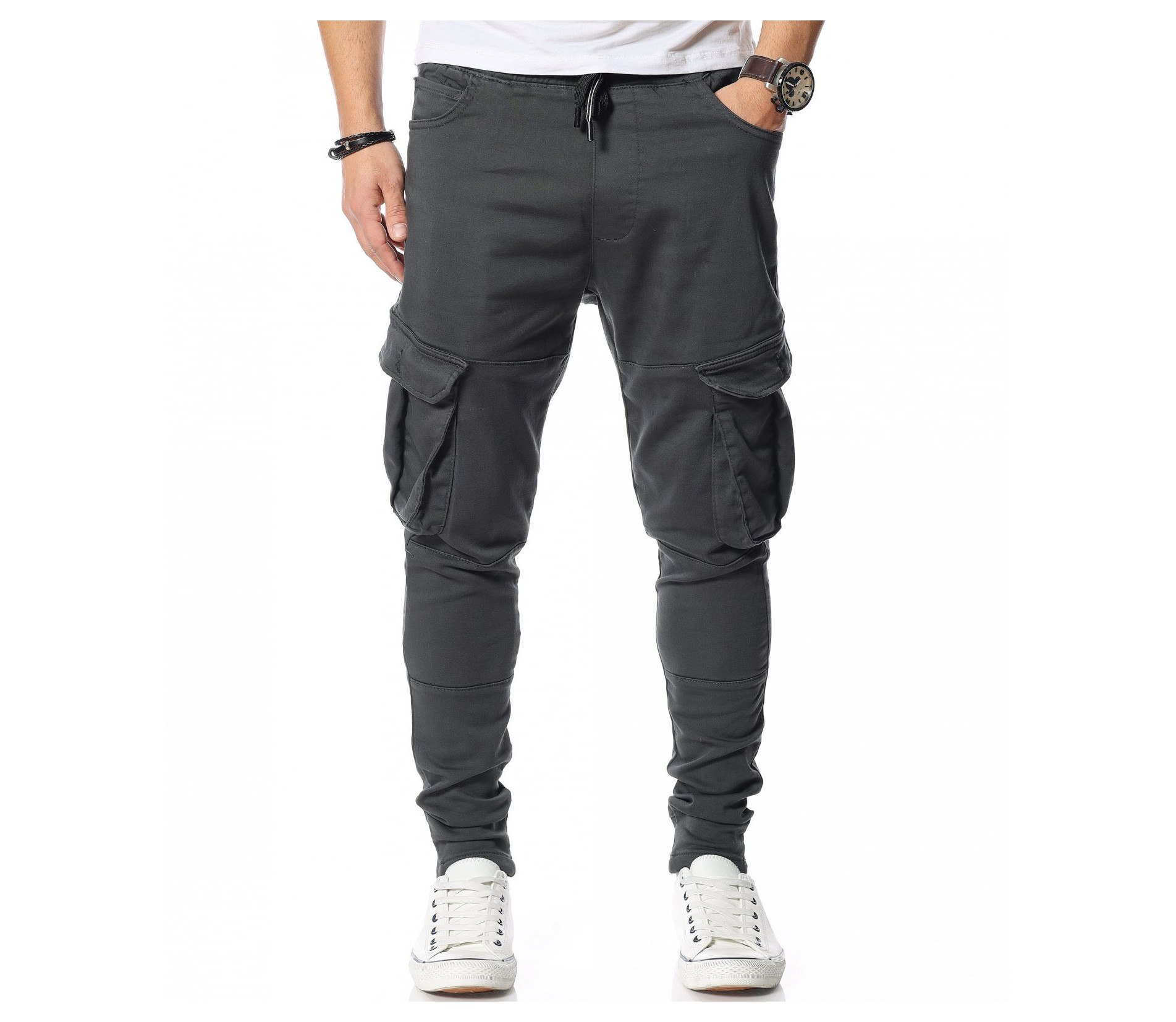 Описание на продукта: Ежедневният аутфит е стил, в който ние се чувстваме силни. Търсейки подходящия модел за Вас, подбрахме този вариант, който включва стил, модерно излъчване и комфорт. Линията на панталона е super skinny, прилягайки абсолютно плътно по краката, най-осезаемо при прасеца. Меката памучна материя придава удобство, нужно на всеки от Вас. В областта при коленете се изгражда масивно разкрояване, с помощта на релефни карго джобове, допълнени с капачета. Следвайки линията нагоре, откриваме още два, по-деликатни джоба, в италианска форма. Талията на мъжкия панталон е изградена от широк ластик с връзки, които позволяват лесното регулиране на ширината. Изберете своя цвят и смело го включете към следващия си аутфит.