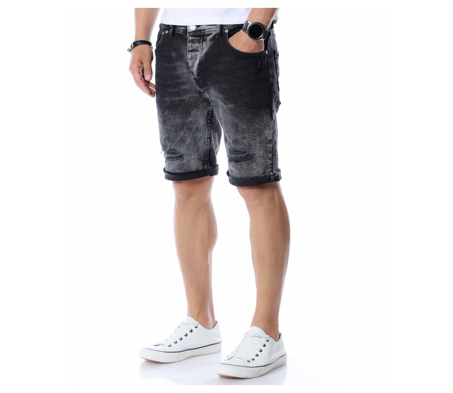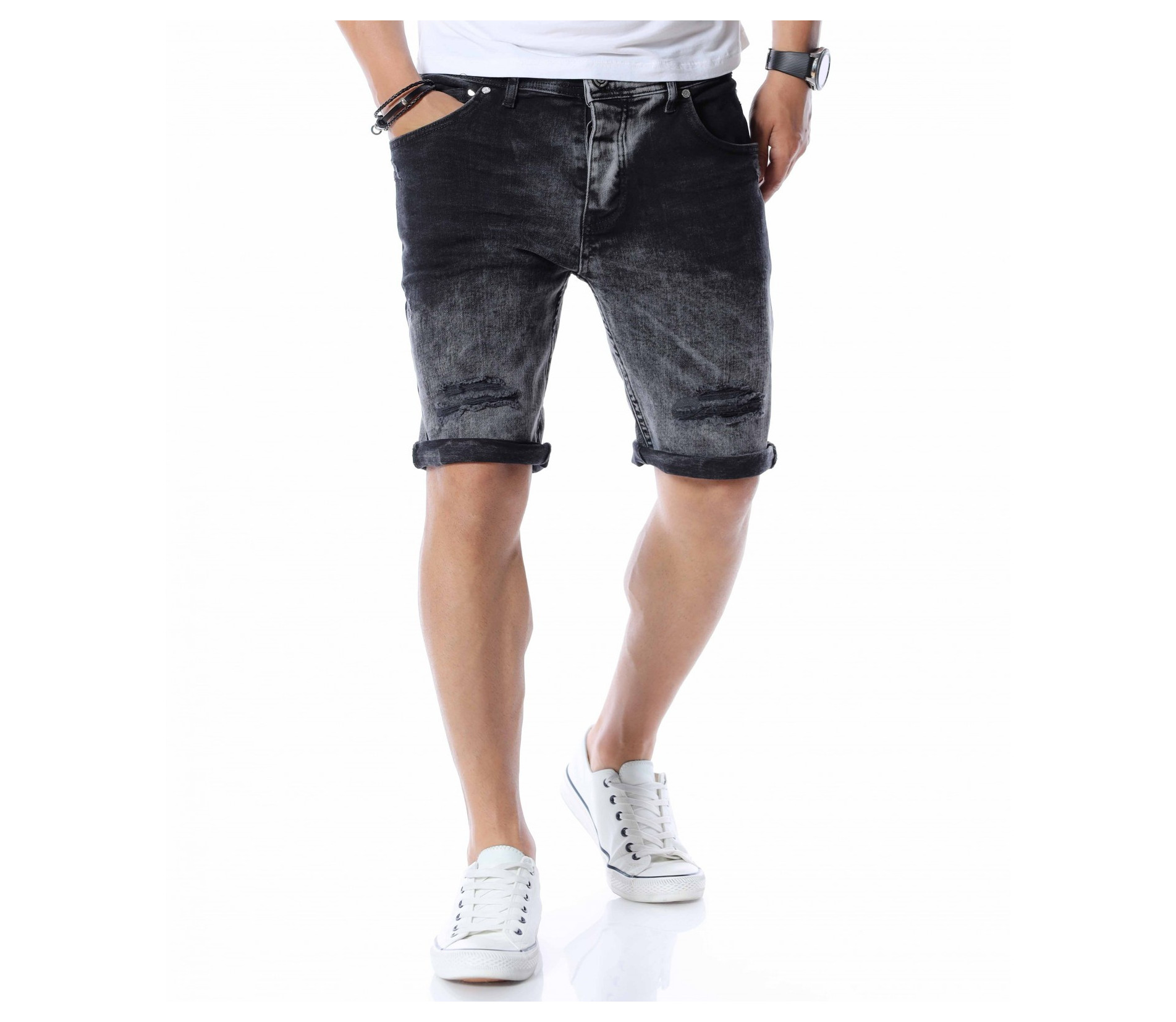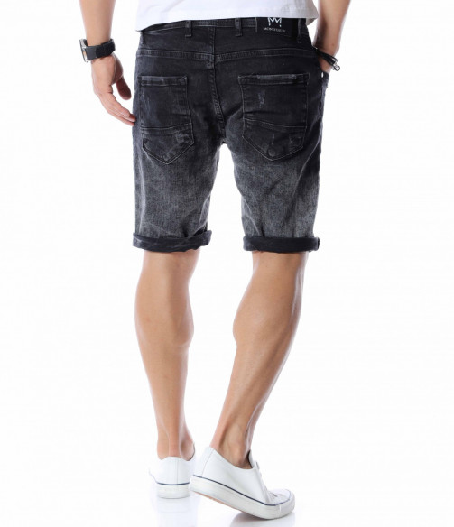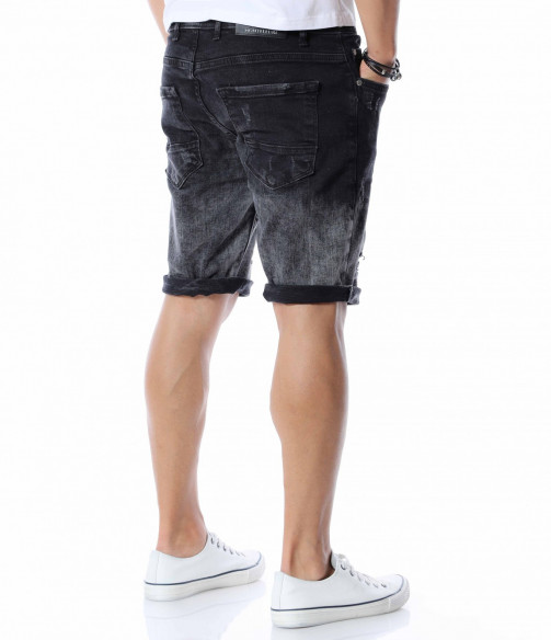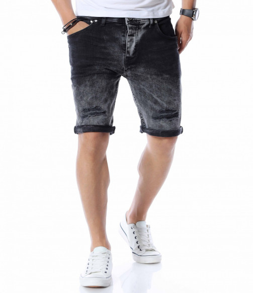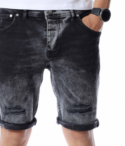 Добавете чисто ново попълнение към вашият гардероб като се възползвате от къси, черни дънки с контрастен акцент. Цялата основа на моделът е едноцветна - черна. На места се забеляват фабично избелелите мотиви, които придават автентичен и различен вид, а в областта над коленете са разположени прокъсани декорации. В предната част разполага с два, стандартни джоба, а в задната откриваме два дълбоки. Кройката се адаптира към тялото, като придава удобство и лекота при движение. Изработката се състои от 98%памук и 2%еластант. Подходящи за разходки, парти или среща, а ако комбинирате с тениска и високи кецове няма да сбъркате.