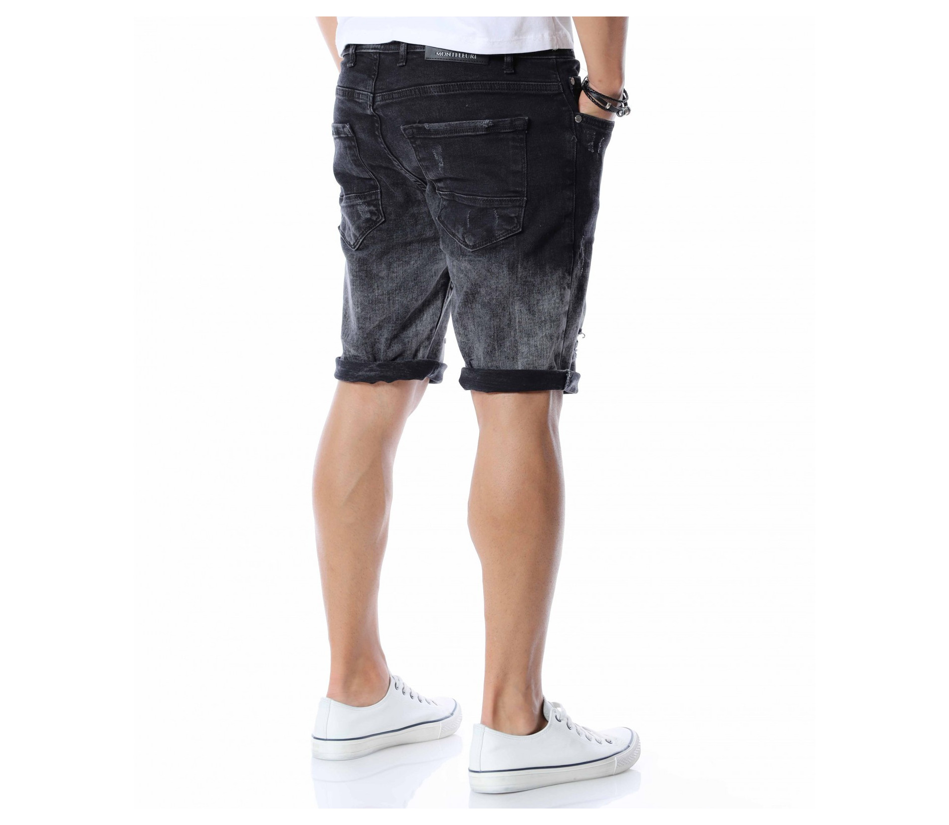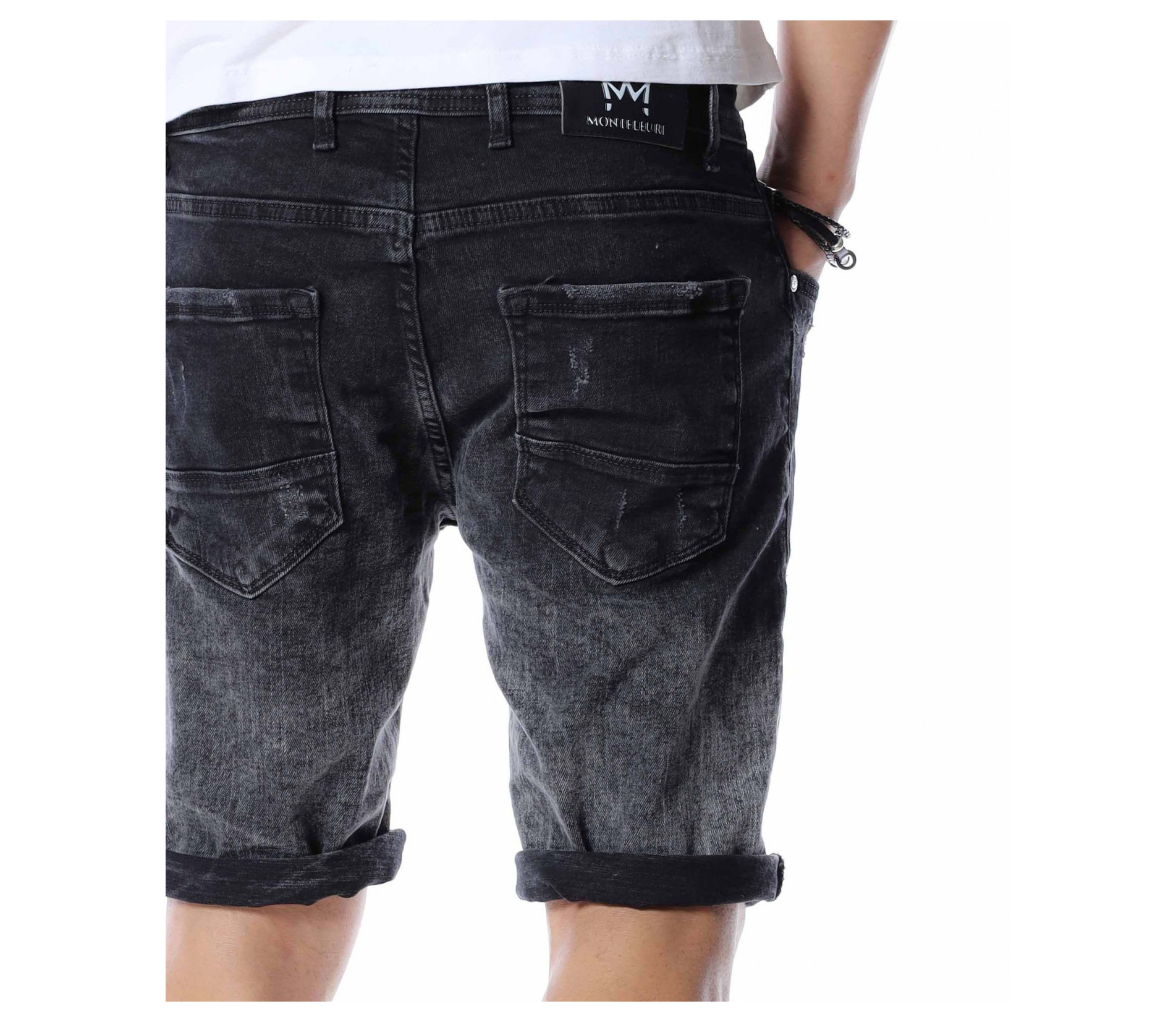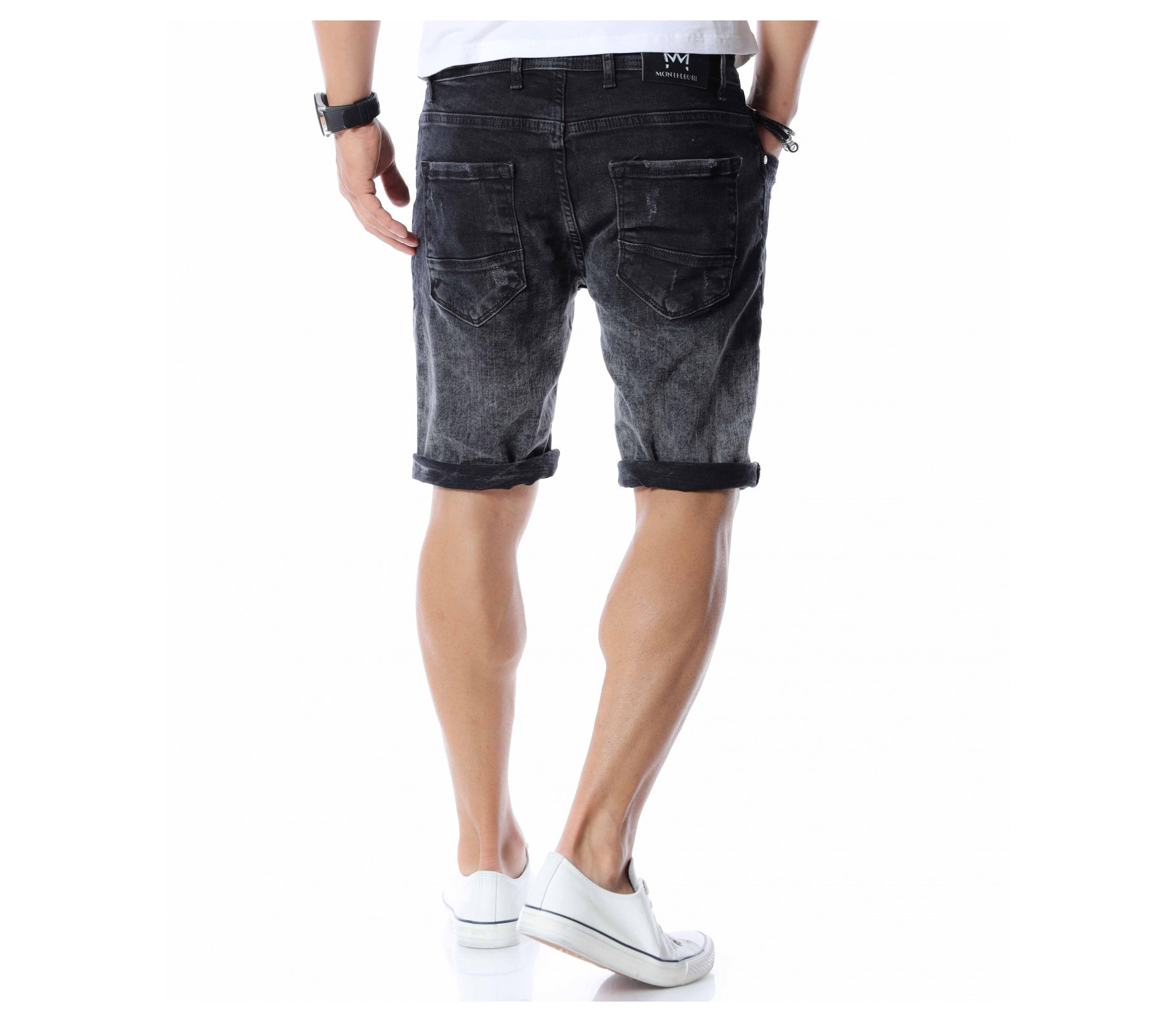 Добавете чисто ново попълнение към вашият гардероб като се възползвате от къси, черни дънки с контрастен акцент. Цялата основа на моделът е едноцветна - черна. На места се забеляват фабично избелелите мотиви, които придават автентичен и различен вид, а в областта над коленете са разположени прокъсани декорации. В предната част разполага с два, стандартни джоба, а в задната откриваме два дълбоки. Кройката се адаптира към тялото, като придава удобство и лекота при движение. Изработката се състои от 98%памук и 2%еластант. Подходящи за разходки, парти или среща, а ако комбинирате с тениска и високи кецове няма да сбъркате.