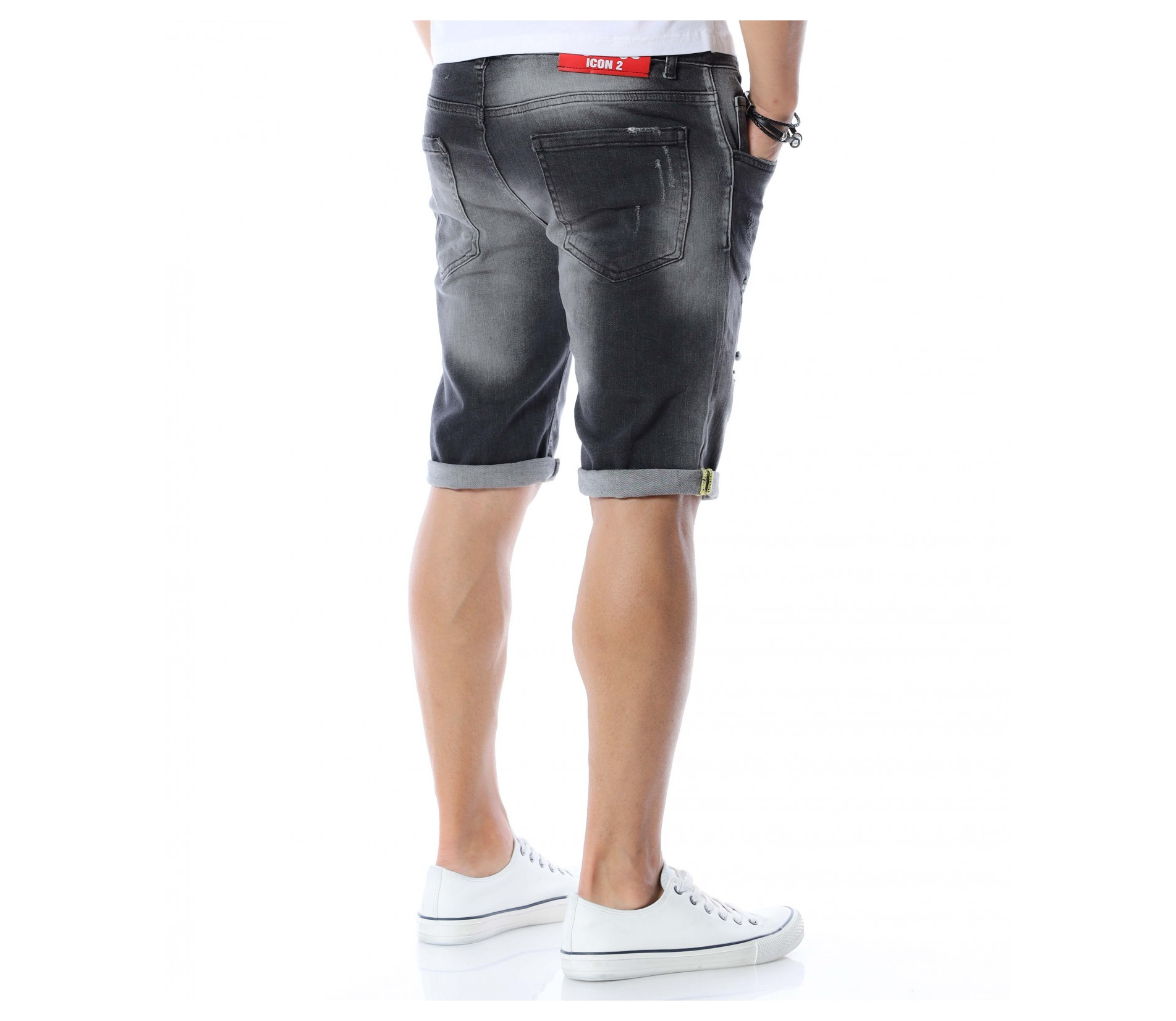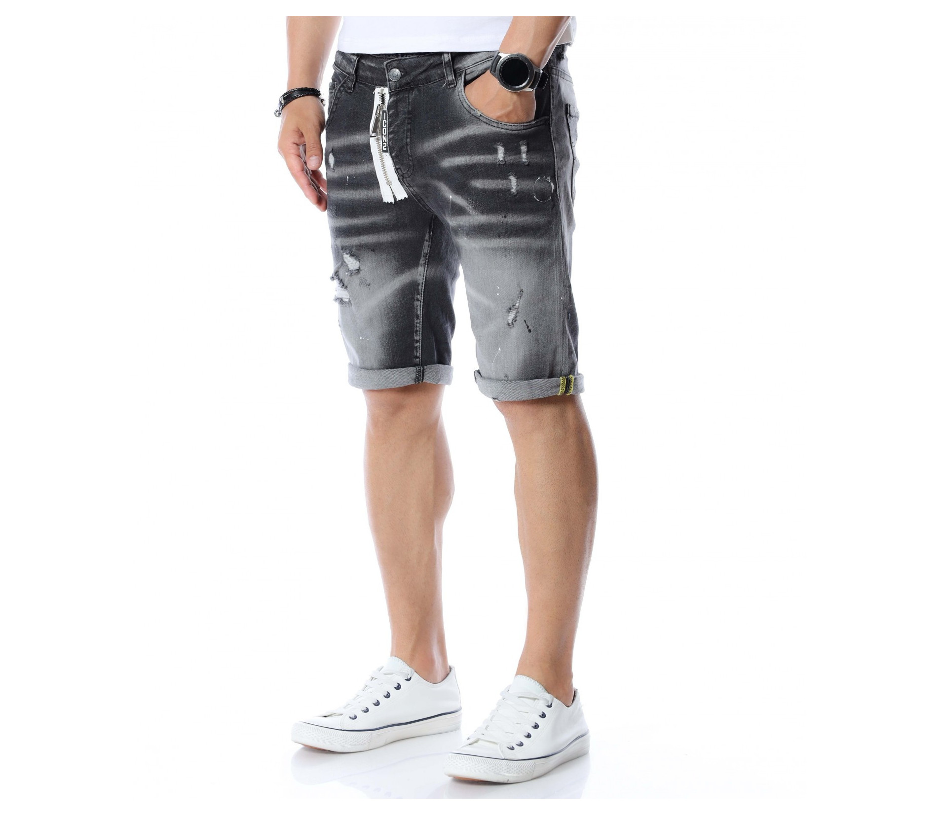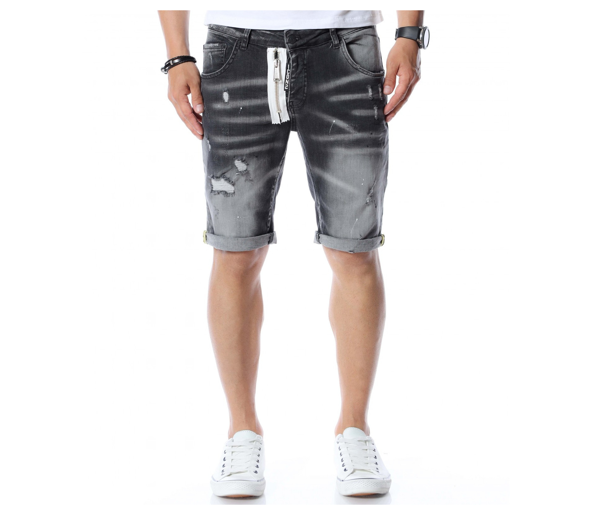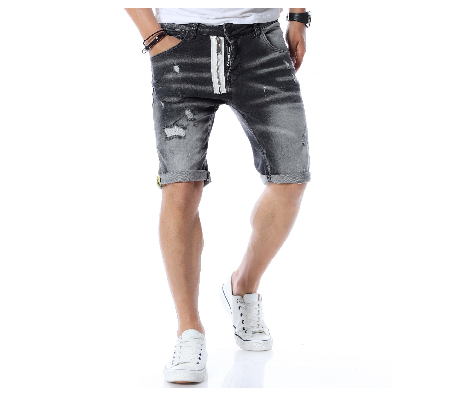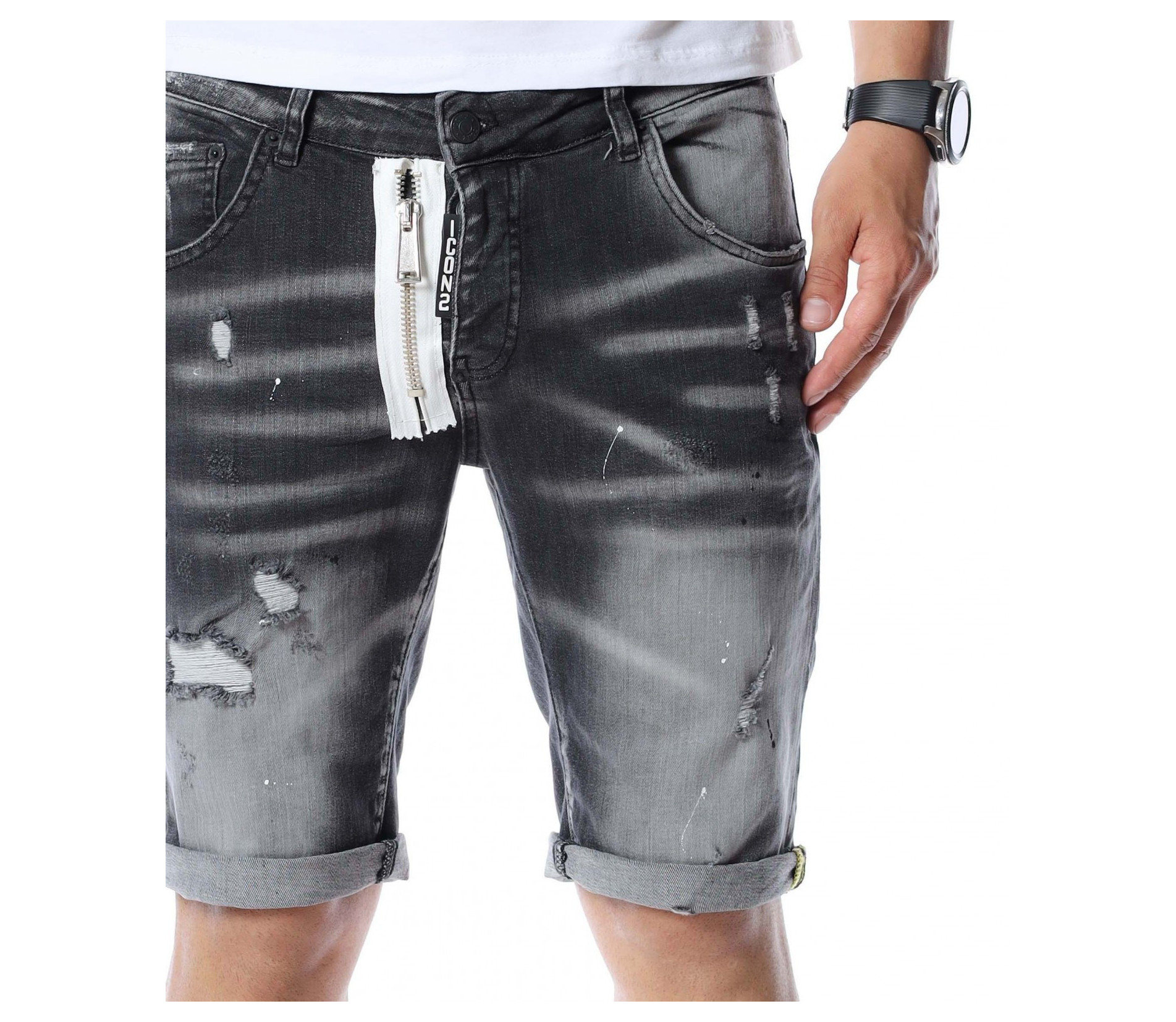 За да се придържаме към бързо развиващите се модни тенденции, сме подбрали за вас чисто нов модел - къси дънки с модерен дизайн. Основата на моделът е едноцветна, а по цялата дължина откриваме фабрично избелели и накъсани елементи, които придават на дънките забележителен вид, с който ще се отличавате от стандартните модели. Като допълнителна декорация е добавен и цип, за да разчупи вида на дрехата. Кройката приляга на тялото и придава лекота на движение. Изработката се състои от 98%памук и 2%еластант. Комбинирайте със свежа тениска и високи кецове по избор.