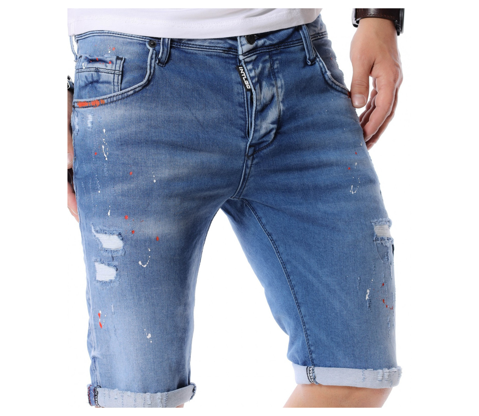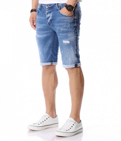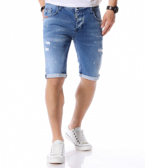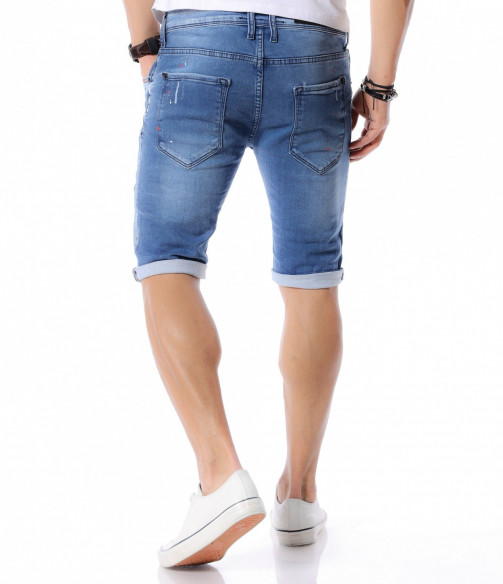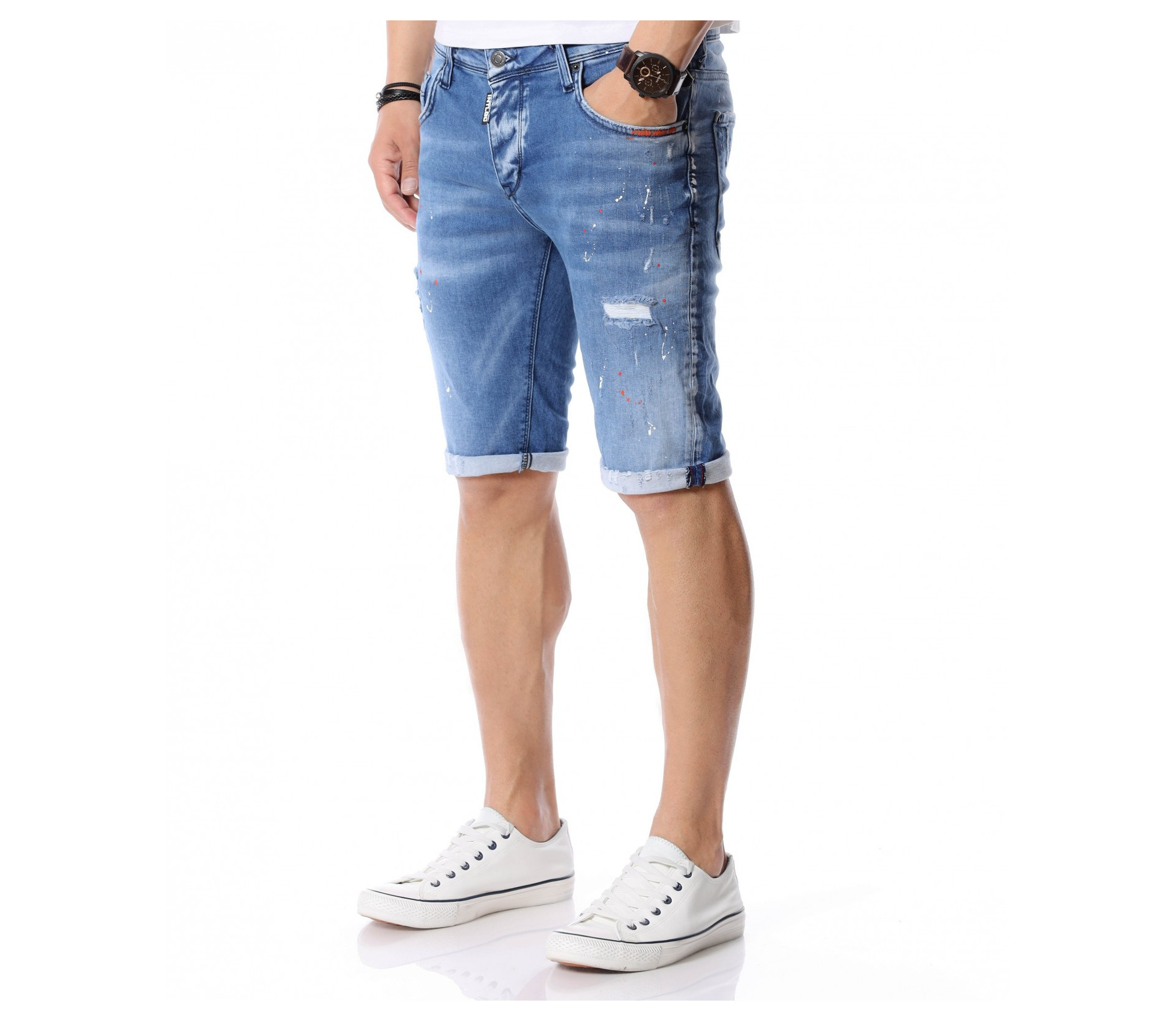 За да се придържаме към новите модни тенденции, този сезон сме ви подбрали актуален и най-предпочитан модел къси дънки. Те са задължителни за всеки мъжки гардероб и намират голямо приложение в ежедневието. Подготвили сме ви - къси, дънкови панталони в светло-синята гама, а по цялата дължина са разположени небрежно накъсани елементи с бели нишки. Кройката е вталена, следваща линиите на тялото, и същевременно даваща достатъчно свобода и комфорт на движение, багодарение на меката си удобна материя. В предната и в задната част са разположени стандартни джобове, а закопчаването се състои в метален цип и копче на талията. Напълно подходящи за изграждане на свежа лятна визия и може да ги съчетаете с тениска и подходящи кецове.