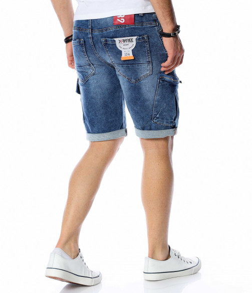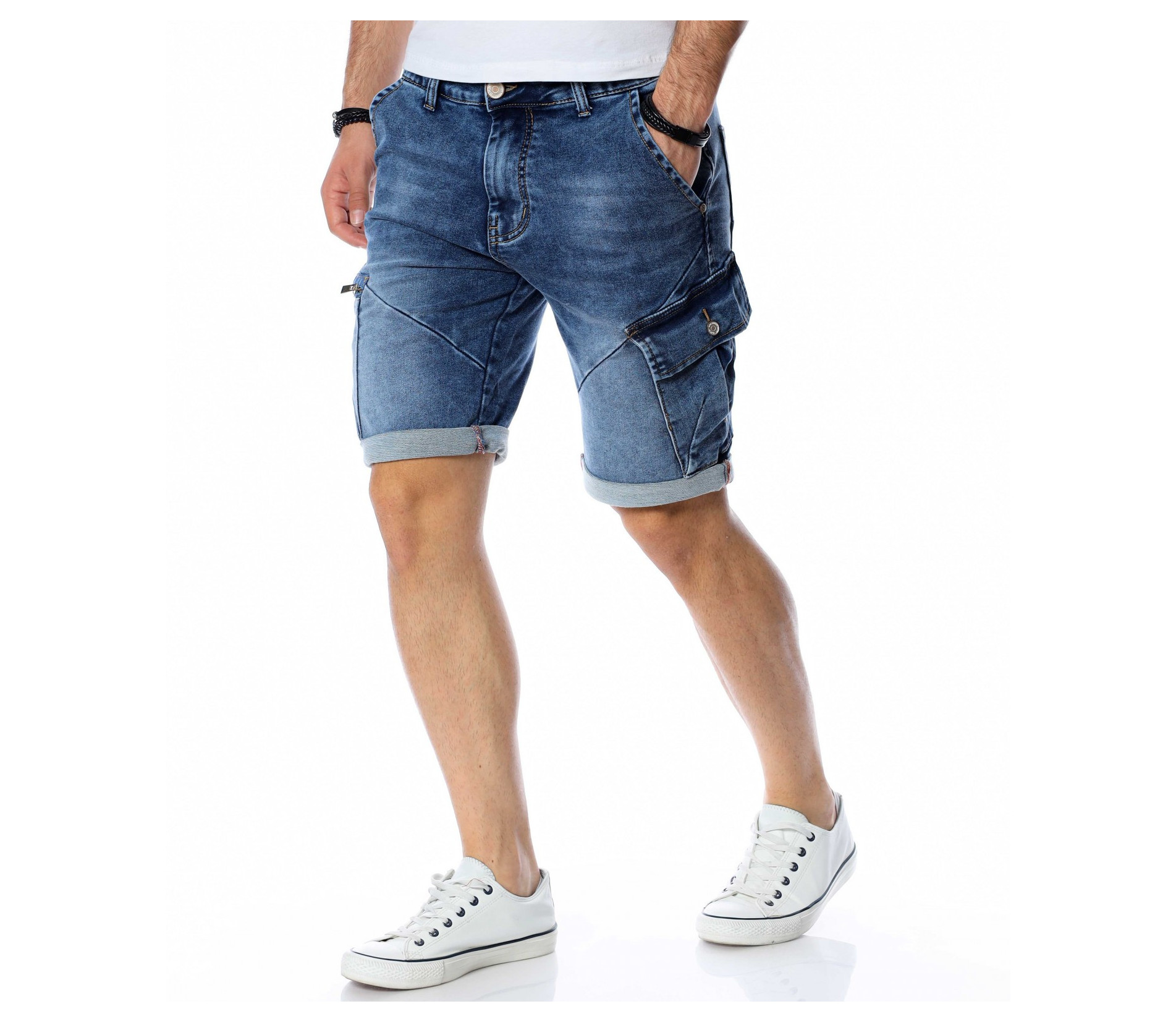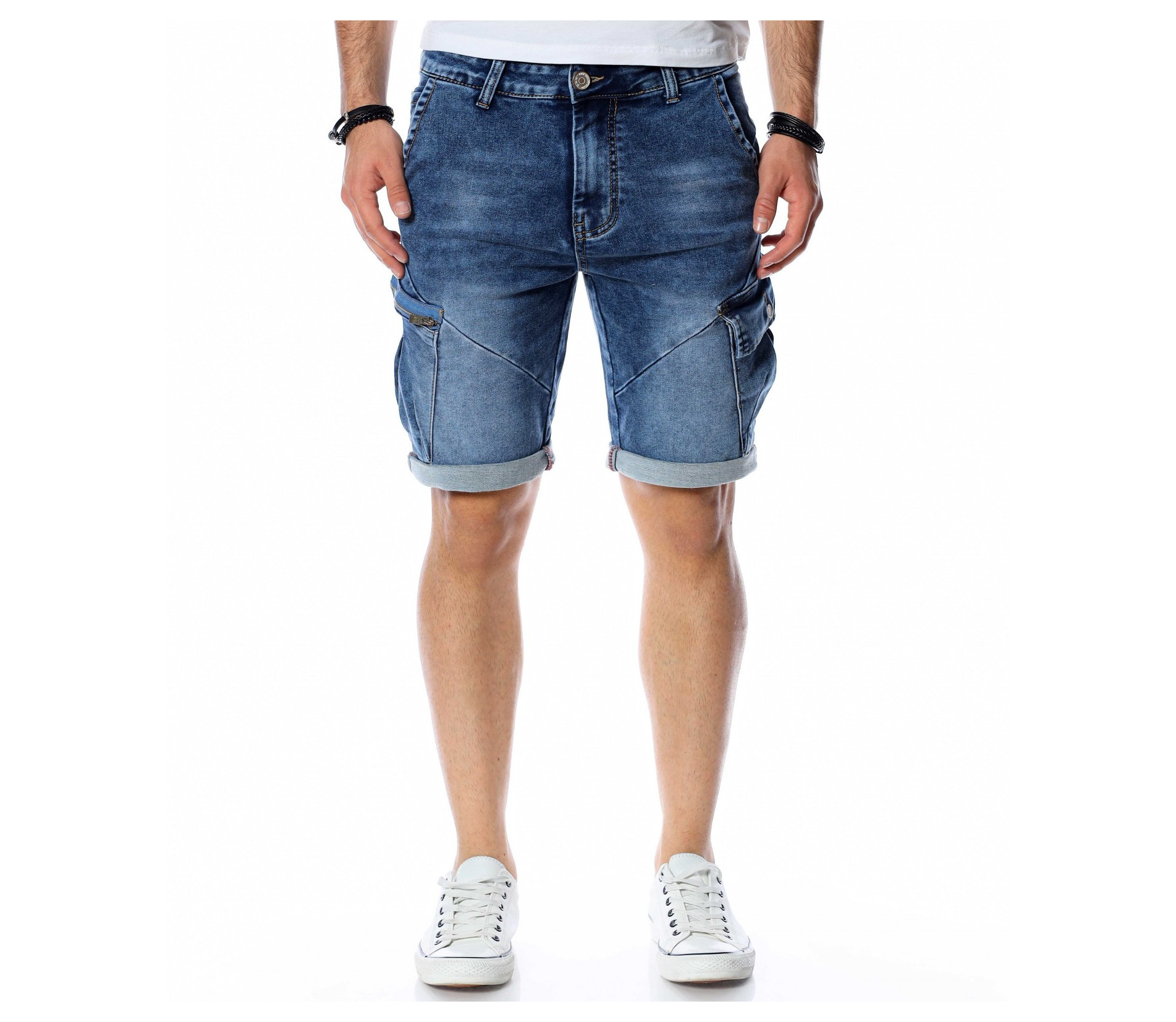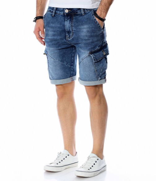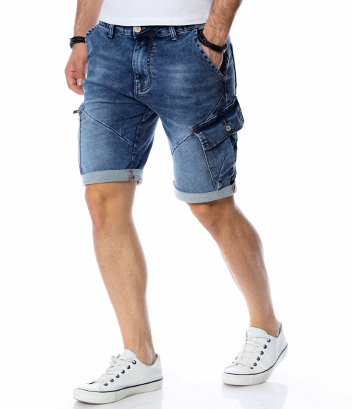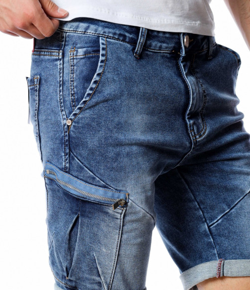 ОПИСАНИЕ НА ПРОДУКТА: Тъй като знаем че и Вие, както нас сте фенове на деним предложенията и този сезон няма да направим изключение, а ще Ви представим най- доброто от тях. Този модел дънки в къс варинат са изпъстрени в син цвят, който на места е фабрично изсветлен, така че да се наблегне на casual привкуса. В предната част са разположени два дълбоки и скрити джоба, чиито ефект е пренесен и в задната част, но там са изработени във външна форма, като са леко и ненатрапчиво декорирани от симетрични шевове. Главният акцент в този модел са странични карго джобове, декорирани със син външен цип. Оставяйки настрана декоративната част, този модел мъжки къси дънки впечатлява с еластичността си, която отлично знаем че придава комфорт, важен за всеки. Дължината на дънковите панталонки е стандартна, като стига до над коляното. Закопчаването на моделът се състои от едно главно външно копче, в продължението на което е разположен метален цип, скрит под маншет. Смело ги комбинирайте с любимите си тениски и обувки, като не забравяте и доброто настроение.