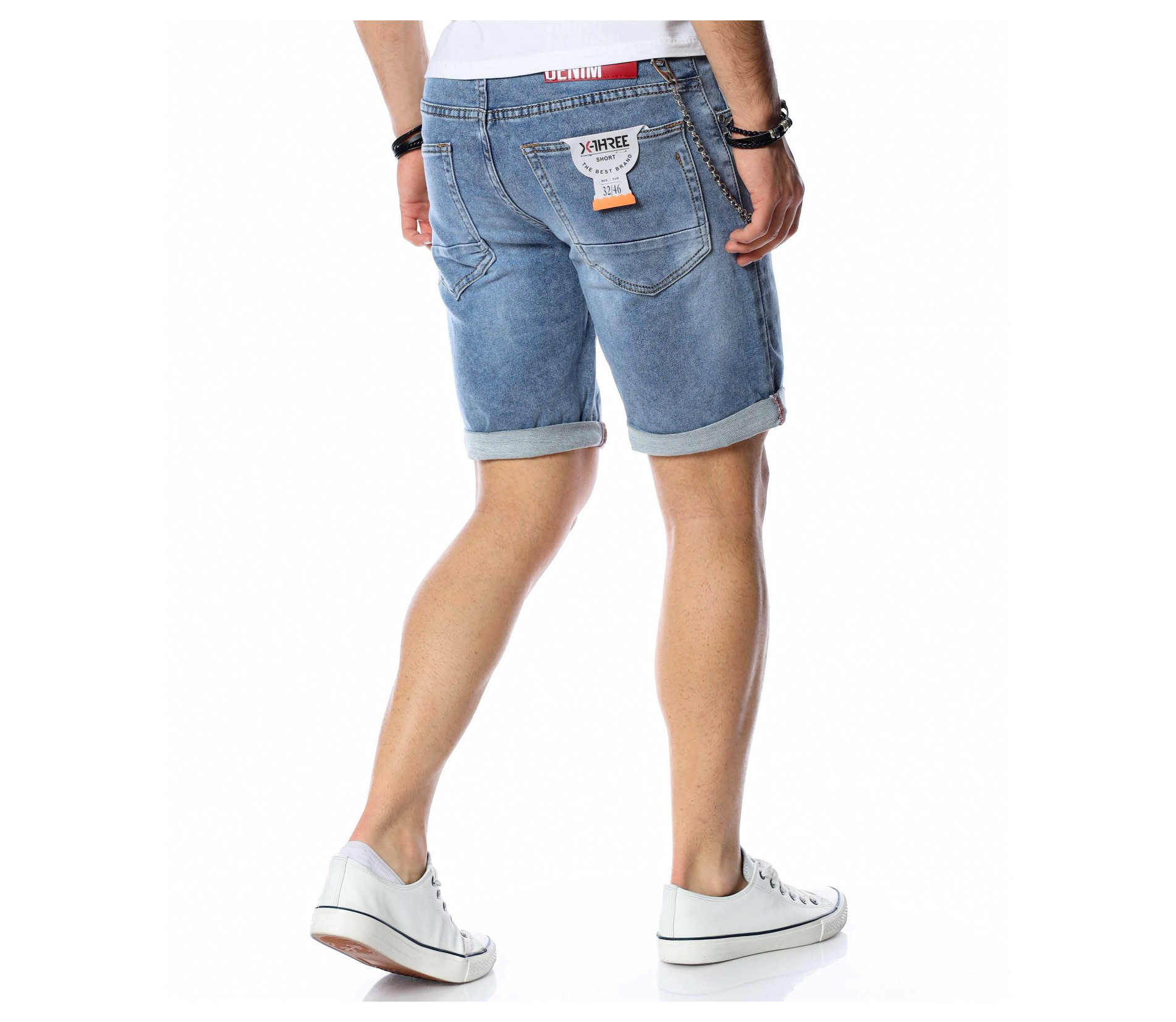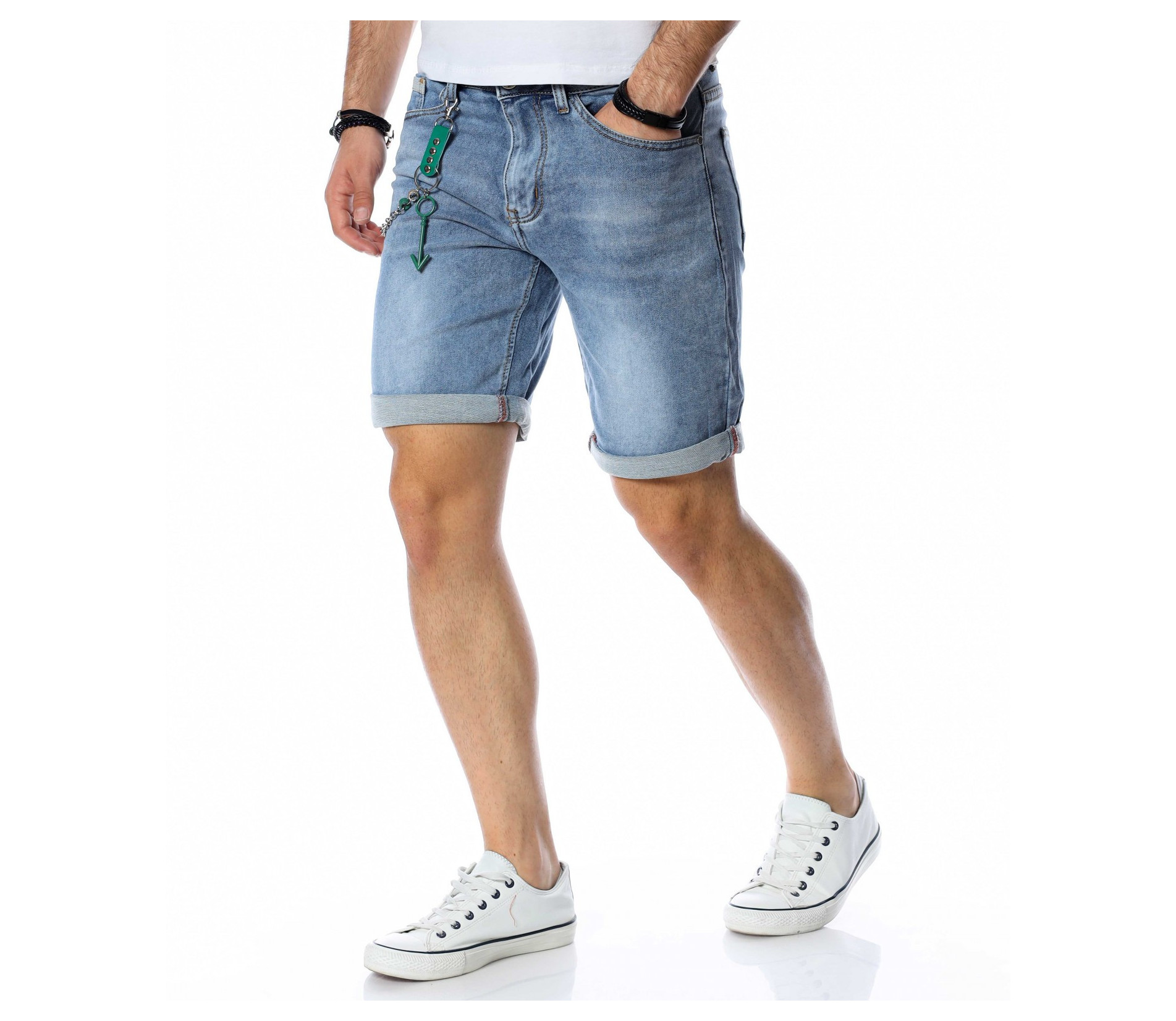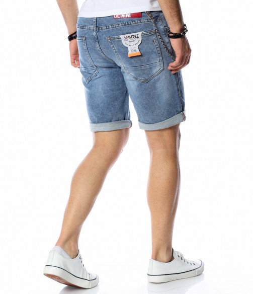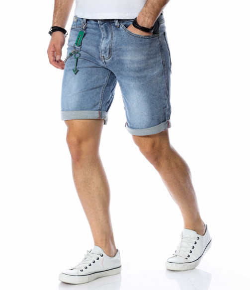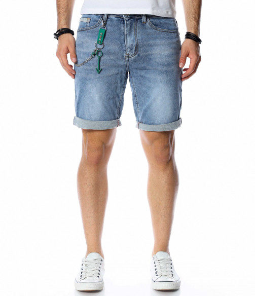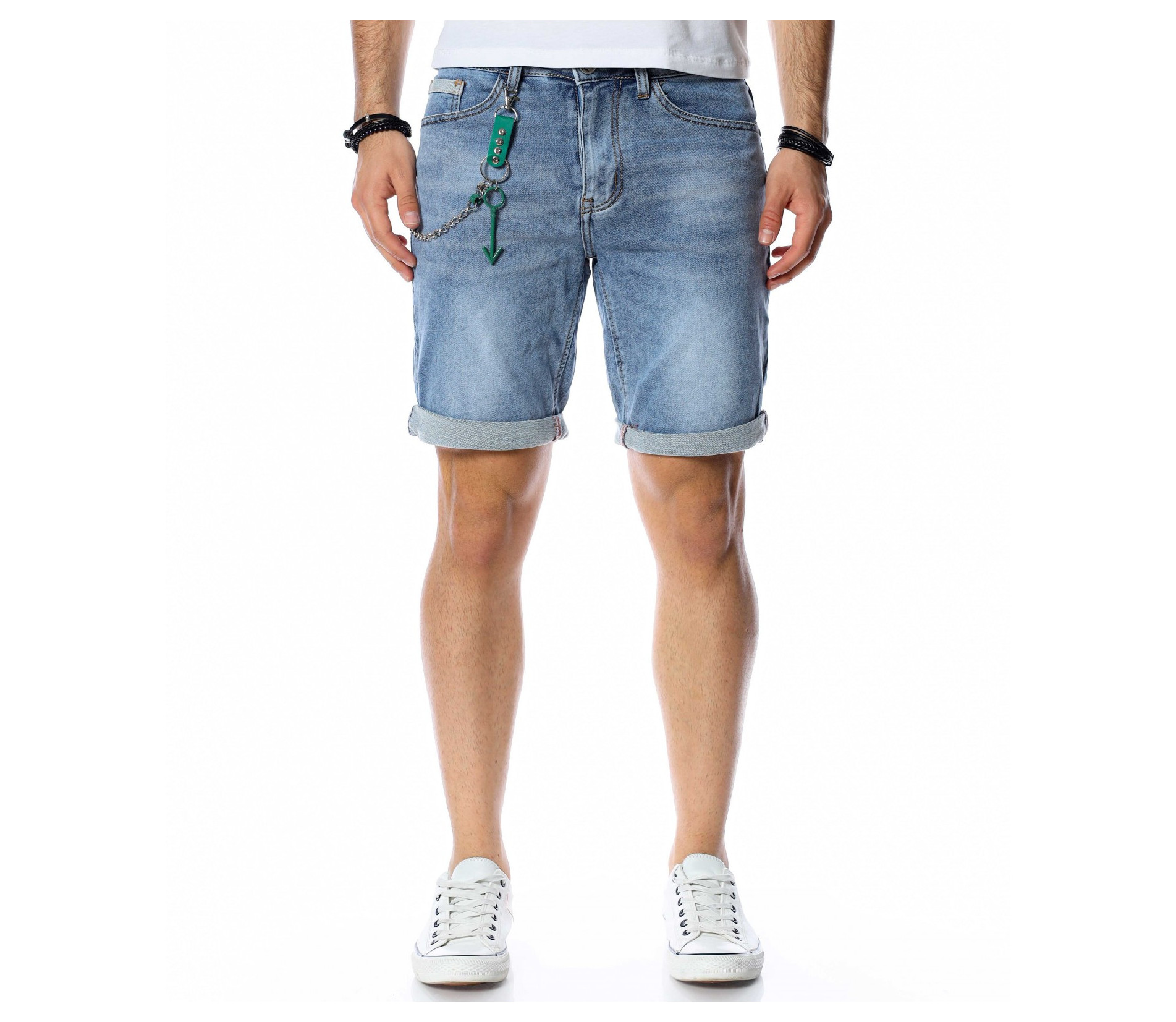 ОПИСАНИЕ НА ПРОДУКТА: Атрактивни мъжки къси дънки изпъстрени в светлосин цвят, ефектно декорирани с метален елемент закопчаващ се  за гайките на колана, в зелено, който придава това различно излъчване. В предната и задната част на панталонките са разположени по два джоба, осигуряващи Ви комфорт. Дължината на дънковите панталони е с възможност за навиване, което Ви гарантира 100% свобода при носенето им. Всички тези модернизирани елементи са в комбинация с леко вталена, но еластична, кройка, стандартна дължина над коляното и лятно излъчване. Съчетайте нестандартните къси дънки с чифт удобни обувки и любима тениска и се подгответе за свежи summer преживявания.