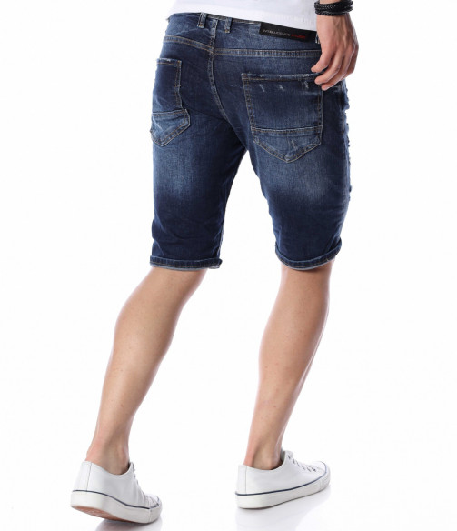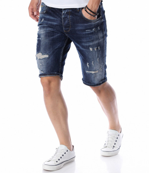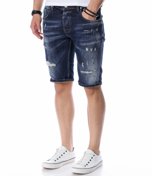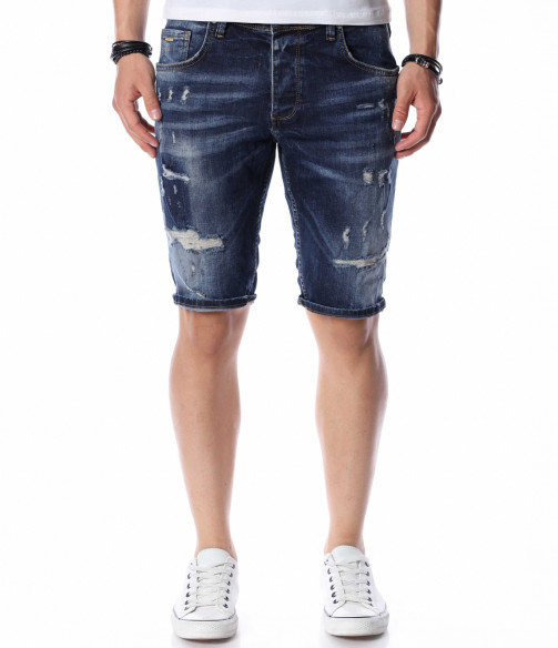 ОПИСАНИЕ НА ПРОДУКТА: В сезона на забавлението и доброто настроение, е важно да пренесете тези емоции и върху дрехите си. За да Ви помогнем с избора, Ви представяме един модел мъжки къси дънки, чиято основа е в класически тъмносин деним. В областта на коляното денимът е с възможност за навиване, с което Ви дава разнообразие при носенето му. В предната част са поставени леко накъсани елементи, които внасят street излъчване в стайлинга на дънките, като небрежно Ви отнасят към топ визията за сезона. В предната и задната част са поставени по два дълбоки джоба, осигуряващи Ви комфорт. Дължината на късите мъжки дънки е над коляното, а дълбочината е стандартна. Смело експериментирайте, като съчетавате късите джинси с щури тениски или ризи, модерни обувки и любимите аксесоари.