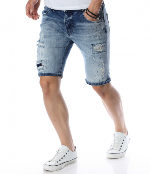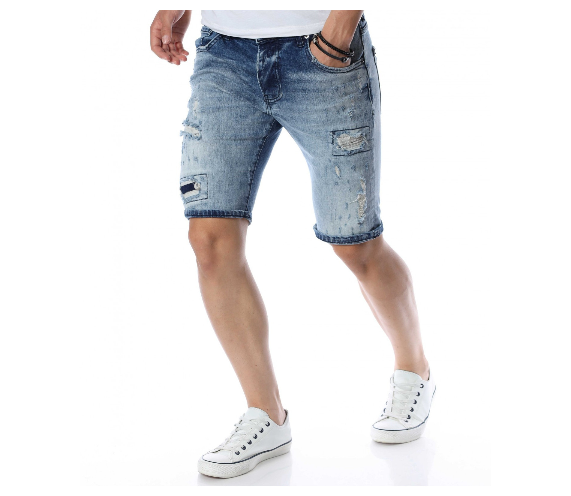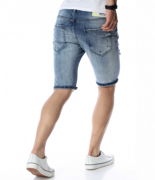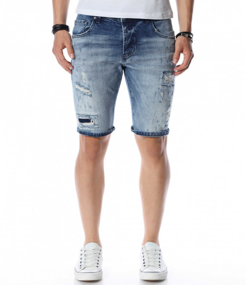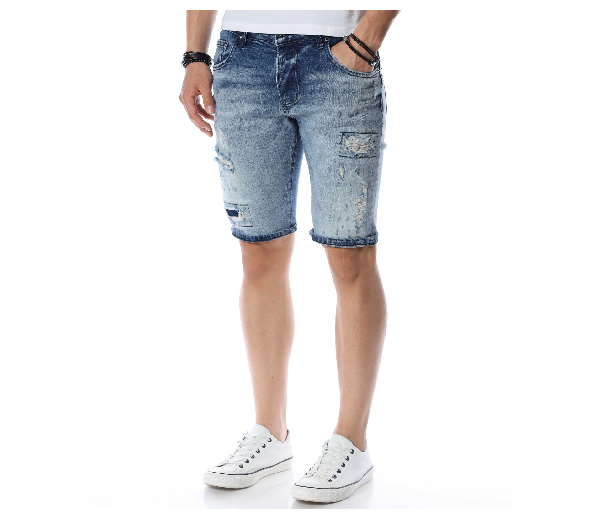 ОПИСАНИЕ НА ПРОДУКТА: Свеж модел мъжки спортно-елегантни къси дънки, изпъстрени в светлосин десен, създаващ лятно настроение. По цялата дължина на денима са поставени леки изсветлели участъци, където цвета прелива от по-тъмните към по-светлите нюанси. Модерният светъл модел е декориран с кръпка с тъмна подплата и тъмен шев около нея. В предната и задната част са поставени по два дълбоки джоба, като тези в задната част са леко акцентирани с ненатрапчиви шевове, а формата им е леко заострена в долната част. Дължината на късите джинси е стандартна, до коляното, като е с възможност за навиване на крачолите, създаващи различни варианти на носене. Бъдете смели в избора си на летен сет, като заложите на тези супер актуални мъжки къси дънки в комбинация с цветна тениска или риза, спортно-елегантни обувки и стилен аксесоар.