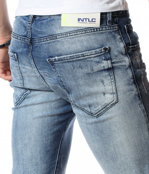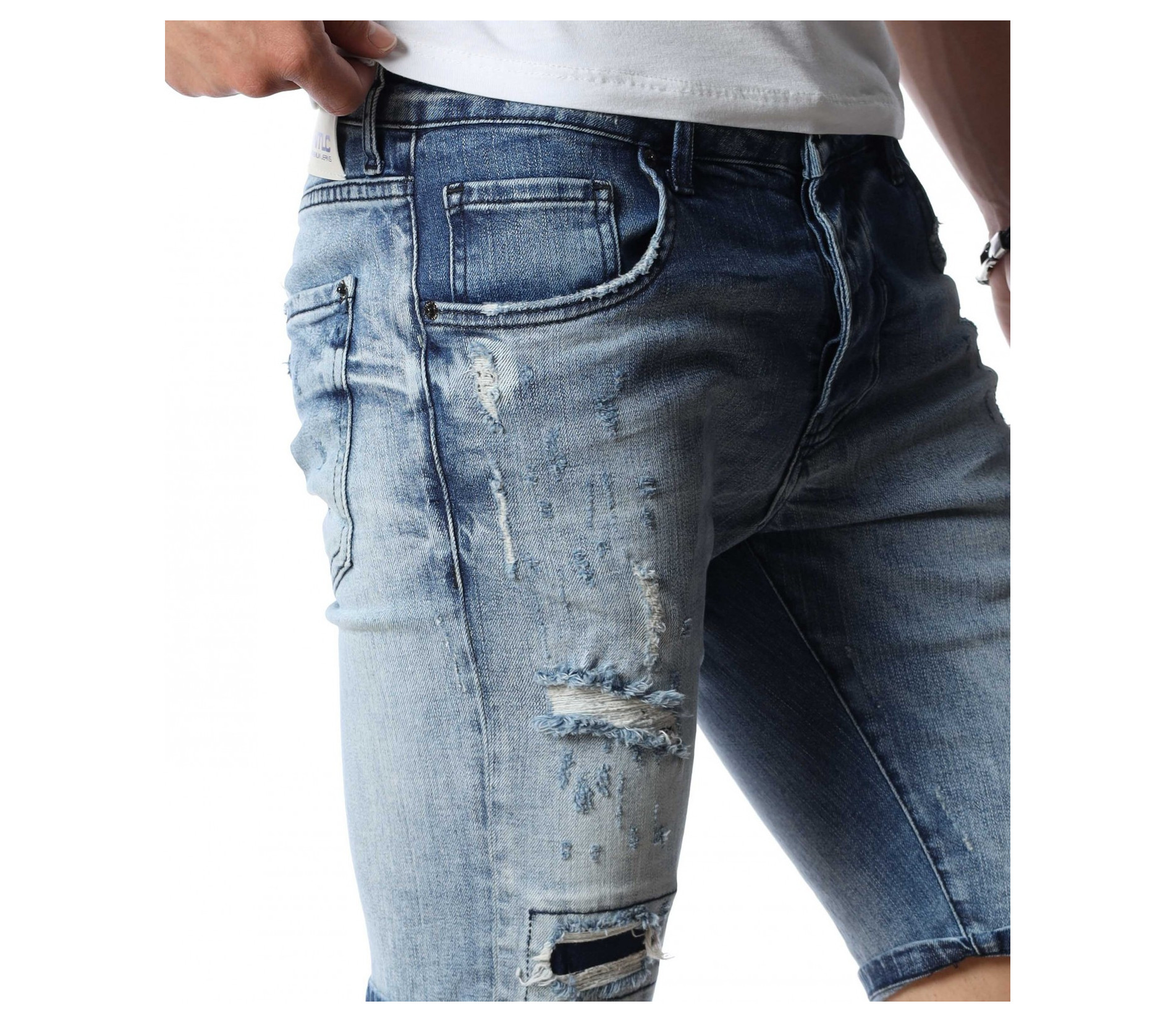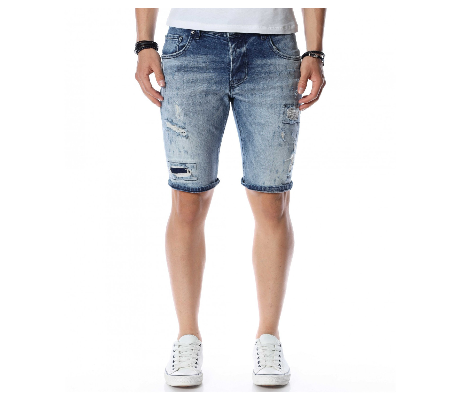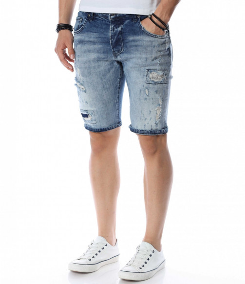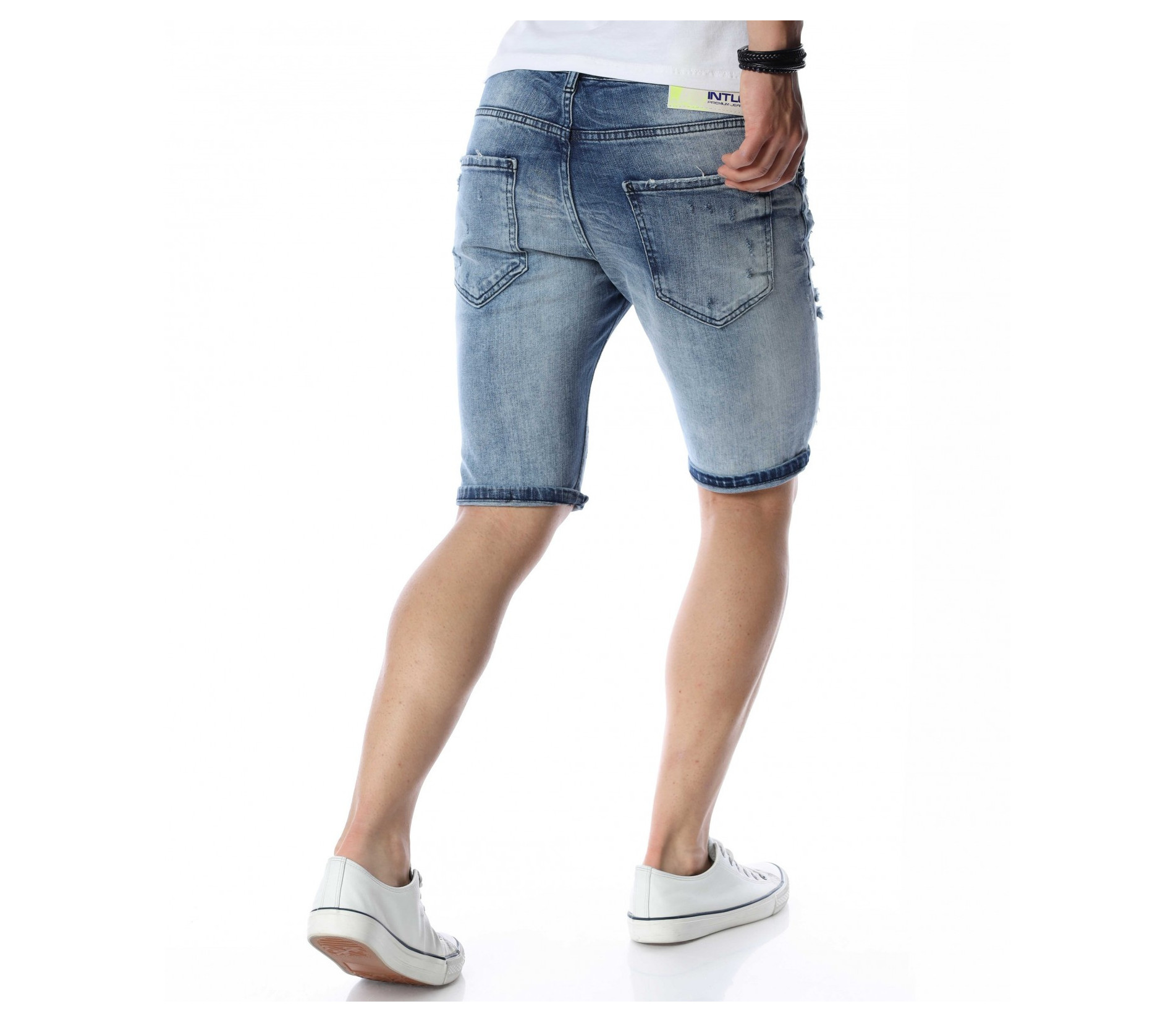 ОПИСАНИЕ НА ПРОДУКТА: Свеж модел мъжки спортно-елегантни къси дънки, изпъстрени в светлосин десен, създаващ лятно настроение. По цялата дължина на денима са поставени леки изсветлели участъци, където цвета прелива от по-тъмните към по-светлите нюанси. Модерният светъл модел е декориран с кръпка с тъмна подплата и тъмен шев около нея. В предната и задната част са поставени по два дълбоки джоба, като тези в задната част са леко акцентирани с ненатрапчиви шевове, а формата им е леко заострена в долната част. Дължината на късите джинси е стандартна, до коляното, като е с възможност за навиване на крачолите, създаващи различни варианти на носене. Бъдете смели в избора си на летен сет, като заложите на тези супер актуални мъжки къси дънки в комбинация с цветна тениска или риза, спортно-елегантни обувки и стилен аксесоар.