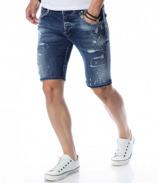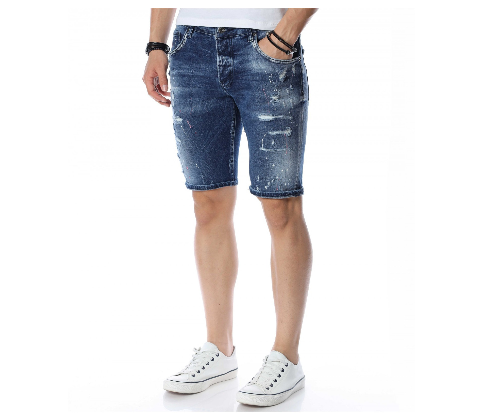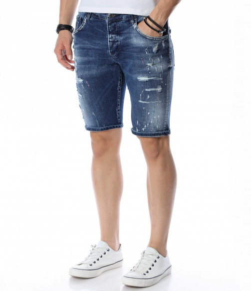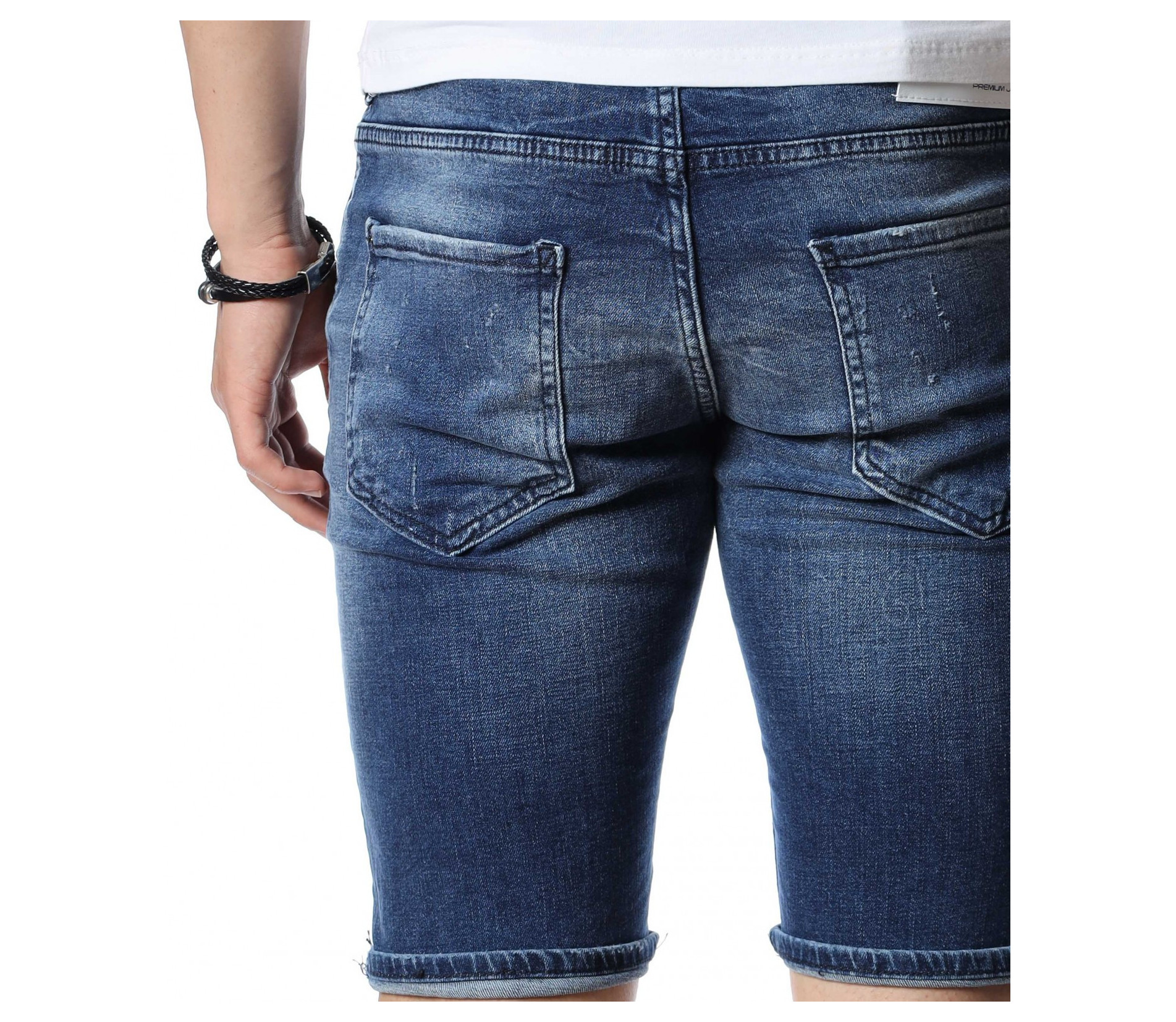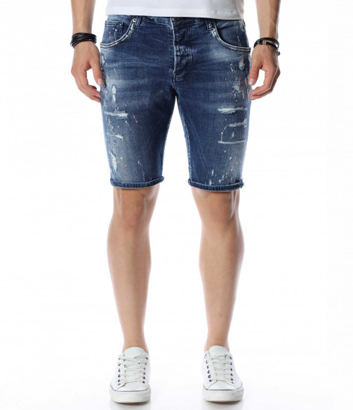 ОПИСАНИЕ НА ПРОДУКТА: Последвай модните тенденции и си гарантирай атрактивен имидж с чифт къси, мъжки дънки в атрактивна, вталена кройка. Материята на модела е памучна с еластичност, следвайки неотменно мъжкия силует, осигурявайки комфорт, на който знаем, че държите. Визията на късите джинси е изградена от тъмно синя основа, която е умело декорирана от светли пръски от боя и кръпки с бели нишки, обхващащи дължината на крачолите. От двете страни на модела дънки са разположени по два дълбоки джоба за изграждане на характерната визия за всички дънки и панталони. В областта на колана в задната част е поставена кожена емблема с името на марката, а единия преден джоб е декориран с малък такъв с чисто акцентираща функция. Бъди модерен с ексцентричен модел дънки в комбинация с любимите ти тениски и обувки.