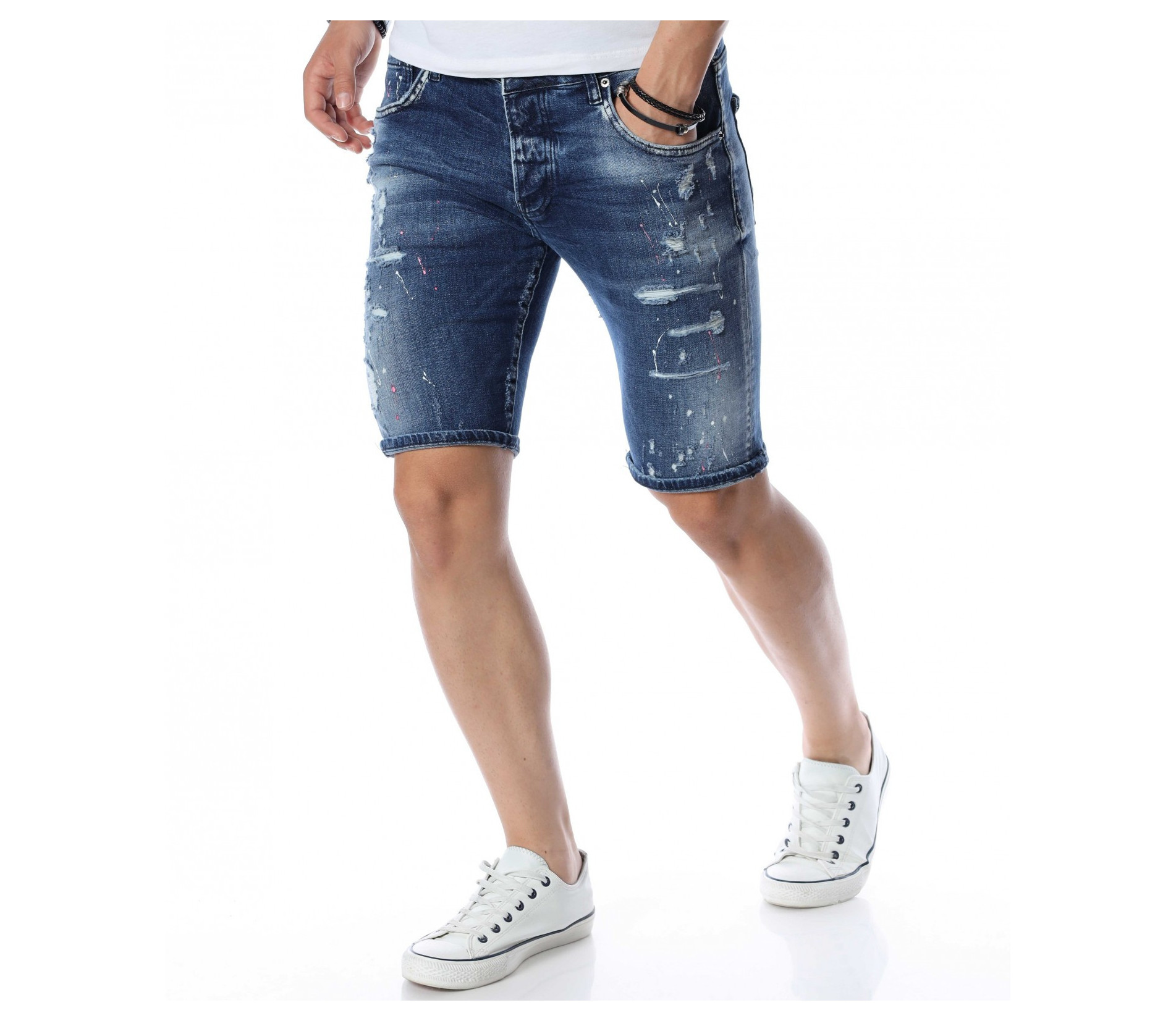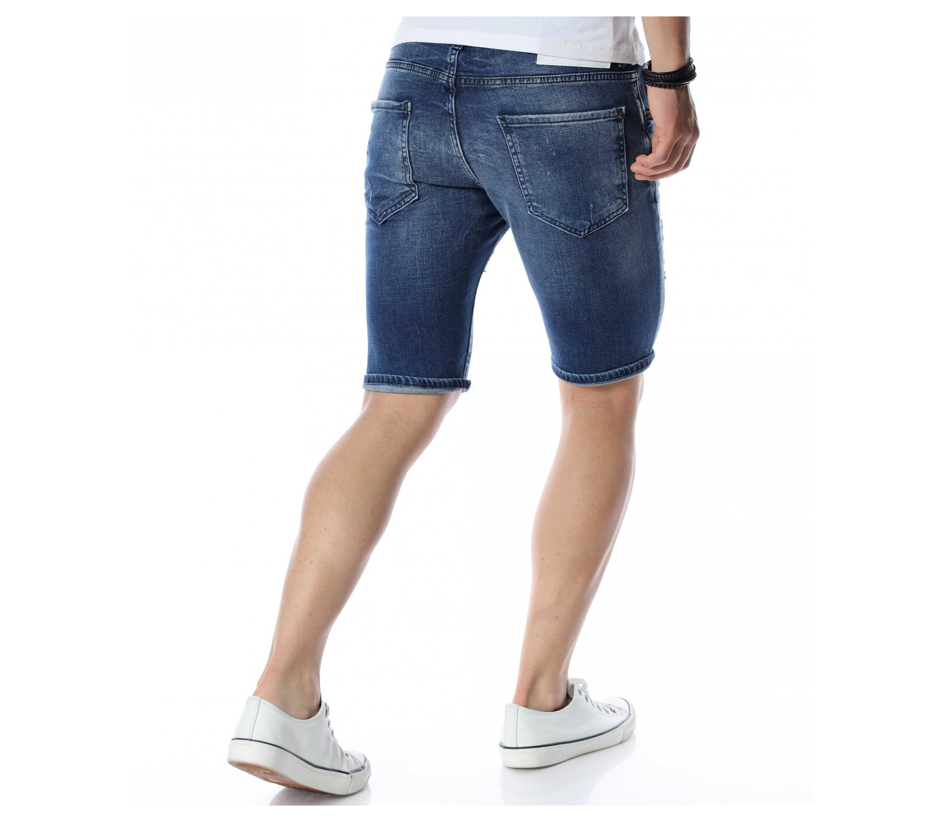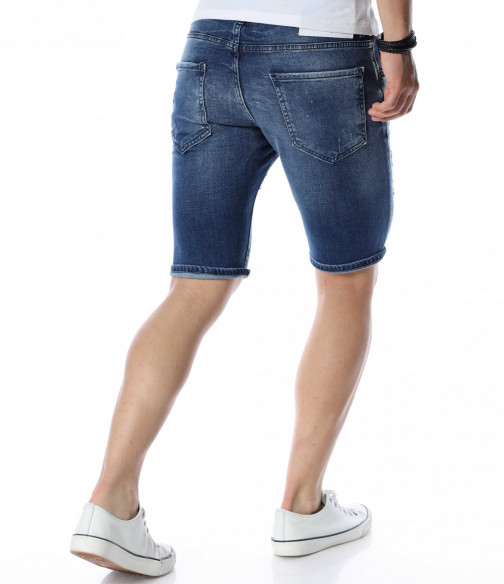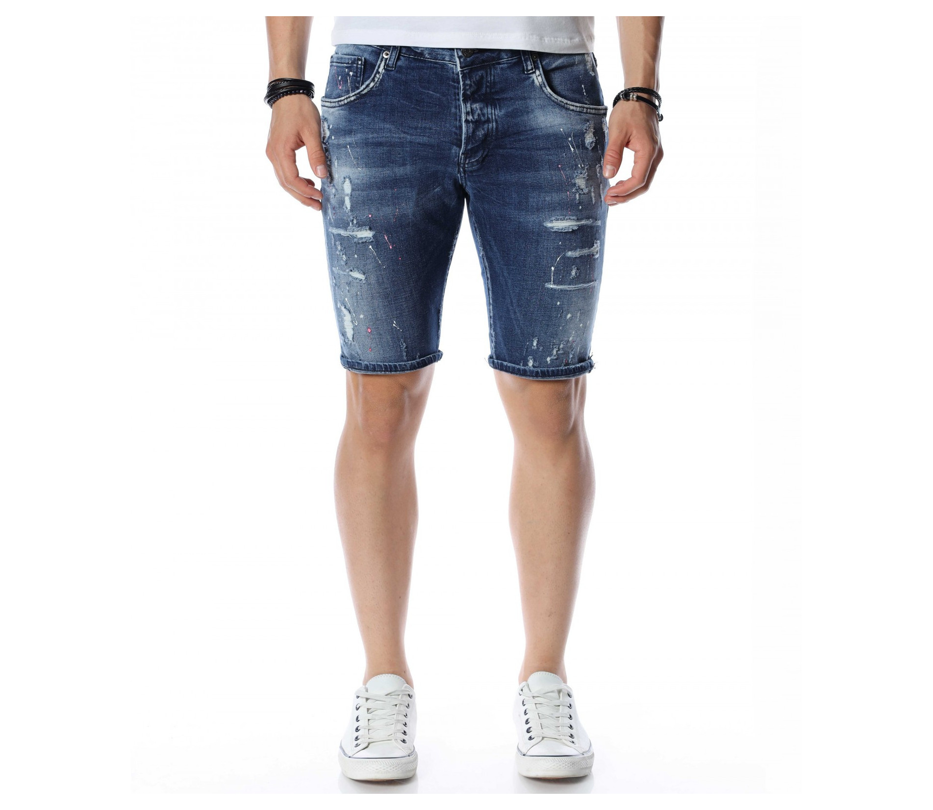 ОПИСАНИЕ НА ПРОДУКТА: Последвай модните тенденции и си гарантирай атрактивен имидж с чифт къси, мъжки дънки в атрактивна, вталена кройка. Материята на модела е памучна с еластичност, следвайки неотменно мъжкия силует, осигурявайки комфорт, на който знаем, че държите. Визията на късите джинси е изградена от тъмно синя основа, която е умело декорирана от светли пръски от боя и кръпки с бели нишки, обхващащи дължината на крачолите. От двете страни на модела дънки са разположени по два дълбоки джоба за изграждане на характерната визия за всички дънки и панталони. В областта на колана в задната част е поставена кожена емблема с името на марката, а единия преден джоб е декориран с малък такъв с чисто акцентираща функция. Бъди модерен с ексцентричен модел дънки в комбинация с любимите ти тениски и обувки.