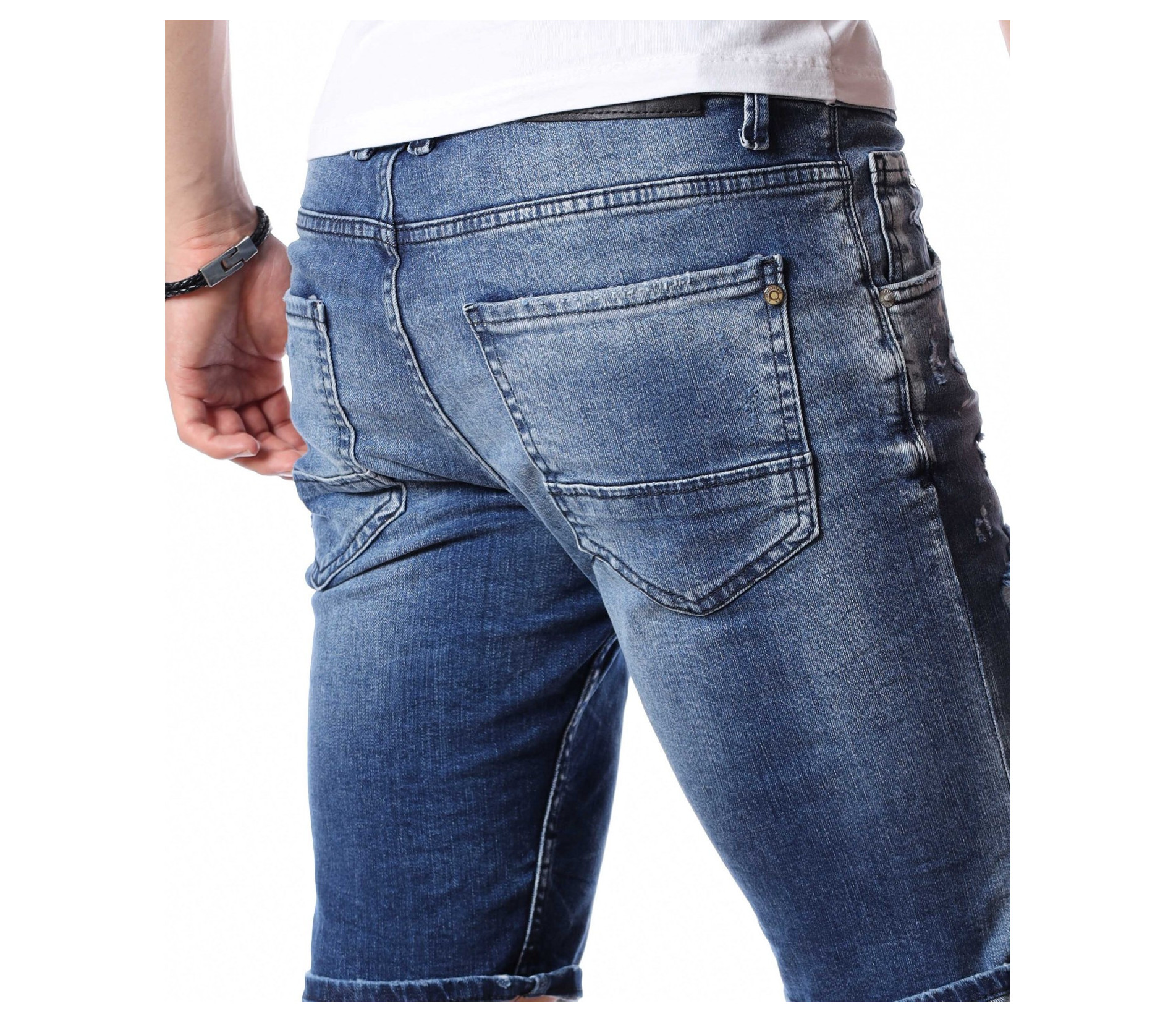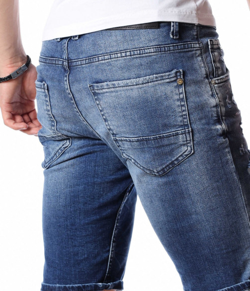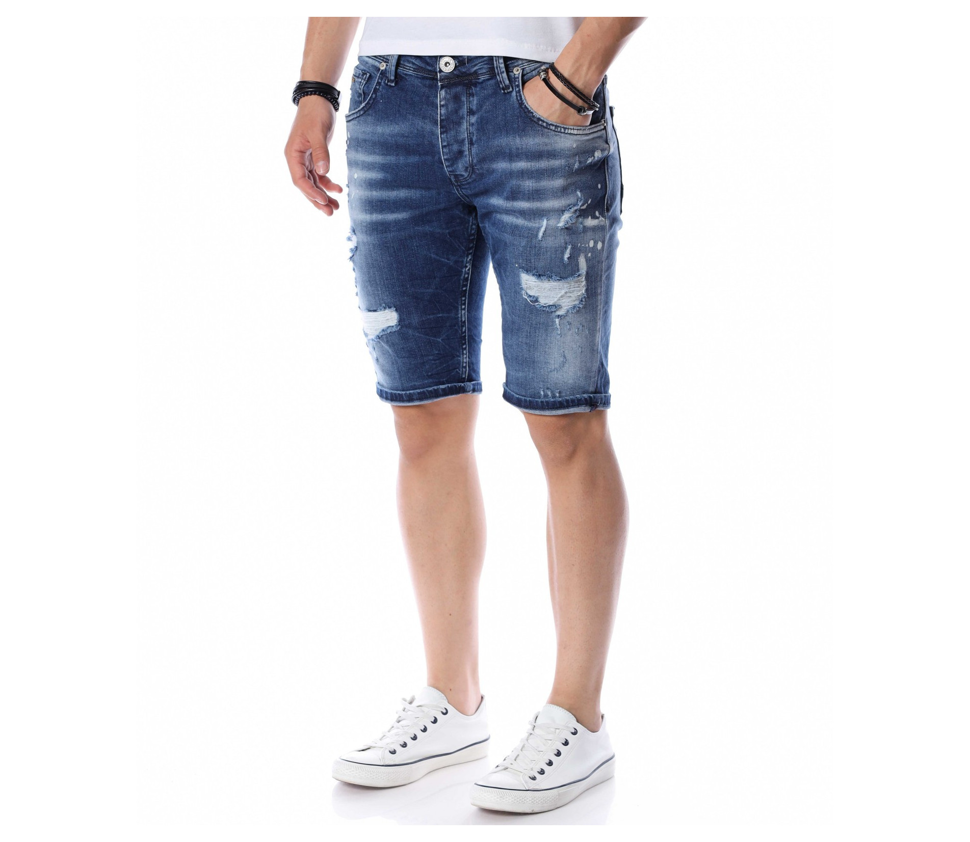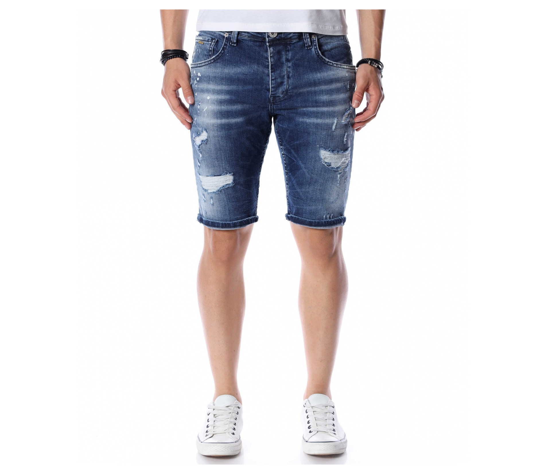 ОПИСАНИЕ НА ПРОДУКТА: Модерен мъжки сини къси панталони от дънков плат - спортно-елегантна кройка, акцентиращи детайли и висок клас - всичко, което прави имиджа ти неподражаем. Десенът на джинсите е част от синята гама, като умело се допълва от лек избелял ефект и светли кръпки в предната част на крачолите. Кройката е слим фит, а талията е стандартна. Закопчаването на дънките е с помощта на няколко копчета, скрити под дънков кант, и едно основно с по-голям размер в областта на колана. За удобство има два предни дълбоки джоба, а на задните има акцент-хоризонтален шев по-тъмен цвят. Леко избелели отенъци и накъсани нишки следват дължината на крачолите. Комбинирайте с любимата си разчупена тениска и бъдете неотразим.