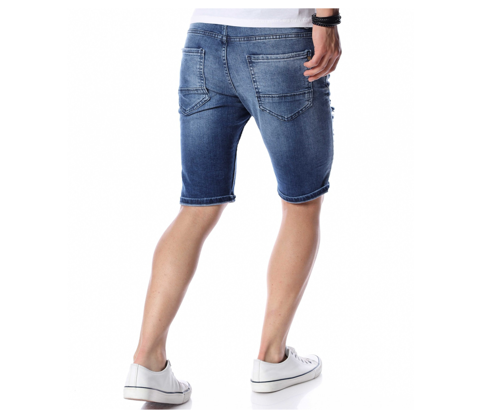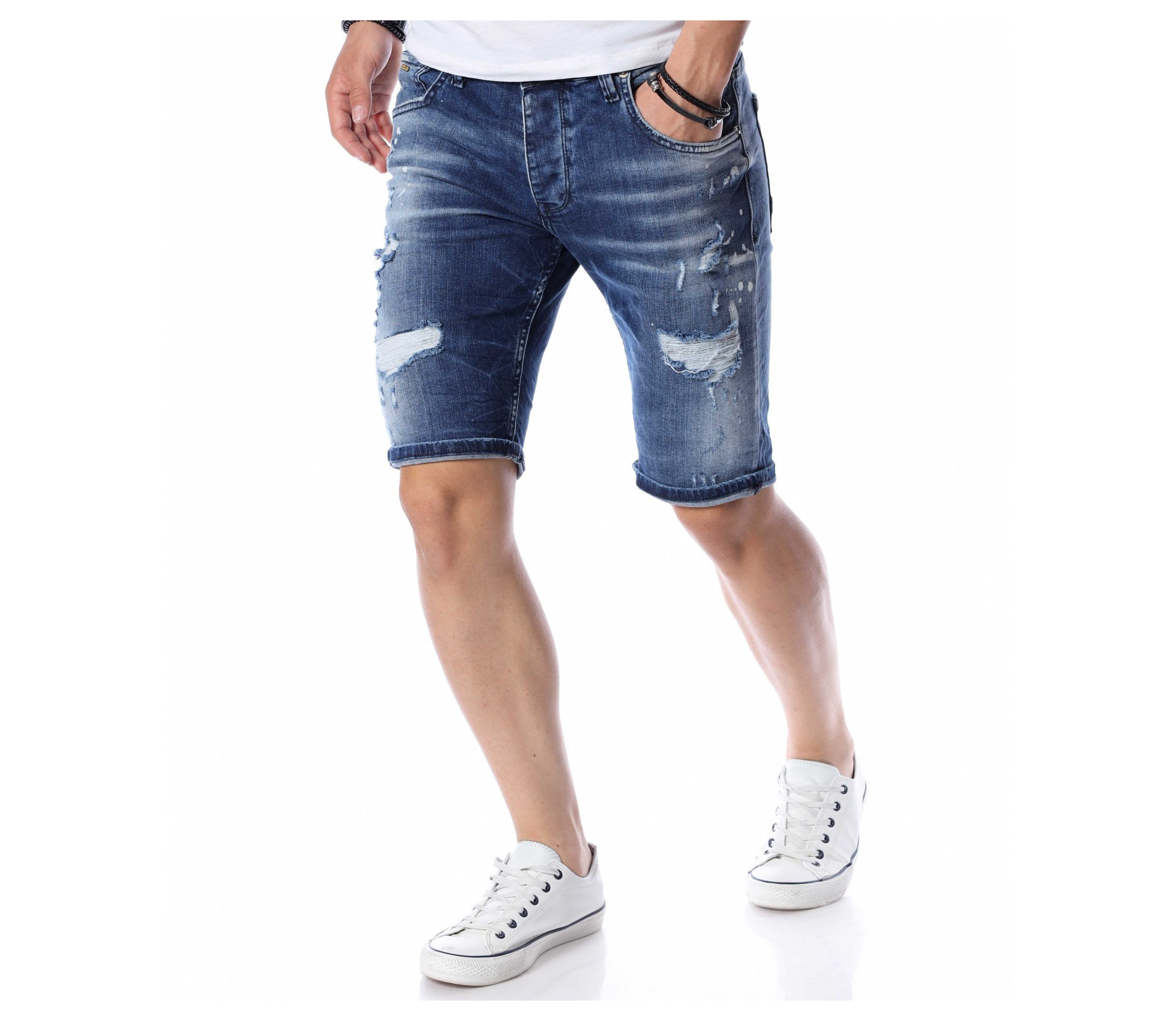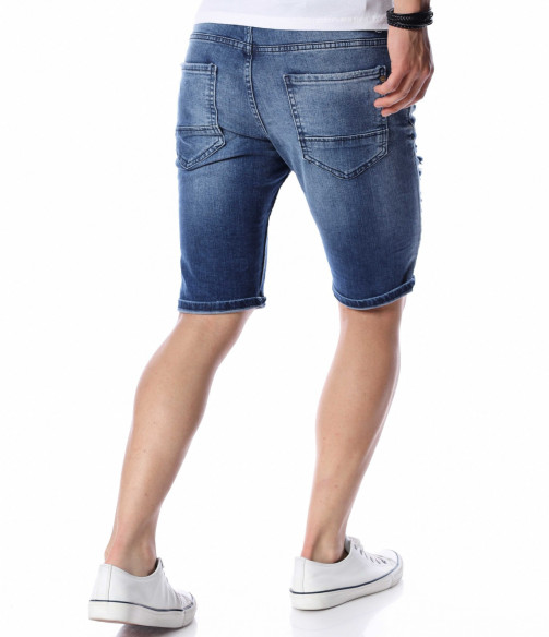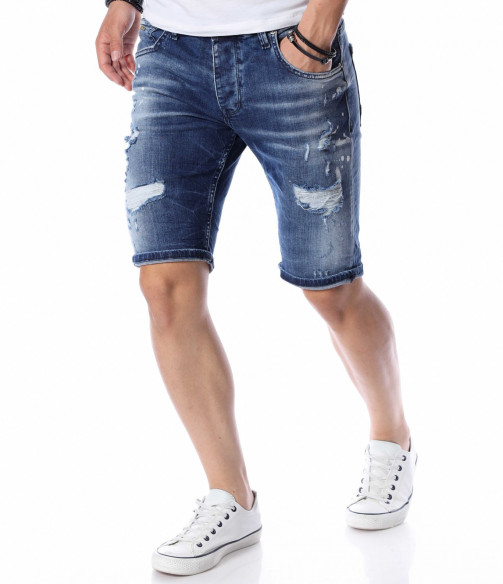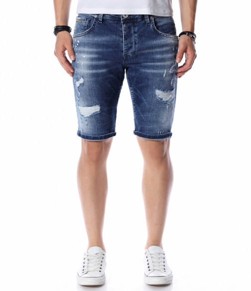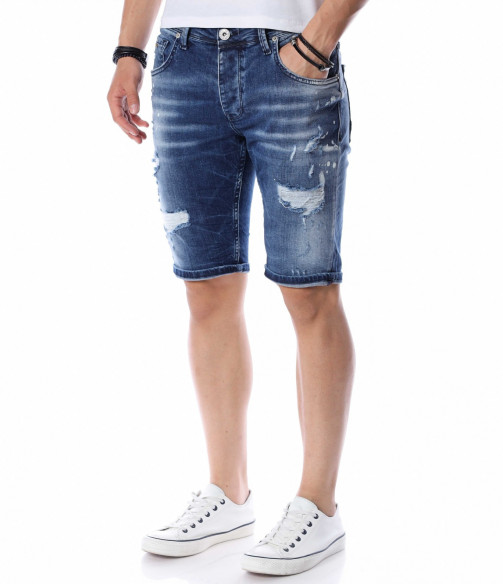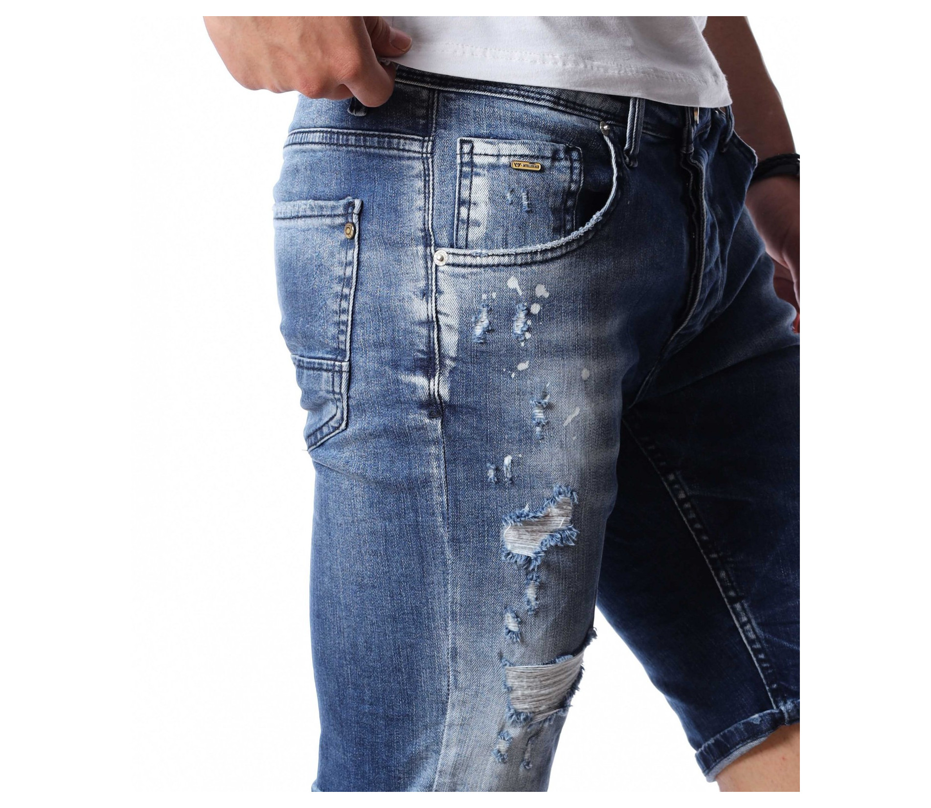 ОПИСАНИЕ НА ПРОДУКТА: Модерен мъжки сини къси панталони от дънков плат - спортно-елегантна кройка, акцентиращи детайли и висок клас - всичко, което прави имиджа ти неподражаем. Десенът на джинсите е част от синята гама, като умело се допълва от лек избелял ефект и светли кръпки в предната част на крачолите. Кройката е слим фит, а талията е стандартна. Закопчаването на дънките е с помощта на няколко копчета, скрити под дънков кант, и едно основно с по-голям размер в областта на колана. За удобство има два предни дълбоки джоба, а на задните има акцент-хоризонтален шев по-тъмен цвят. Леко избелели отенъци и накъсани нишки следват дължината на крачолите. Комбинирайте с любимата си разчупена тениска и бъдете неотразим.