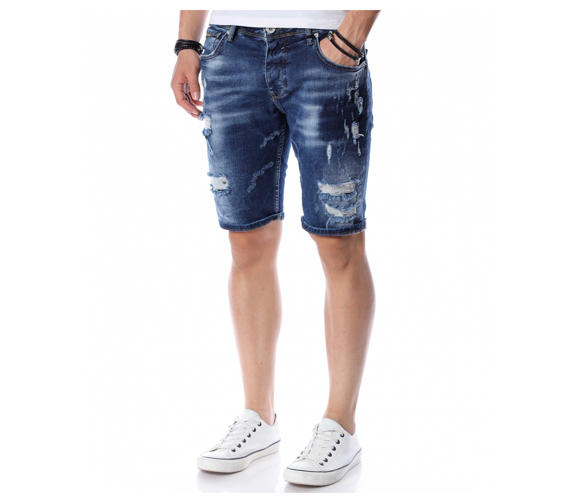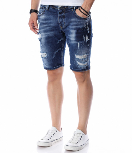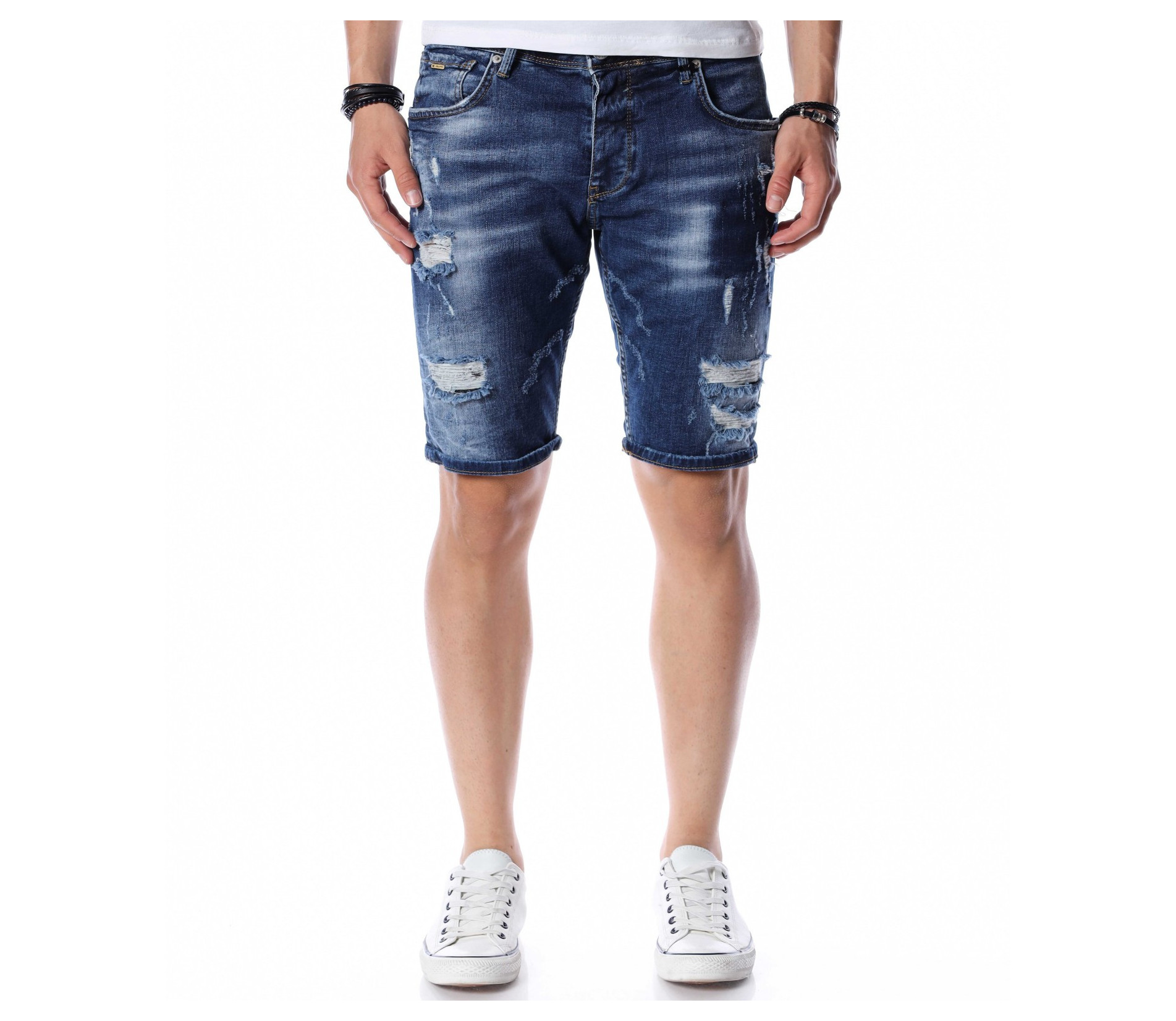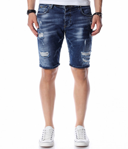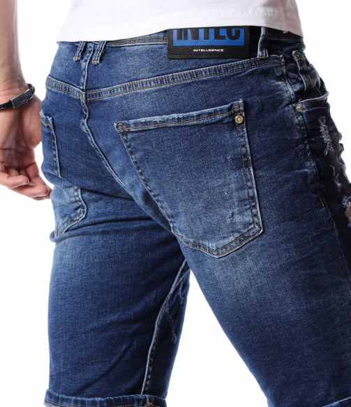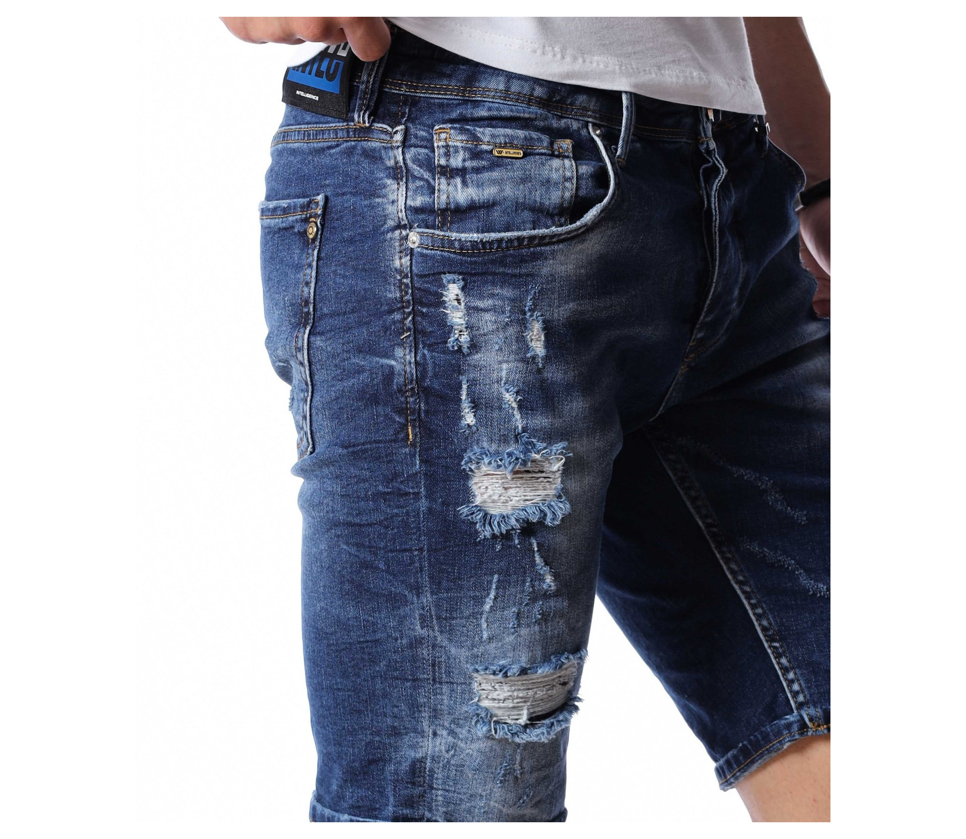 ОПИСАНИЕ НА ПРОДУКТА: В сезона на забавлението и доброто настроение, е важно да пренесете тези емоции и върху дрехите си. За да Ви помогнем с избора, Ви представяме един модел мъжки къси дънки, чиято основа е в класически син деним. Уникалността на джинсите се откроява в лицето на кръпки, разположени хаотично по цялата основа, както и на фабричните избелвания по цялата дължина на модела. От страна на кройката, мъжките къси дънки са изработени в slim fit линия, с дължина стигаща до коляното. Тук се открива и възможността да ги навиете, така че да бъдат по Ваш вкус. Закопчаването им се състои от малки копчета, скрити под маншет, и едно по-голямо външно. Завършителния щрих са класическите два предни и два задни джоба, придаващи автентичност на моделът.