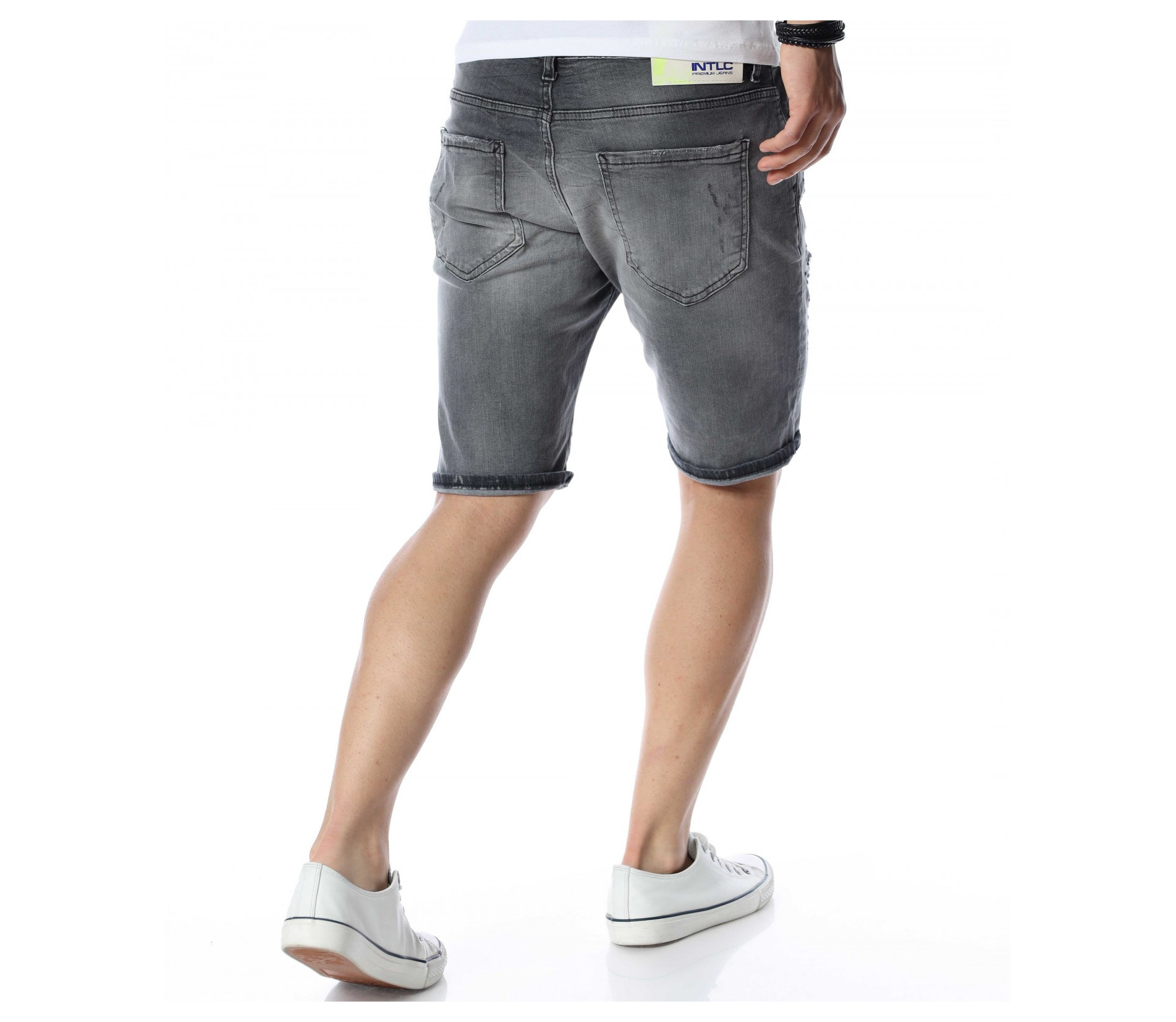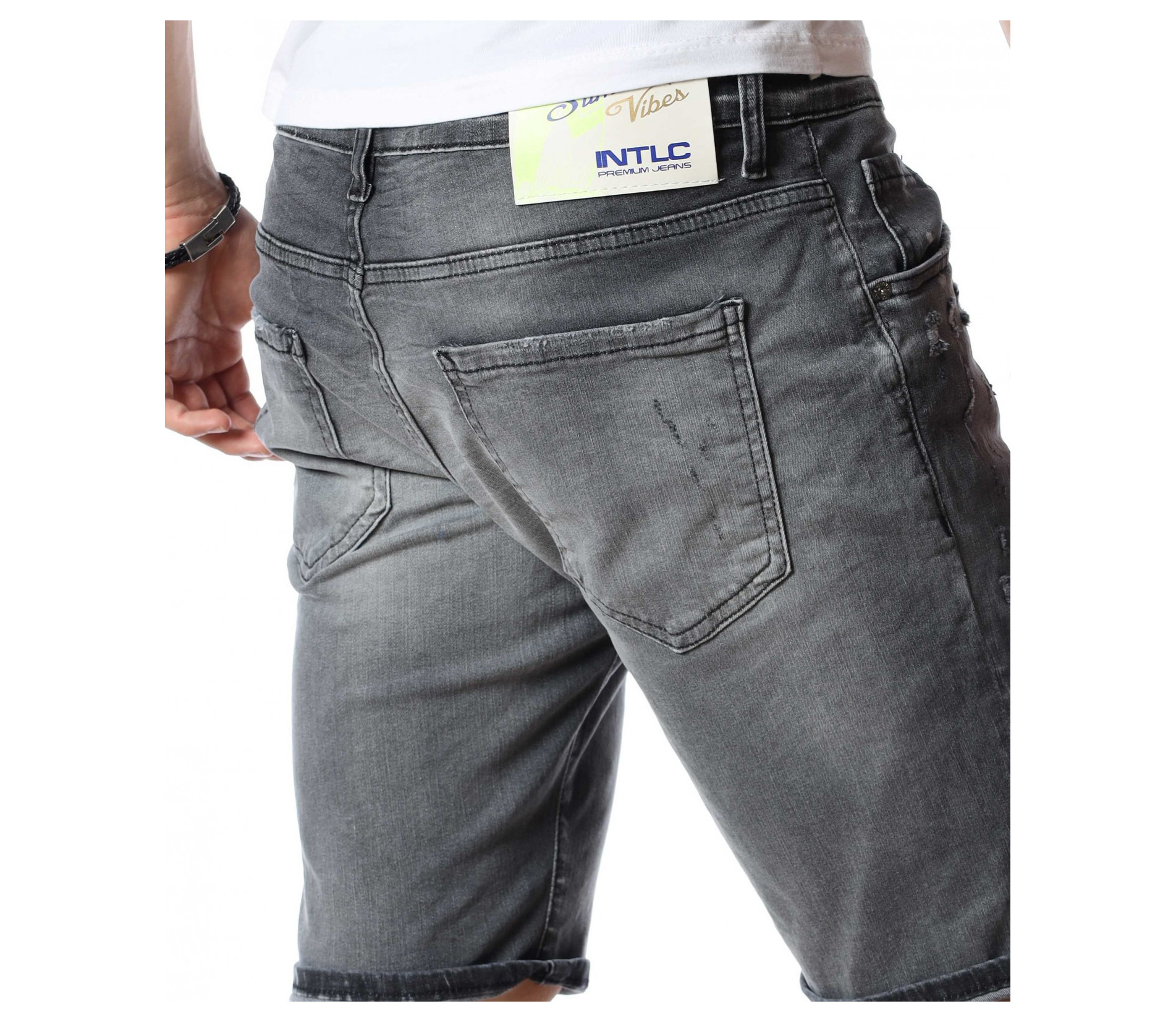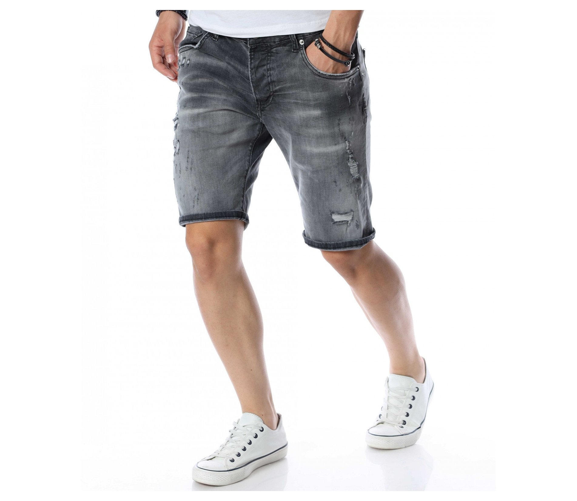 ОПИСАНИЕ НА ПРОДУКТА: Мъжки атрактивни светло сиви дънки с интересен ефект. Този модел къси панталони от дънков плат впечатлява със своя нестандартен дизайн. Ефектни и изключително стилни - перфектно пасващи на всеки стайлинг. На фона на сивия цвят се забелязват фабрично изтъркани и накъсани елементи, които идеално създават контраст с нотка модно излъчване. Както в предната, така и в задната страна на дънките са поставени два джоба. В задната страна в областта на колана е разположено парче кожа с името на марката. Дължината на модела е до коляното, като има възможност за допълнителен подгъв според вашето желание. Кройката е вталена и леко еластична. Бъди в крак с модните тенденции и заложи на нещо екстравагантно и определено много стилно. Смело съчетай с цветен тишърт за един завършен аутфит.