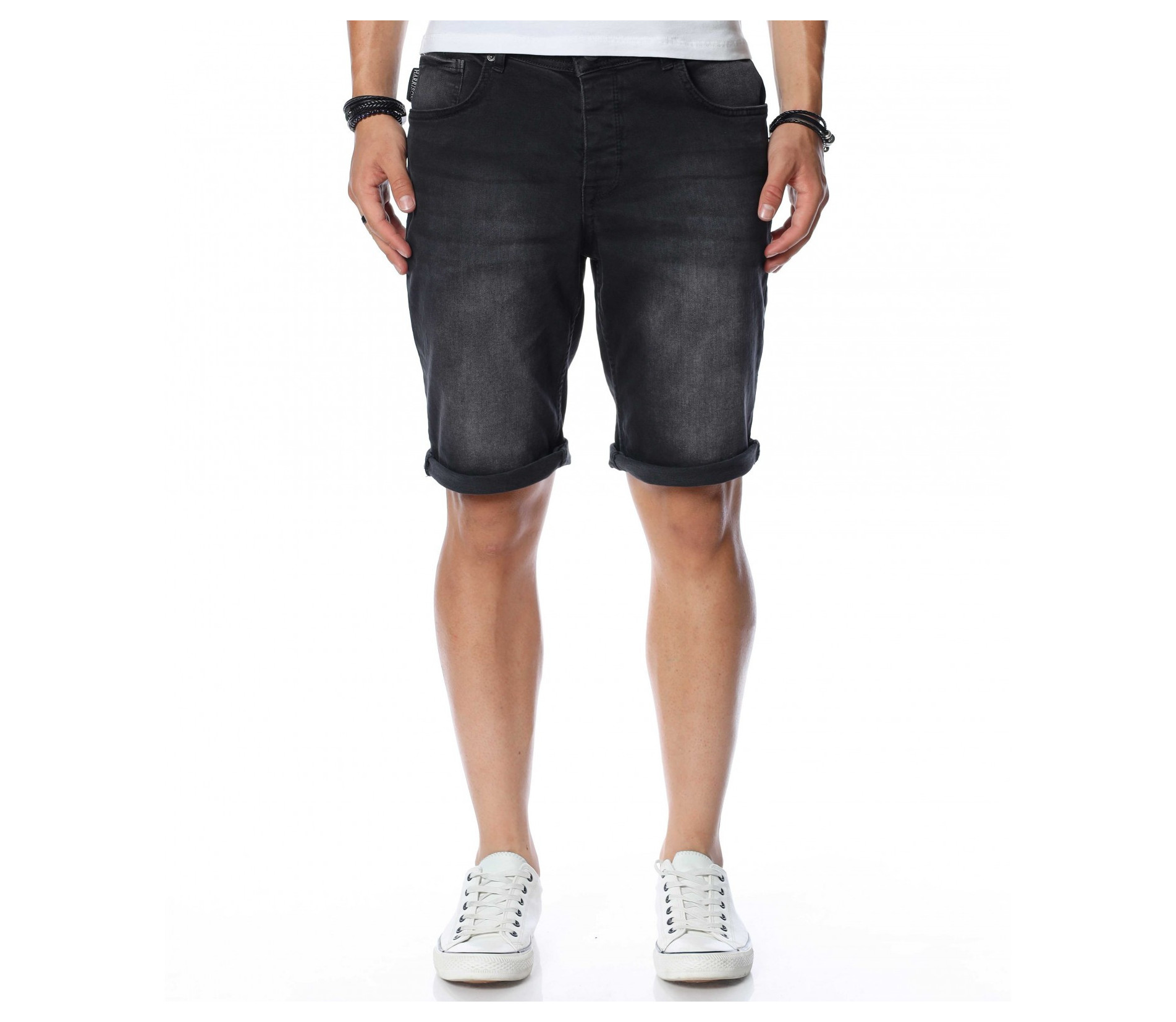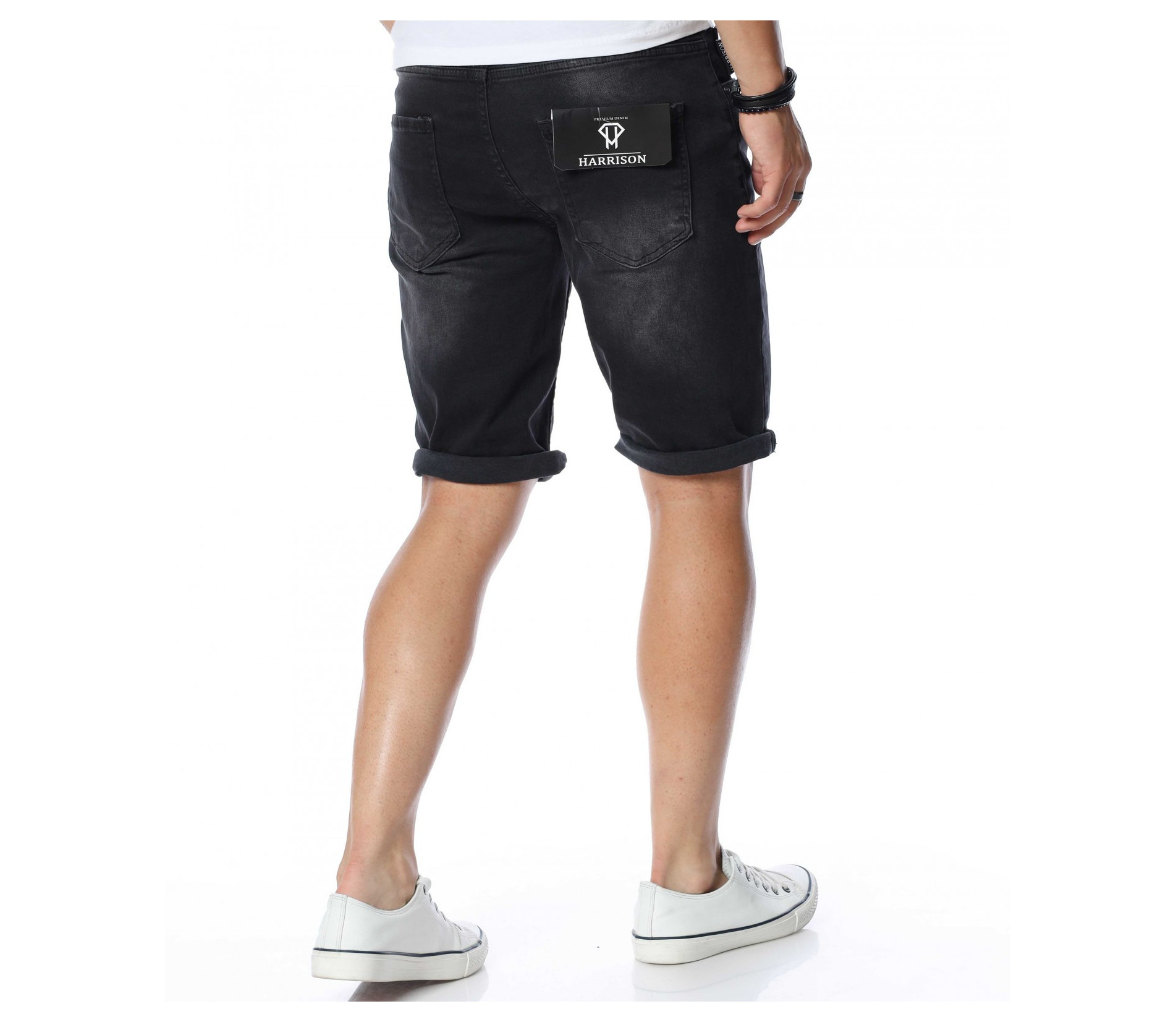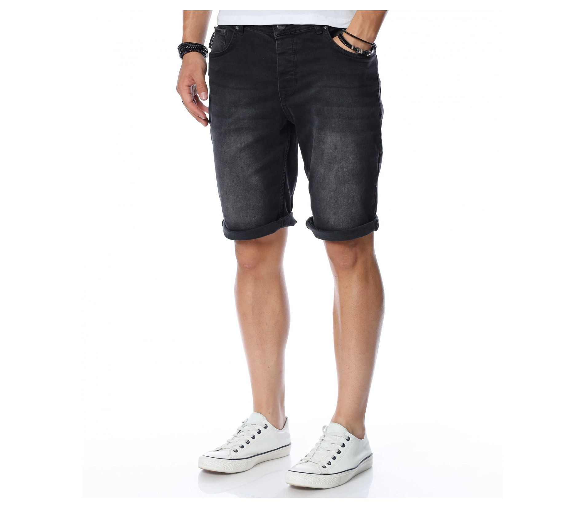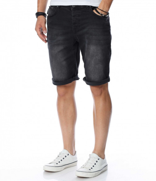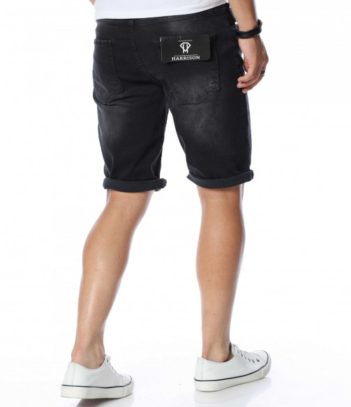 ОПИСАНИЕ НА ПРОДУКТА: Ако си ценител на изчистените модели, то смело заложи на тези мъжки къси дънки, изработени от памучна материя с доза еластичност, която осигурява комфорт и удобство през цялото ежедневие. Самата основа на модела е в изцяло изчистен, черен цвят, следван от така наречения \"измачкан\" ефект, декориран със силно изсветлели елементи, следващи предната част на крачолите в хоризонтална посока. Дължината е до коляното, като смело може да добавите няколко свободни подгъва за максимално удобство и комфорт. От двете страни на дънките има по два джоба, завършващи изцяло облика на мъжките 3/4 дънки. Комбинирай с подходяща тениска и чифт кецове за един цялостен летен имидж.