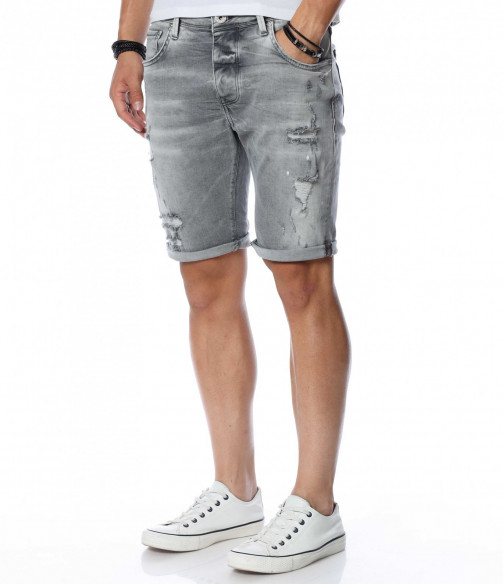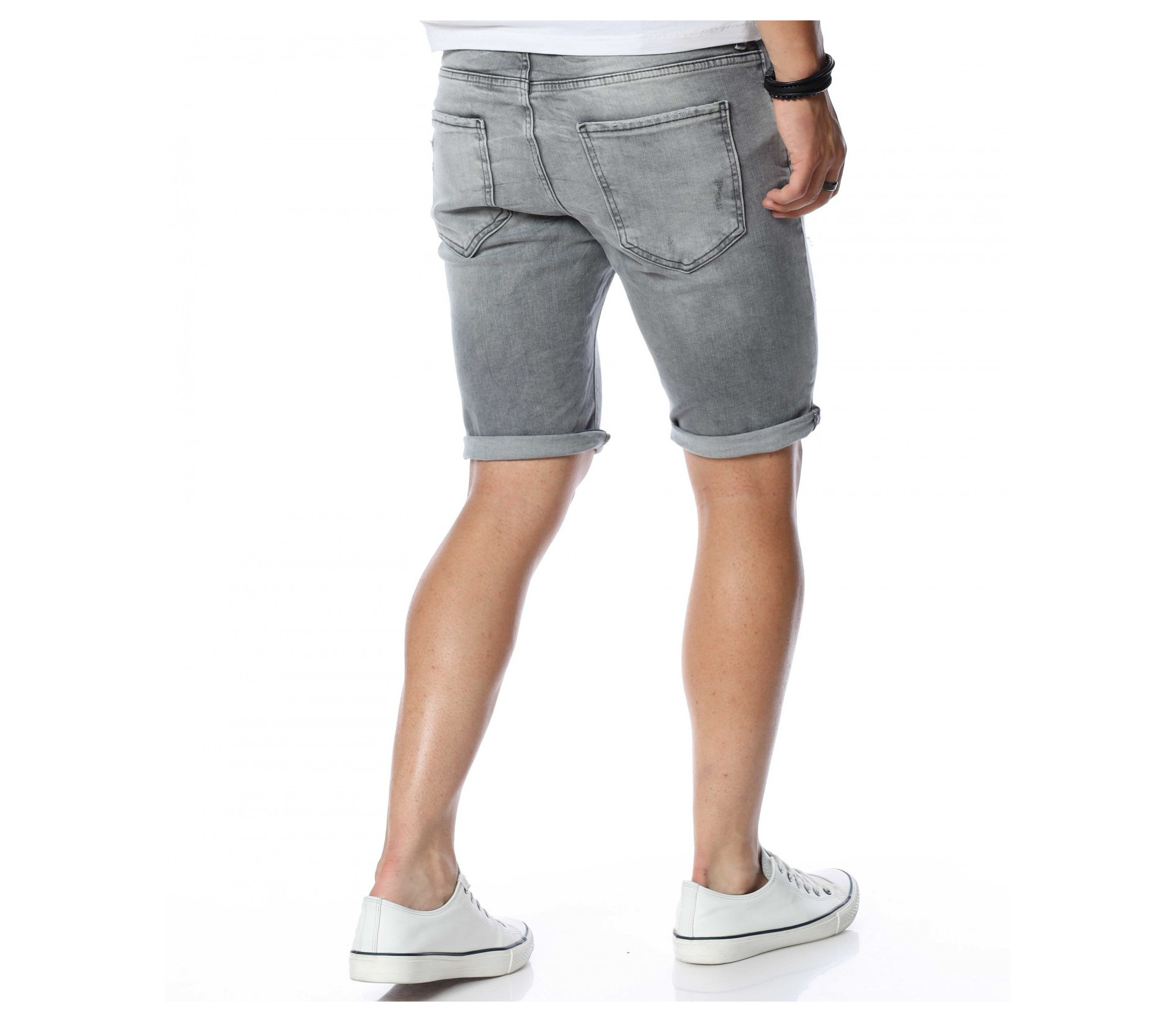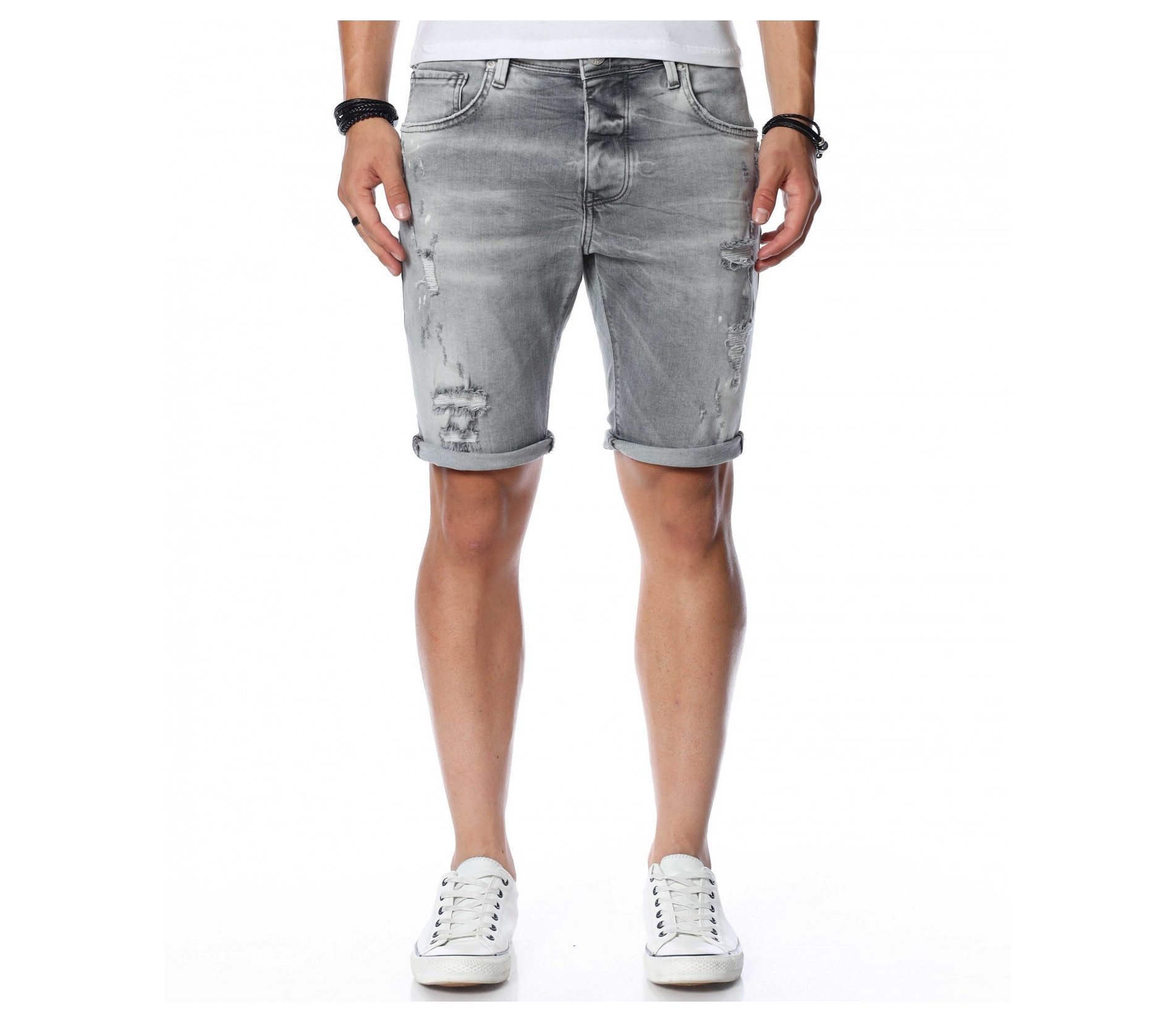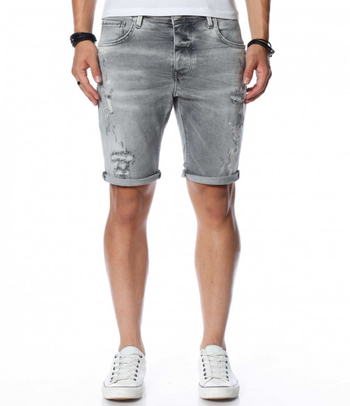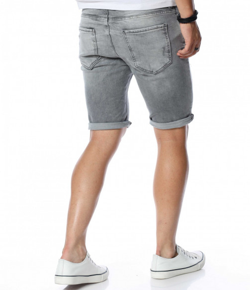 ОПИСАНИЕ НА ПРОДУКТА: Мъжки атрактивни светло сиви дънки с интересен ефект. Този модел къси панталони от дънков плат впечатлява със своя нестандартен дизайн. Ефектни и изключително стилни - перфектно пасващи на всеки стайлинг. На фона на сивия цвят се забелязват фабрично изтъркани и накъсани елементи, които идеално създават контраст с нотка модно излъчване. Както в предната, така и в задната страна на дънките са поставени два джоба. В задната страна в областта на колана е разположено парче кожа с името на марката. Дължината на модела е до коляното, като има възможност за допълнителен подгъв според вашето желание. Кройката е вталена и леко еластична. Бъди в крак с модните тенденции и заложи на нещо екстравагантно и определено много стилно. Смело съчетай с цветен тишърт за един завършен аутфит.