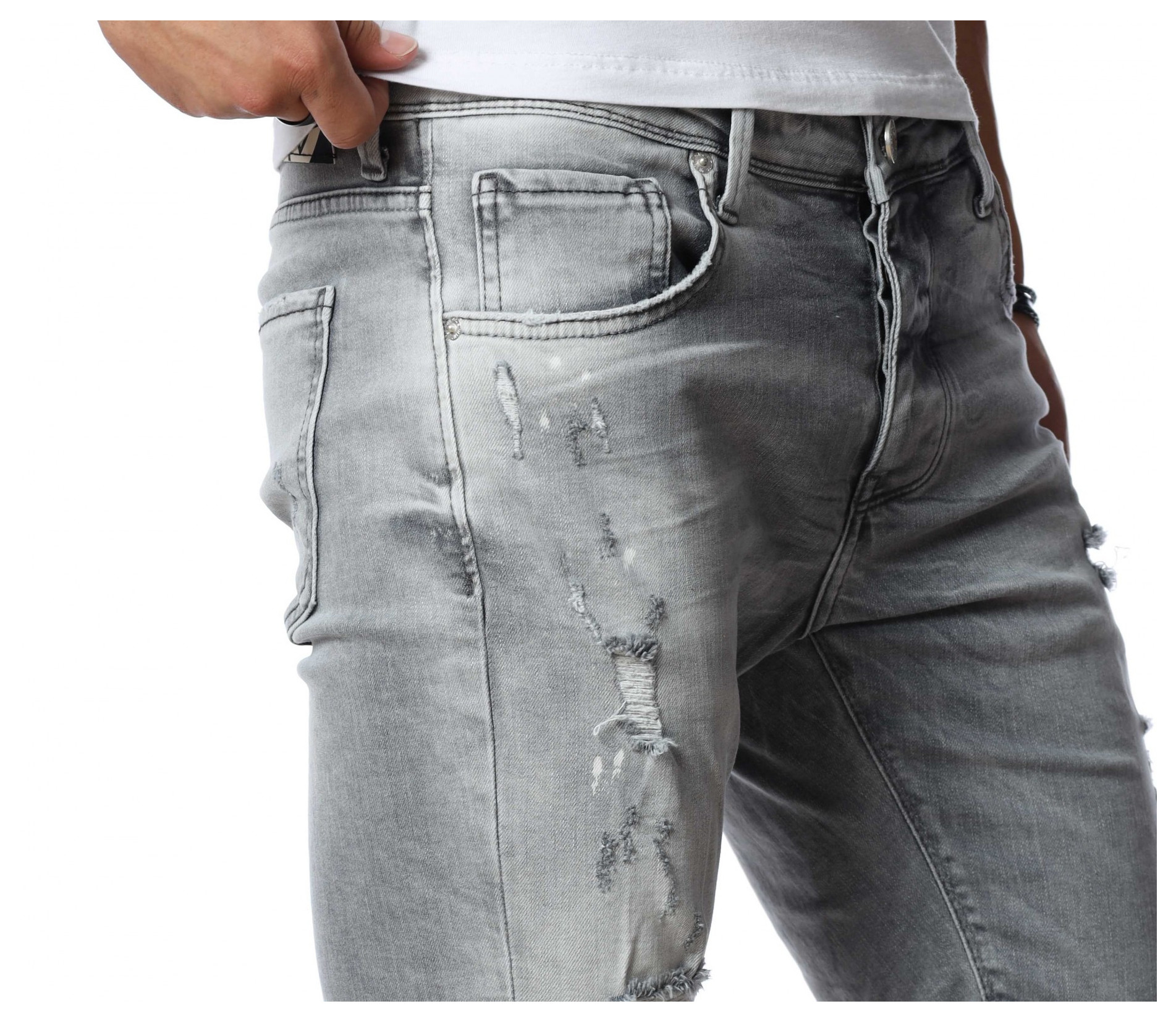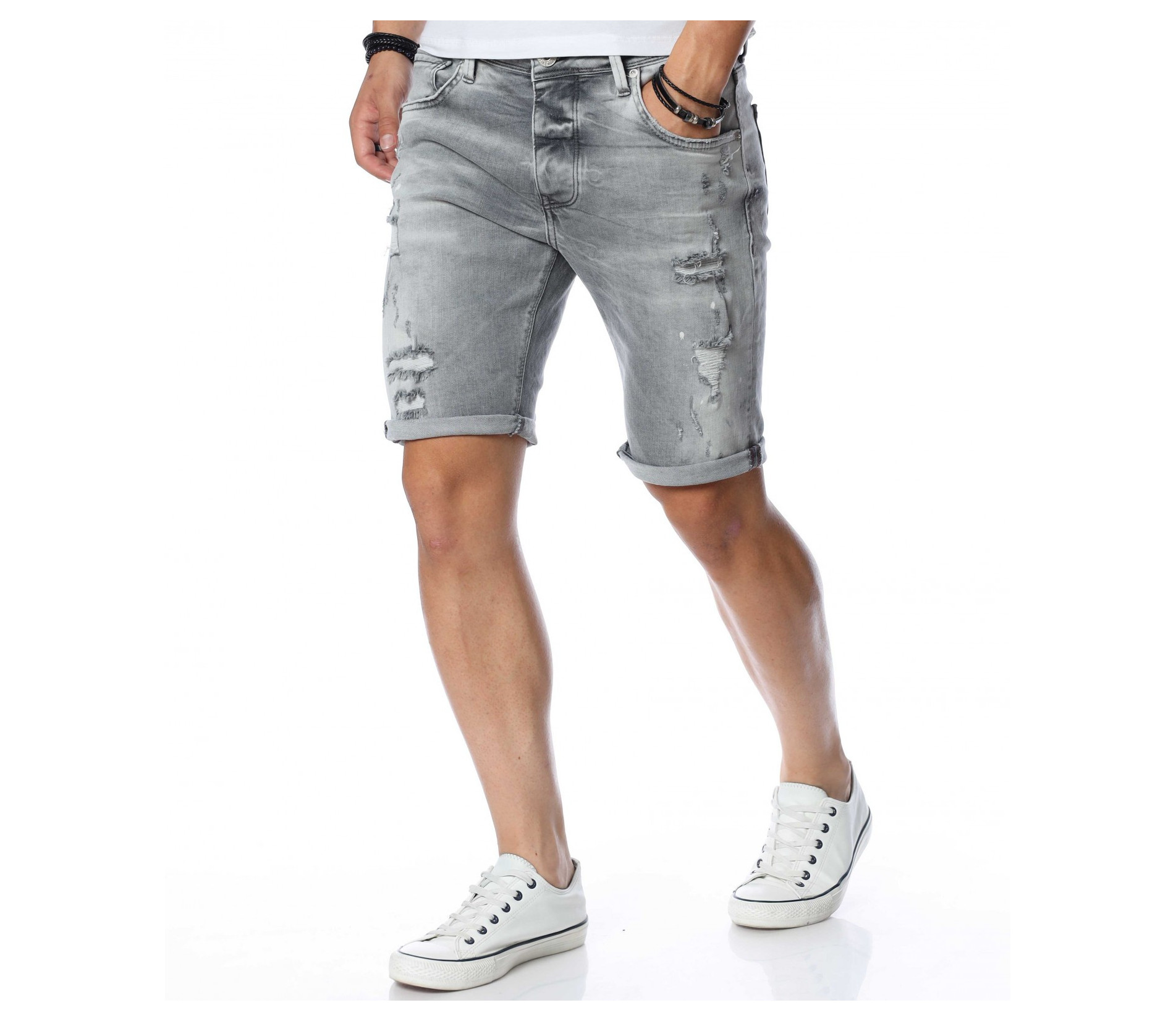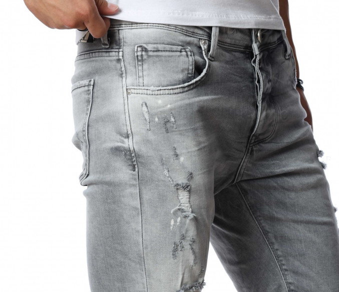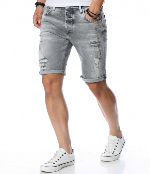 ОПИСАНИЕ НА ПРОДУКТА: Мъжки атрактивни светло сиви дънки с интересен ефект. Този модел къси панталони от дънков плат впечатлява със своя нестандартен дизайн. Ефектни и изключително стилни - перфектно пасващи на всеки стайлинг. На фона на сивия цвят се забелязват фабрично изтъркани и накъсани елементи, които идеално създават контраст с нотка модно излъчване. Както в предната, така и в задната страна на дънките са поставени два джоба. В задната страна в областта на колана е разположено парче кожа с името на марката. Дължината на модела е до коляното, като има възможност за допълнителен подгъв според вашето желание. Кройката е вталена и леко еластична. Бъди в крак с модните тенденции и заложи на нещо екстравагантно и определено много стилно. Смело съчетай с цветен тишърт за един завършен аутфит.