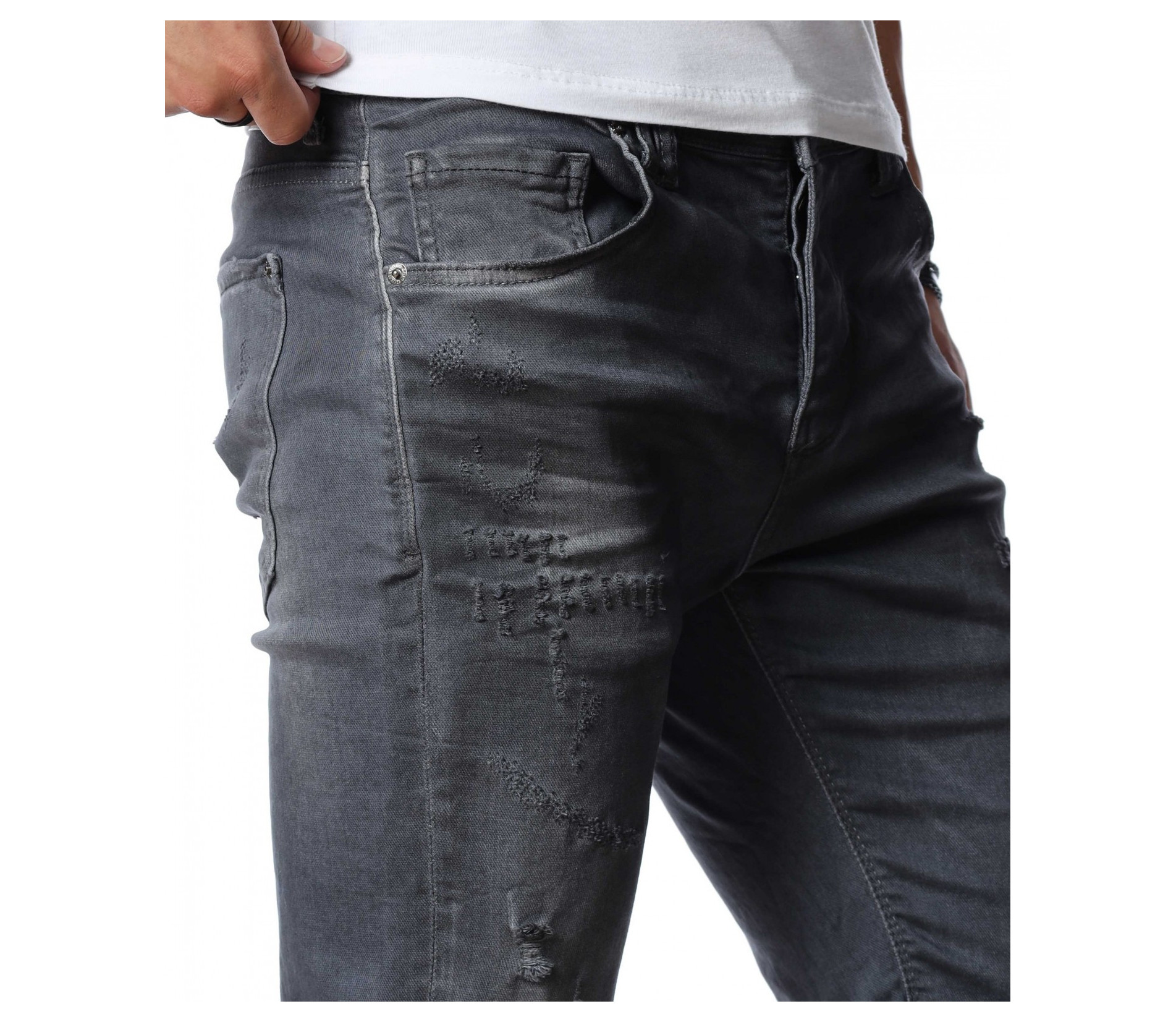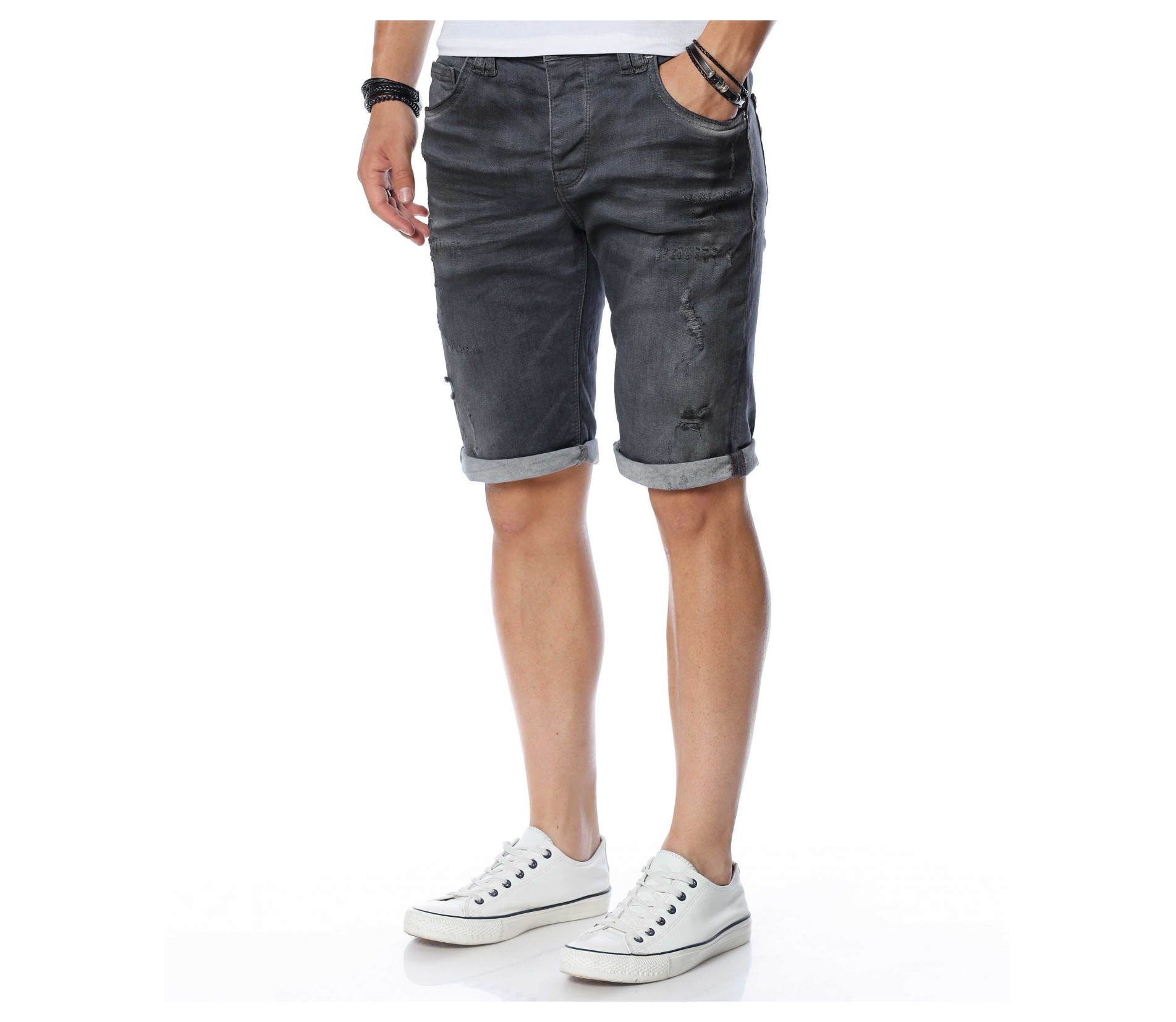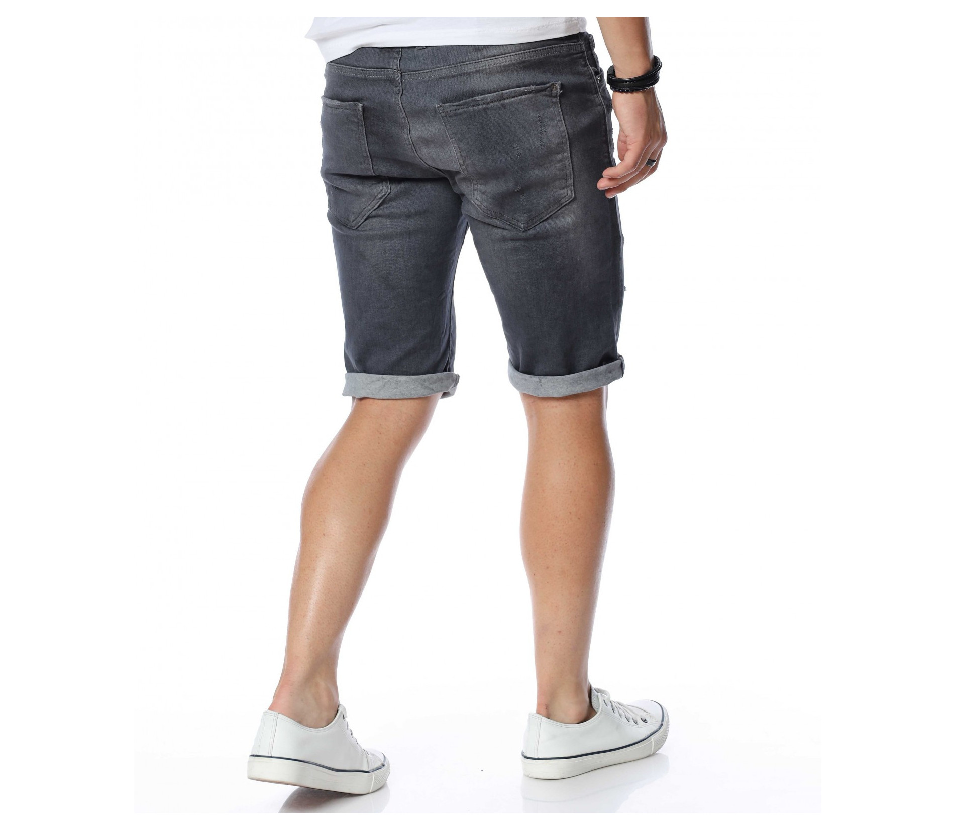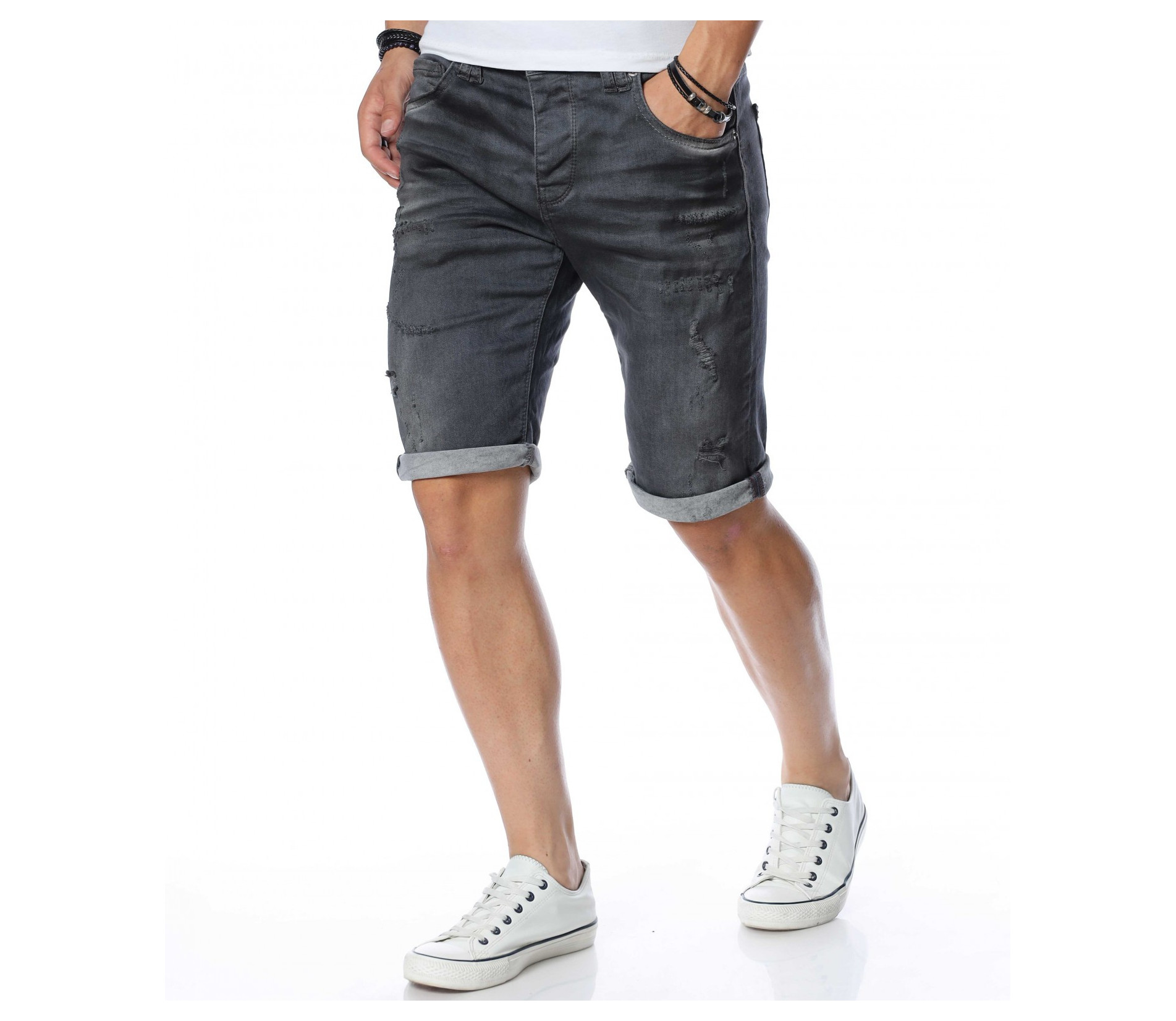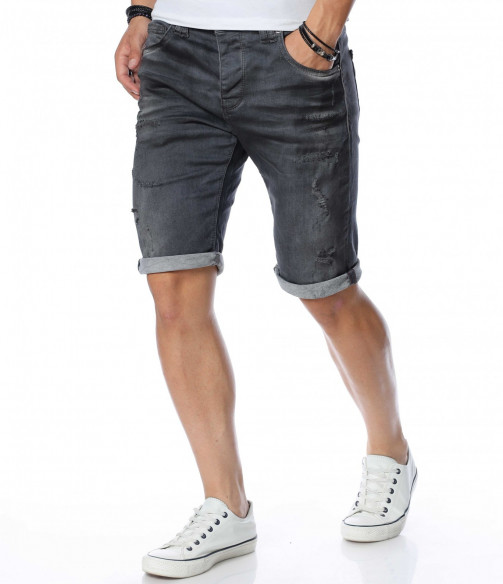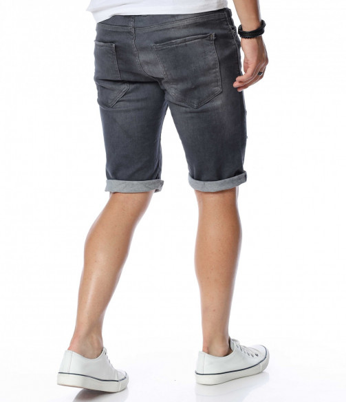 ОПИСАНИЕ НА ПРОДУКТА: Не прави компромис с външния си вид, а смело заложи на ефектни мъжки къси дънки в тъмносив към черен цвят. Цялата основа на мъжките панталонки е в изчистен дизайн, като съвсем семпло и ненатрапчиво се прокрадва изсветлял ефект по протежение на дължината на модела, в комбинация с няколко кръпки. Самата дължина е до коляното с опция за подгъв. От двете страни са разположени по два дълбоки и удобни джоба, като задните са декорирани с два хоризонтални шева. Лек намачкан ефект финализира цялостния вид на мъжките дънки. Зареди се с доза настроение и перфектен външен вид с еластични мъжки памучни дънкови панталонки от ново поколение.