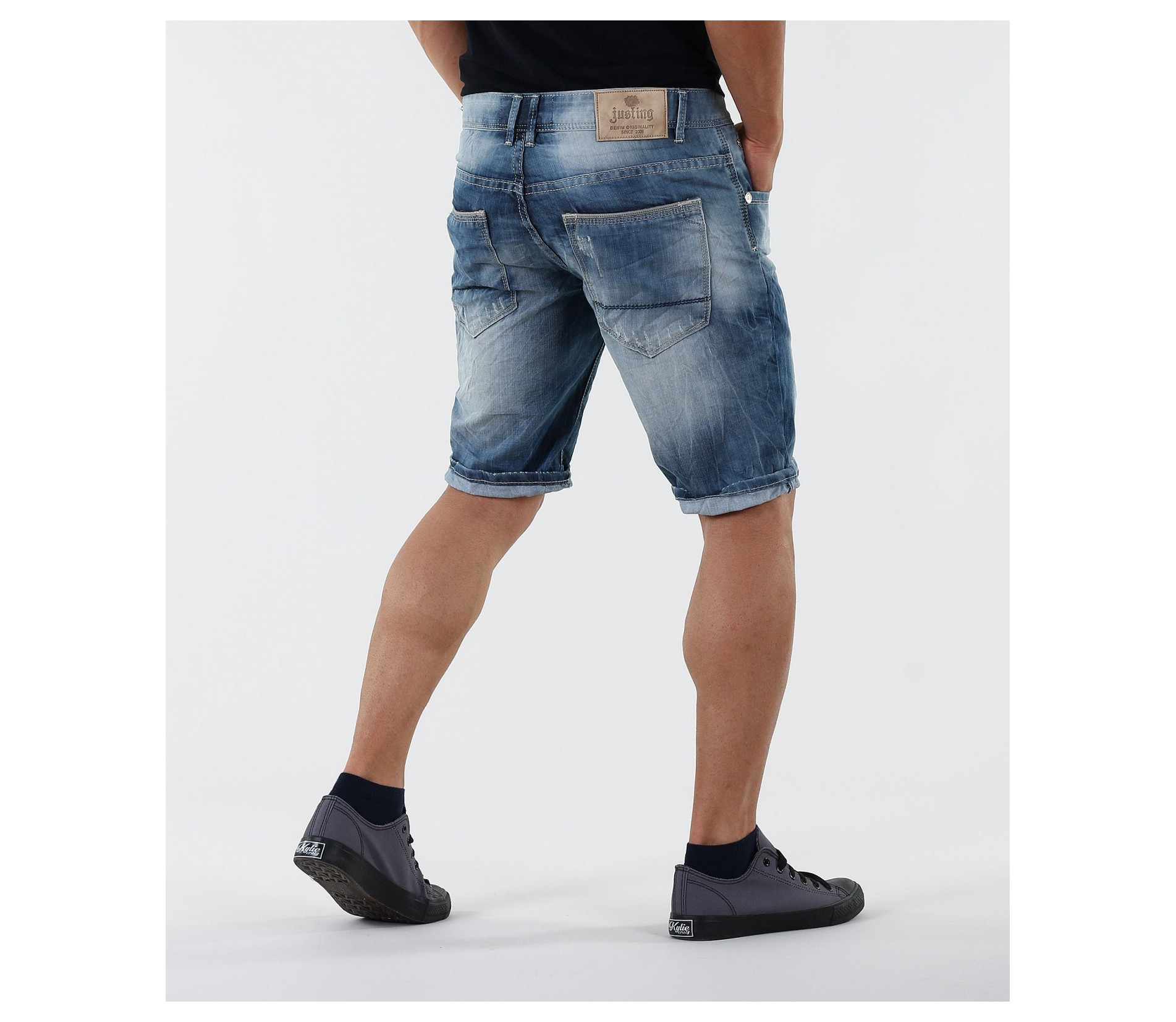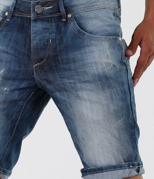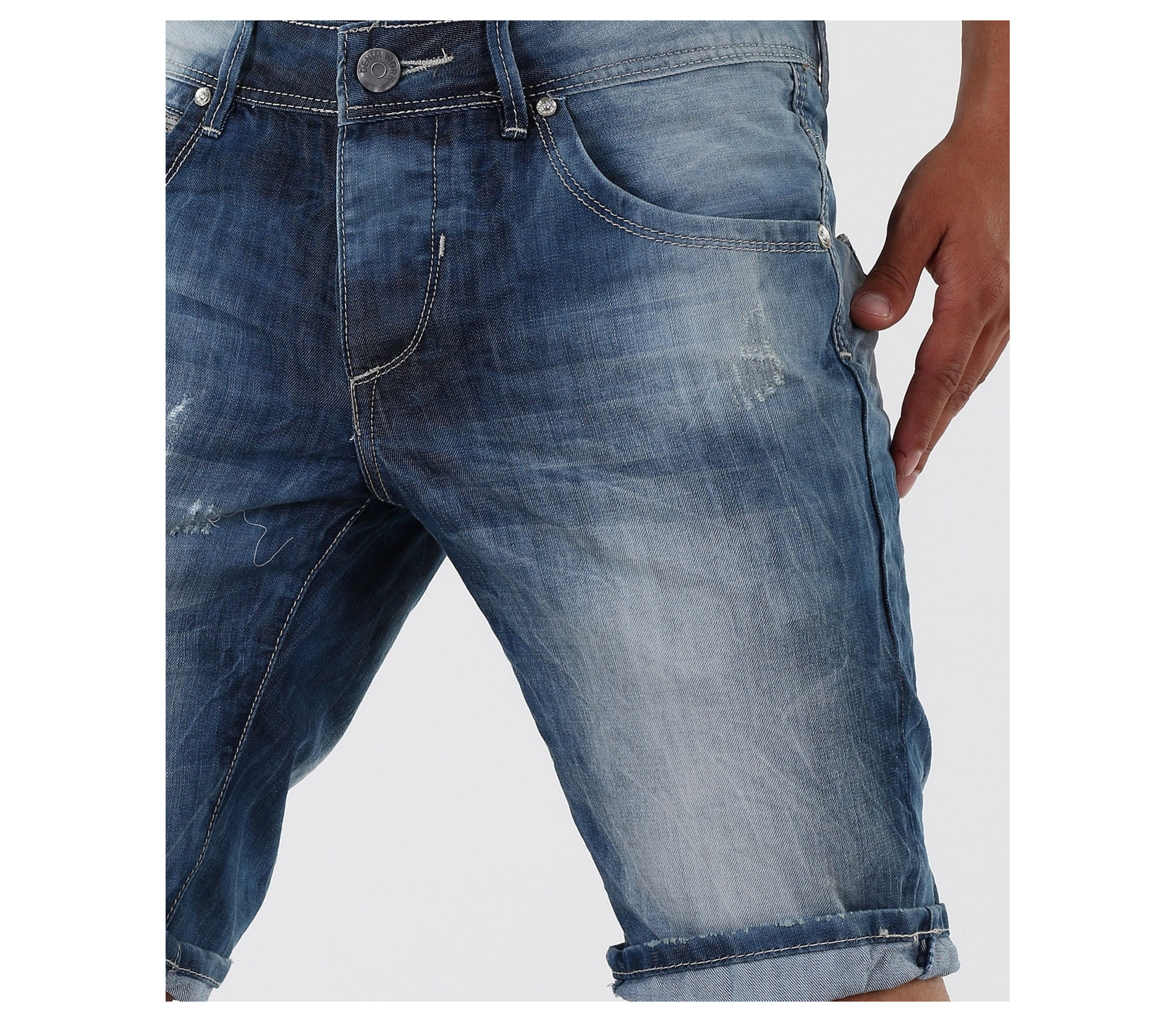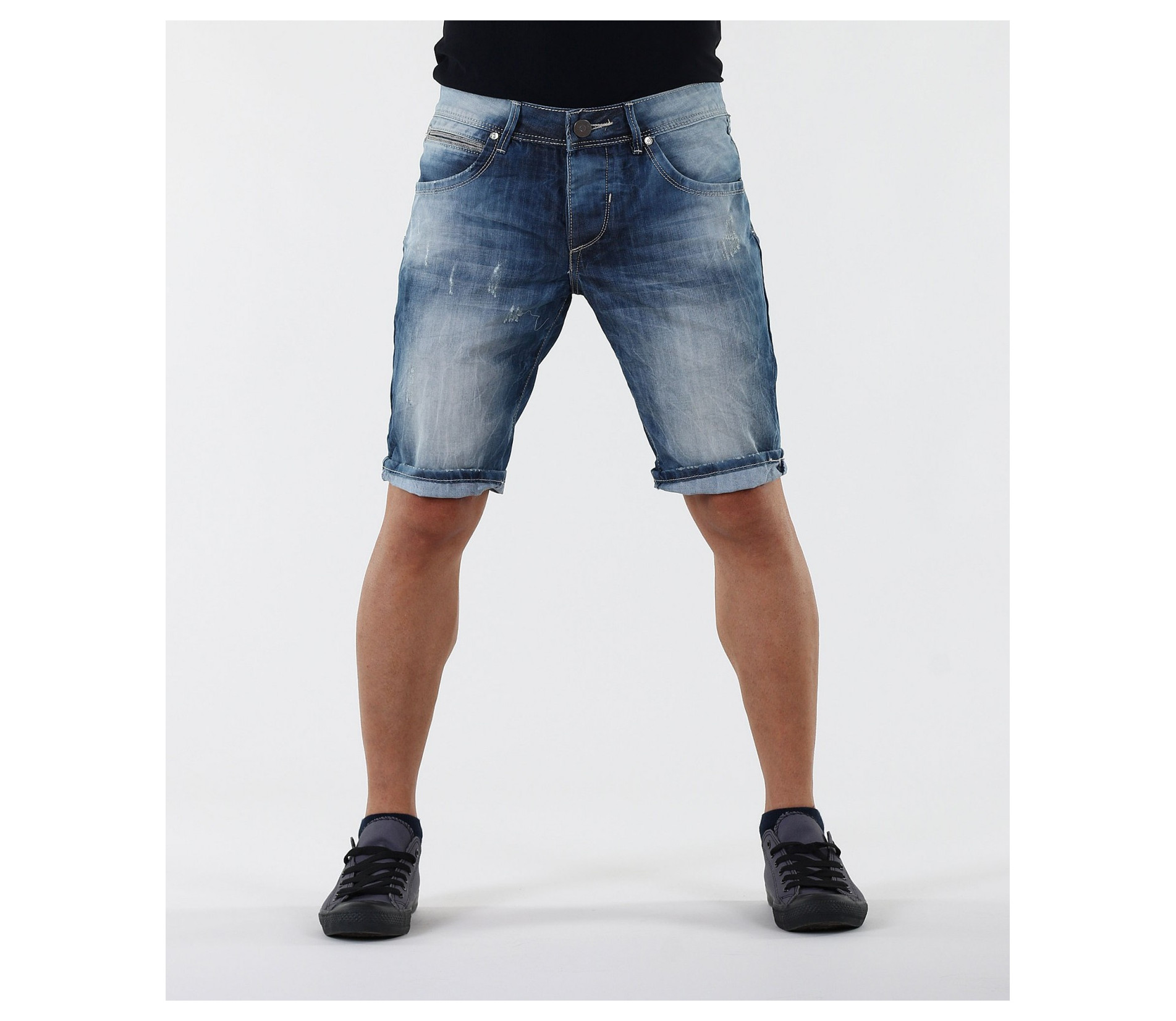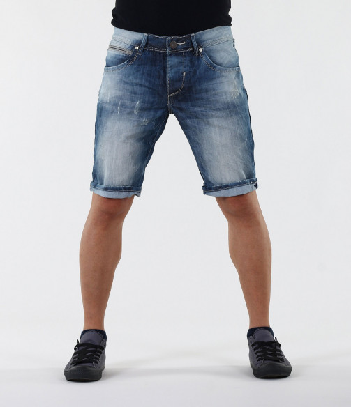 Мъжки изчистени дънки с избелял ефект.Може да коригирате дължината им, като ги навиете по Ваш вкус. В предната част дънките разполагат с два предни джоба.В предния десен - деликатно е поставена имитация на малък джоб.Всеки детайл по дънките е очертан с бели шевове.В задната си част дънките имат още два задни джоба.За акцент по тях има сини шевове.Изчистен лесно съчетаем модел, както с тениски, тениски с яки,ризи с къс ръкав и кецове, така и с разнообразни аксесоари.Късите дънки са изработени от комбинация 80%памук и 20%полиестер, за да Ви осигурят максимално удобство и свобода на движение.