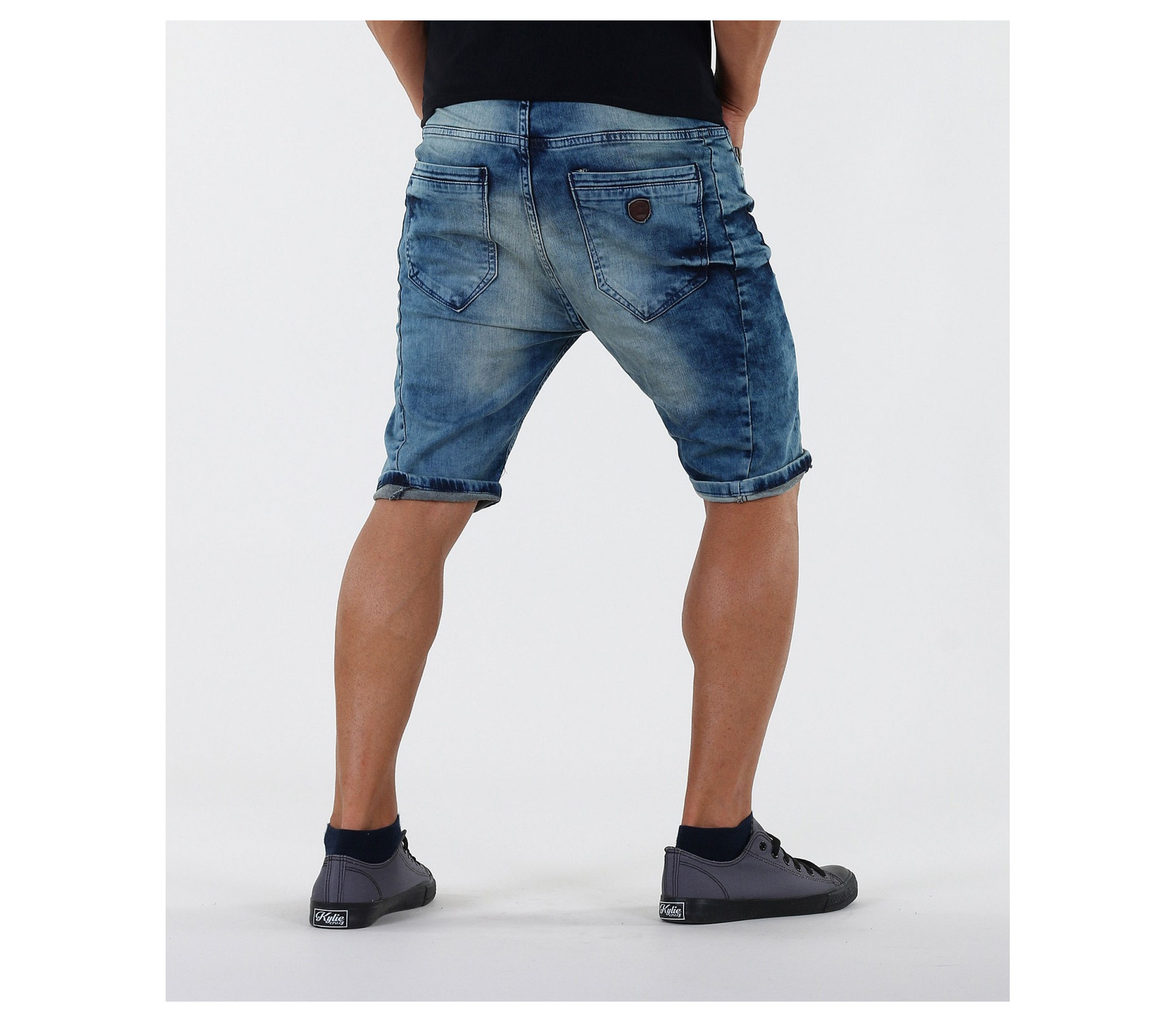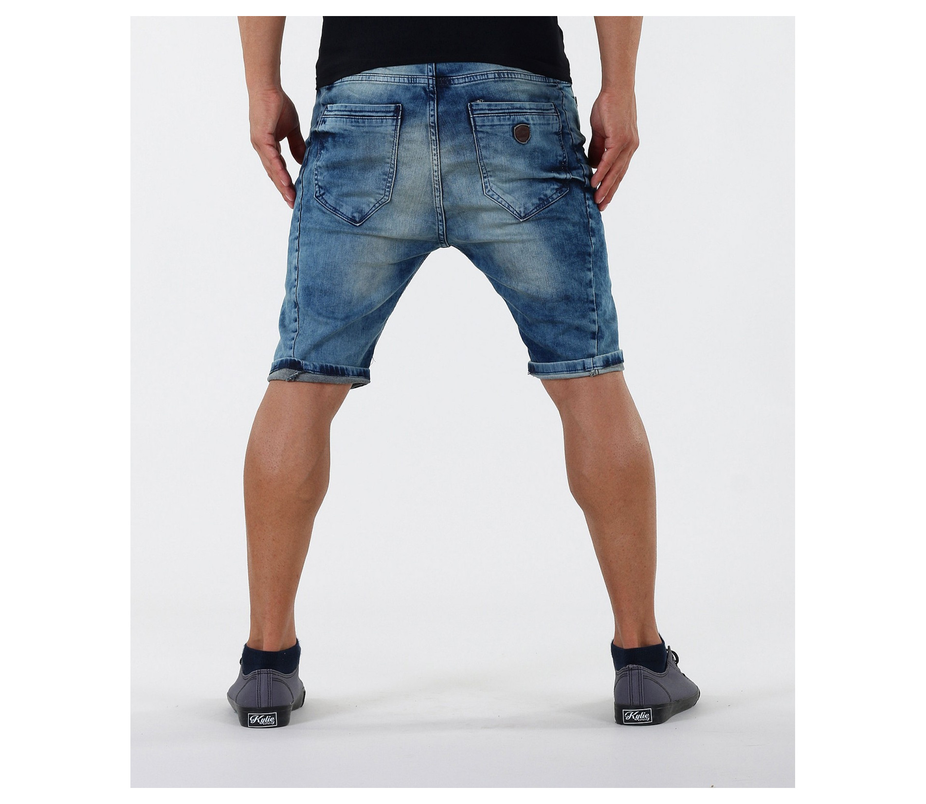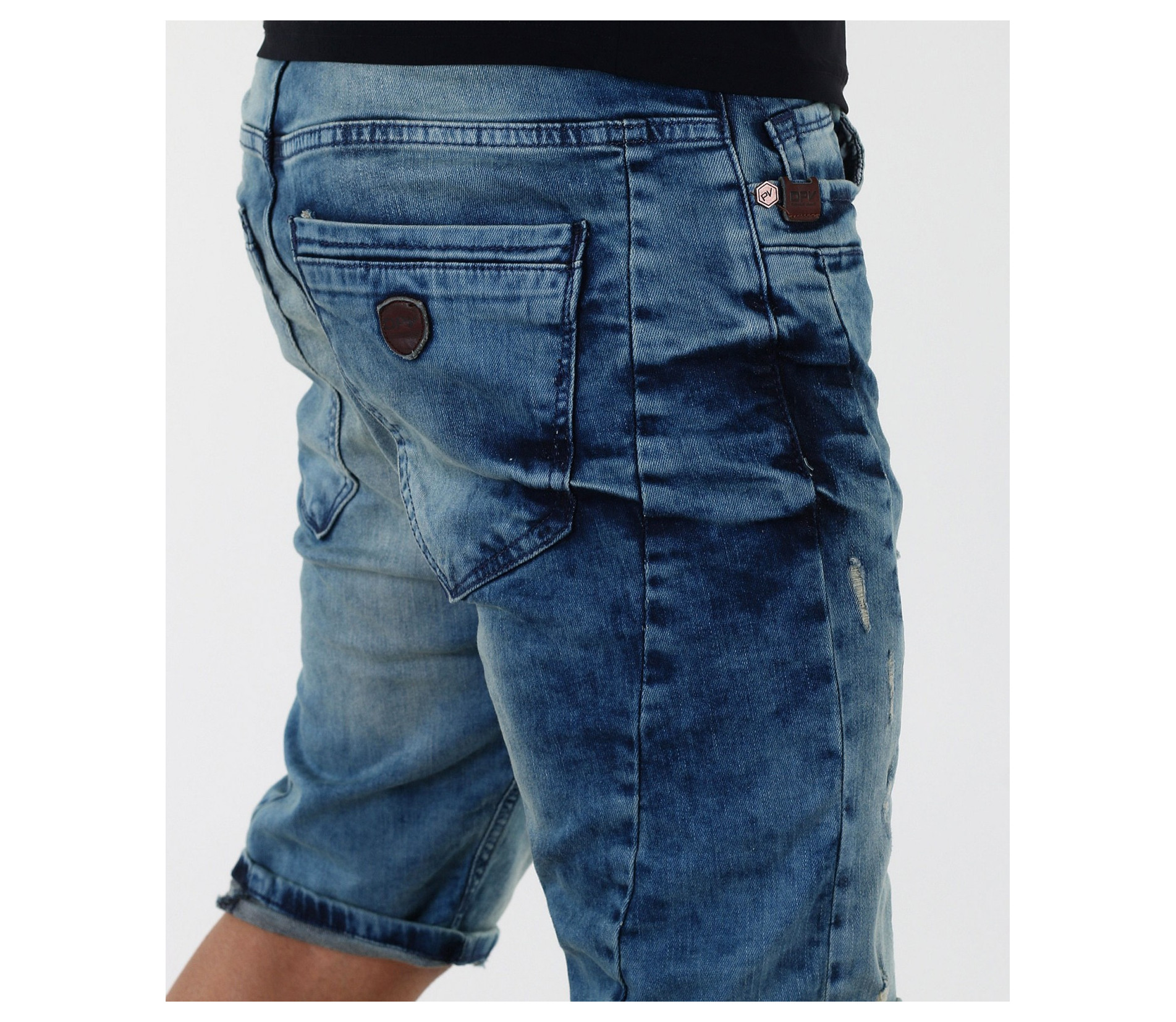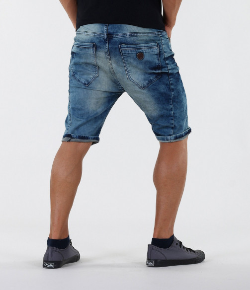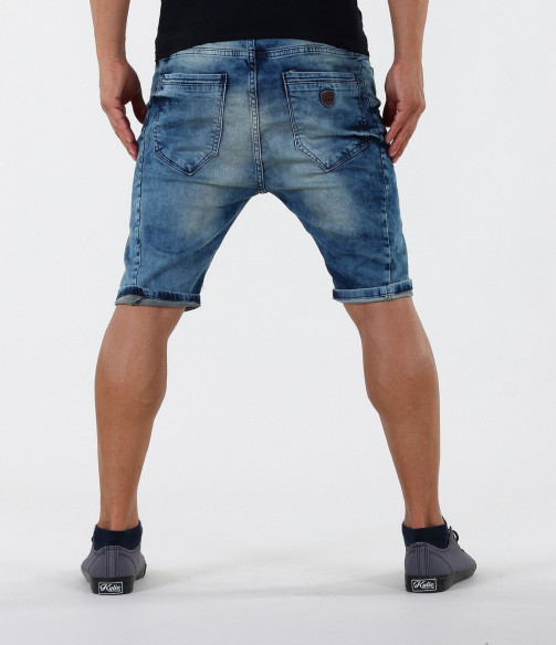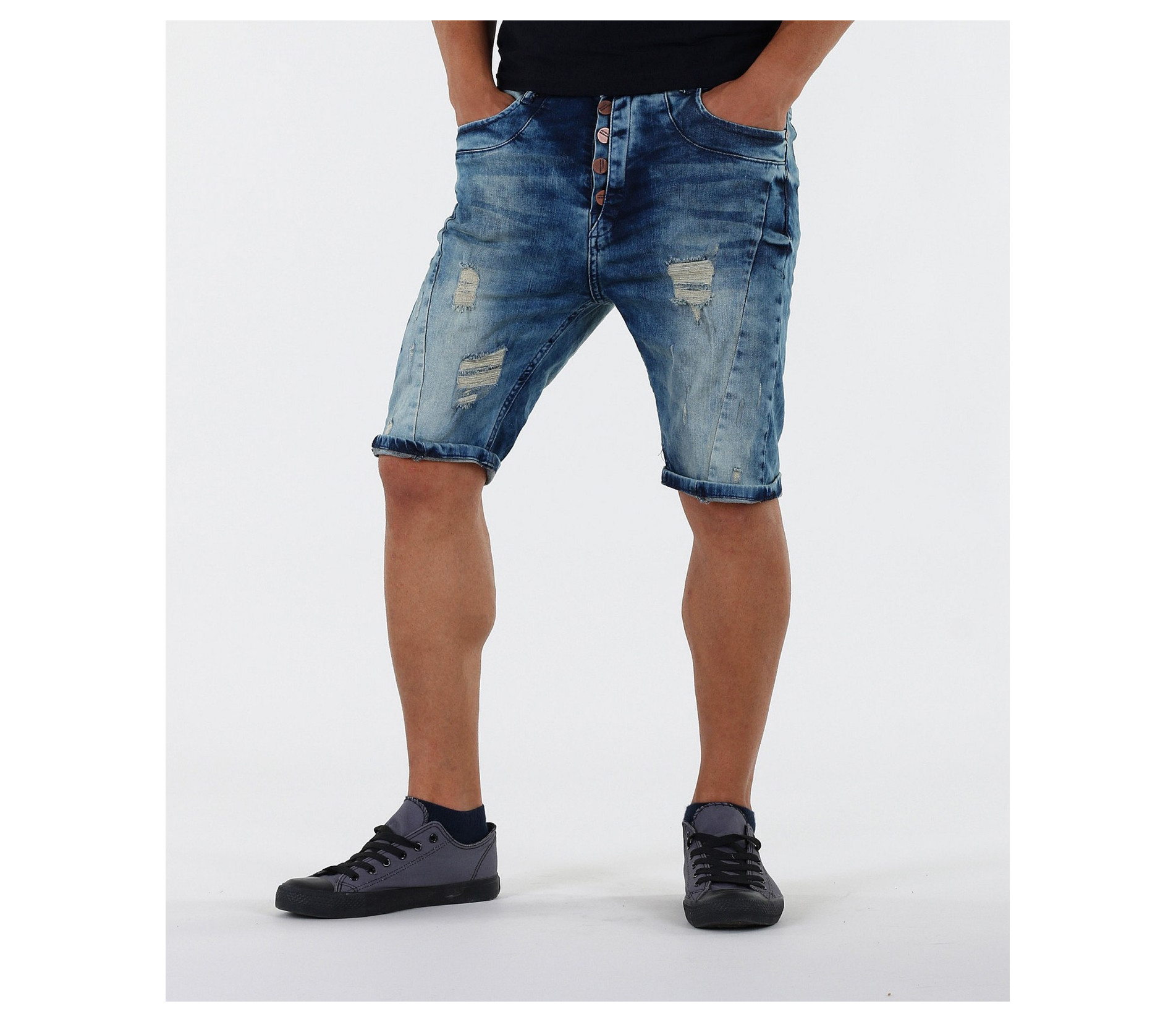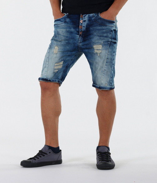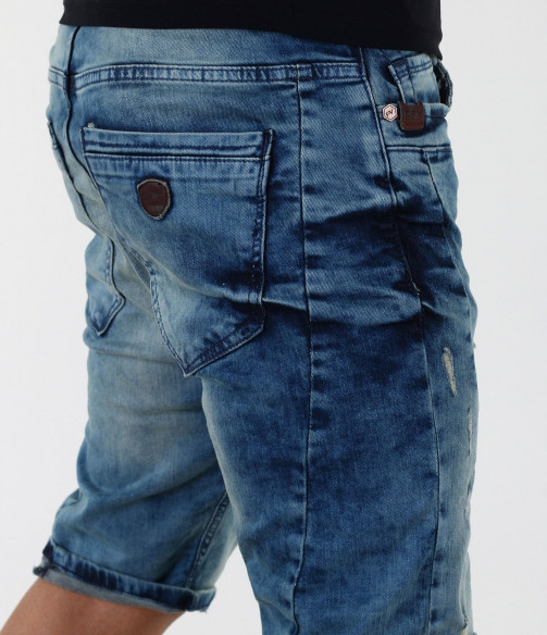 Описание на продукта: Стилни мъжки къси дънки с паднало дъно. Цветът на модела е светъл деним, като на места моделът е по-тъмен. В предната част дънките са леко накъсани, като допълнителен ефект са поставени и по два шева които вталяват панталоните. Закопчаването на дънките е с външни копчета. Кройката на модела е силно вталена с дължина до коляното и паднало дъно. В свежа комбинация дънките са с цветен тишърт, чифт актуални кецове или еспадрили и малък аксесоар.